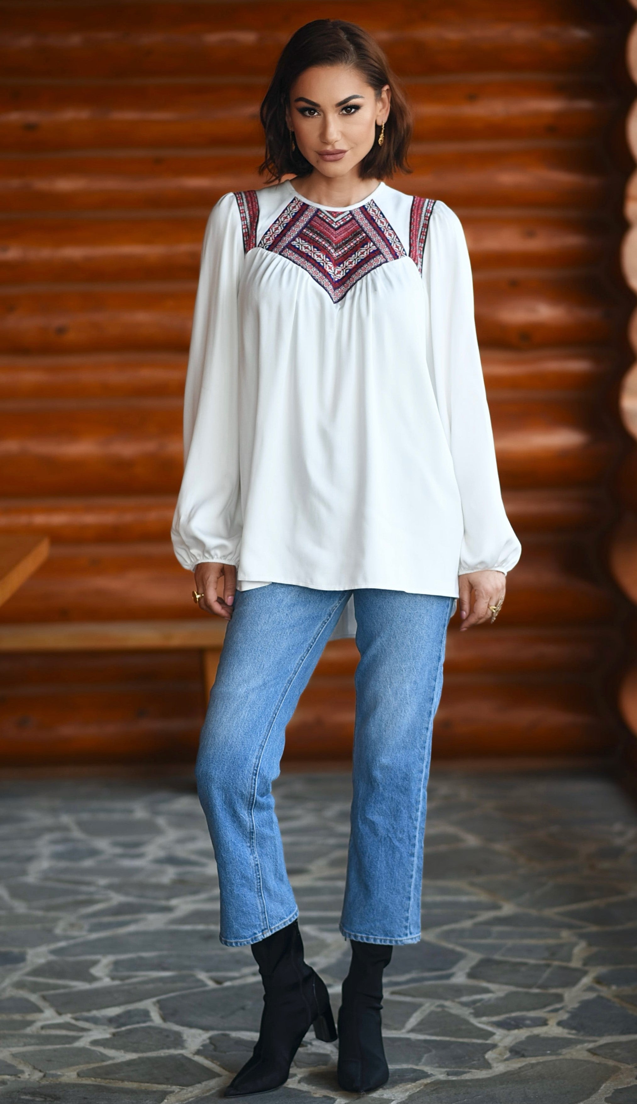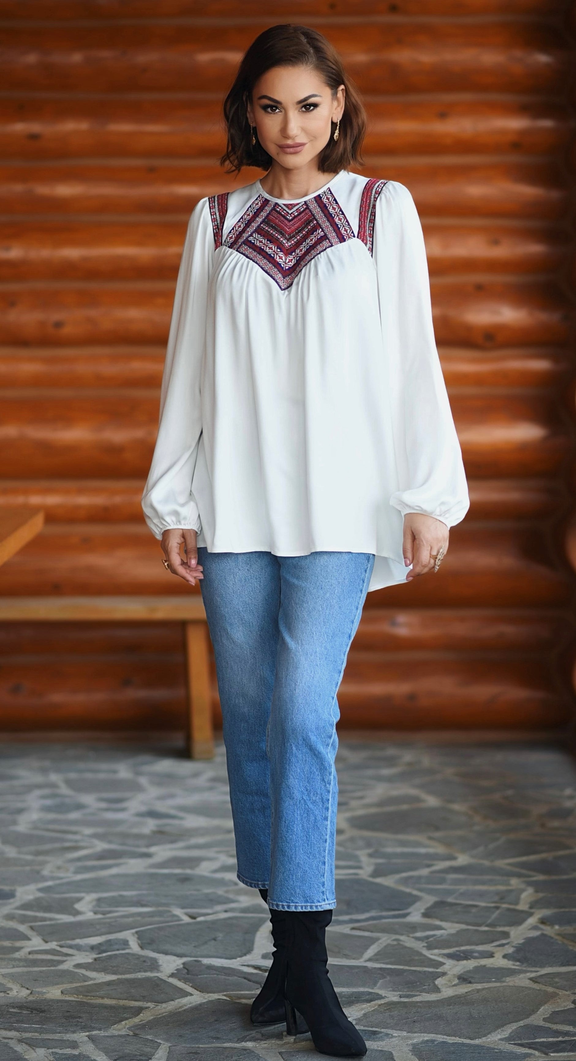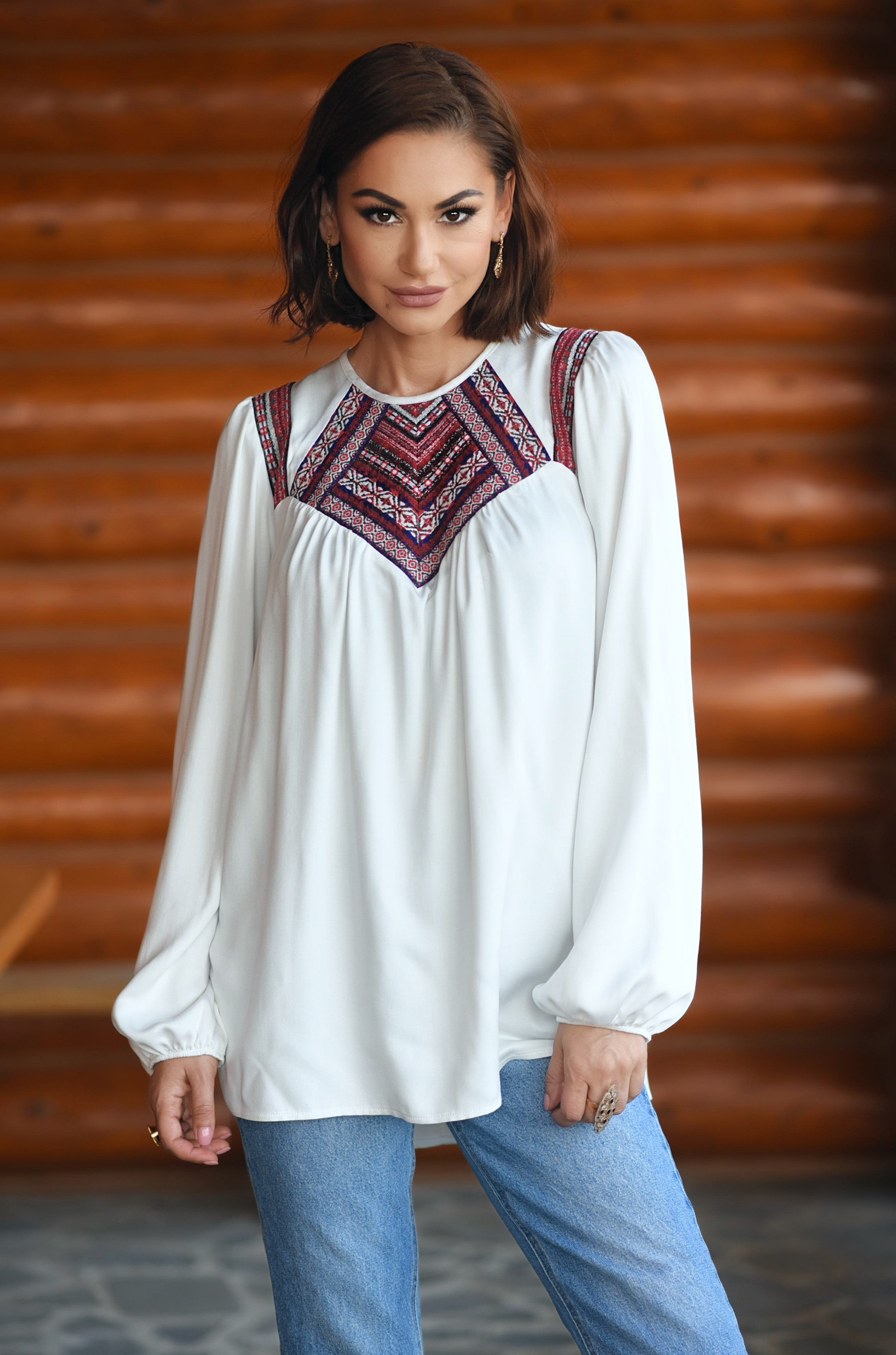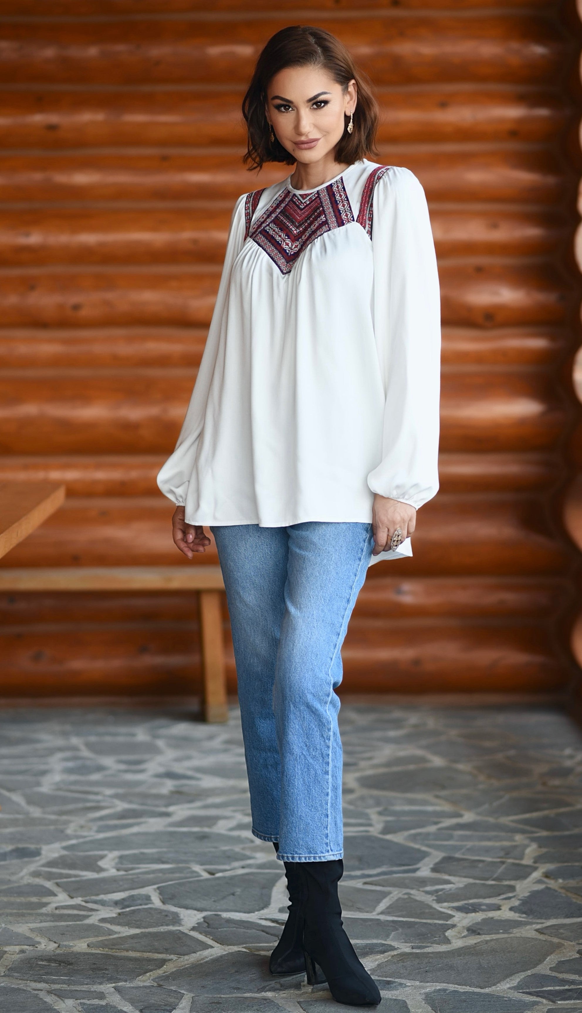 Bluza tradițională stilizată Daciana este confecționată din viscoză de calitate superioară și jacquard etnic țesut.
