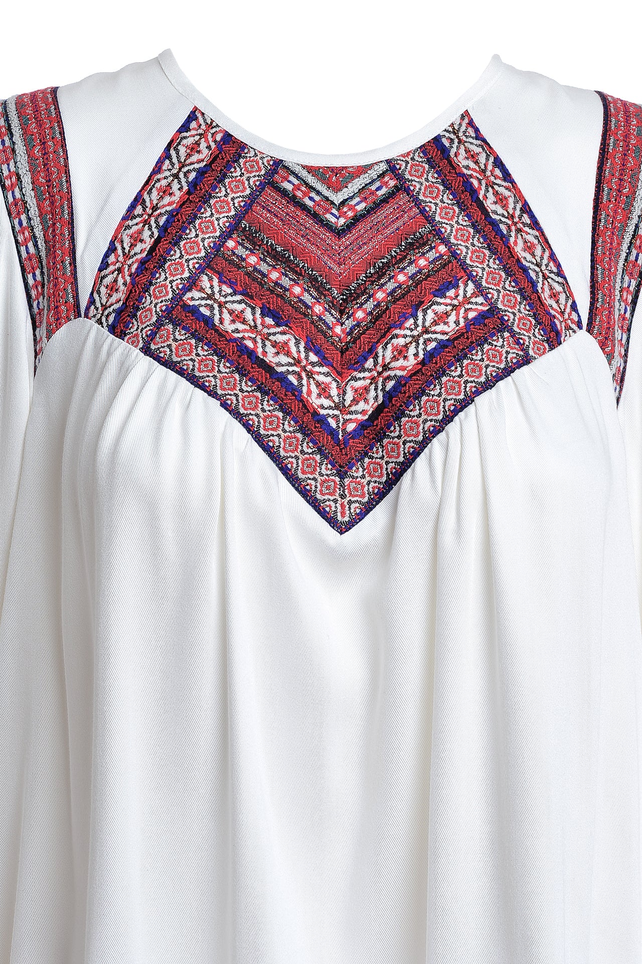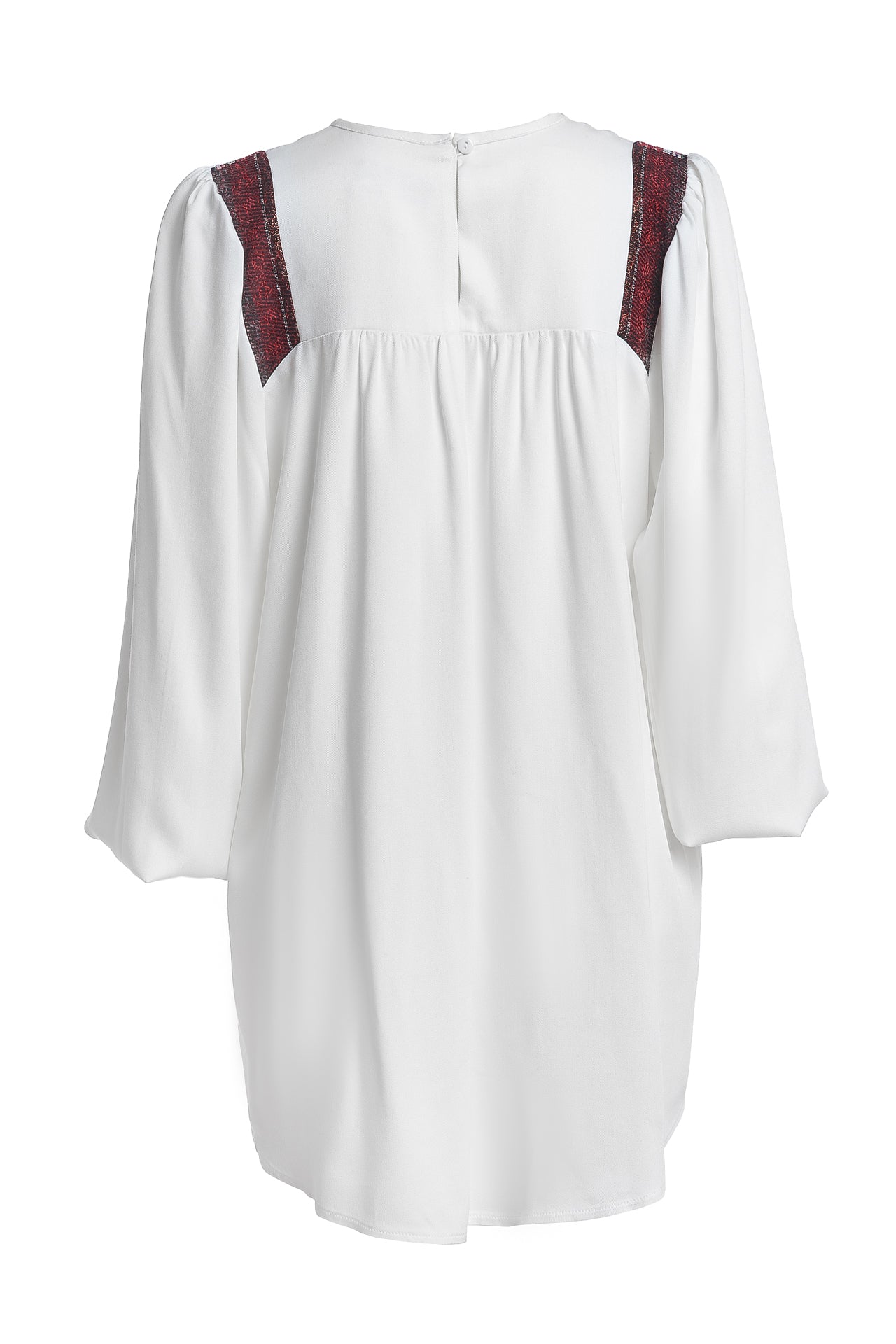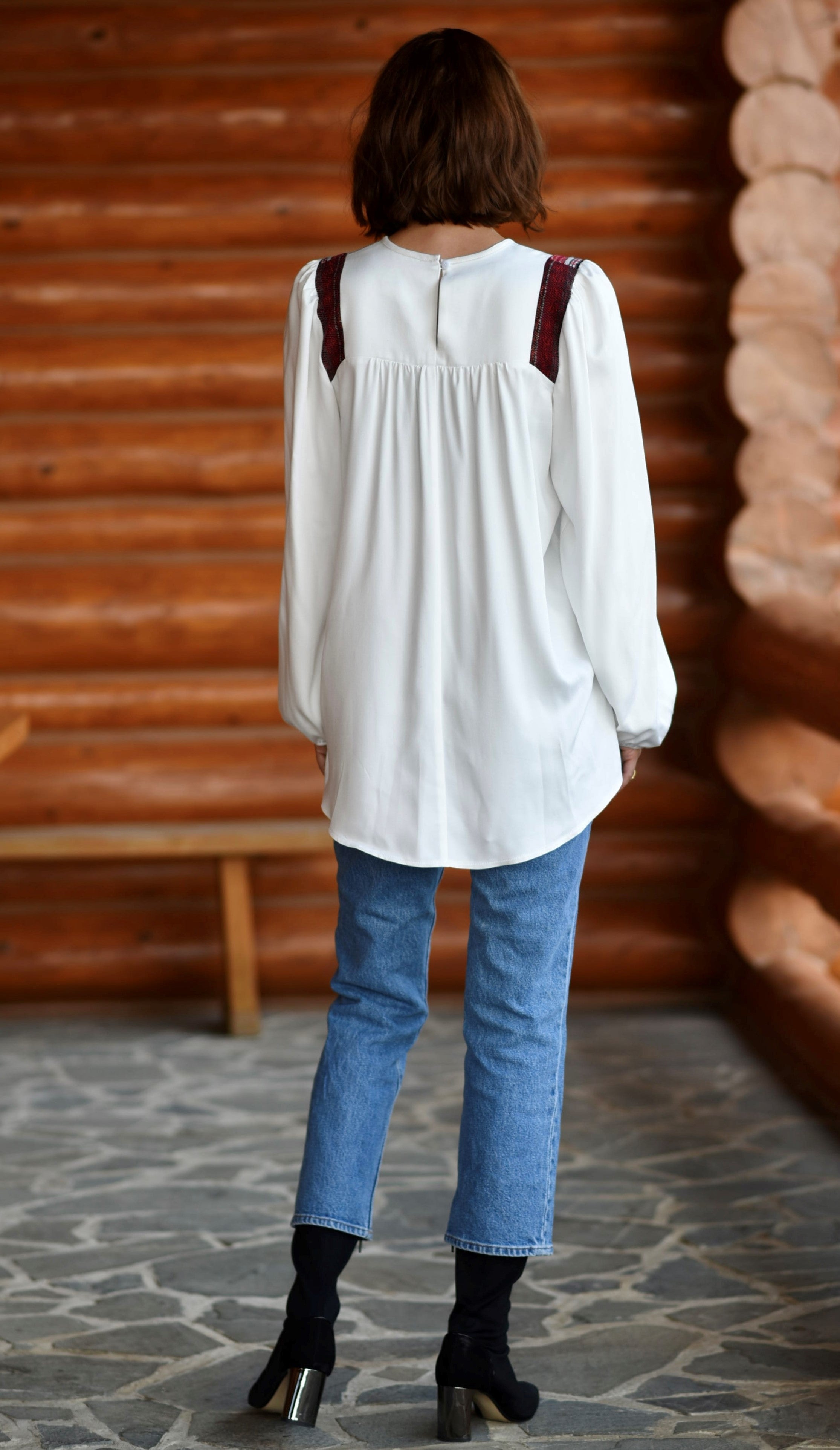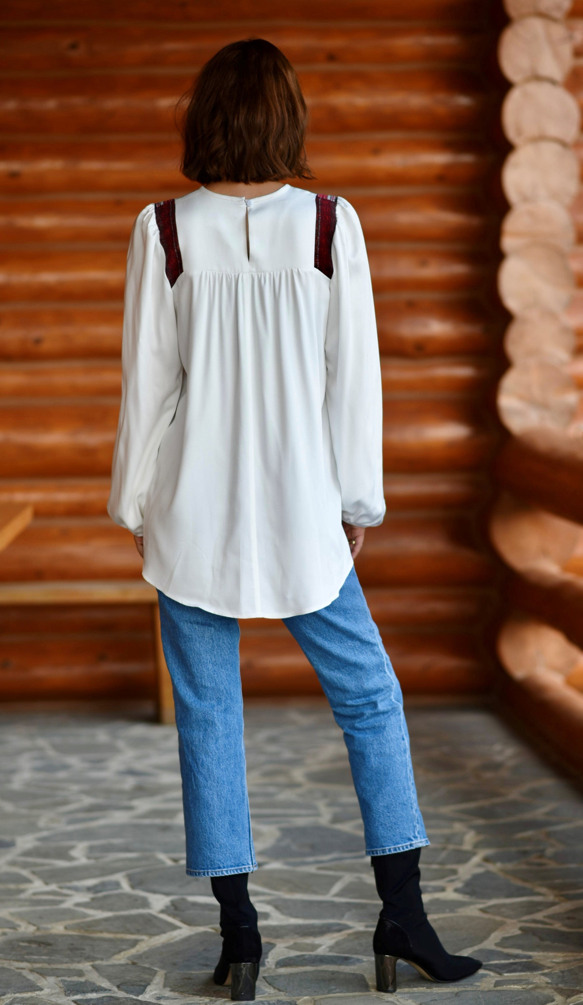 Bluza tradițională stilizată Daciana este confecționată din viscoză de calitate superioară și jacquard etnic țesut.