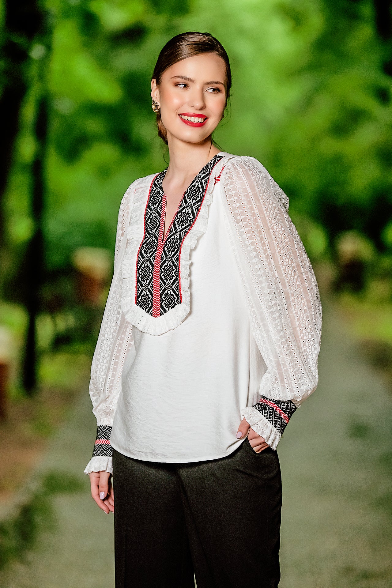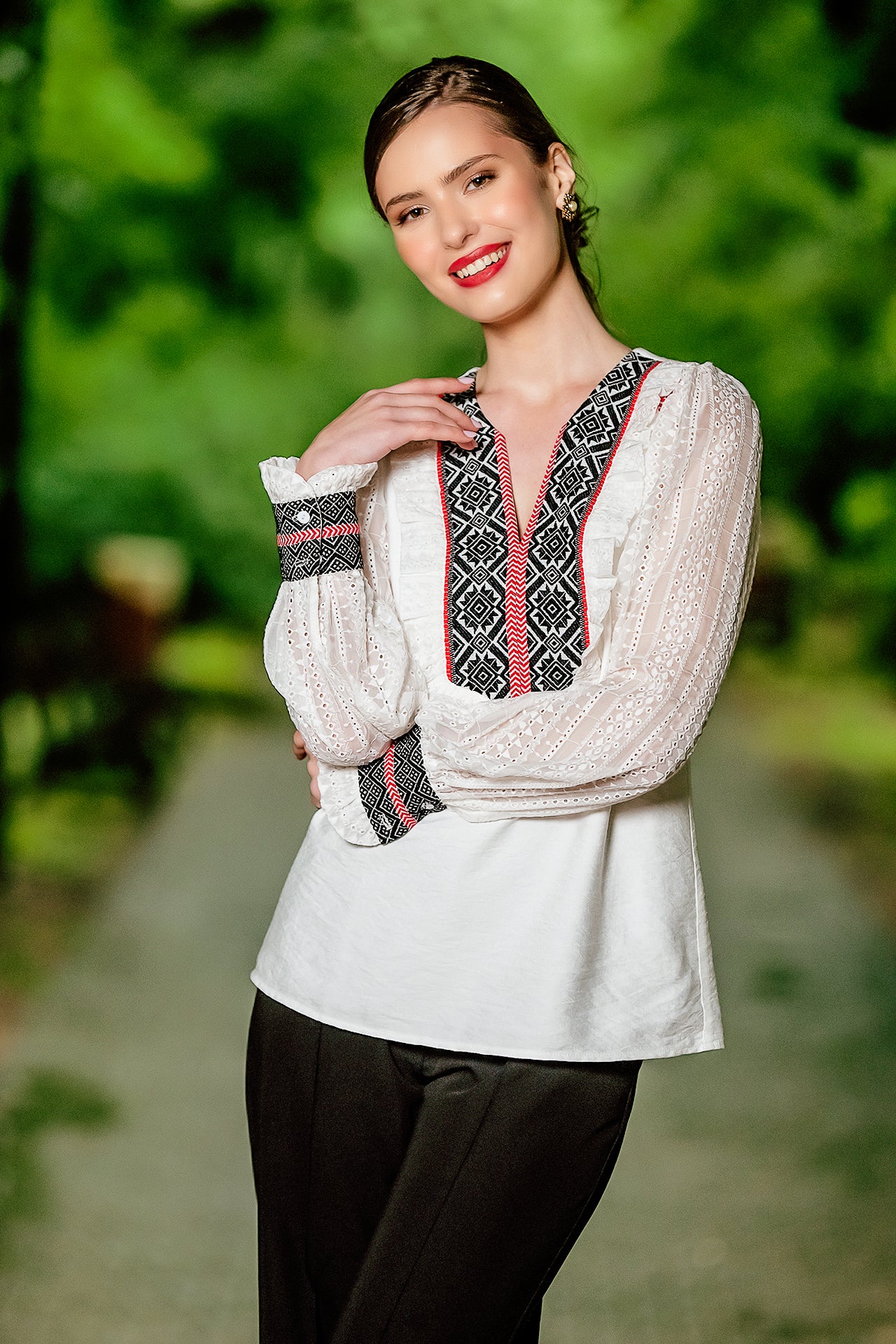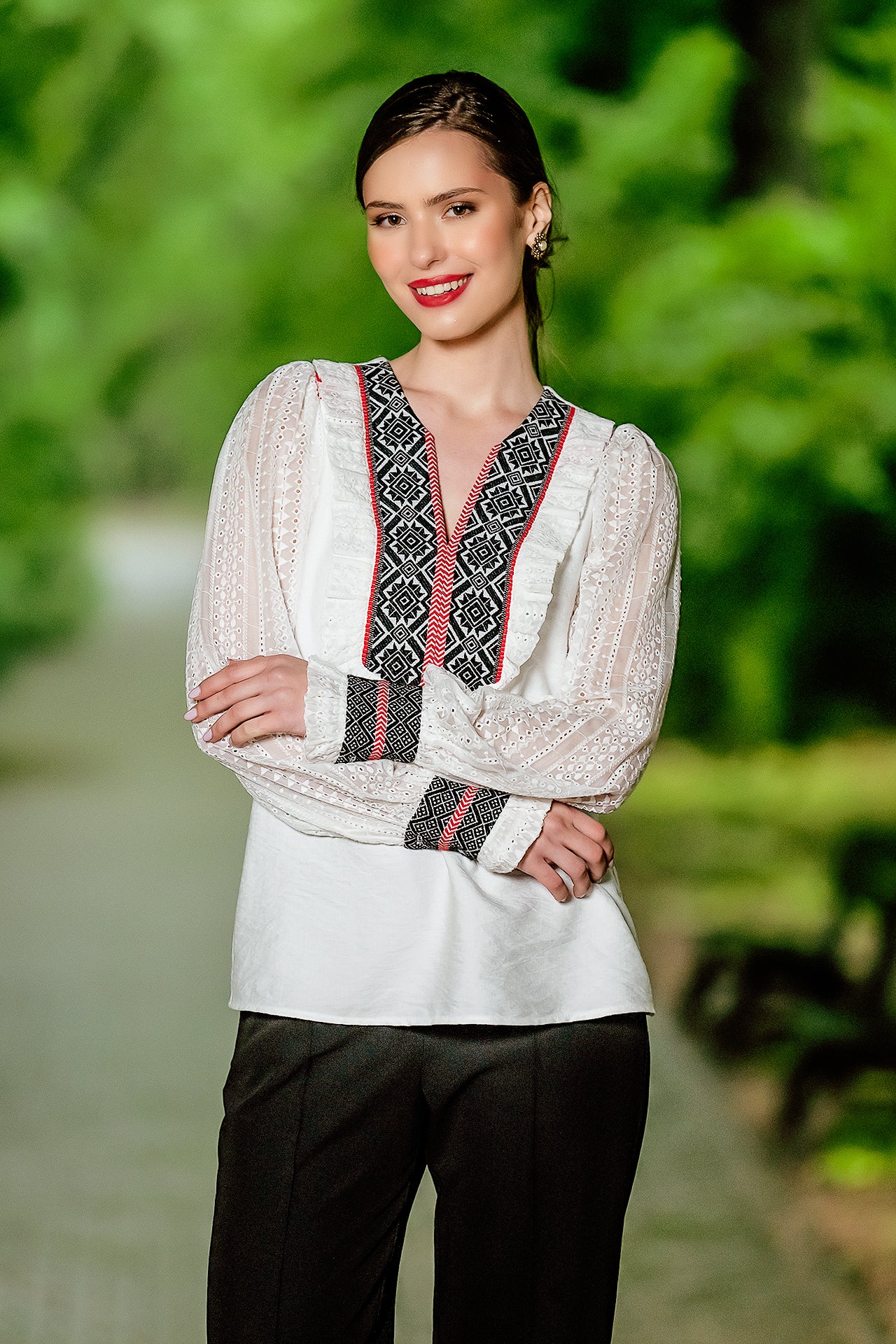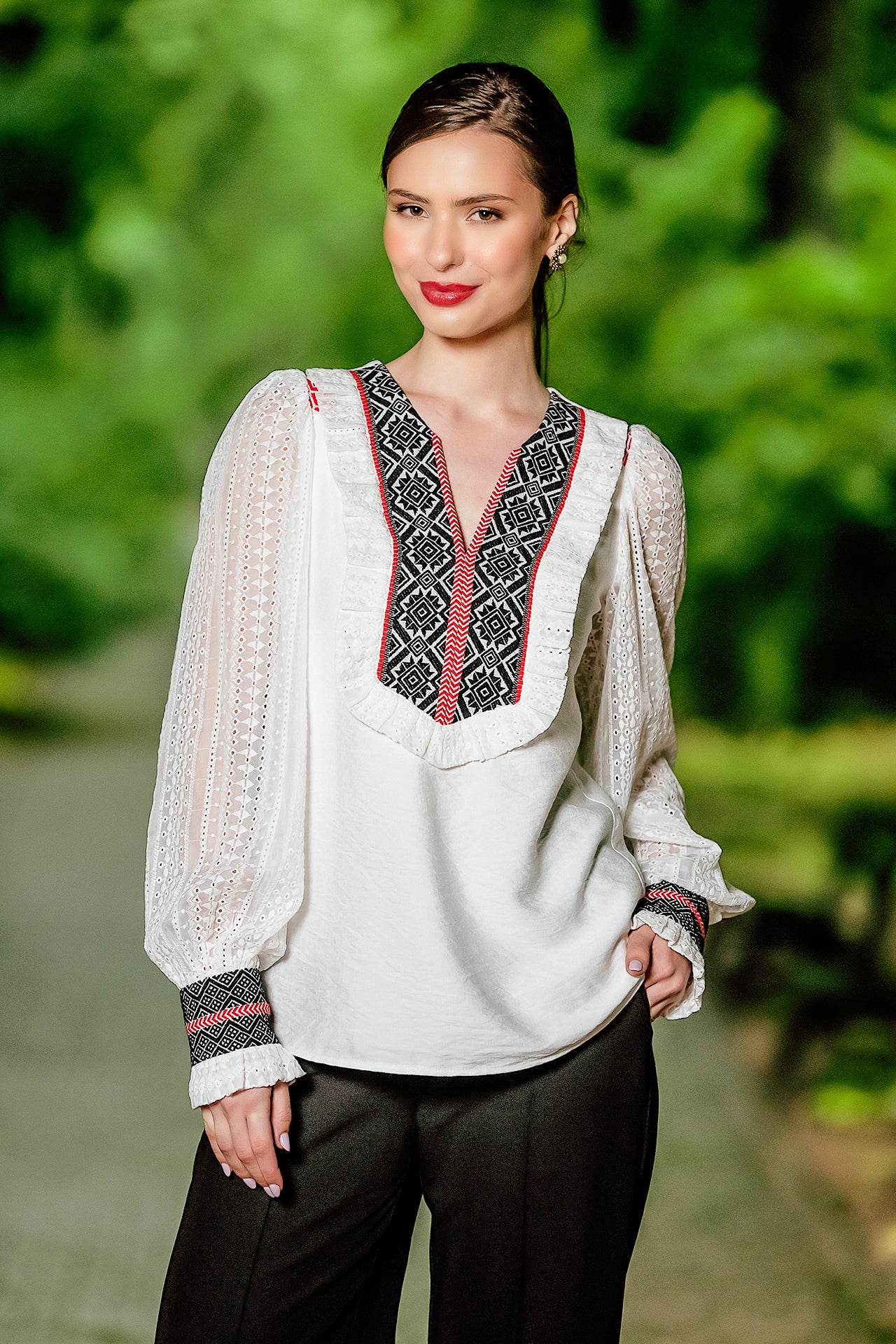 Cămașa alba Iris este confecționată din viscoza cu in, platca din jacquard țesut în contrast și mânecile ample din voal brodat cu manșete din jacquard paspoalate cu voal alb brodat.