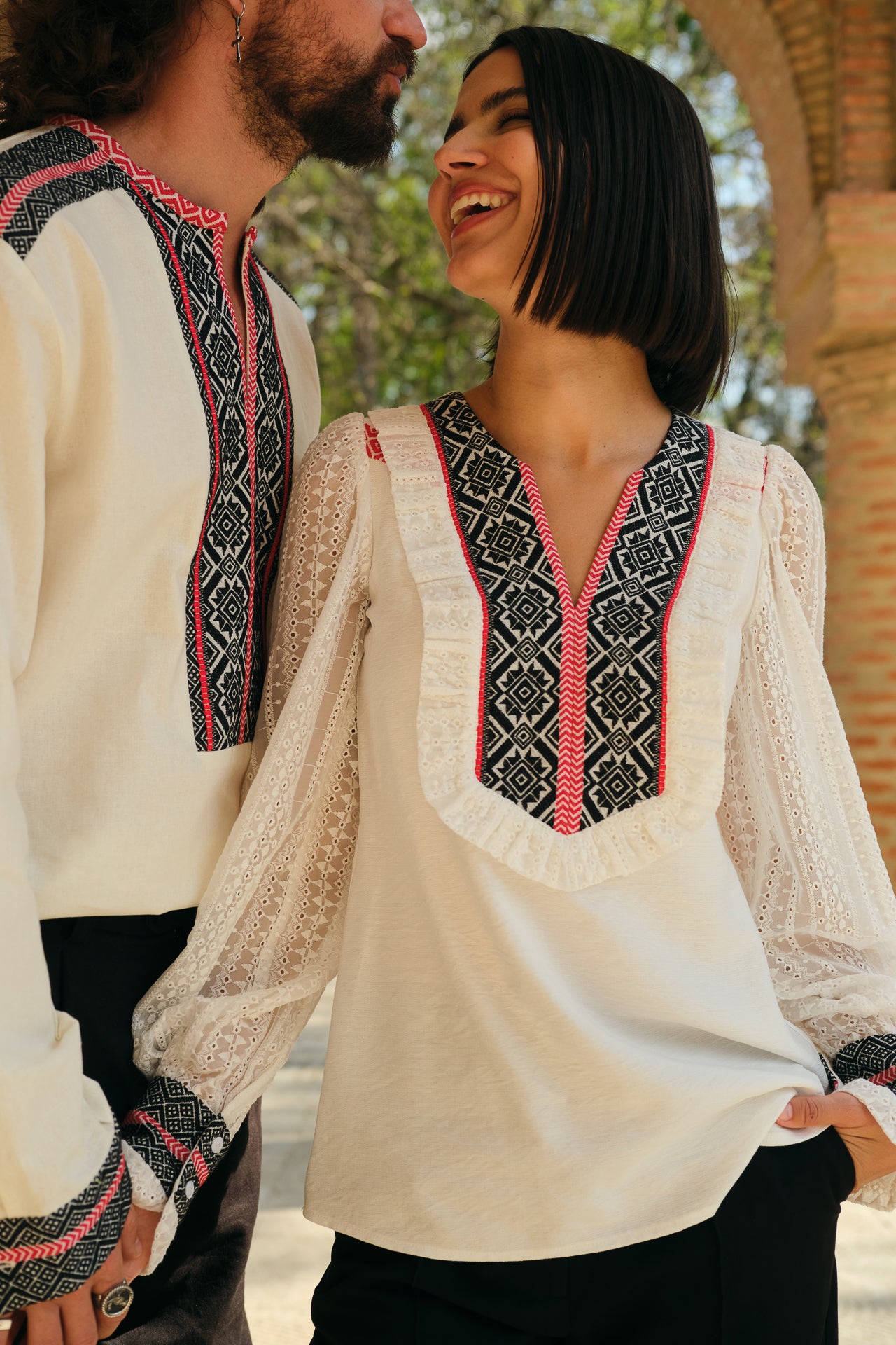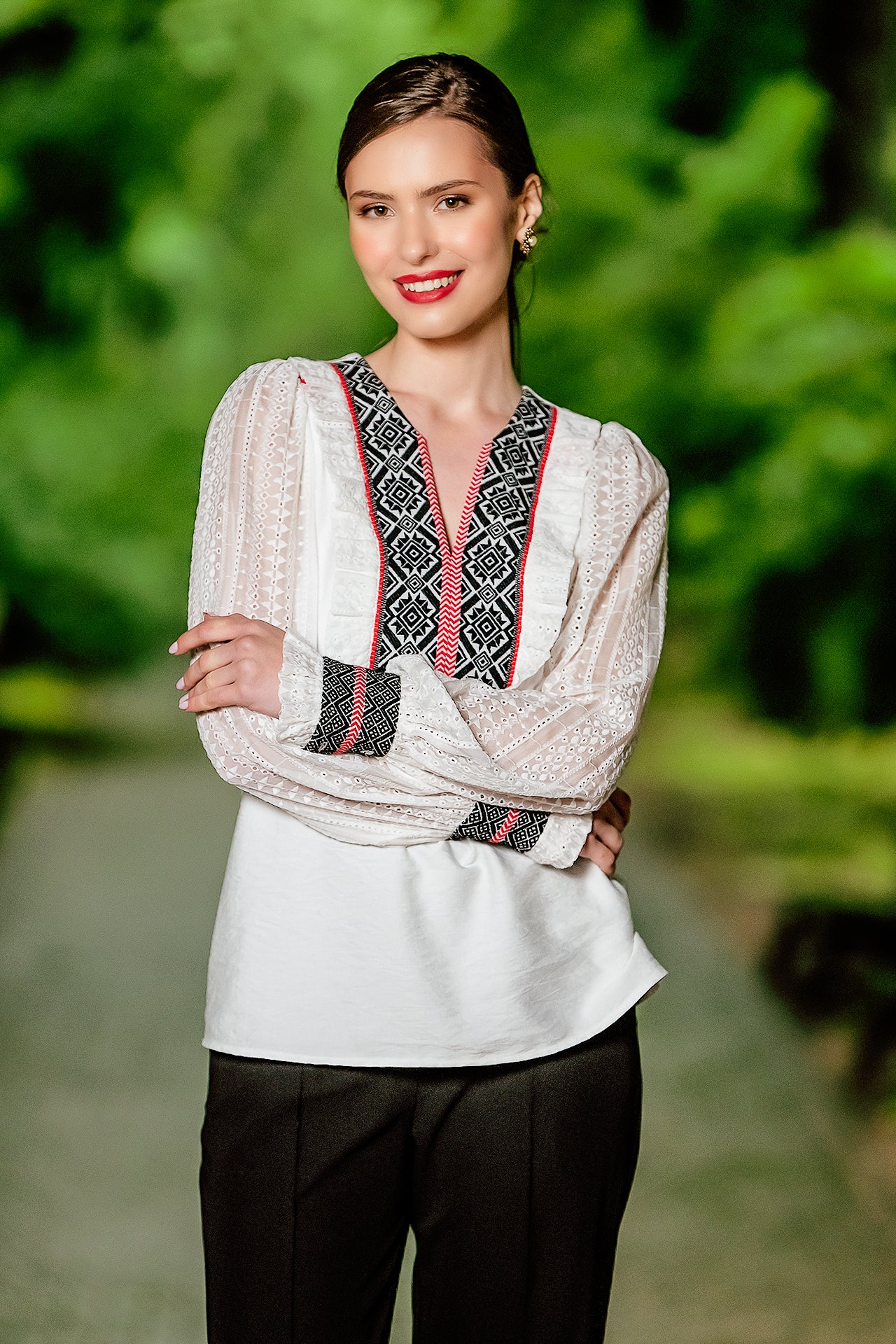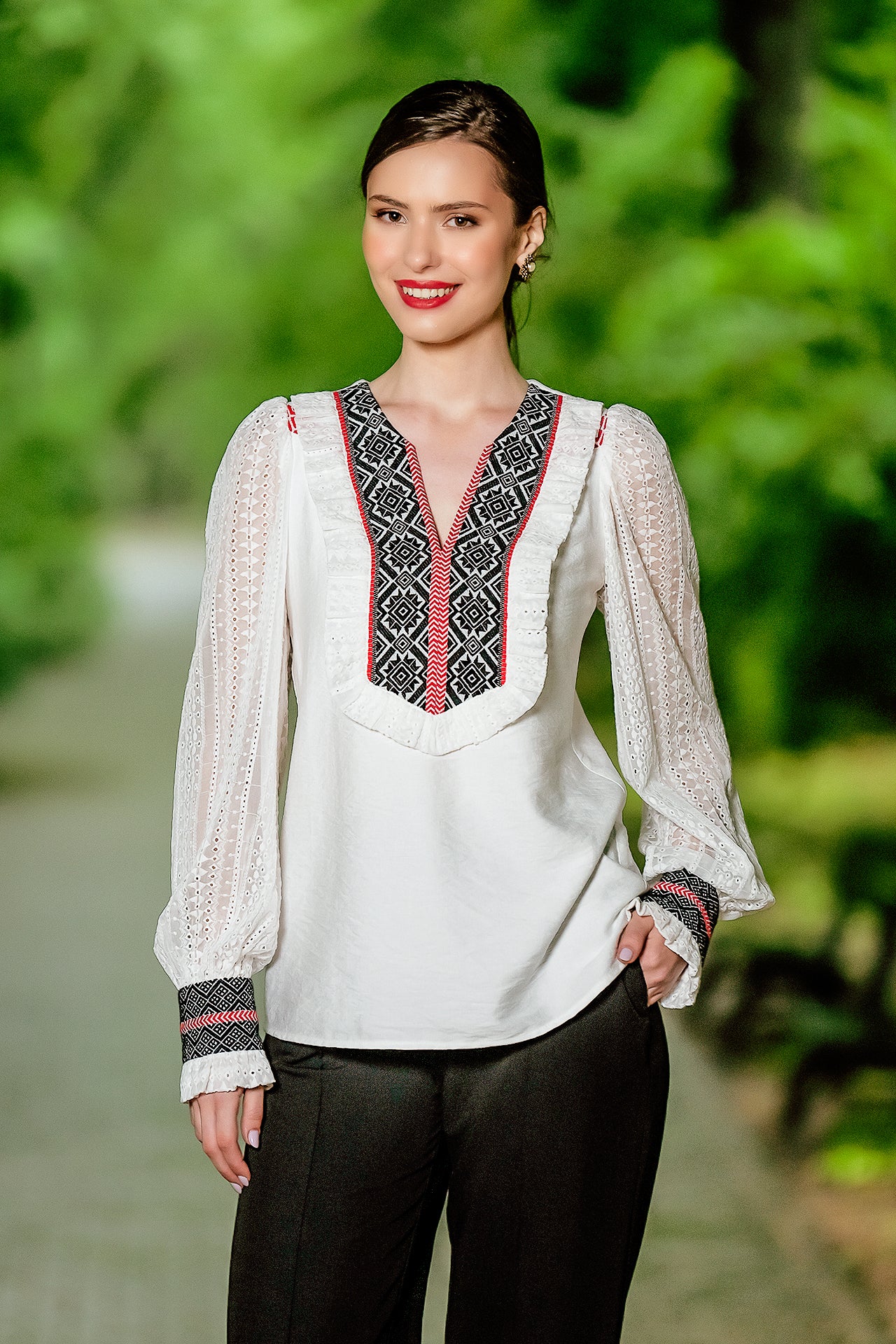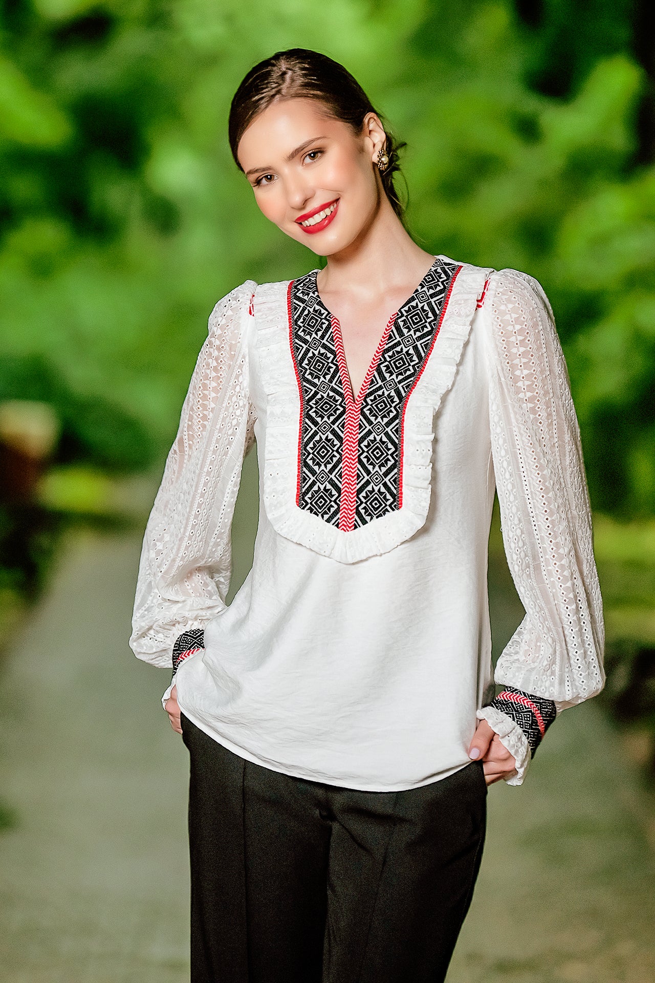 Cămașa alba Iris este confecționată din viscoza cu in, platca din jacquard țesut în contrast și mânecile ample din voal brodat cu manșete din jacquard paspoalate cu voal alb brodat.