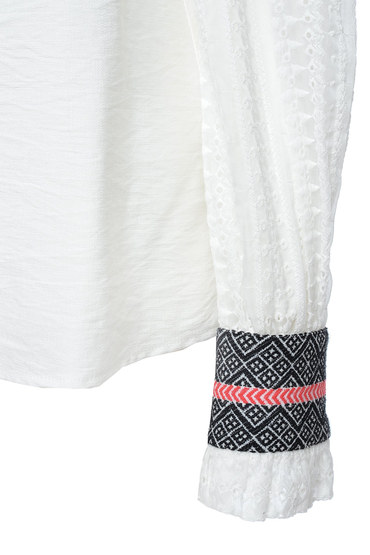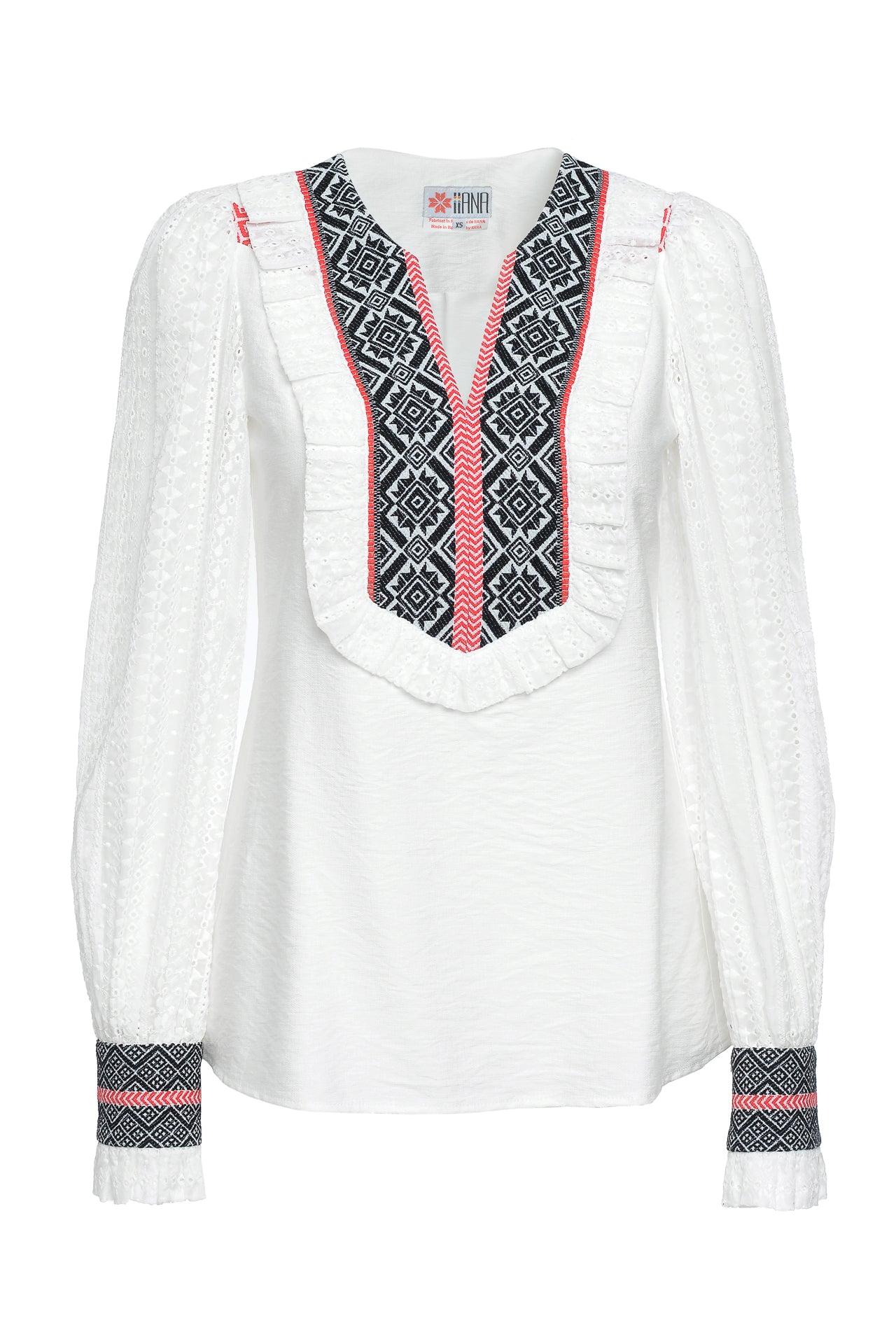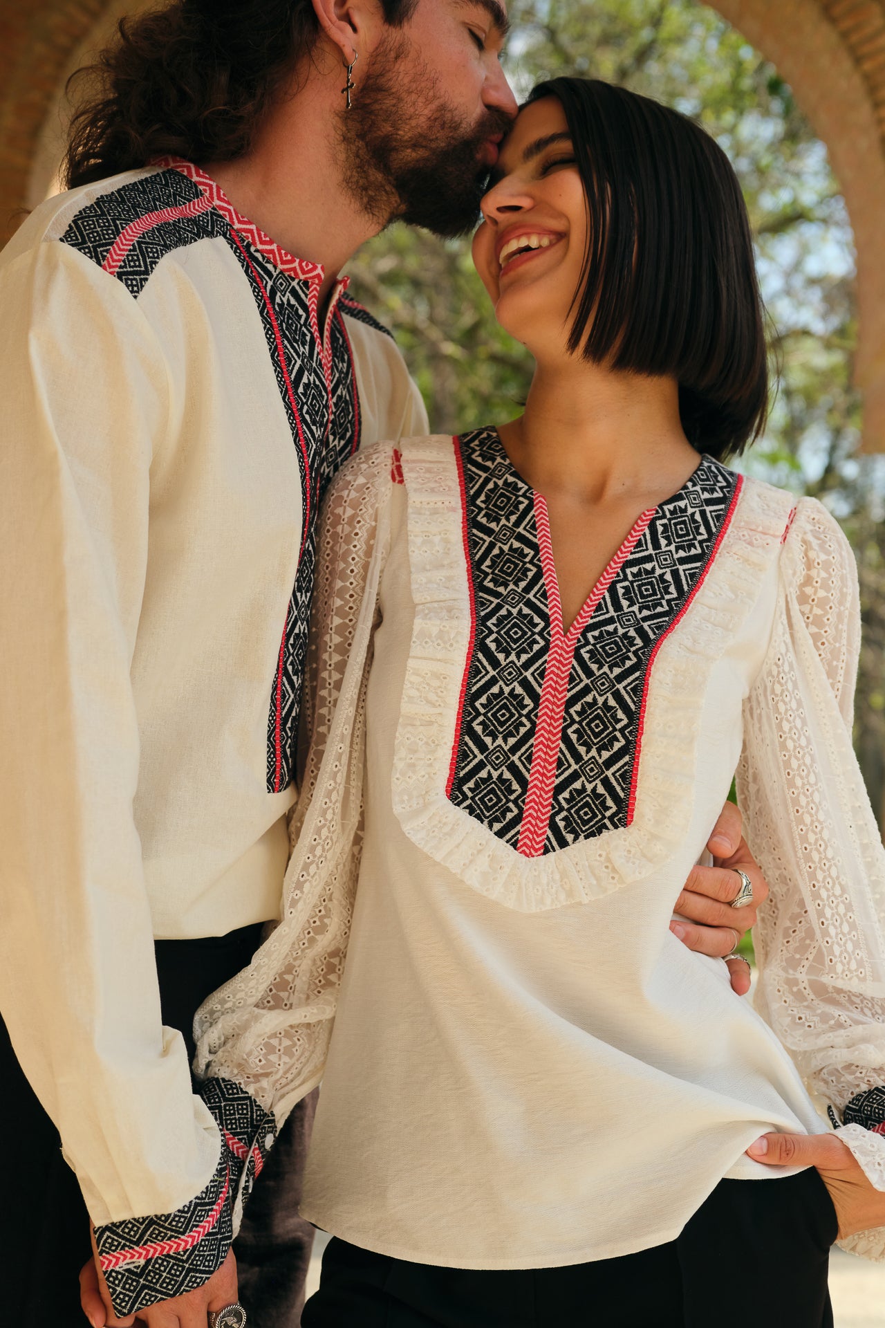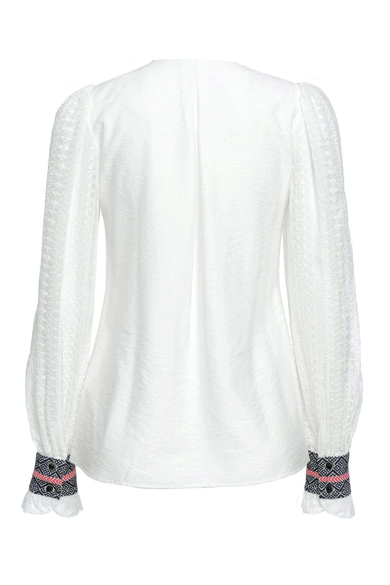 Cămașa alba Iris este confecționată din viscoza cu in, platca din jacquard țesut în contrast și mânecile ample din voal brodat cu manșete din jacquard paspoalate cu voal alb brodat.