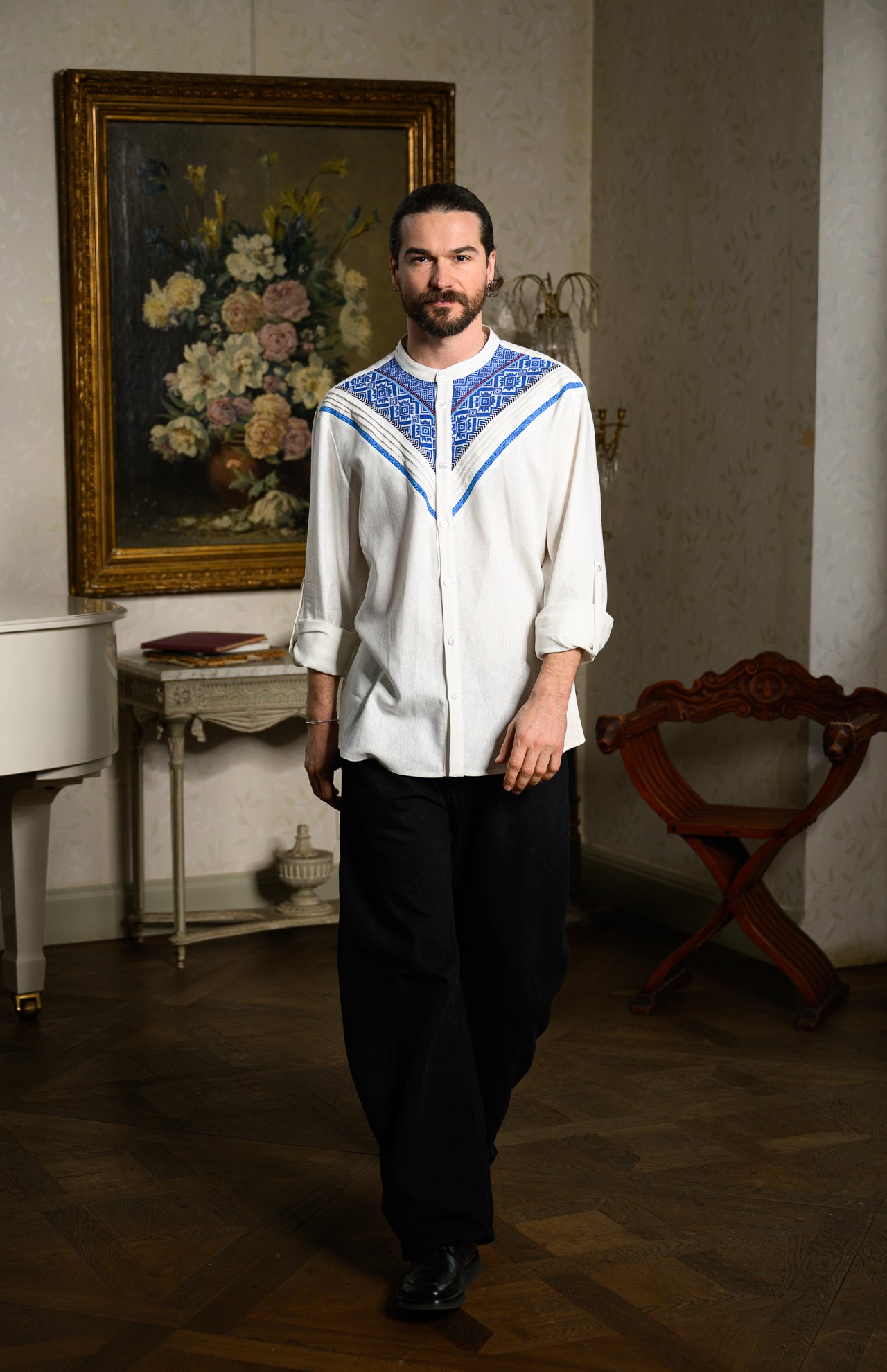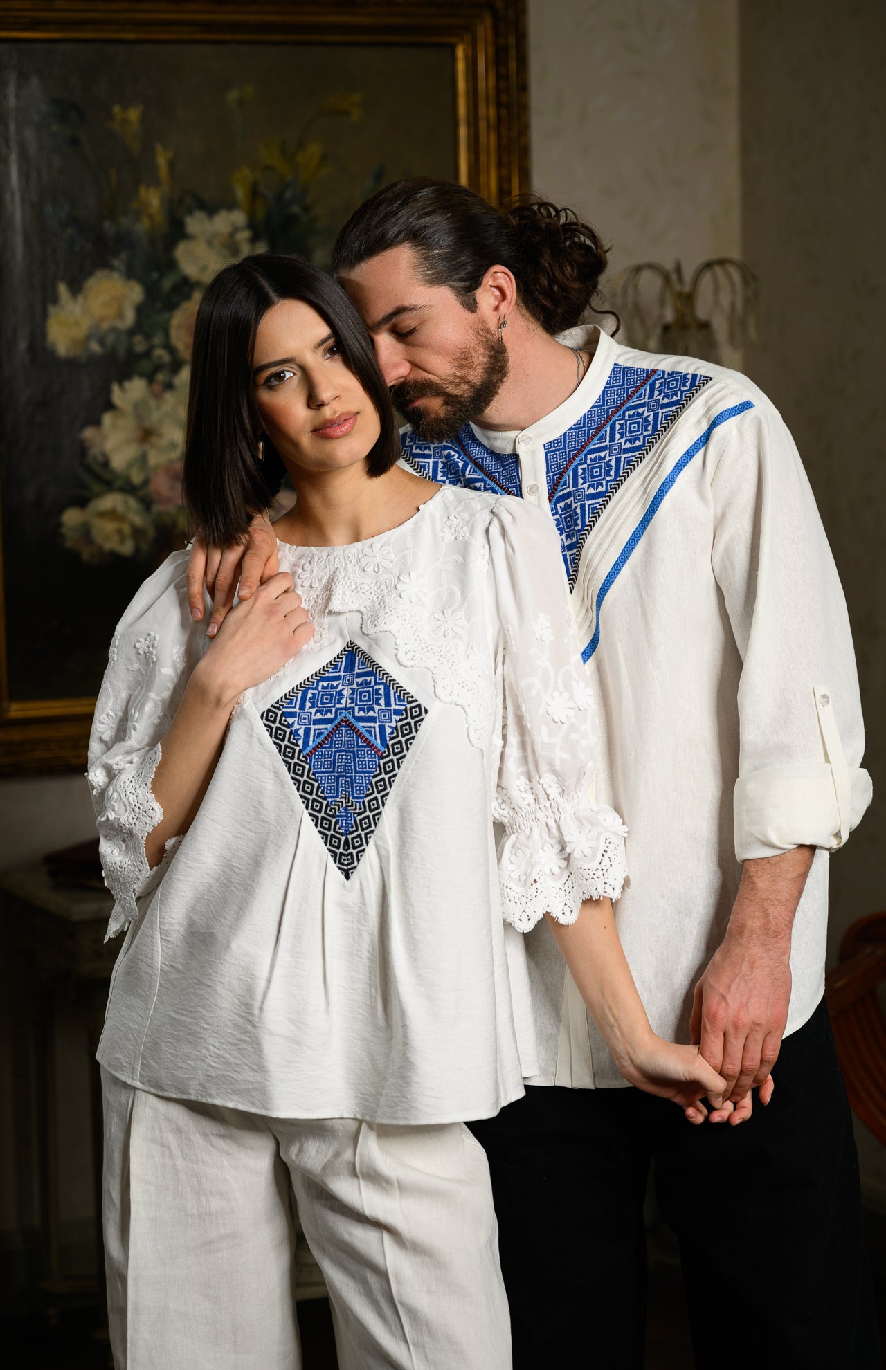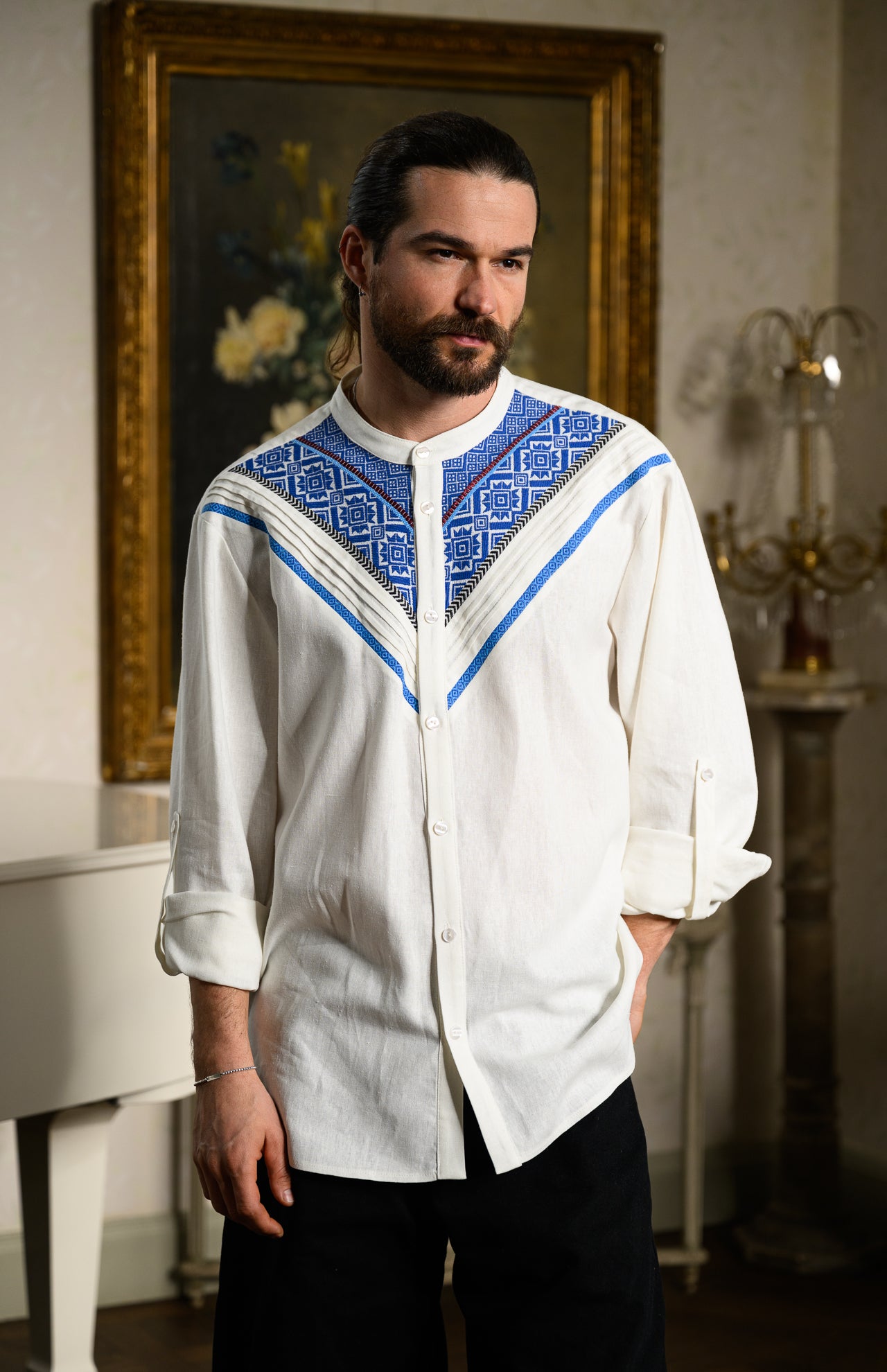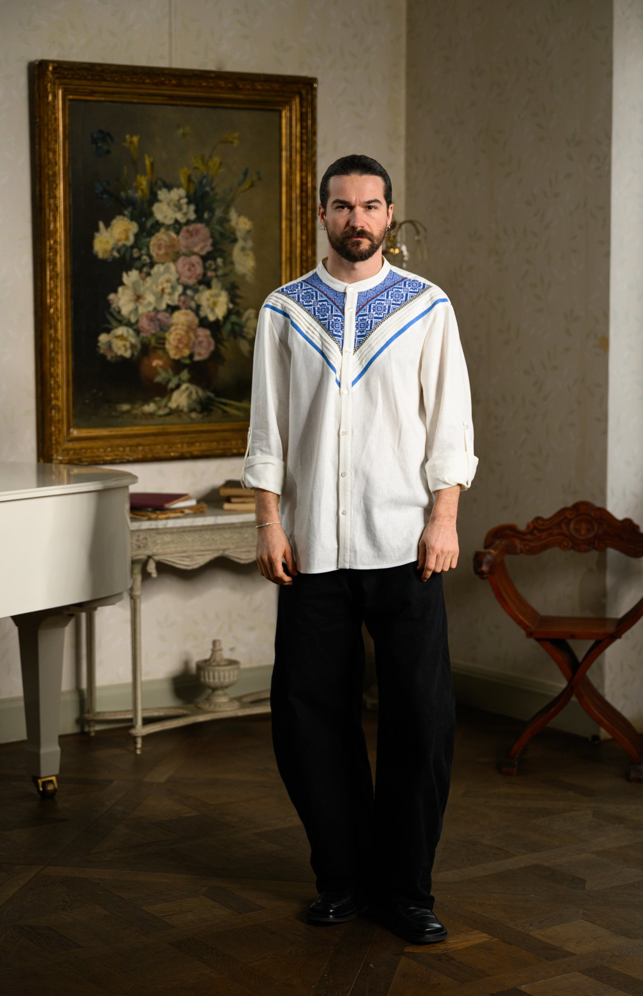 Cămașa bărbătească cu motive tradiționale este confecționată din in alb și jacquard țesut în contextură cu motive tradiționale.