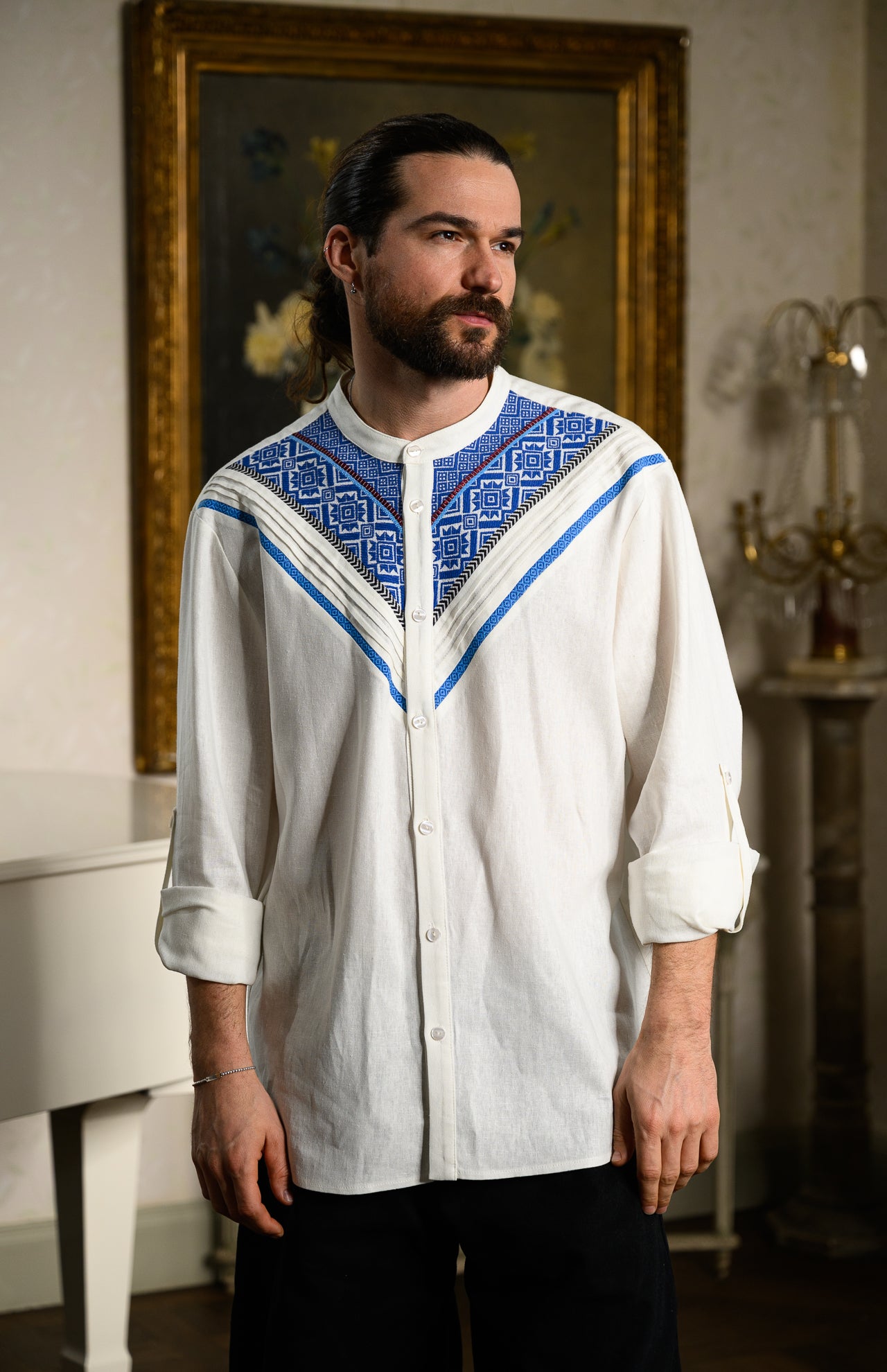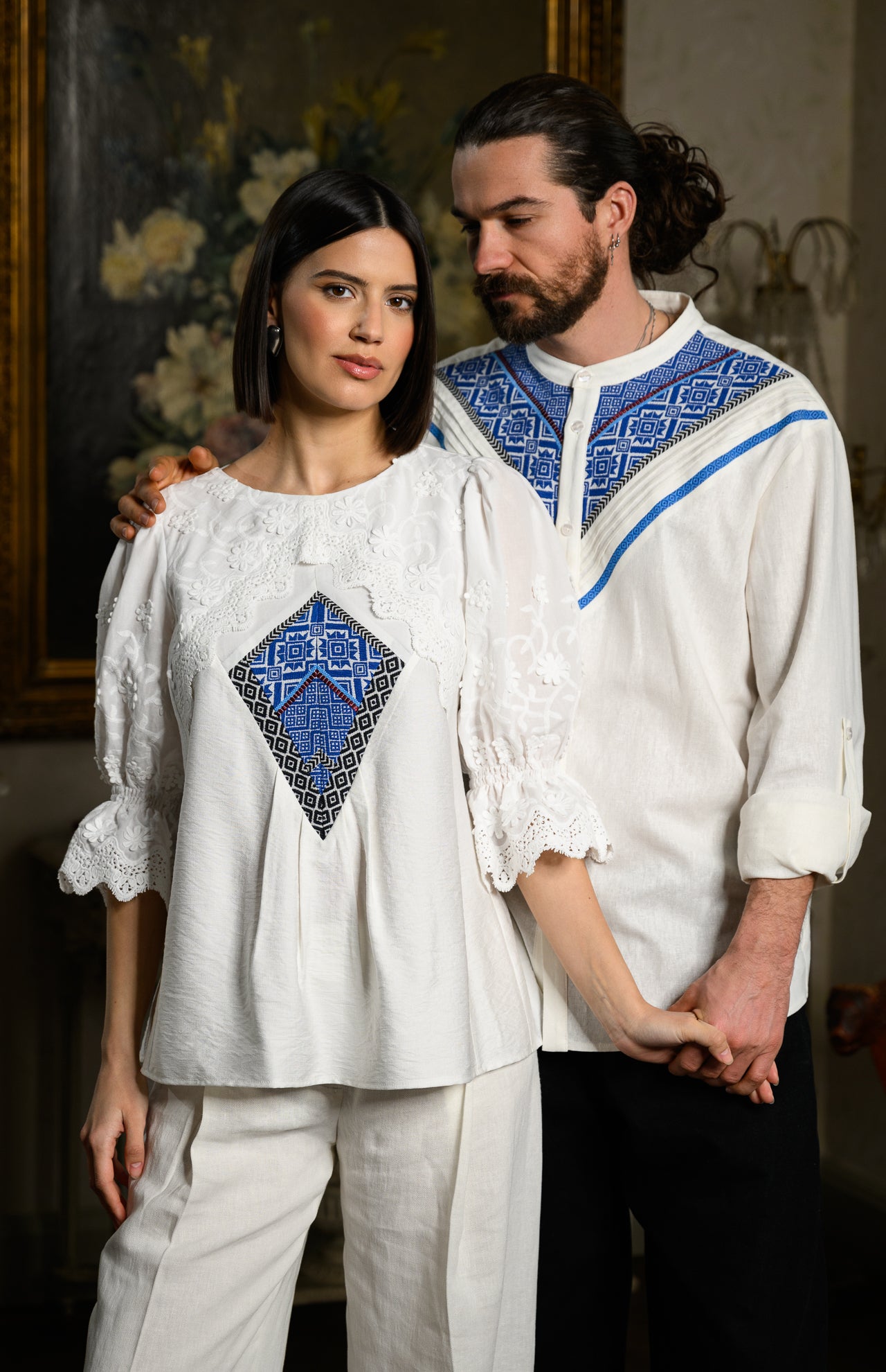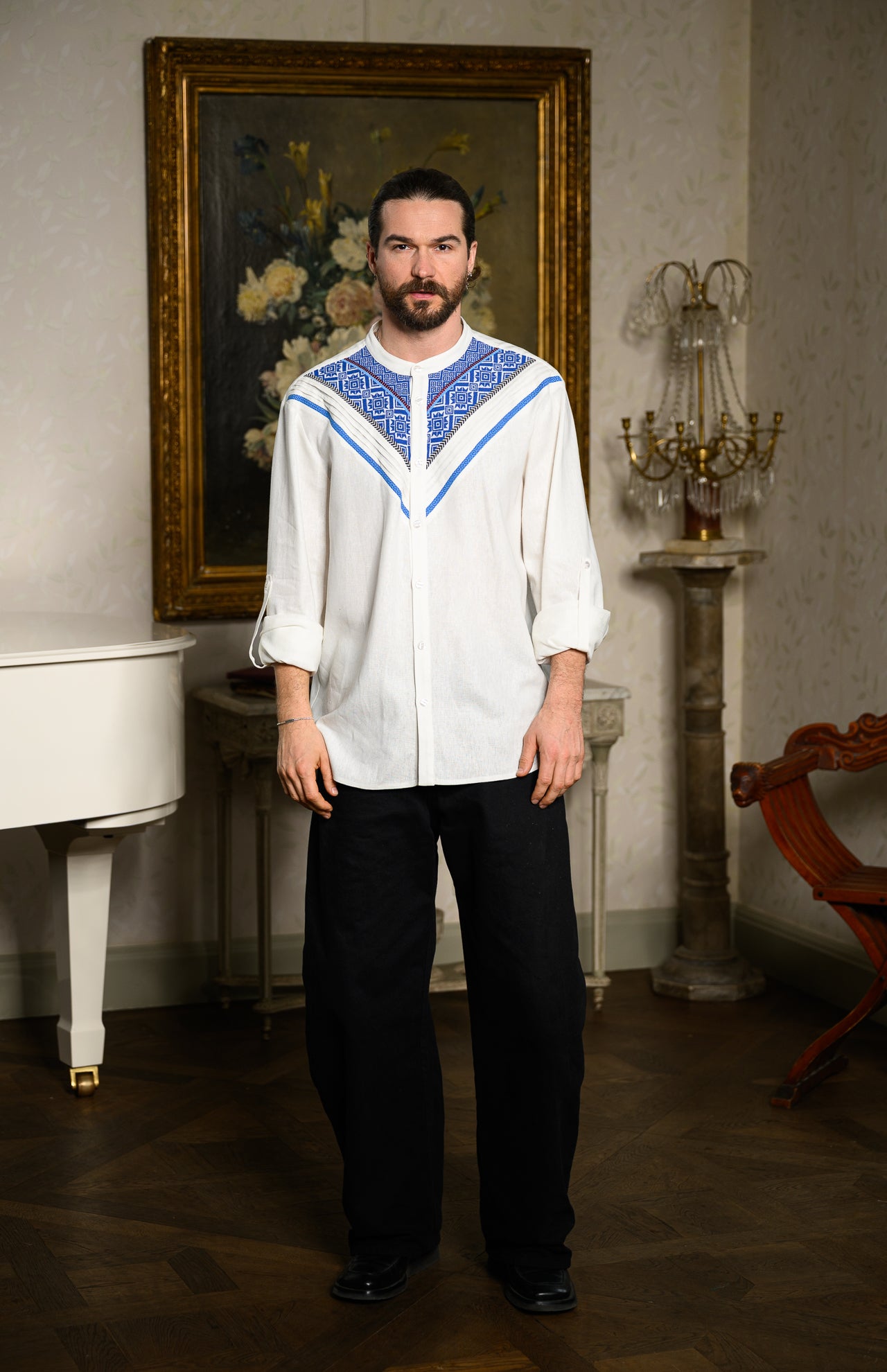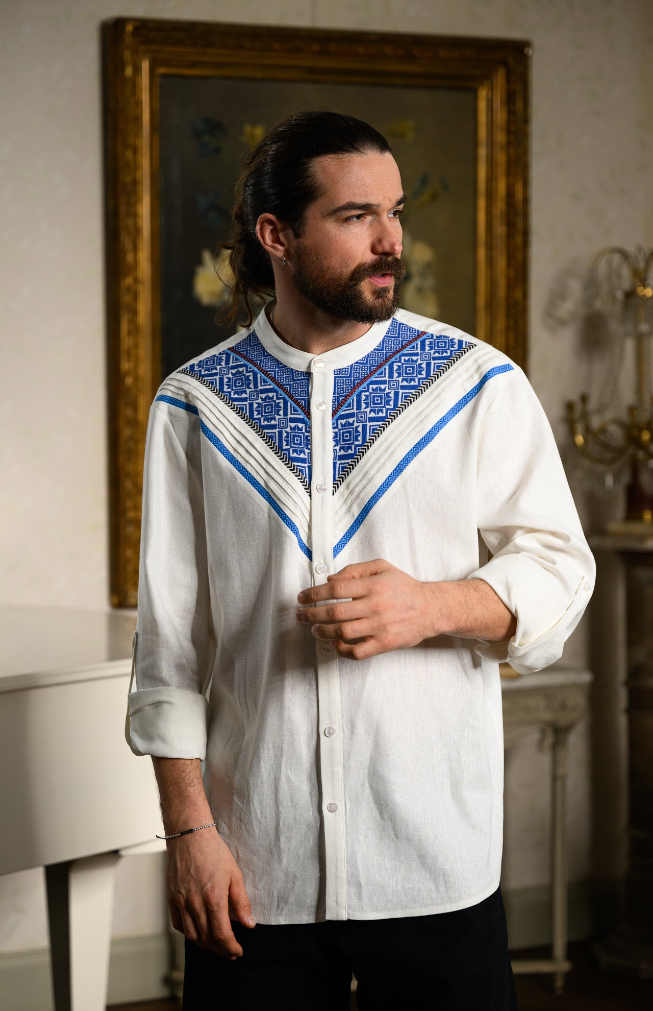 Cămașa bărbătească cu motive tradiționale este confecționată din in alb și jacquard țesut în contextură cu motive tradiționale.