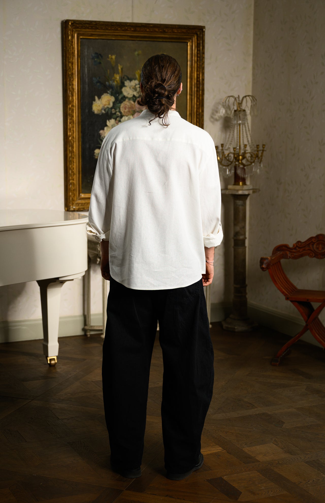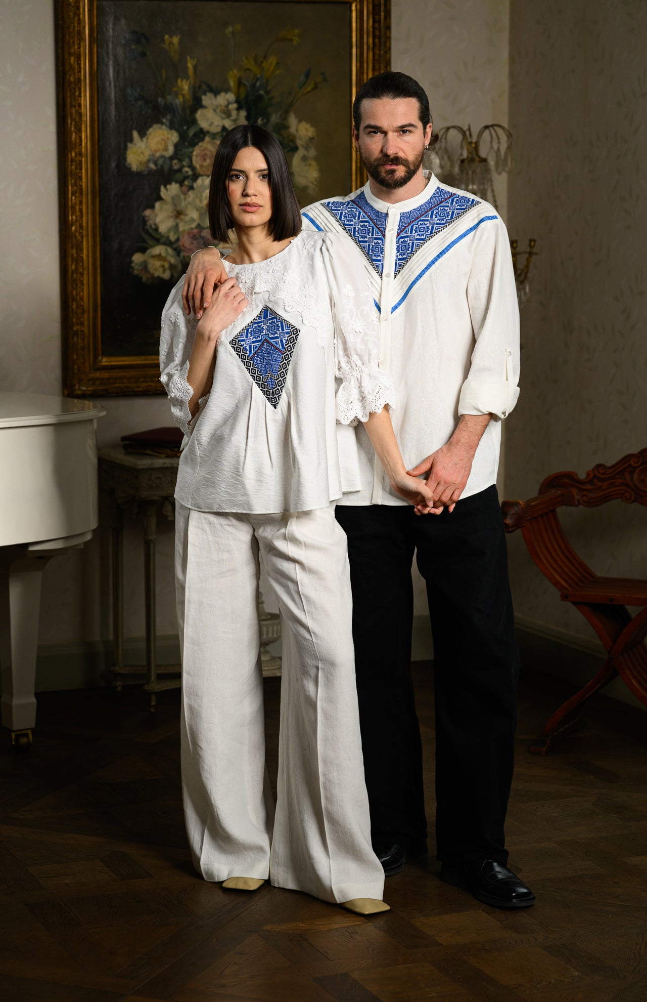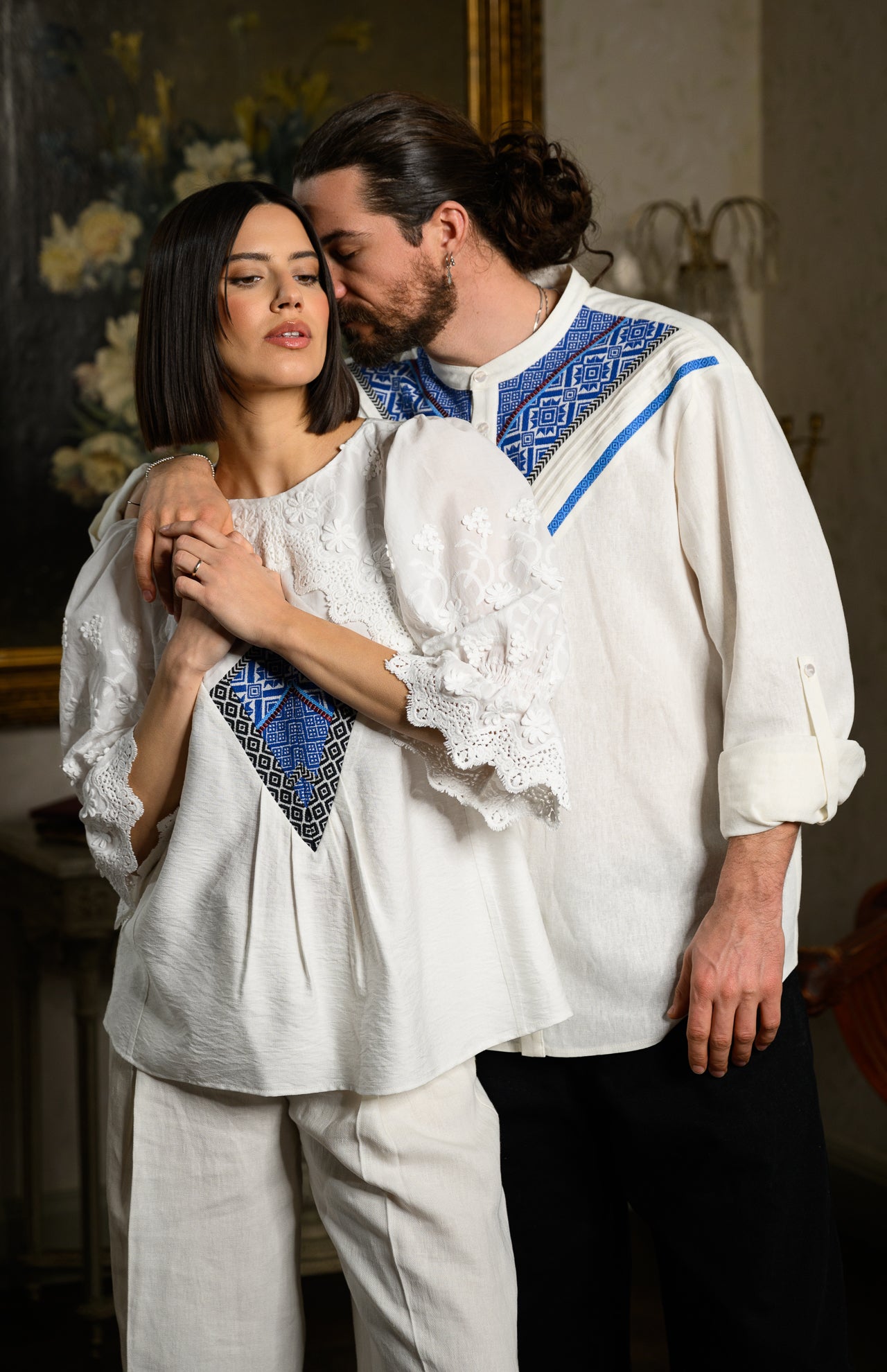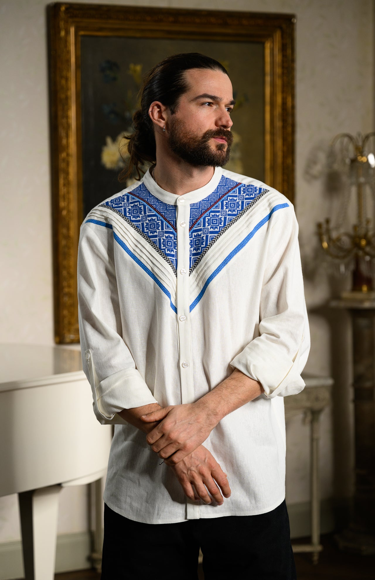 Cămașa bărbătească cu motive tradiționale este confecționată din in alb și jacquard țesut în contextură cu motive tradiționale.