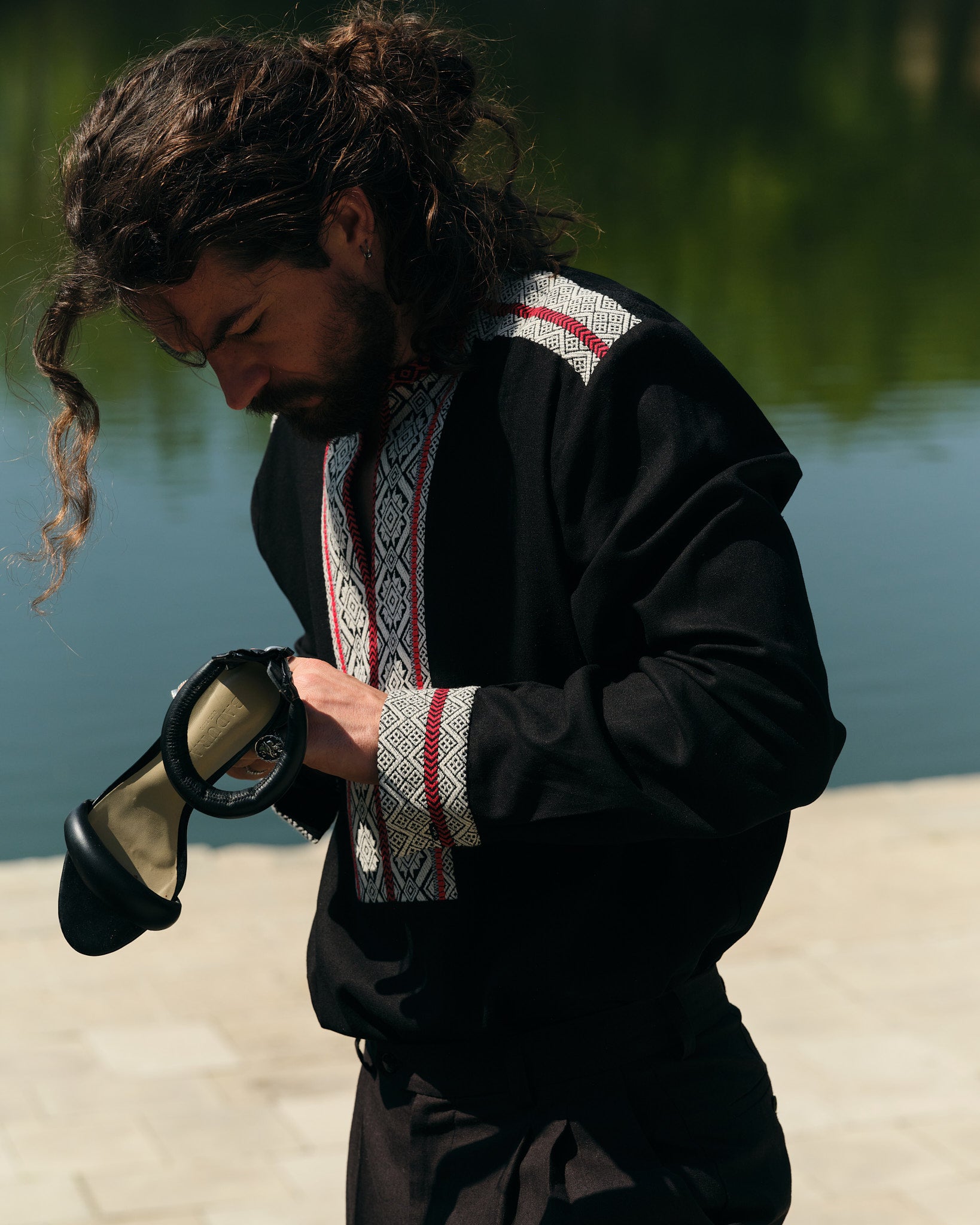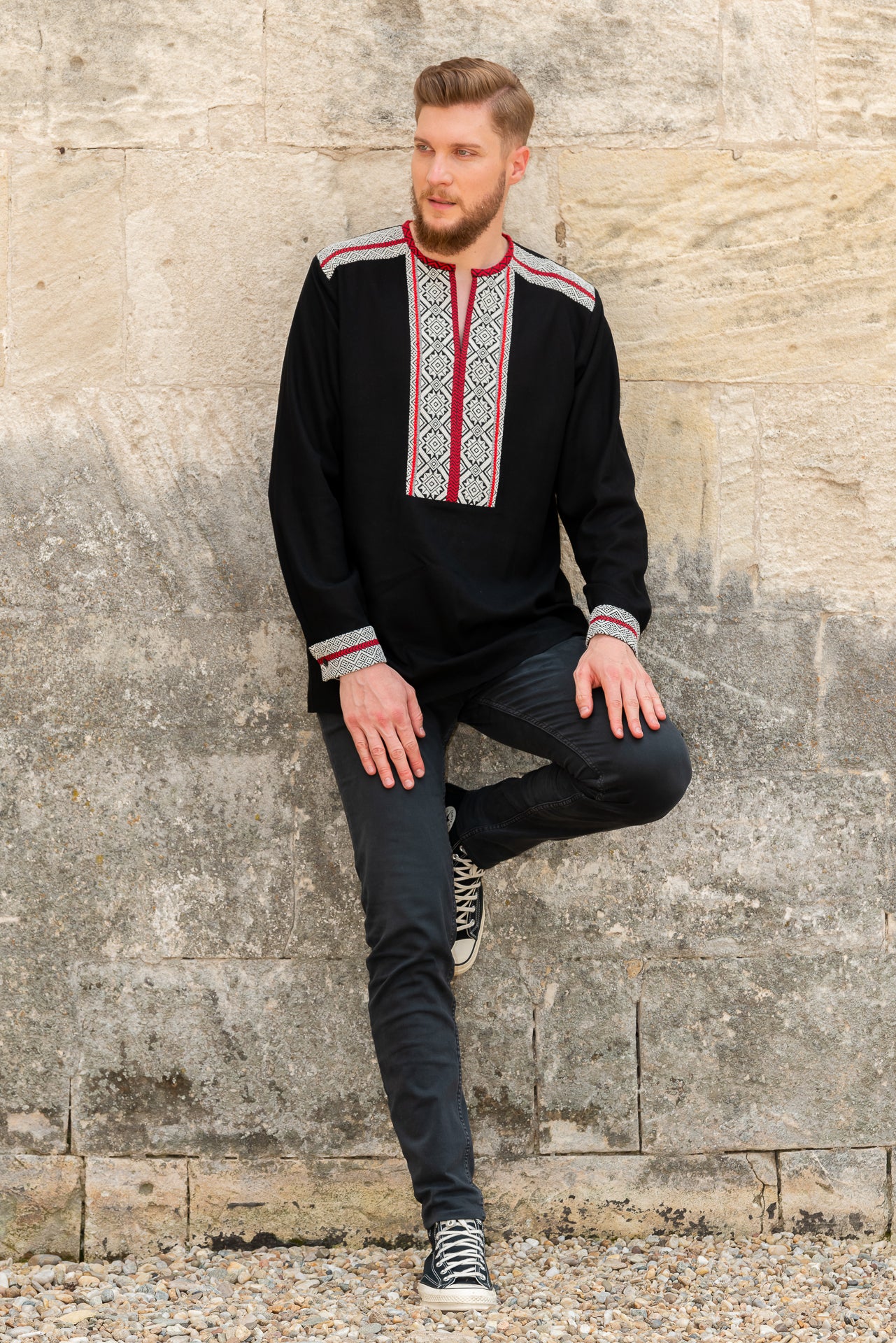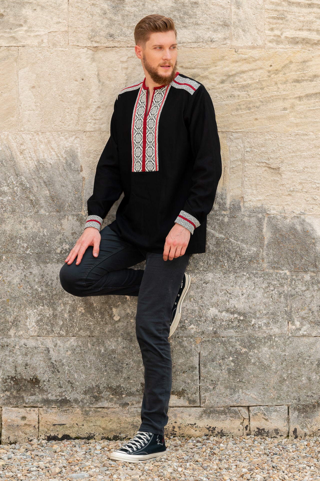Camasa Barbateasca Traditionala Vladislav Cu Motive Populare este o piesă stilizată, inspirată din portul popular. Aceasta este confecționată din in prespalat, cu platcă, epoleți și manșete din jacquard etnic țesut. Are o croiala arhaică dreapta, cu mânecile amplu croite. Poate fi integrată cu succes într-o ținută relaxată de zi cu jeans și într-o ținută tradiționala cu pantalon.