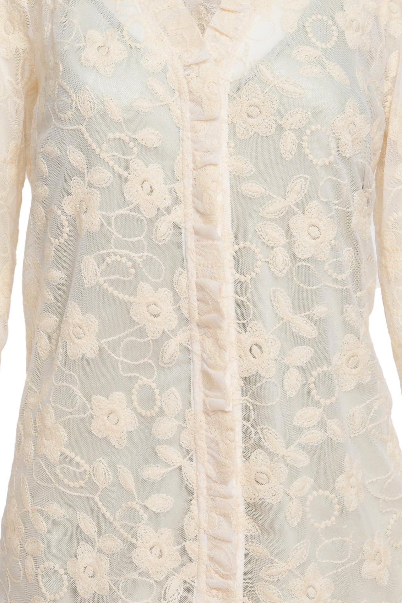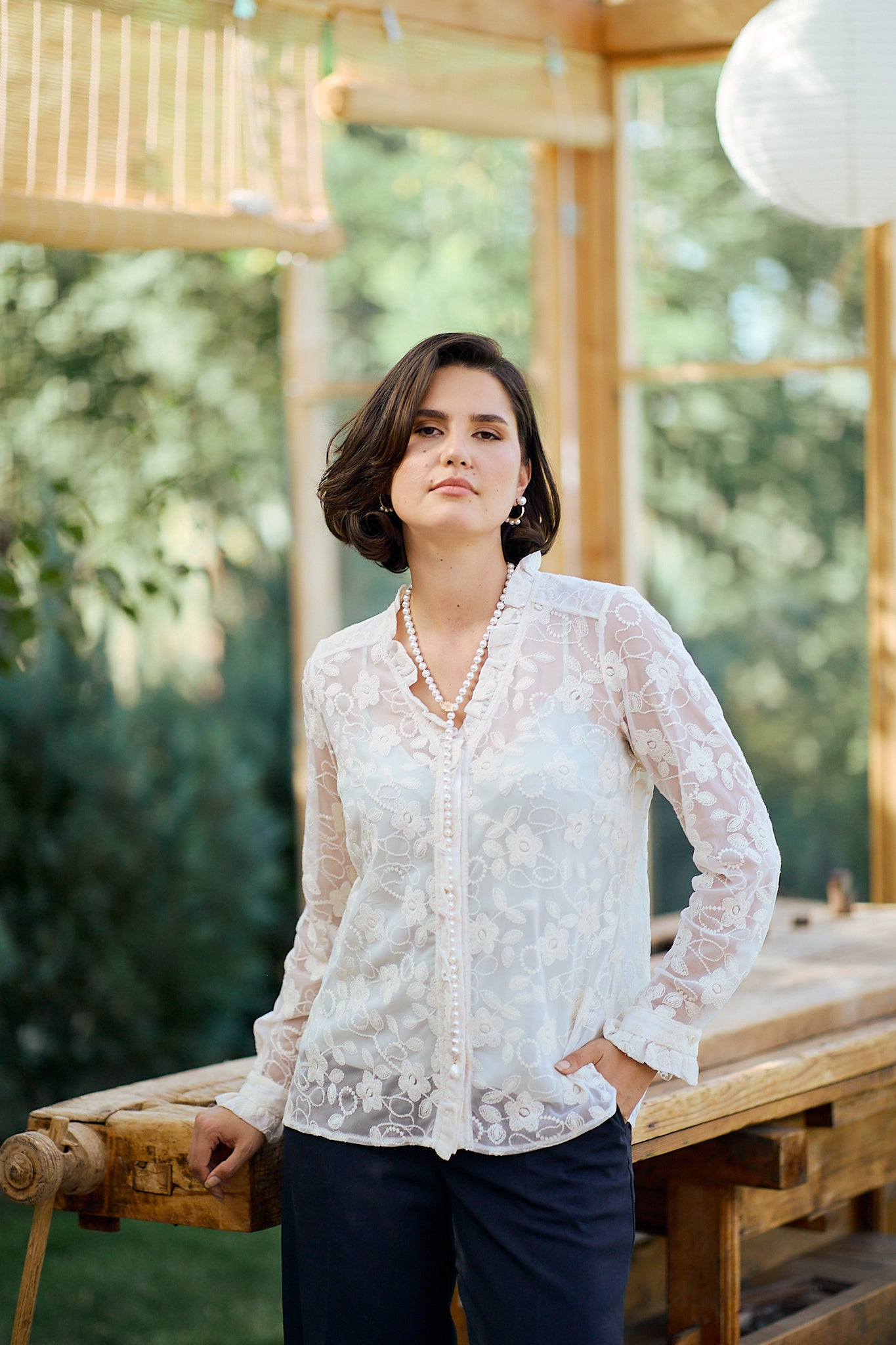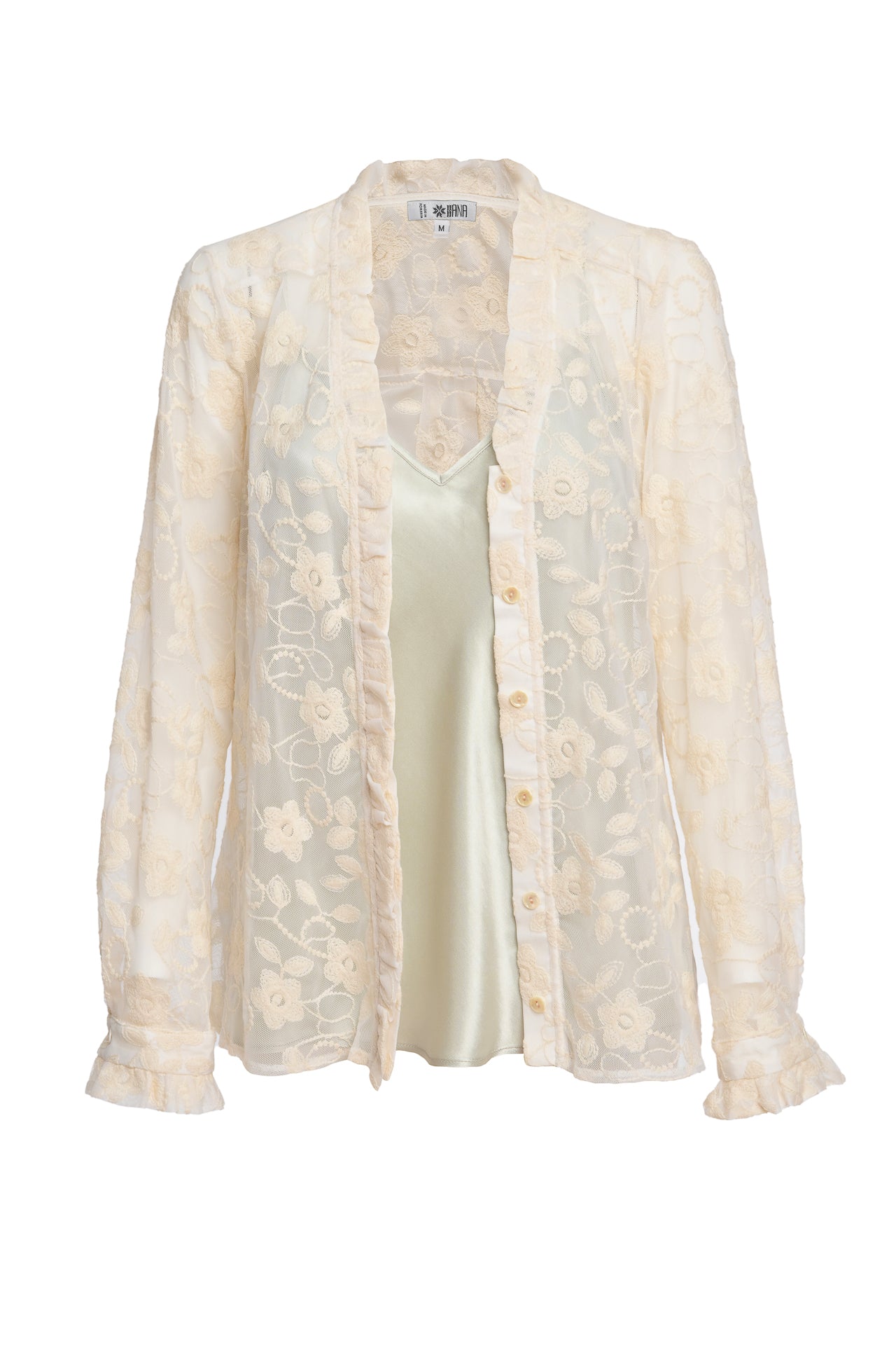 Cămașa blazer din dantelă este o piesă versatilă și elegantă, confecționată din dantelă florală ivoar, cu maiou din viscoză satinată.