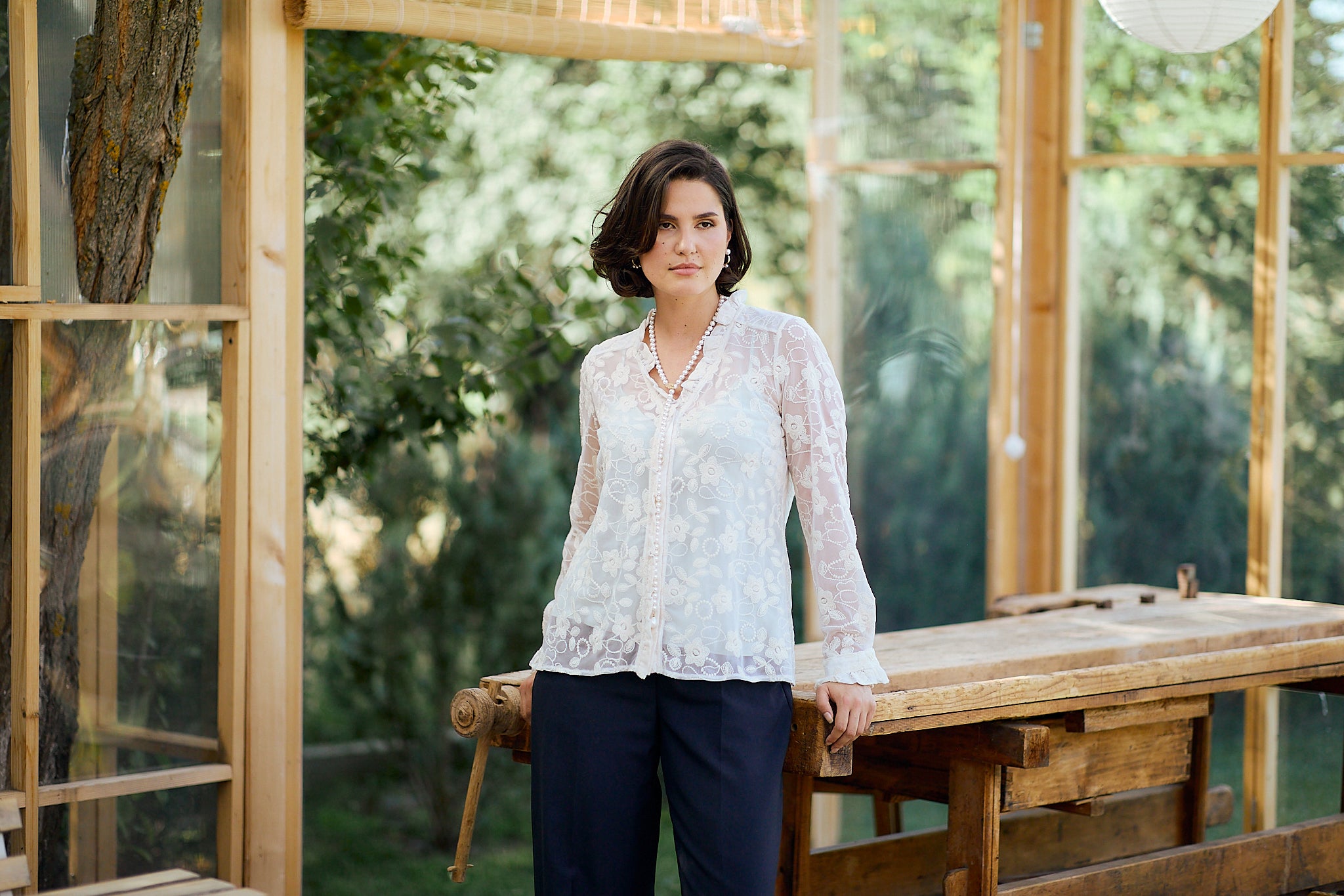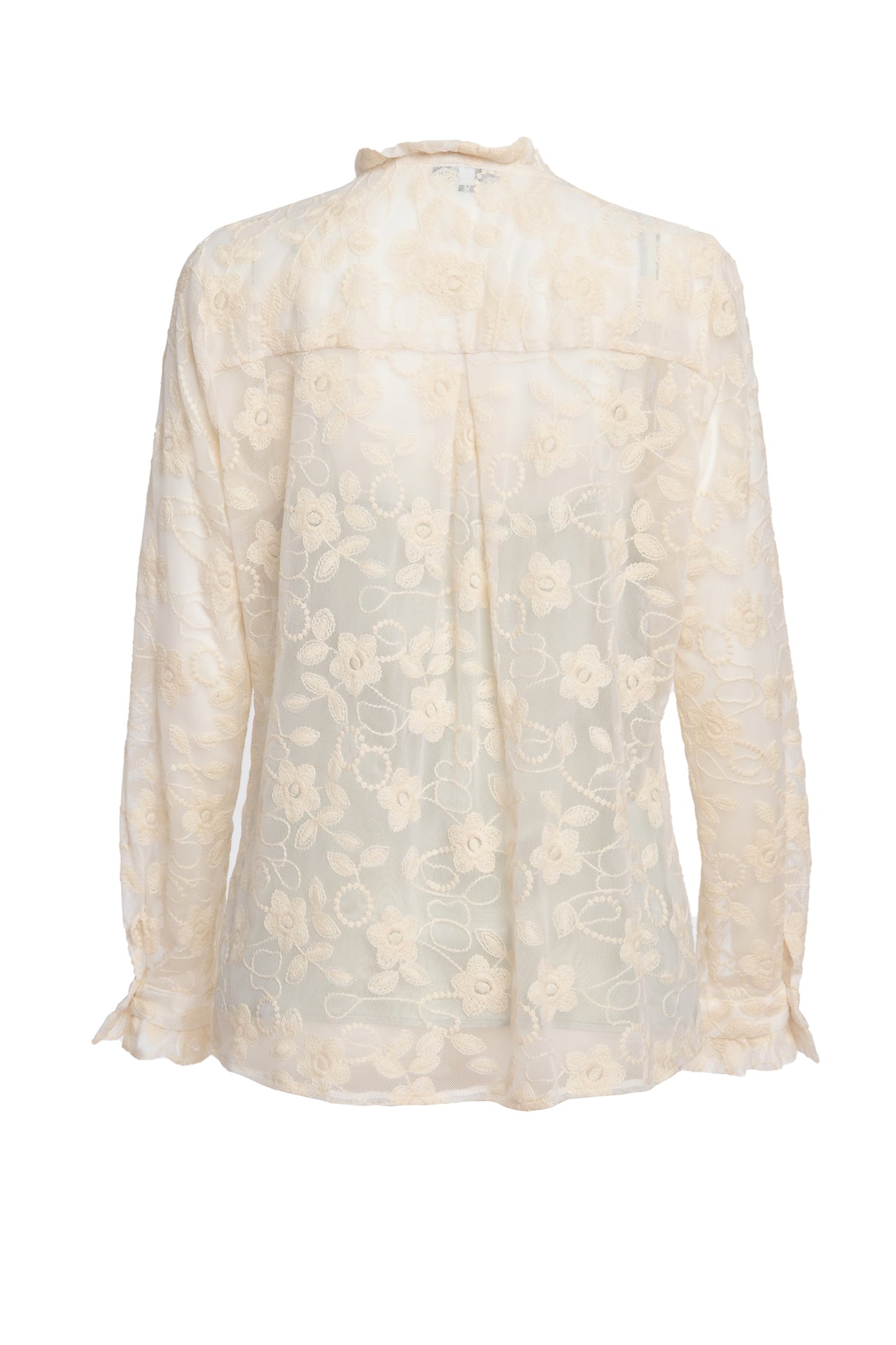 Cămașa - blazer are un croi drept, lejer, cu decolteu în anchior și mâneci cu manșete paspoalate de volan din dantelă.