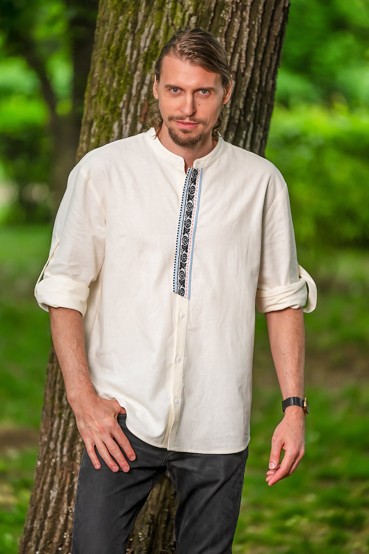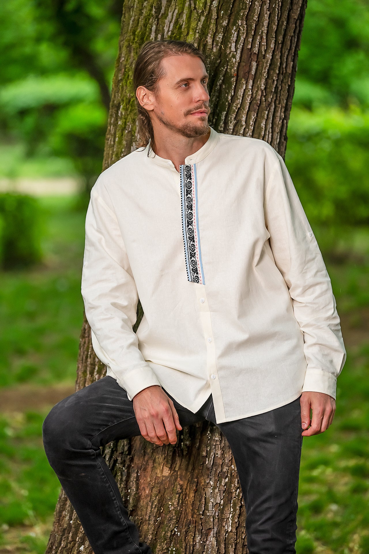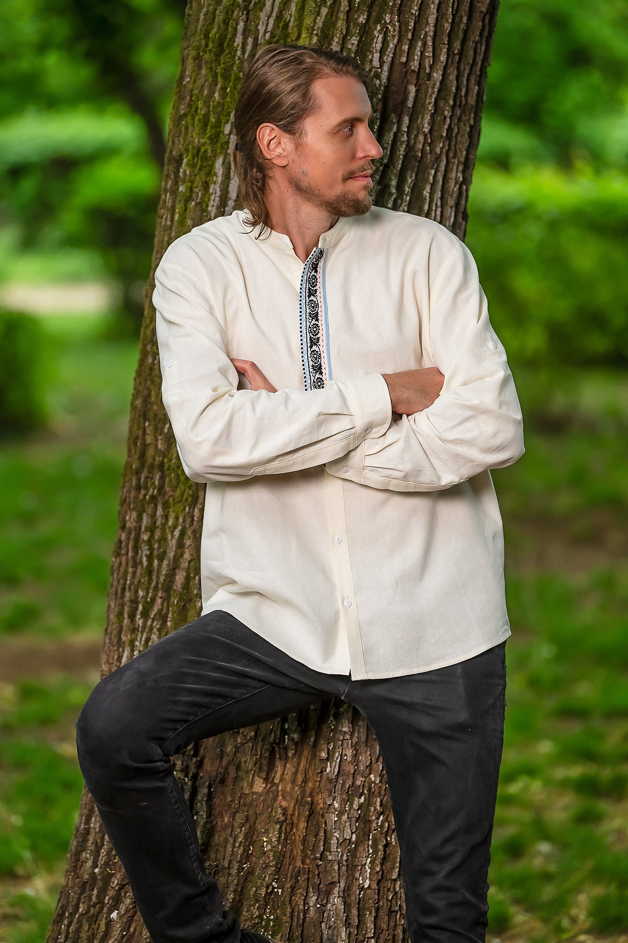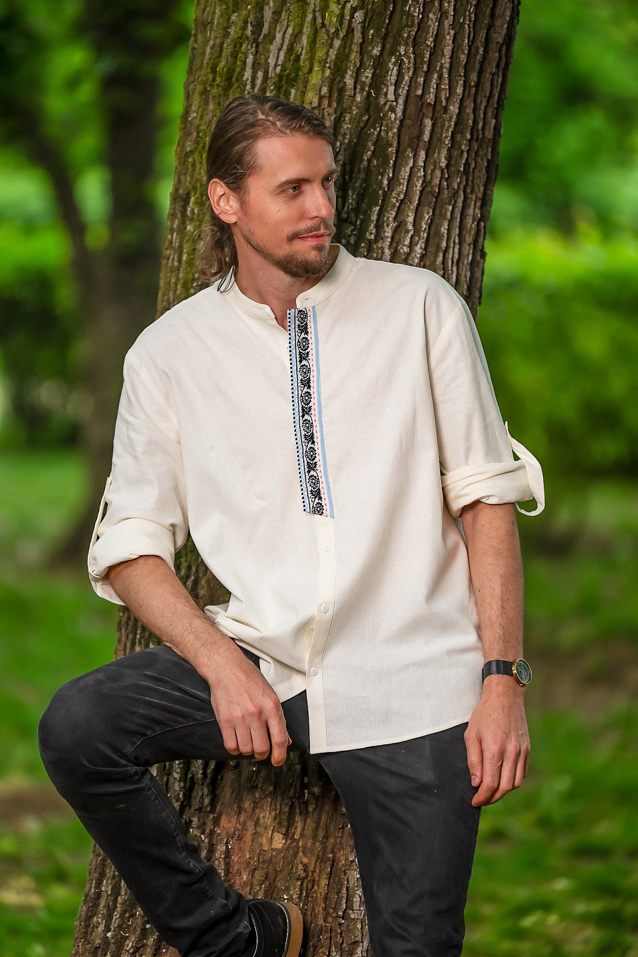 Camasa din in pentru bărbați cu motive populare are un croi modern, cu mâneca lungă, care se rulează și se prinde cu petliță.