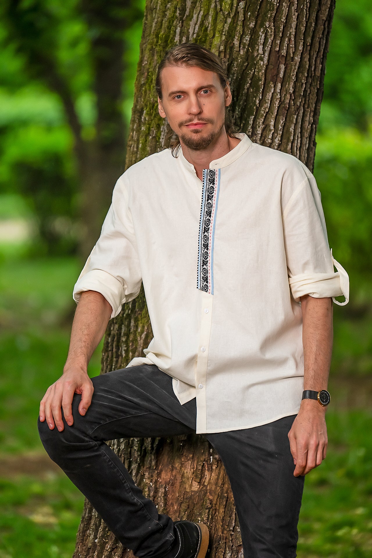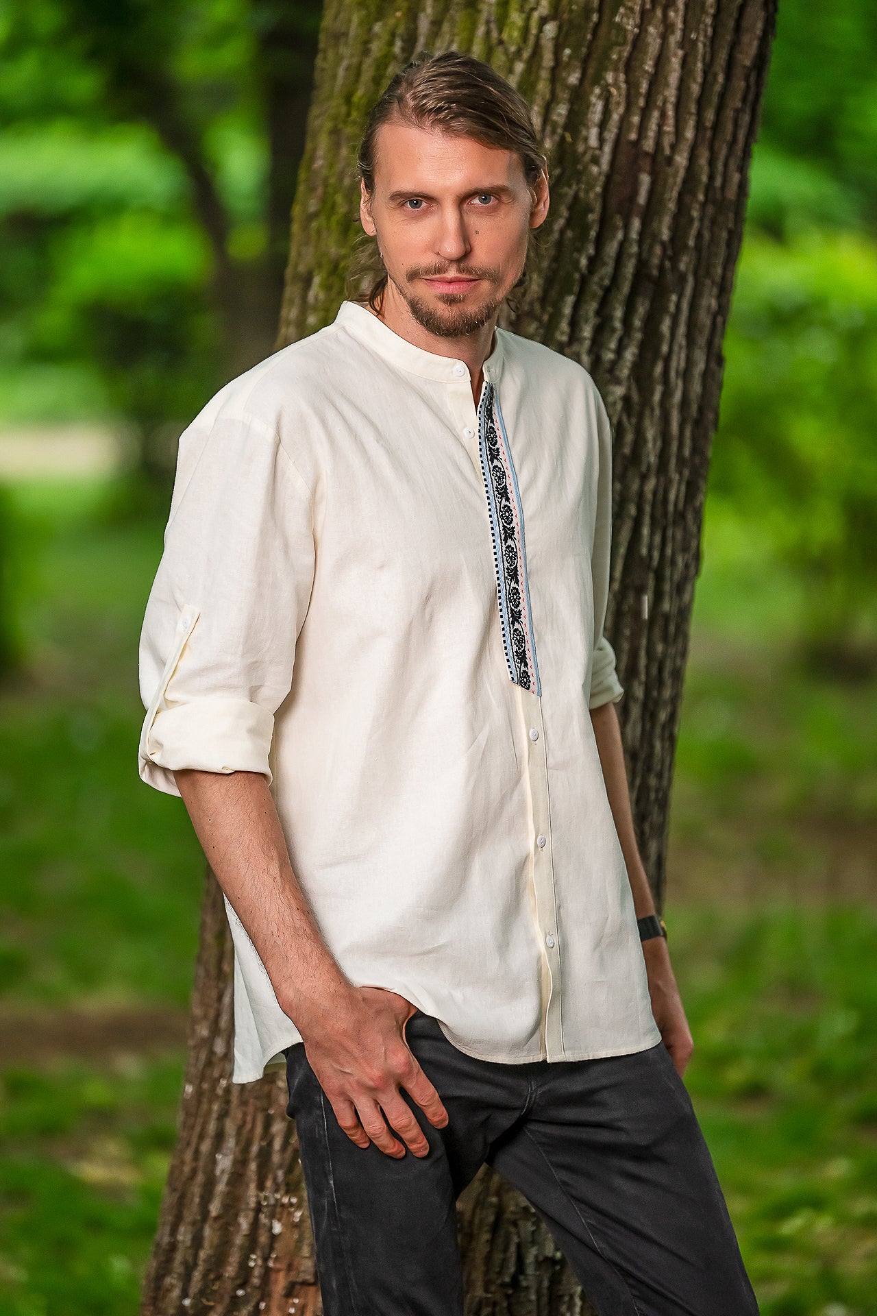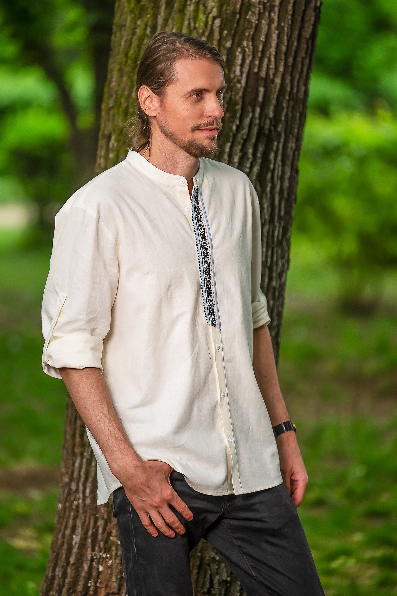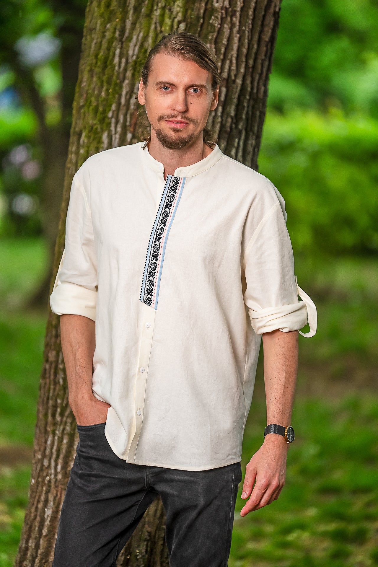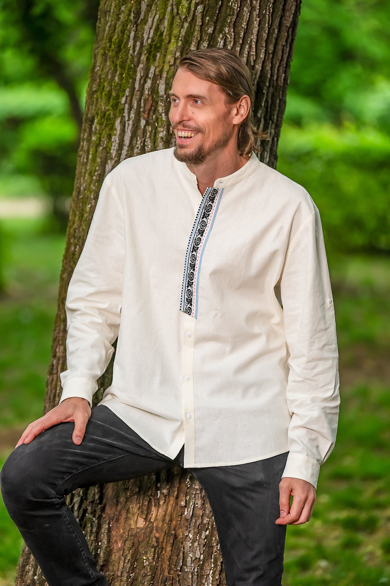 Camasa din in pentru bărbați cu motive populare are un croi modern, cu mâneca lungă, care se rulează și se prinde cu petliță.