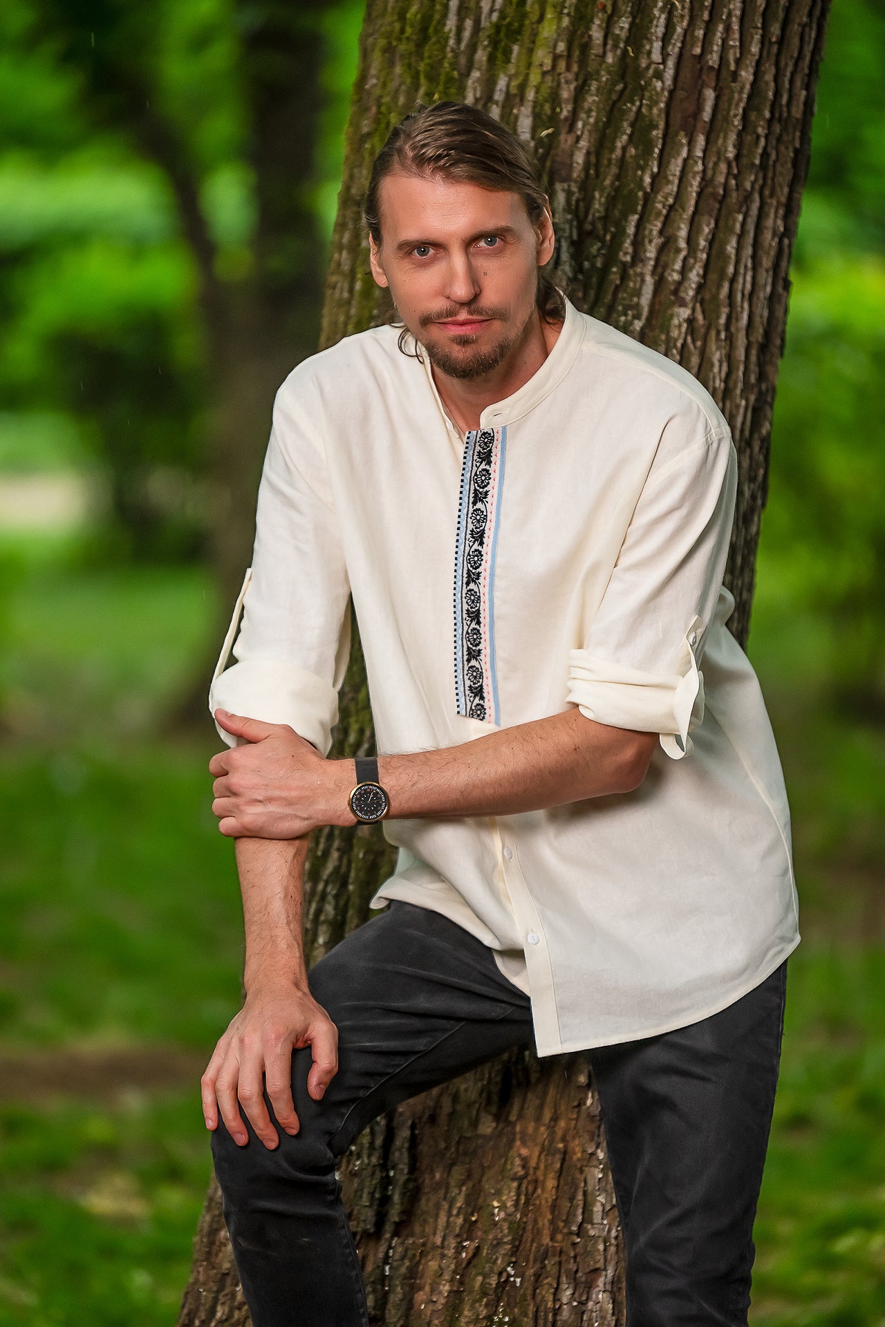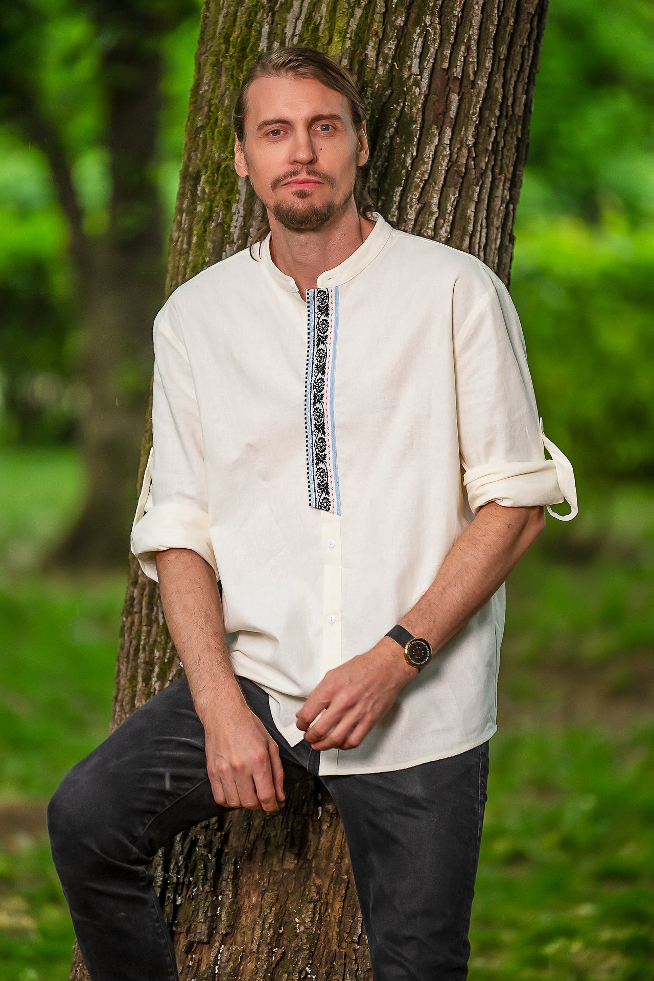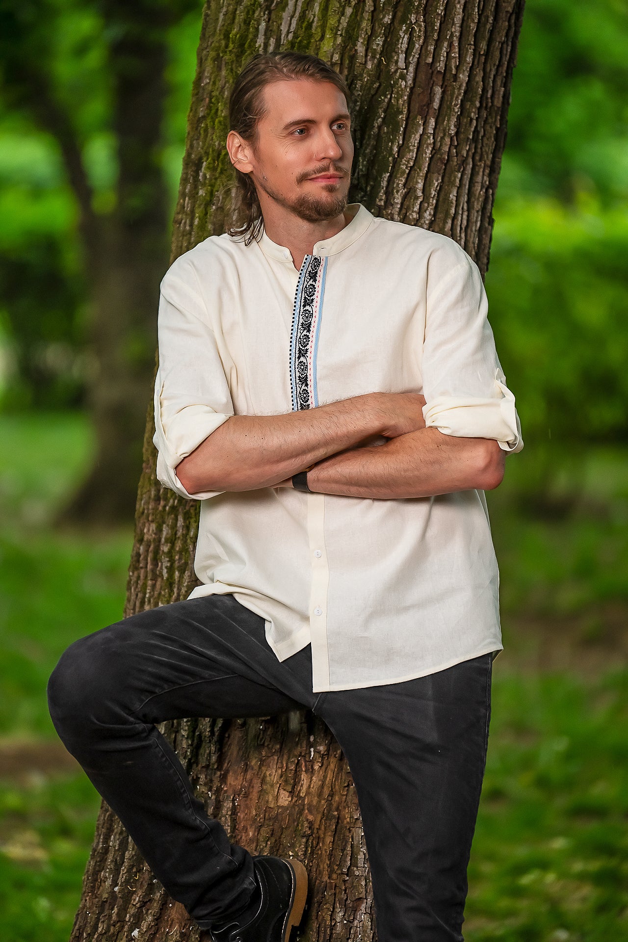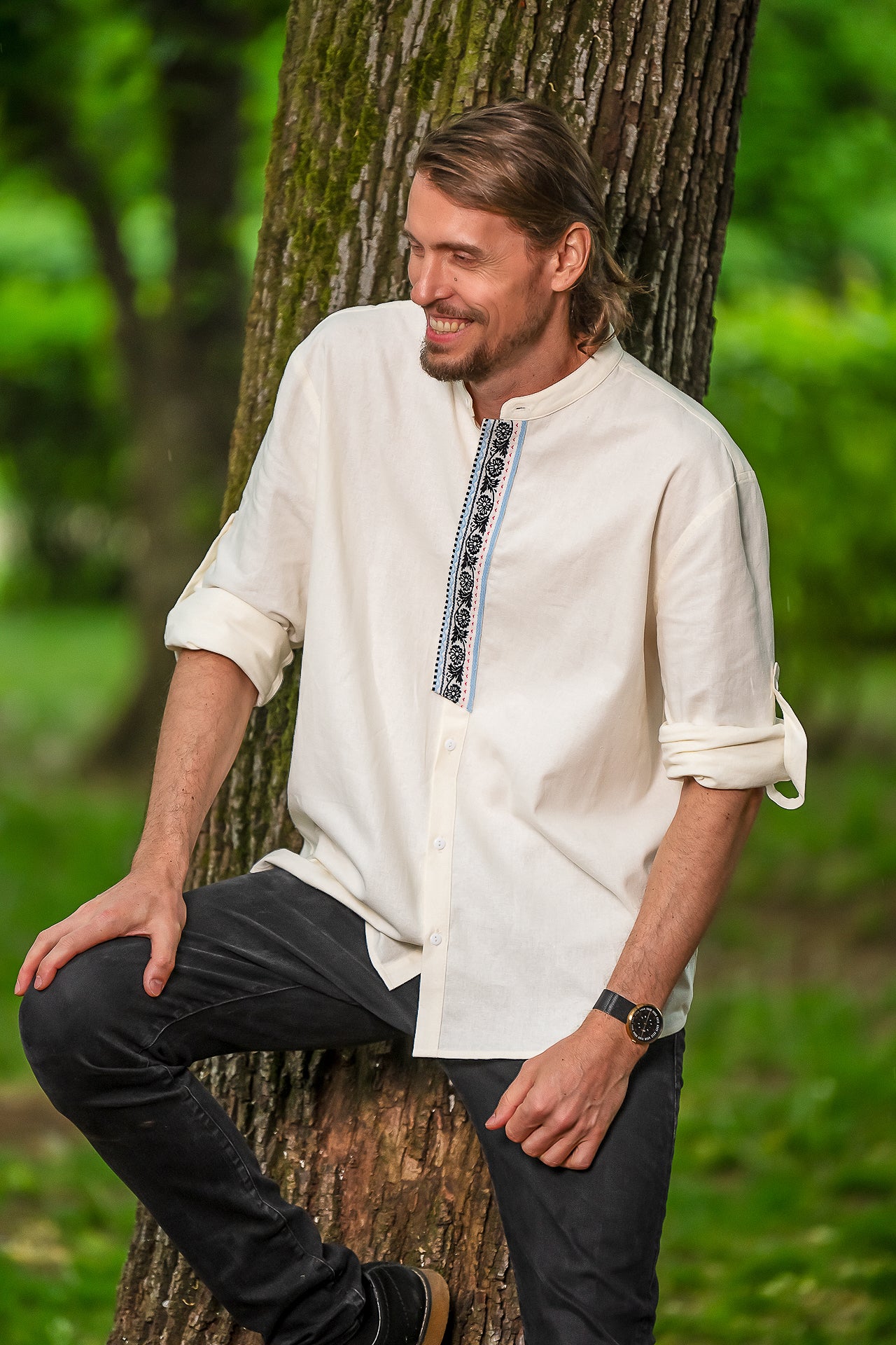 Camasa din in pentru bărbați cu motive populare are un croi modern, cu mâneca lungă, care se rulează și se prinde cu petliță.