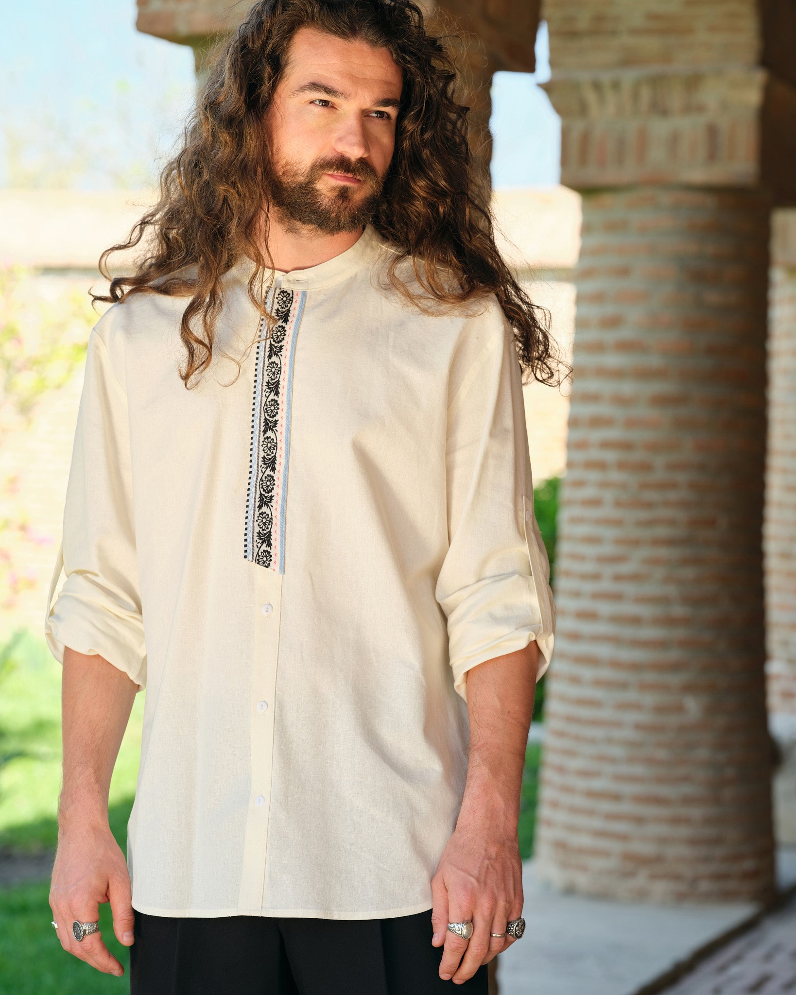 Cămașa din in este înobilată cu jacquard etnic țesut în contextură cu motive populare.