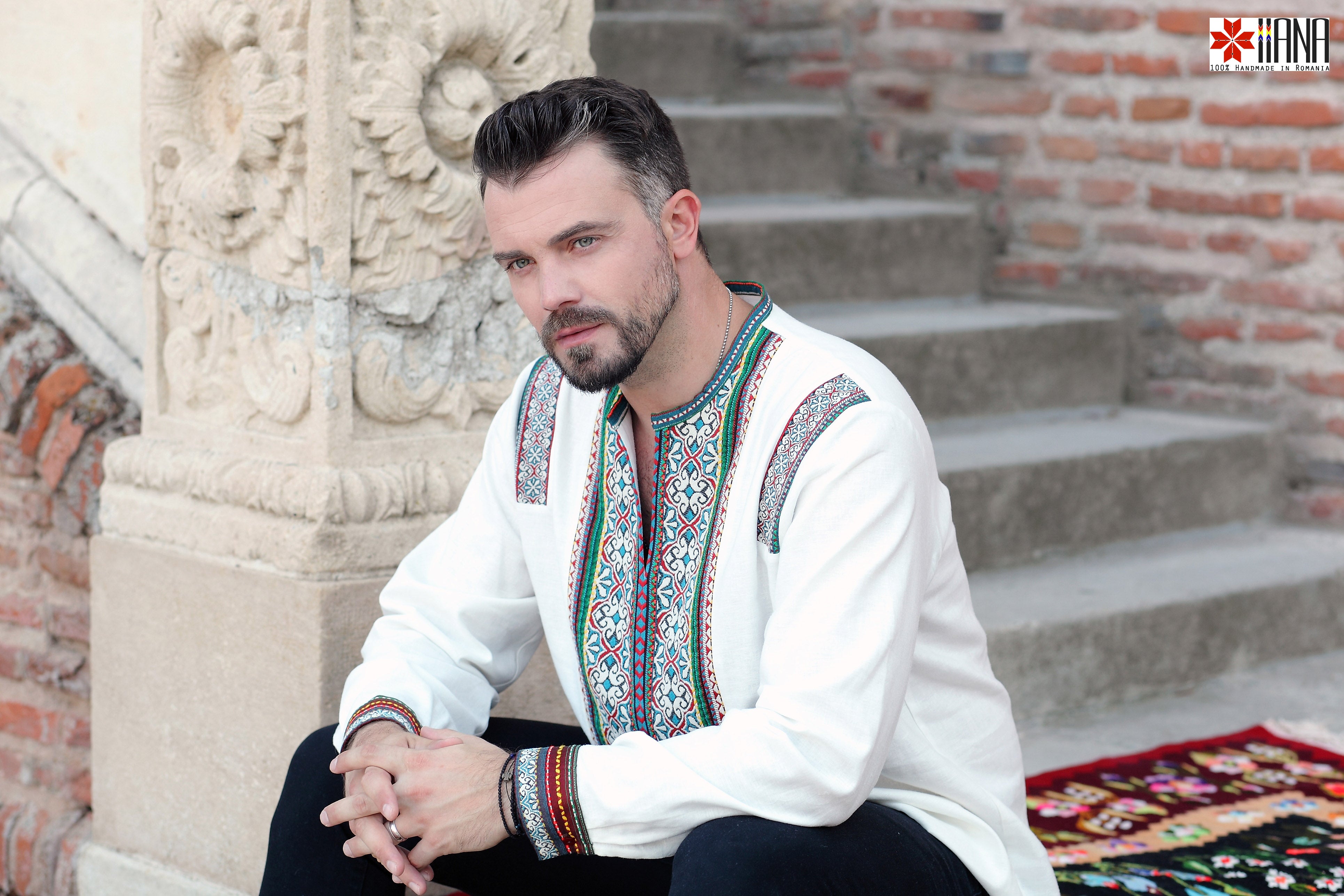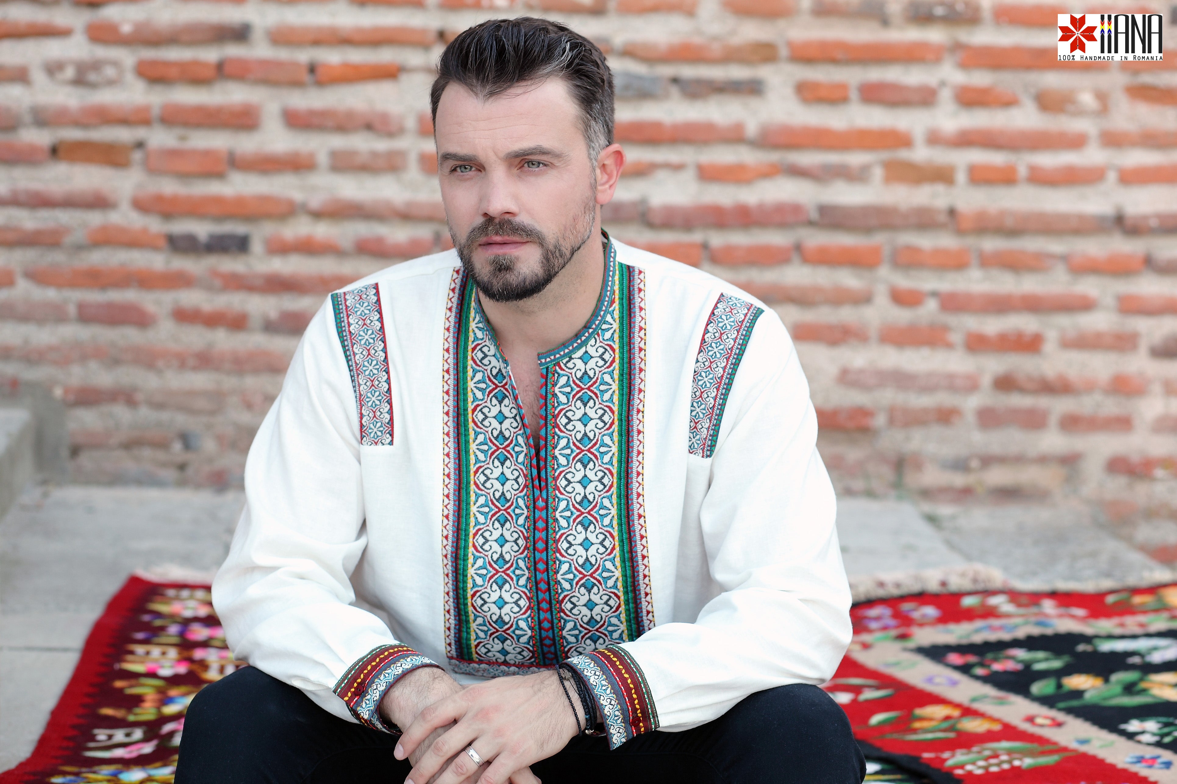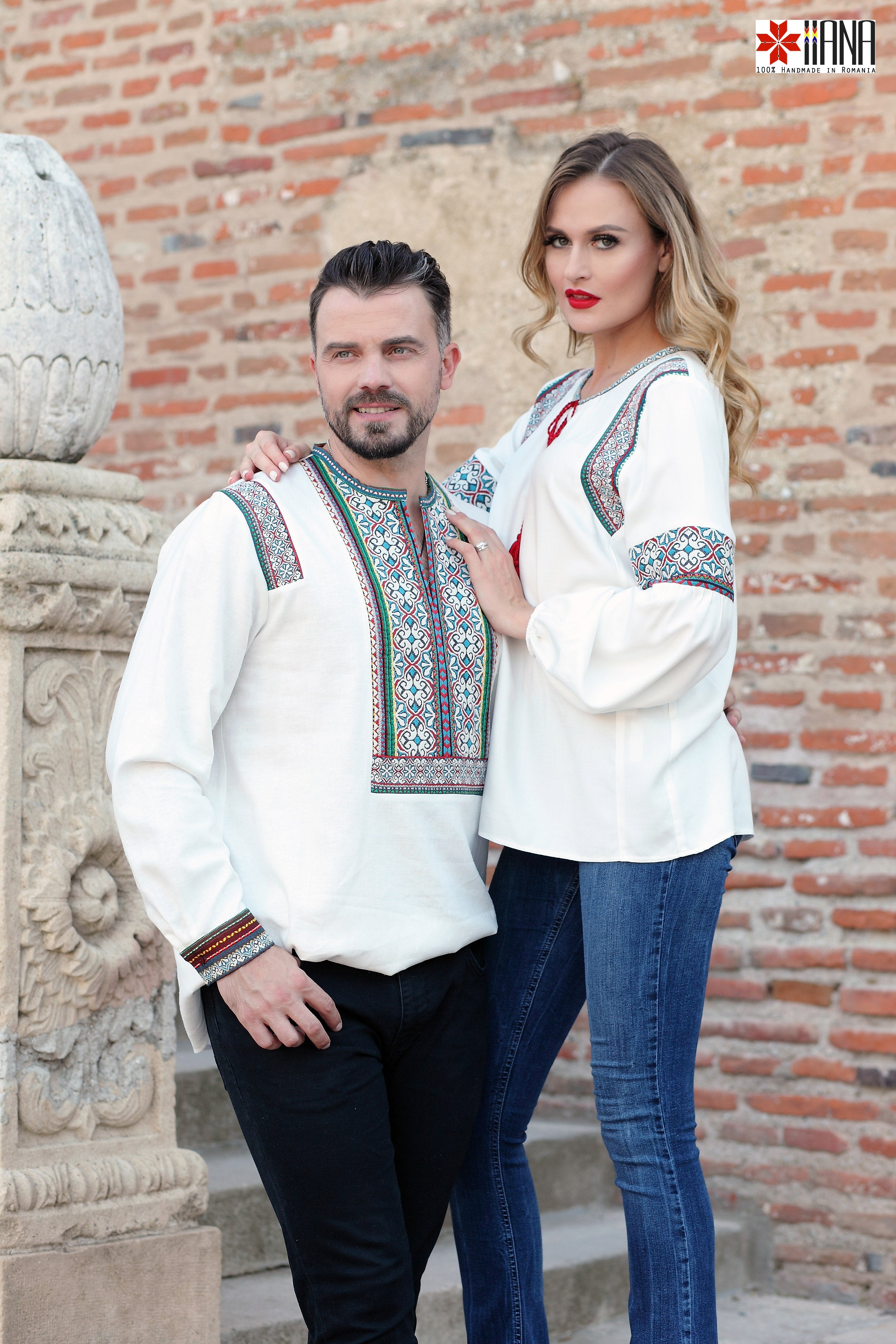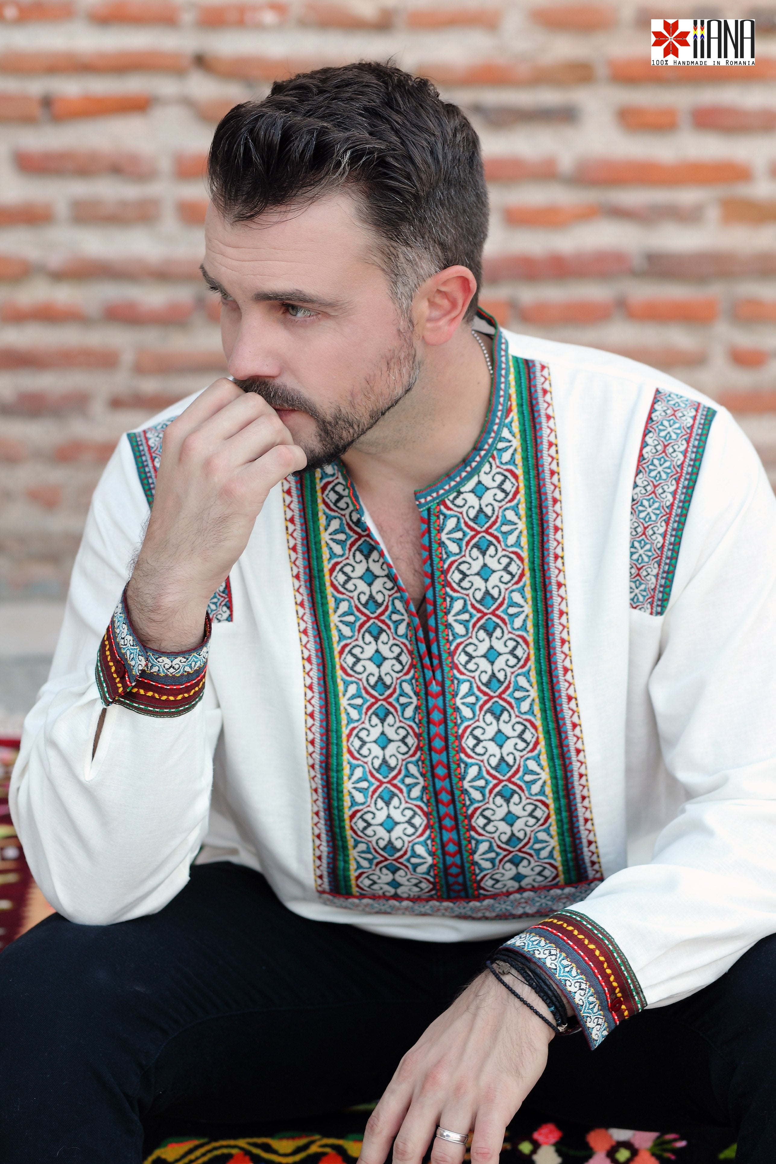 Camasa barbateasca romaneasca de horă este o piesă stilizată, inspirată din portul popular. Este confecționată din in prespălat, cu platcă, epoleți și manșete din jacquard etnic țesut. Are o croială arhaică dreaptă, cu mânecile amplu croite. Poate fi integrată cu succes într-o ținută relaxată de zi cu jeans și într-o ținută tradițională cu pantalon.