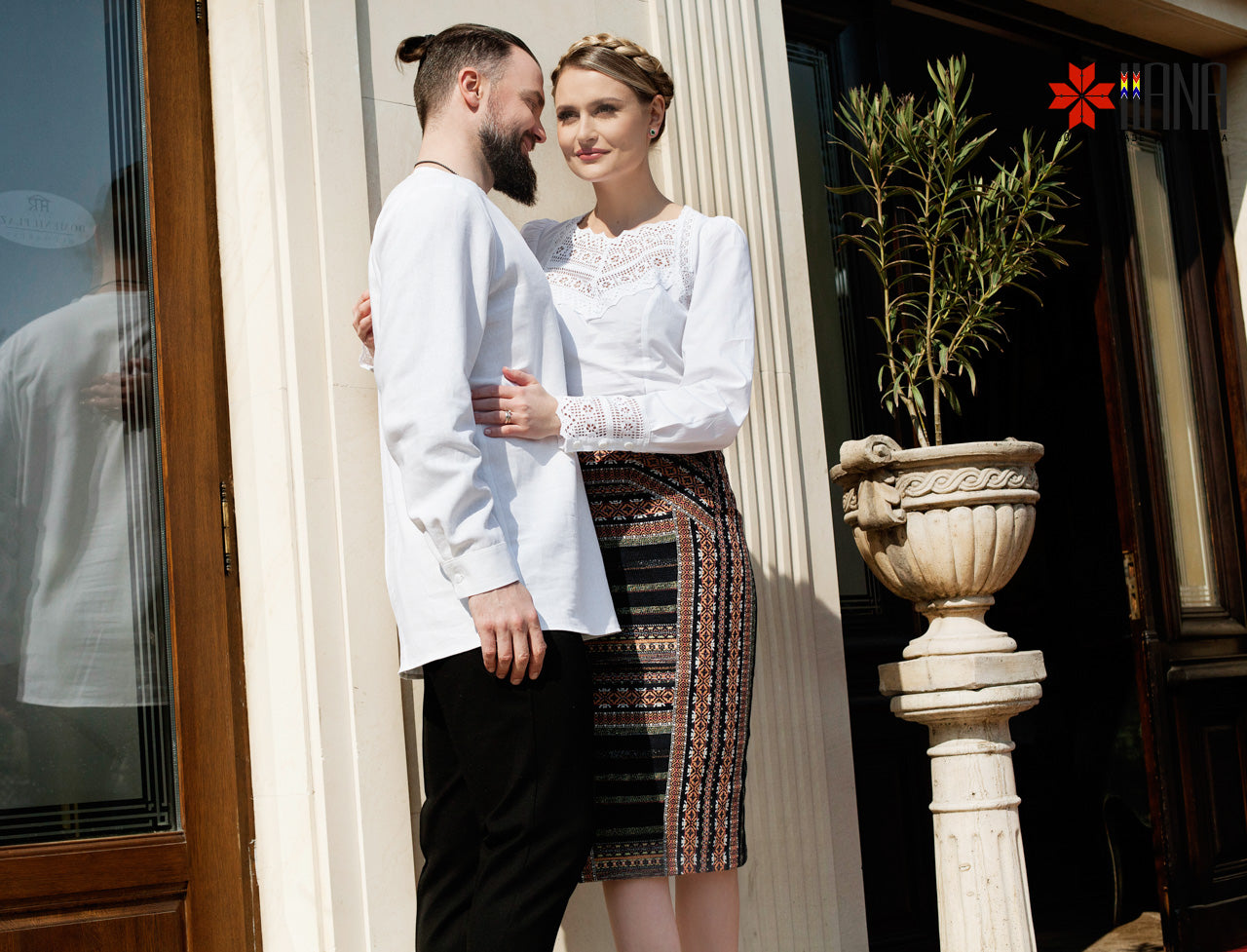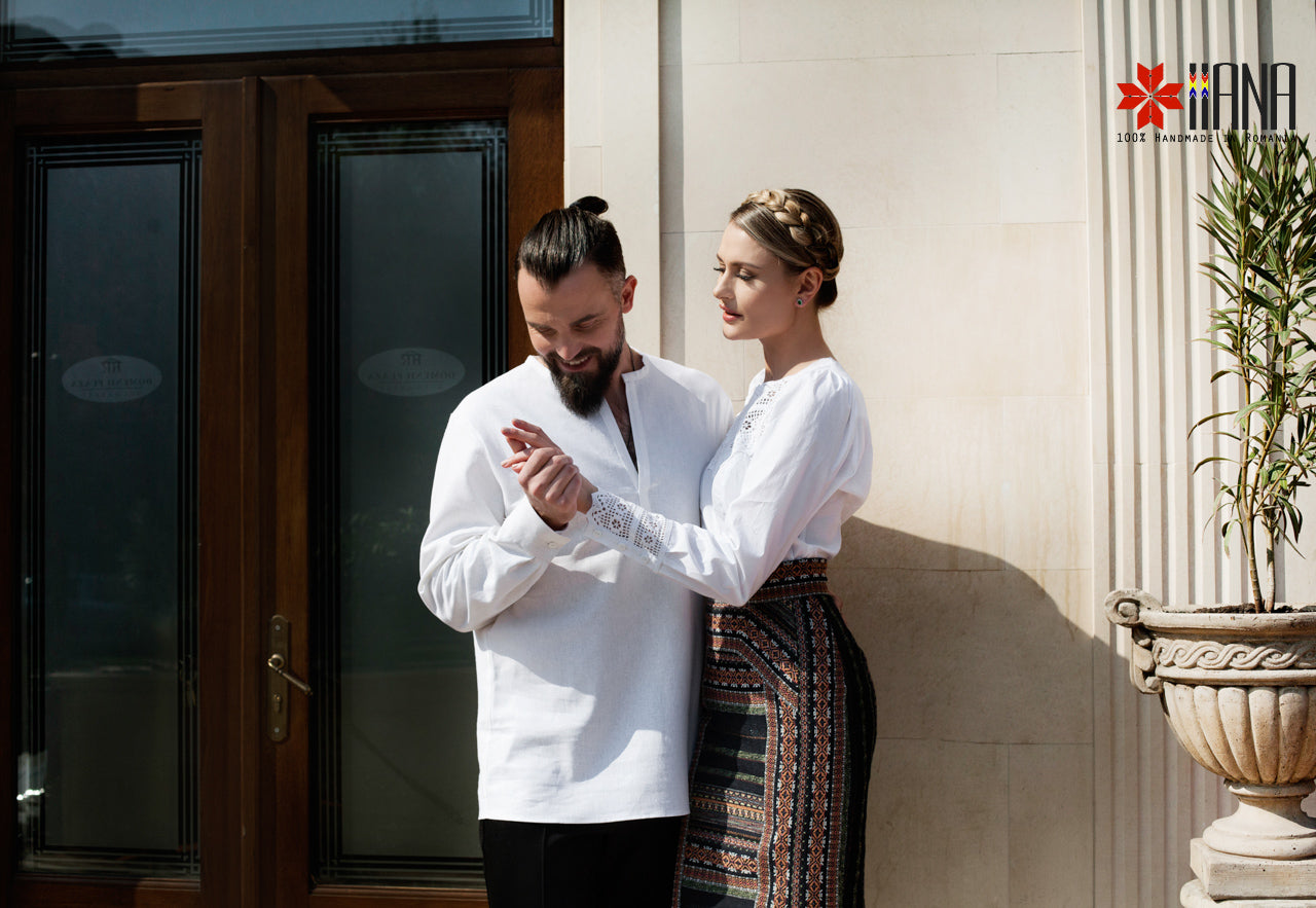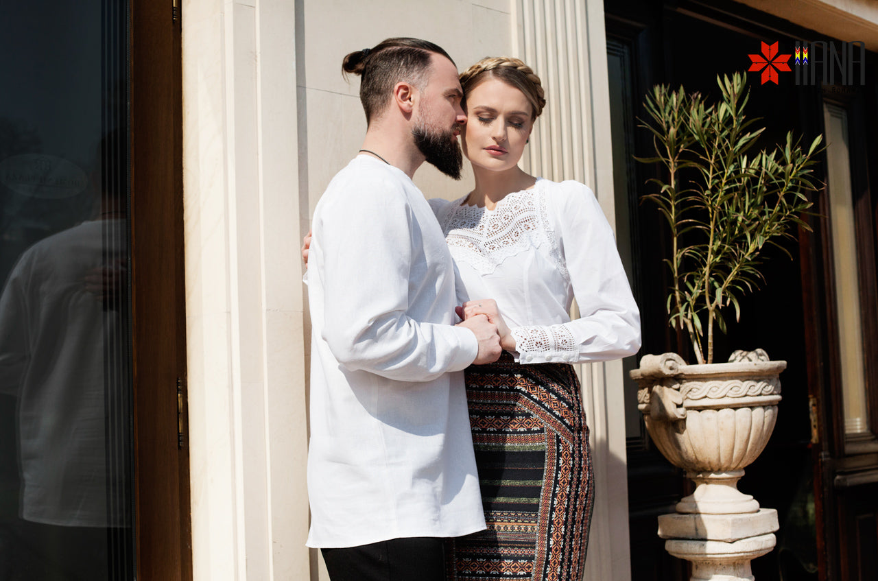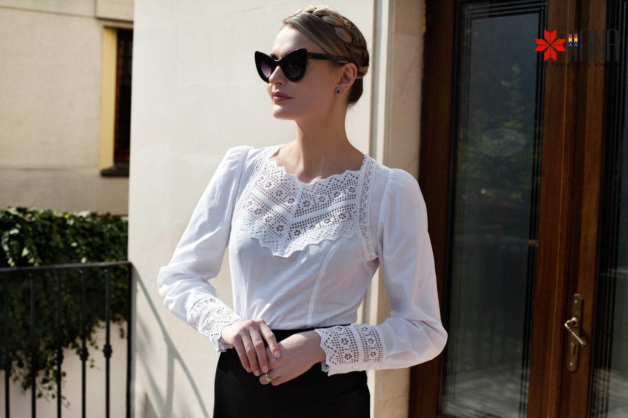 Cămașa Românească cu Dantelă Tradițională de Bumbac are o croială ușor cambrată, cu plătcuță și manșete