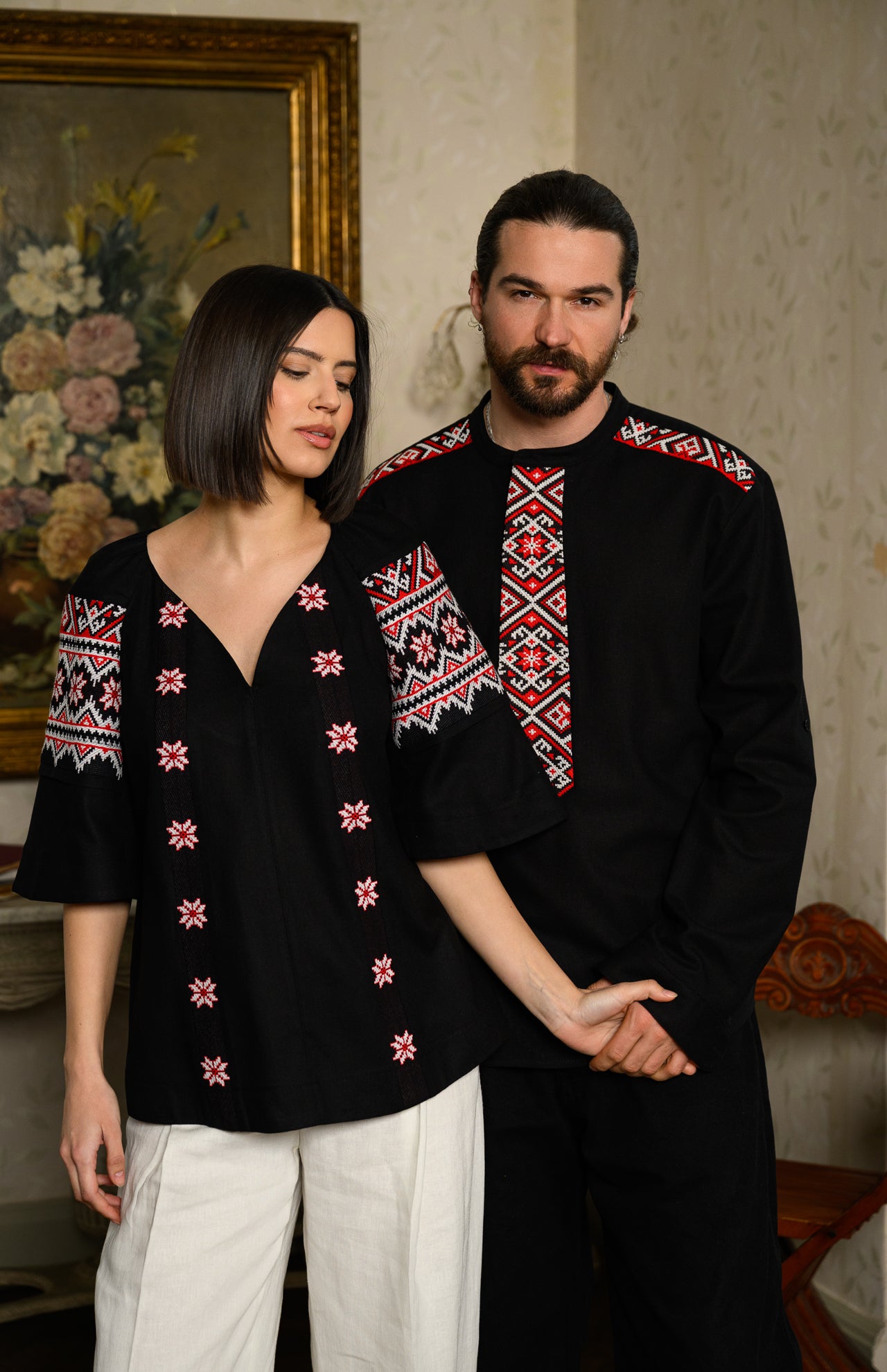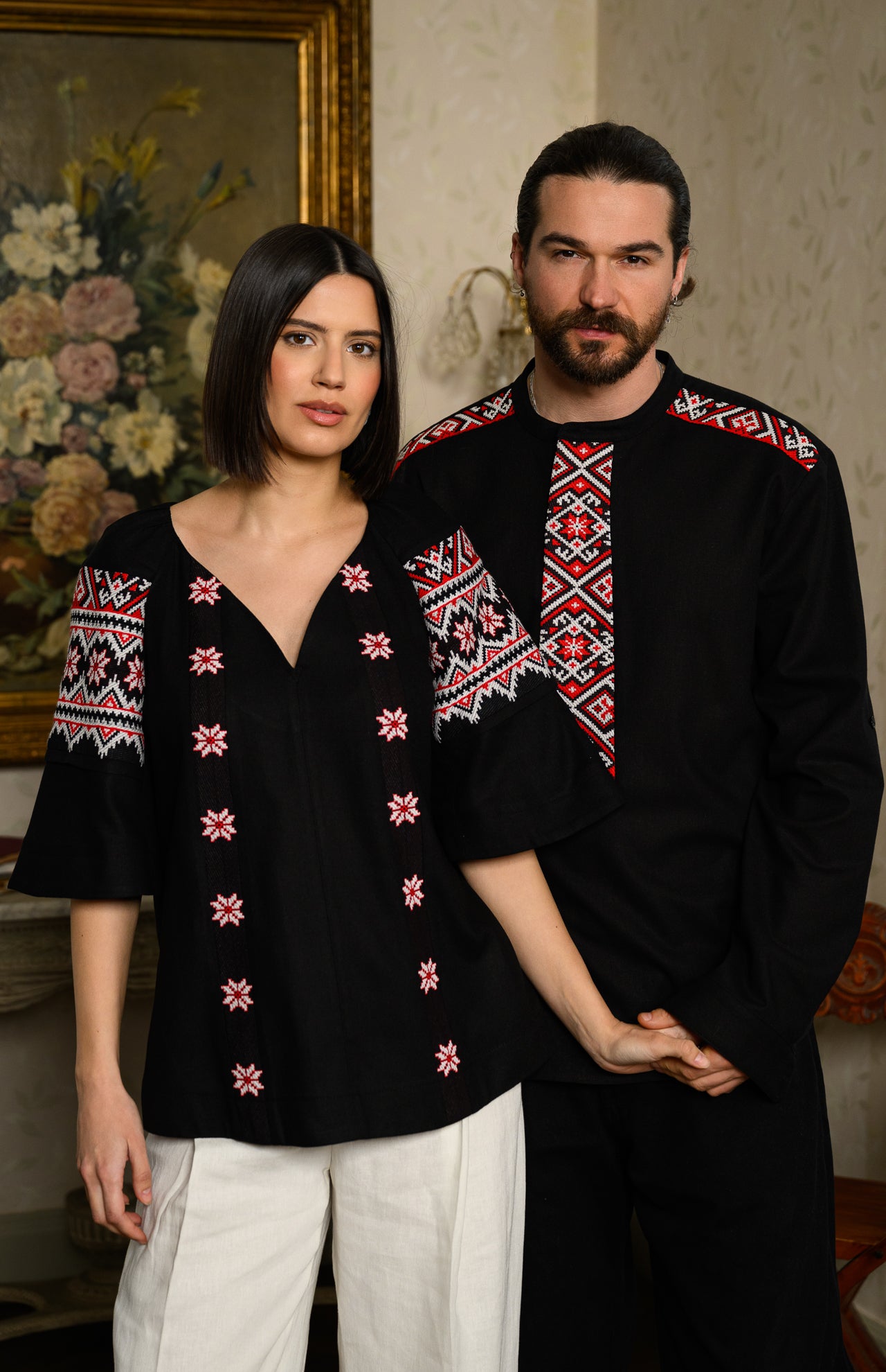 Cămașa stilizată  cu  cravata și epoleți cu motive tradiționale este confecționată din in negru  și jacquard țesut în contextură cu motive tradiționale.