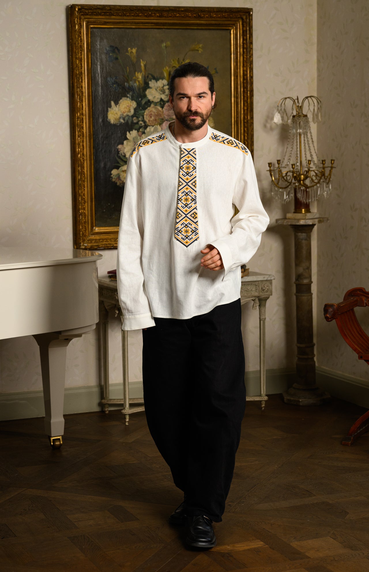 Cămașa stilizată cu cravata și epoleți cu motive tradiționale este confecționată din in alb și jacquard țesut în contextură cu motive tradiționale.
