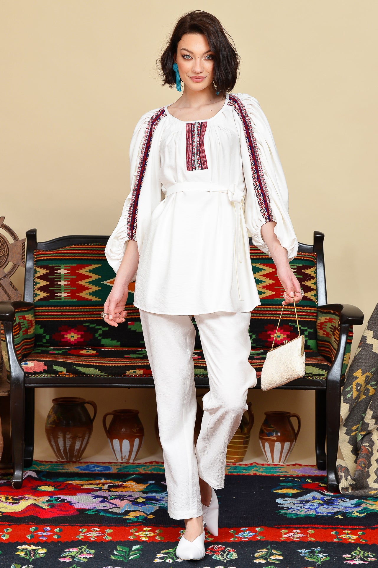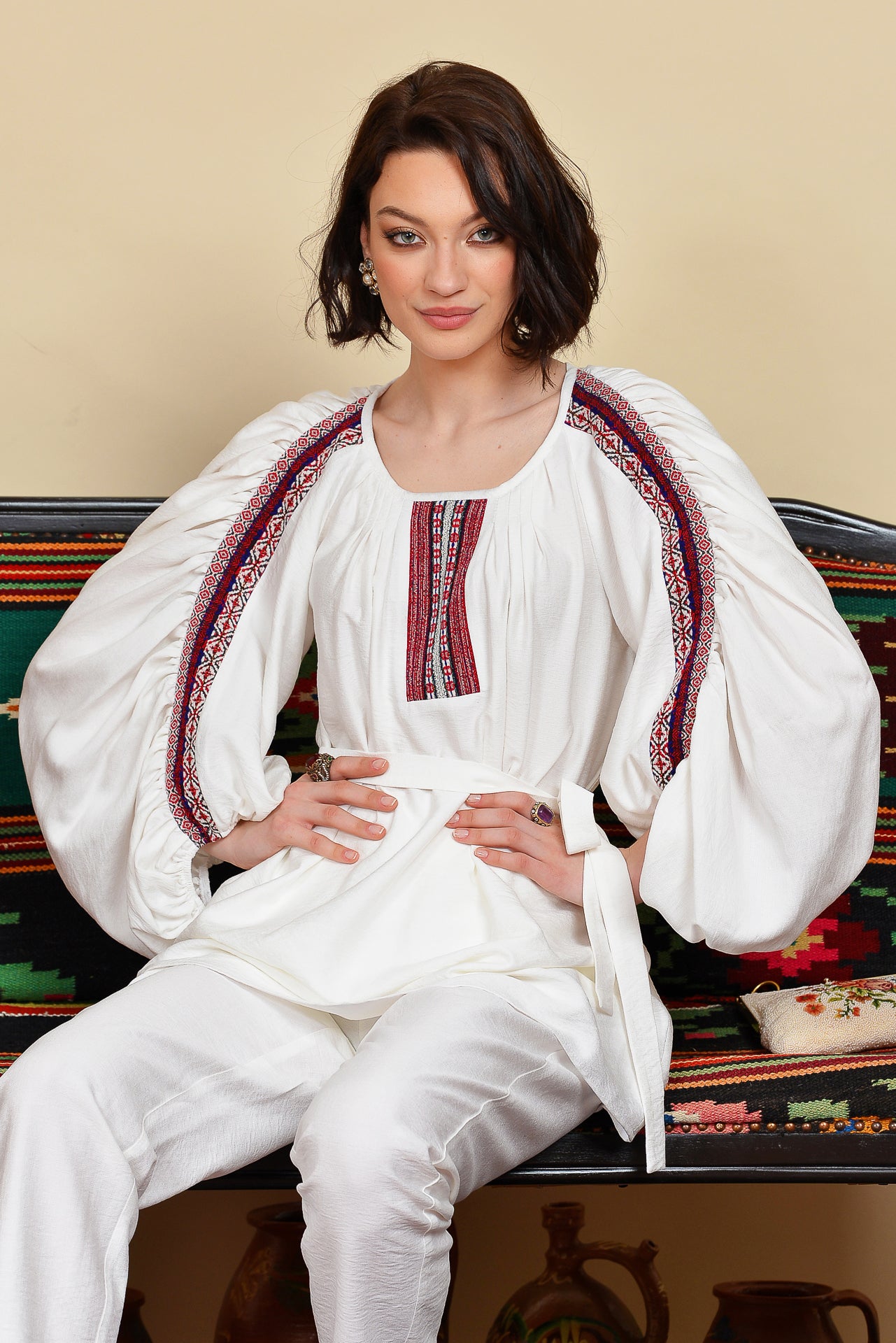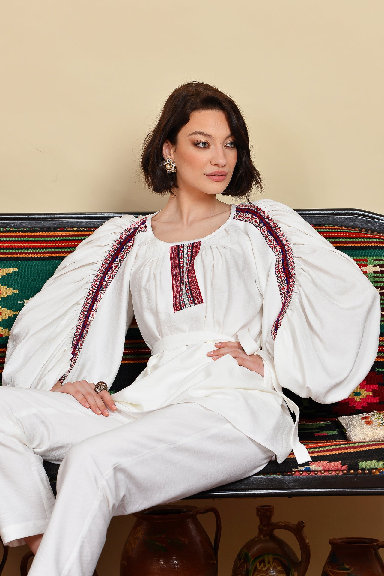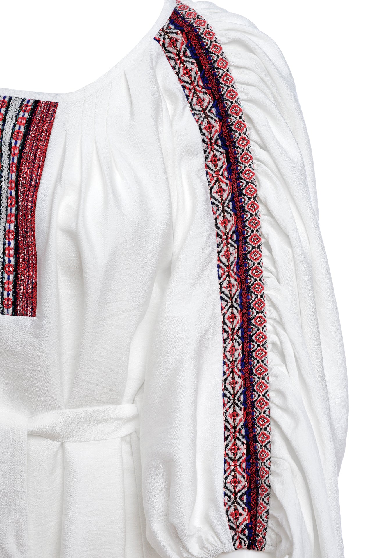 Ia stilizată alba cu fronseuri are un croi spectaculos, marcat de jacquardul țesut cu motive tradiționale arhaice.