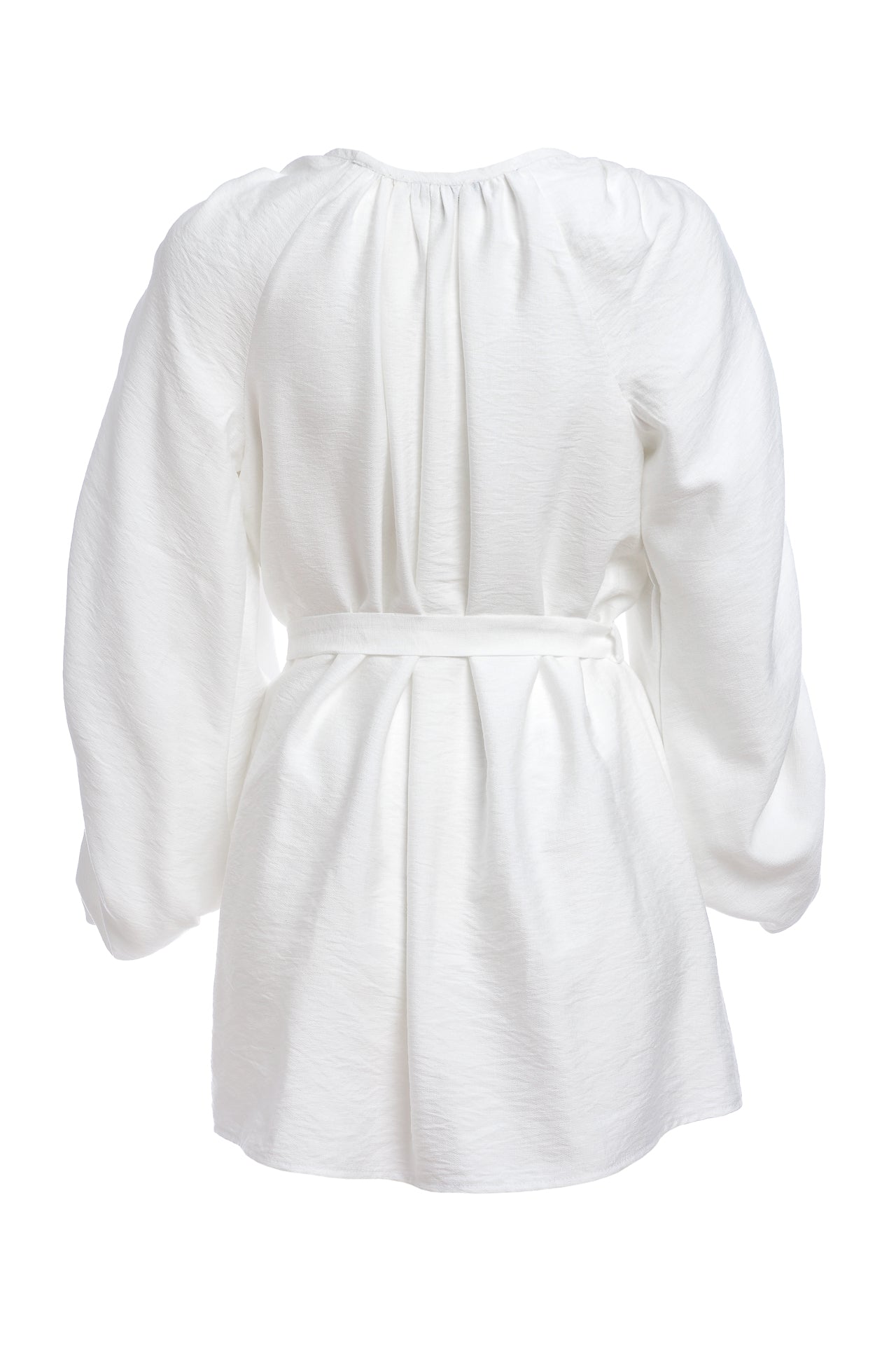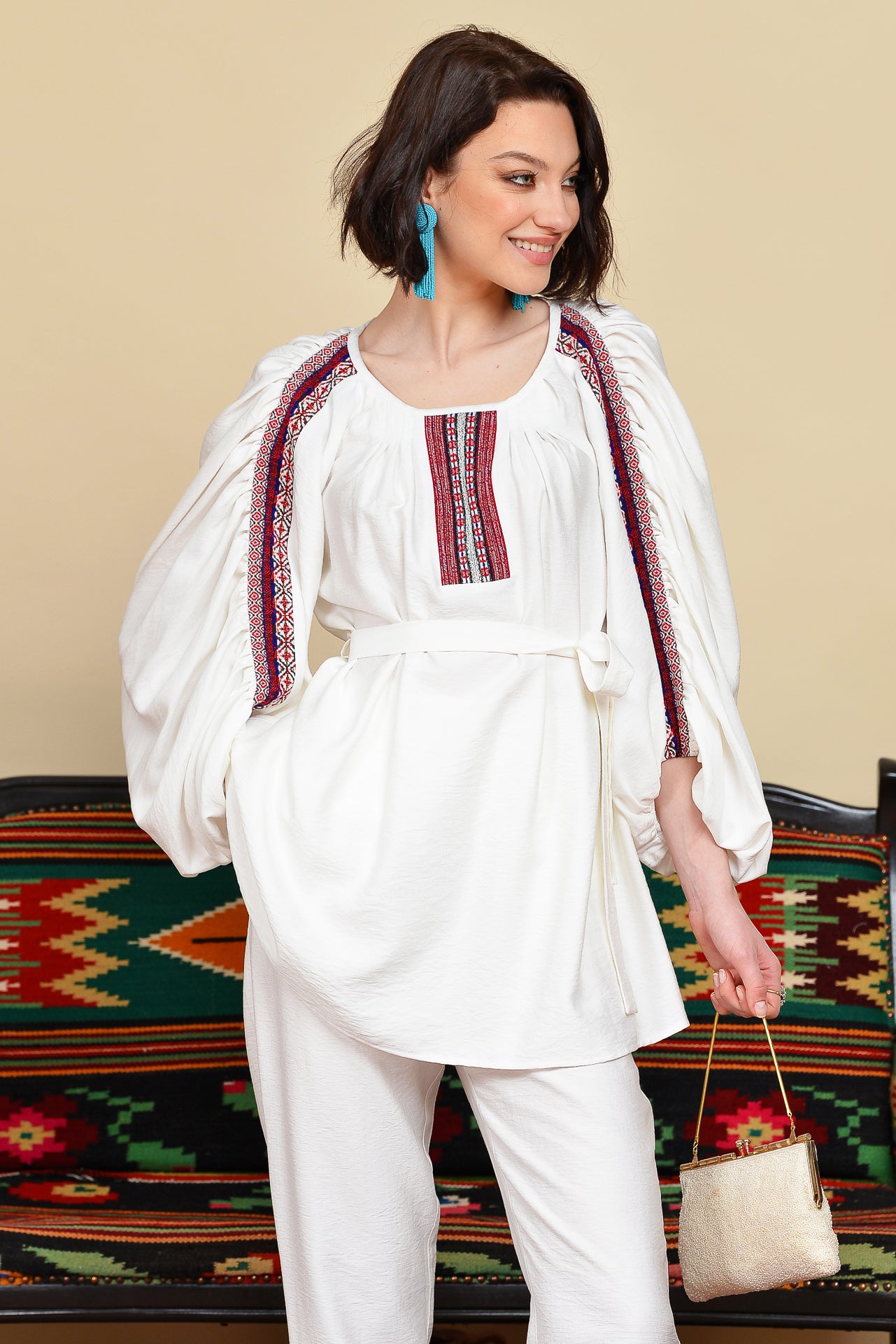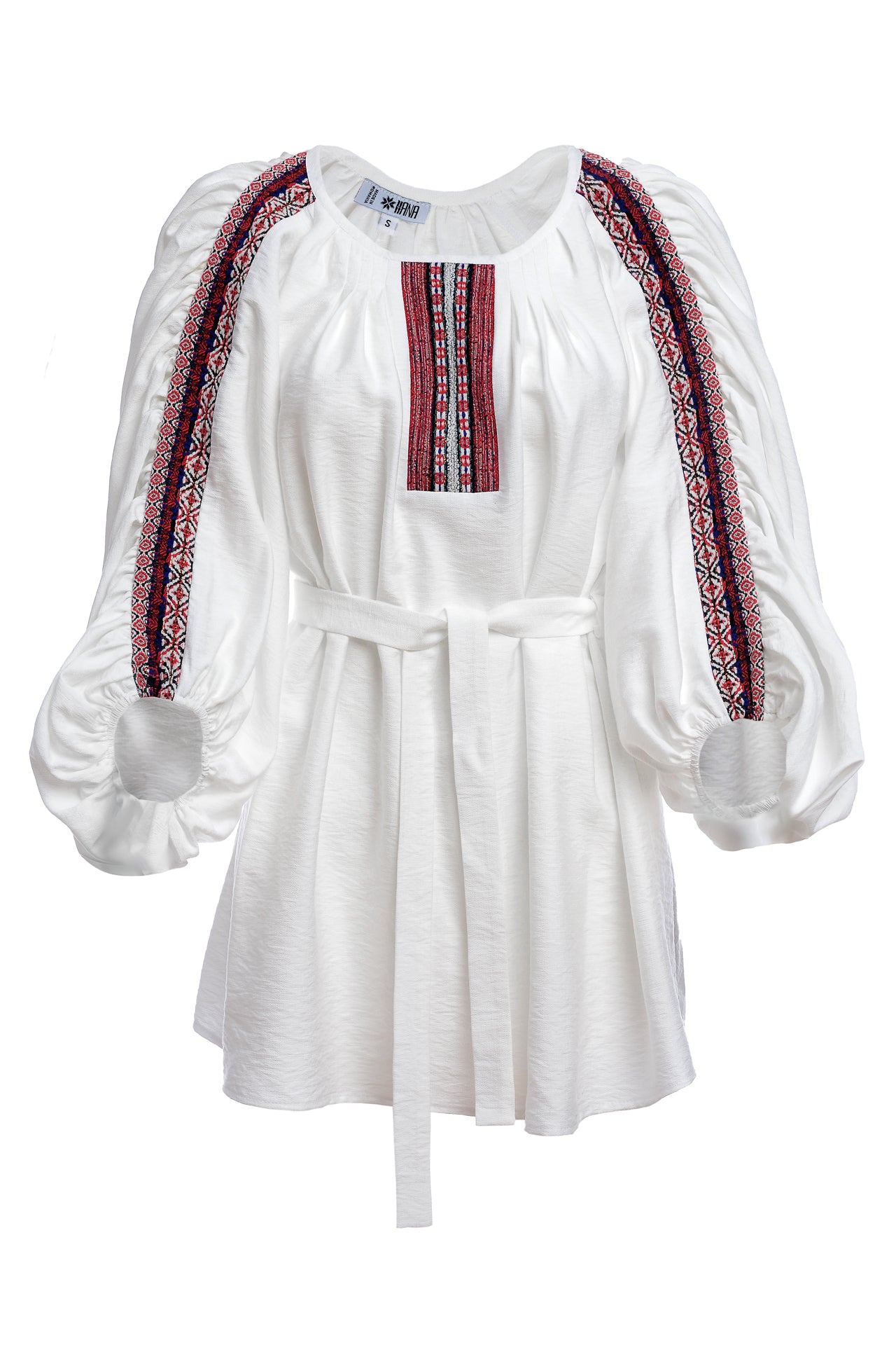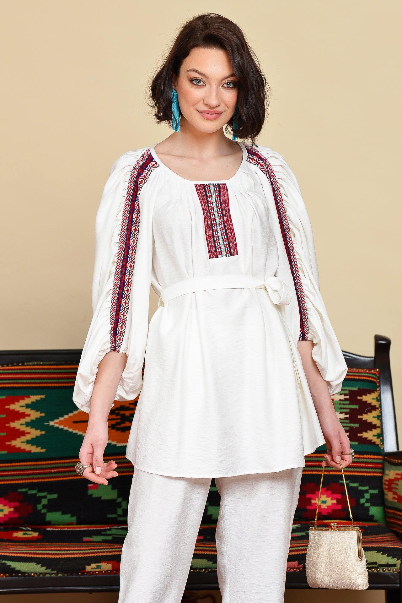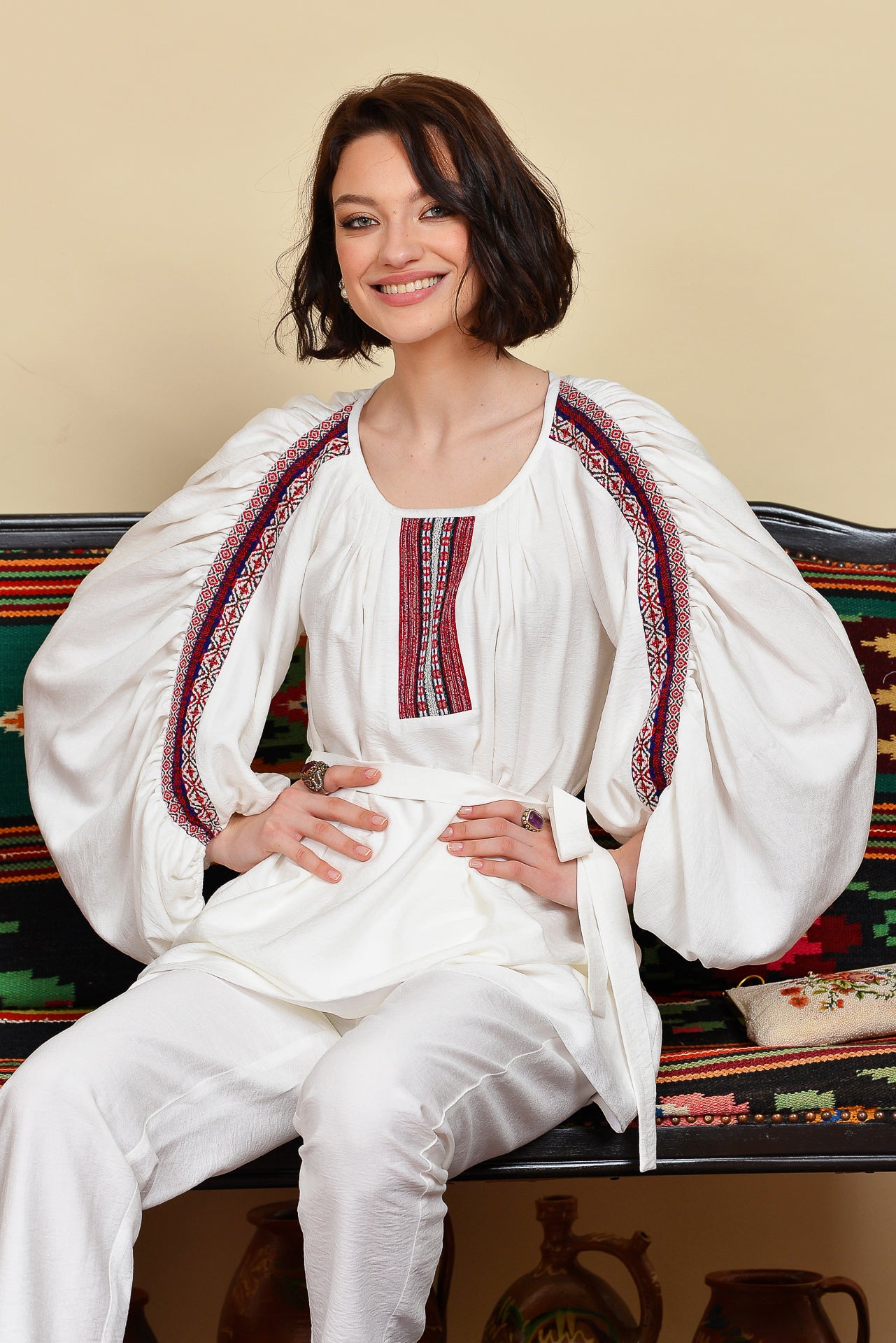 Ia stilizată alba cu fronseuri are un croi spectaculos, marcat de jacquardul țesut cu motive tradiționale arhaice.