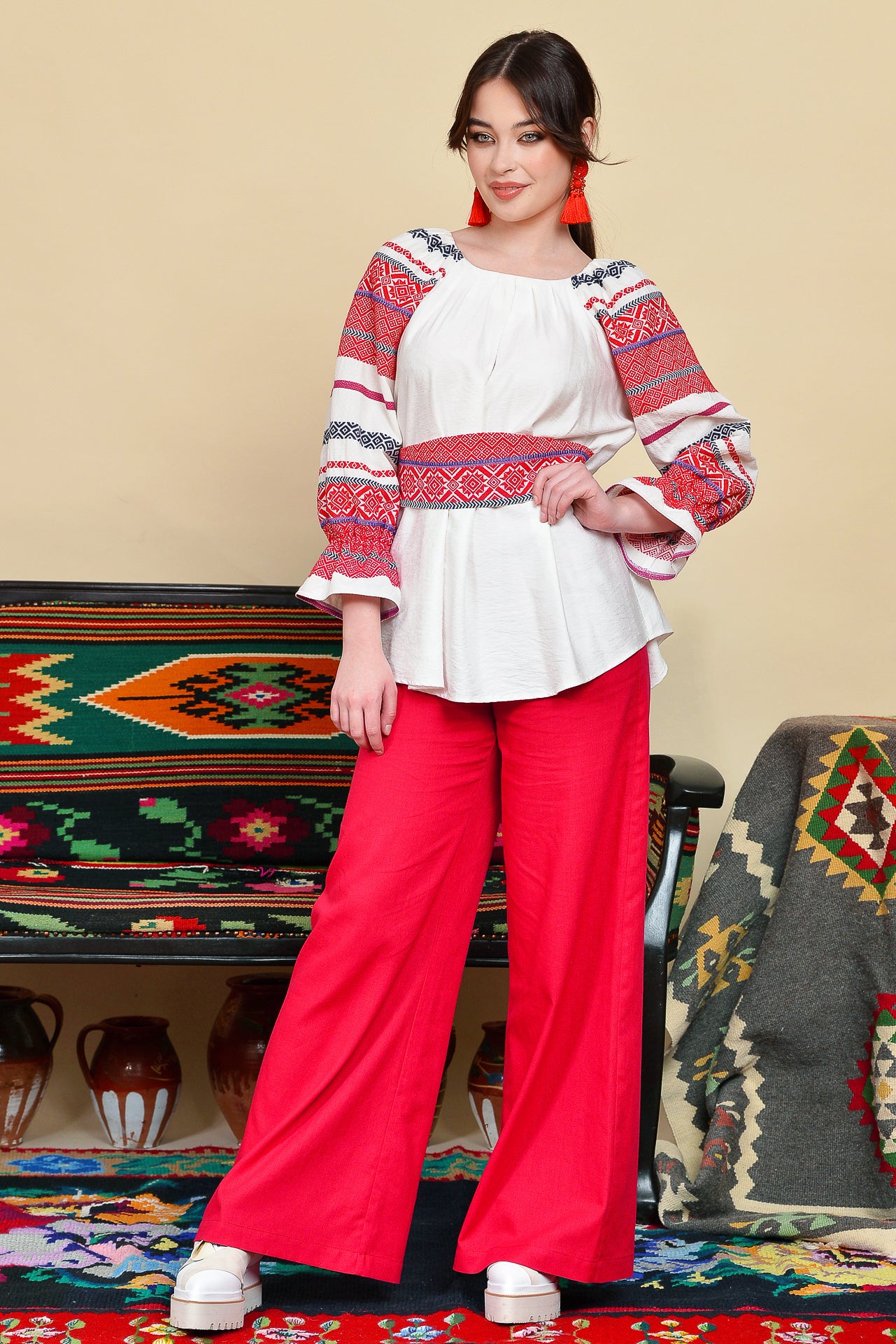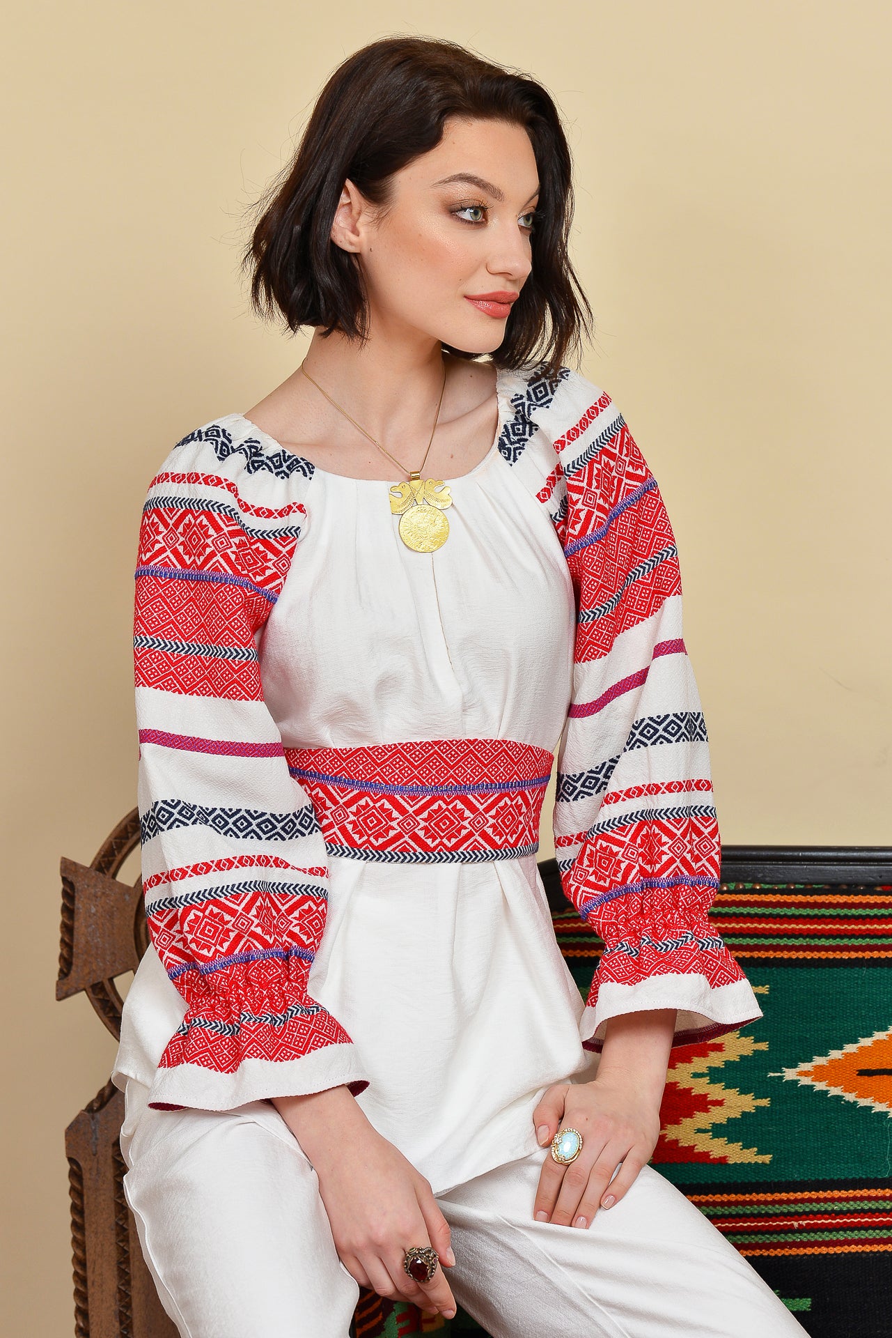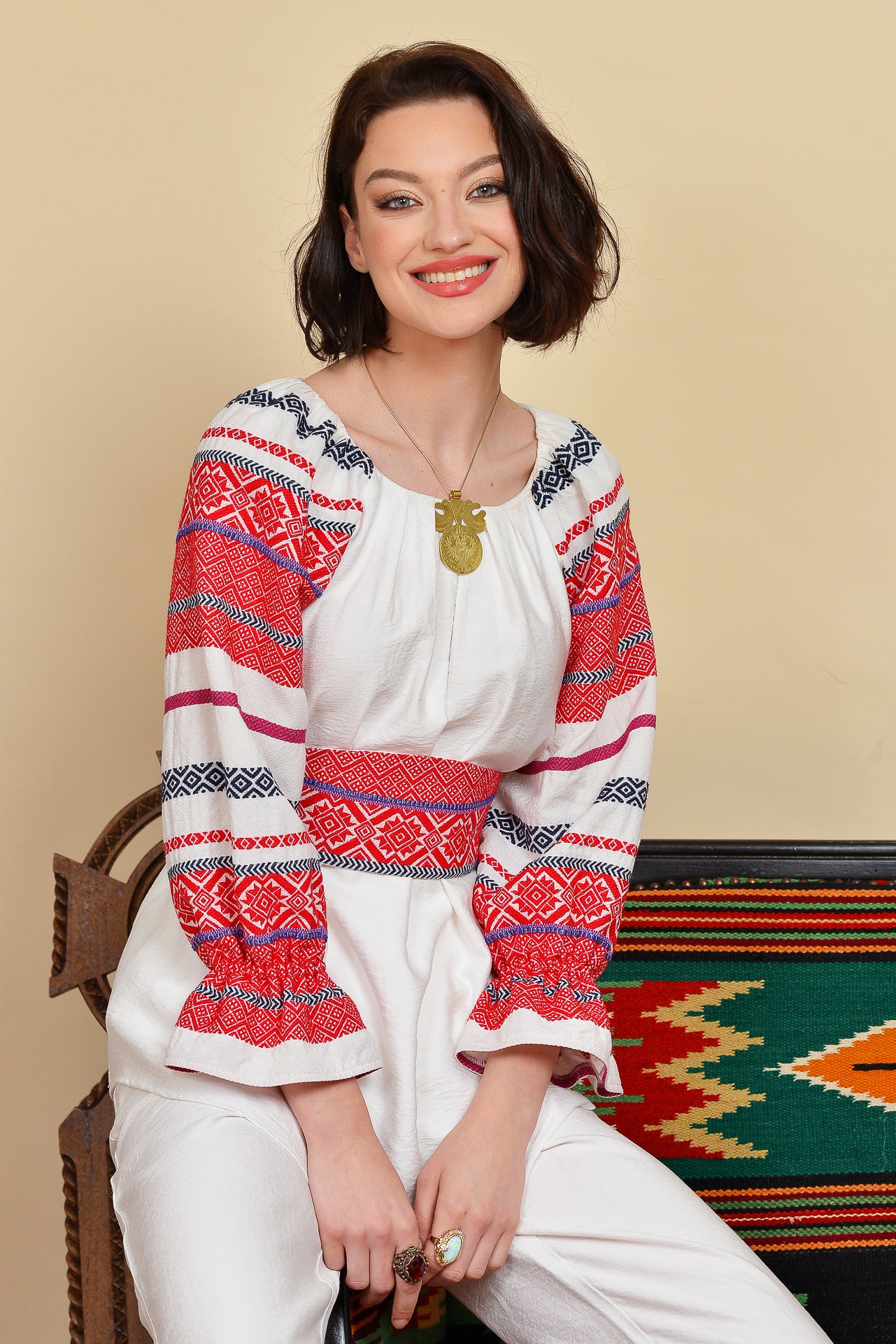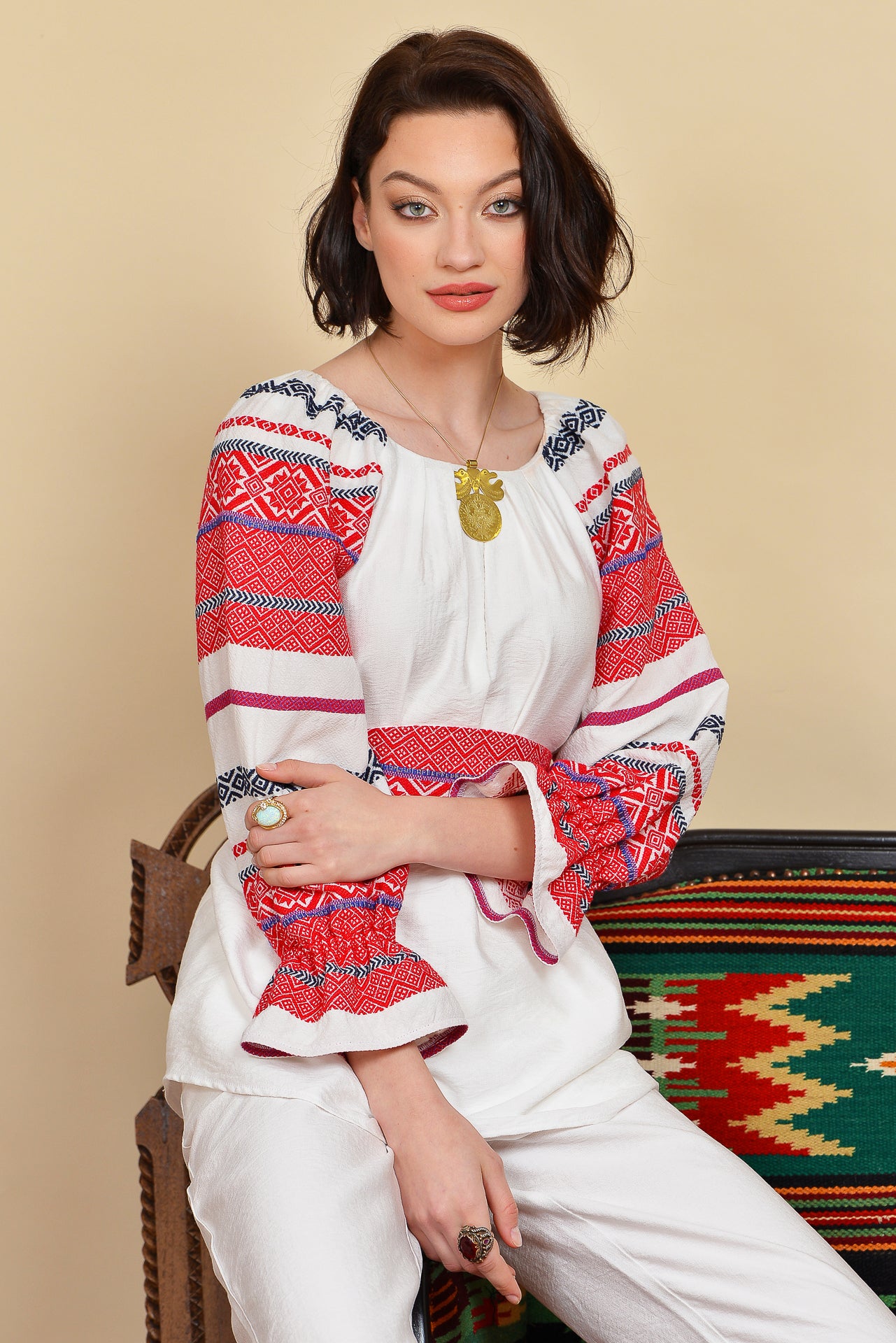 Ia stilizată Boierească este confecționată din viscoză cu in, ușor satinată și jacquard etnic,