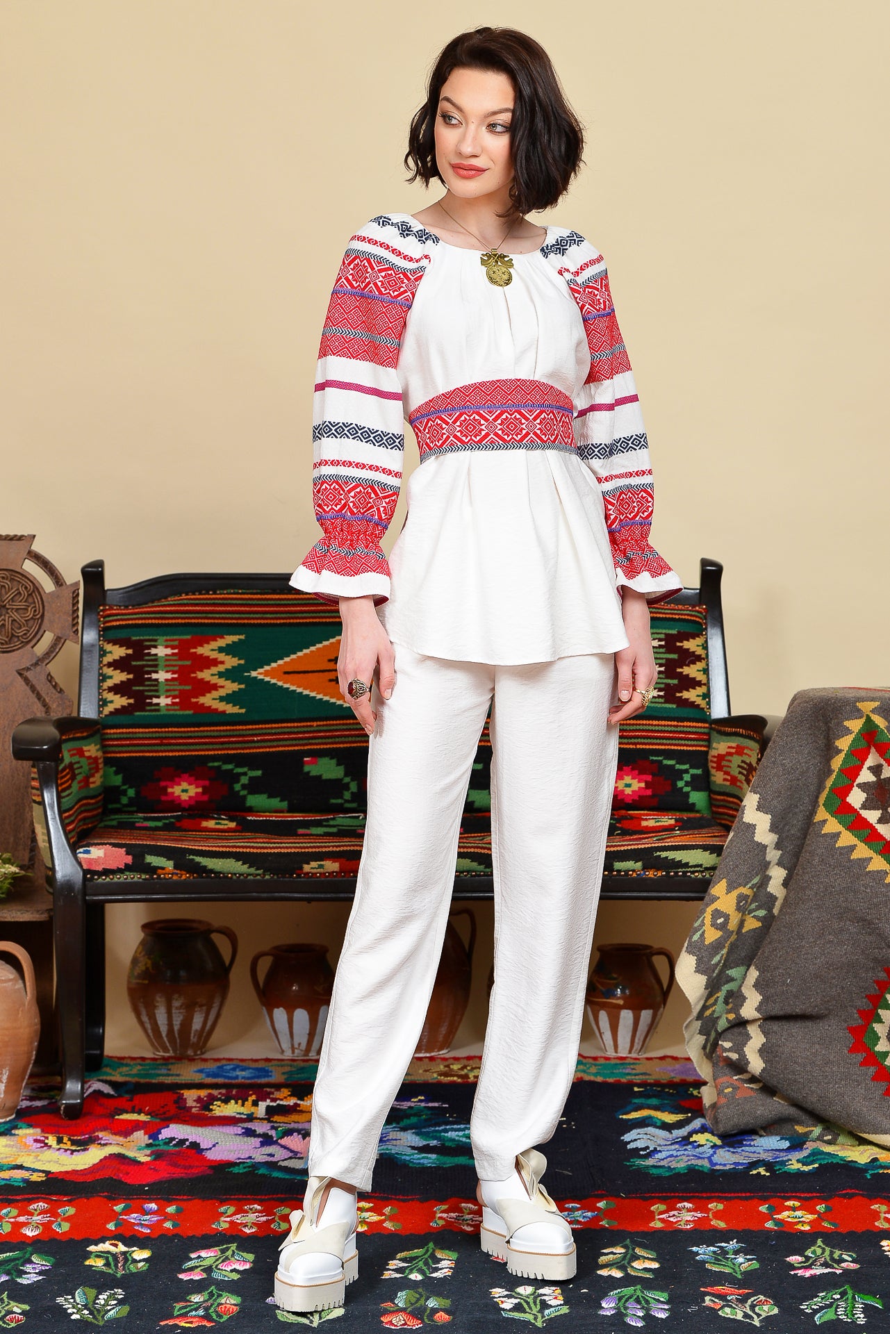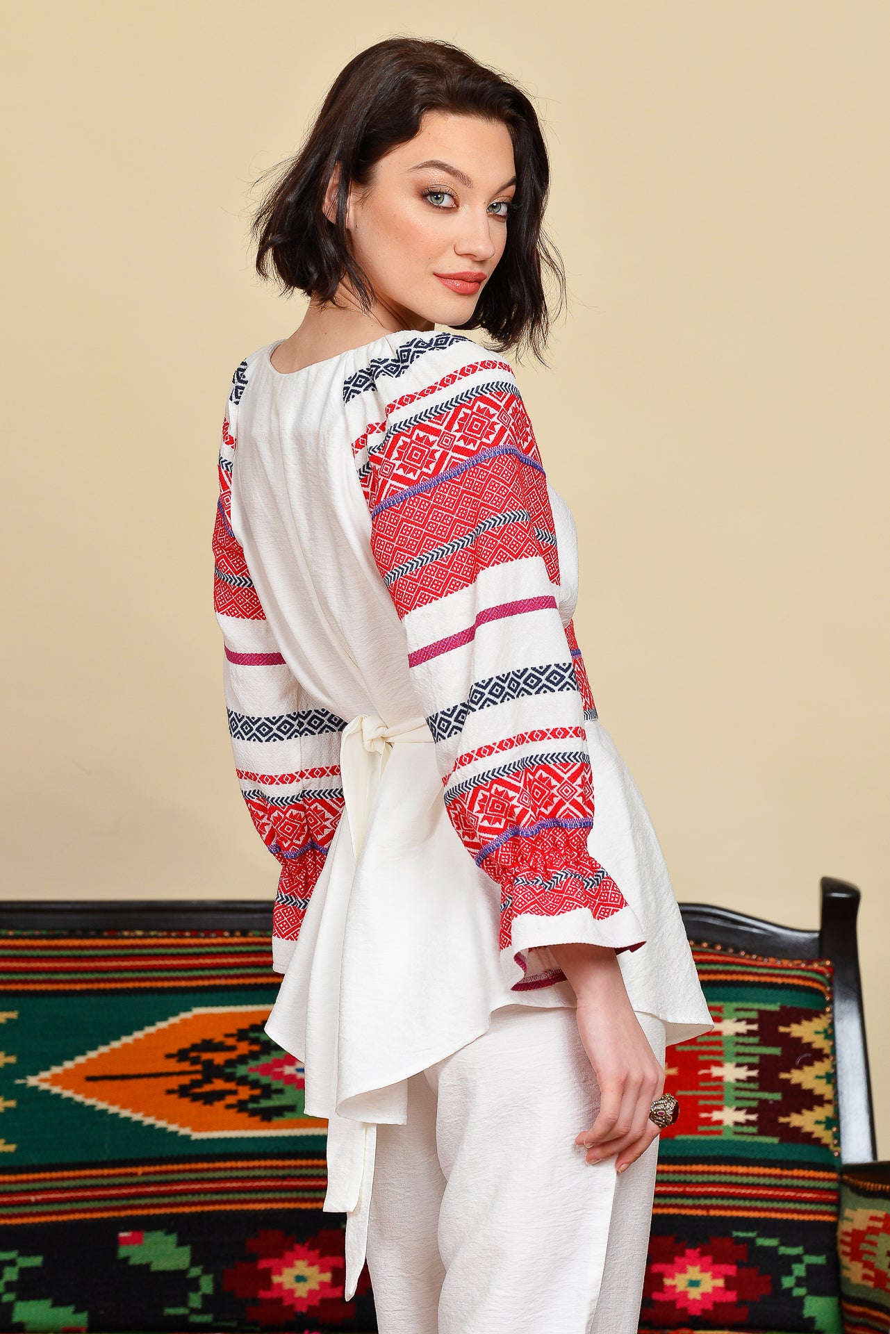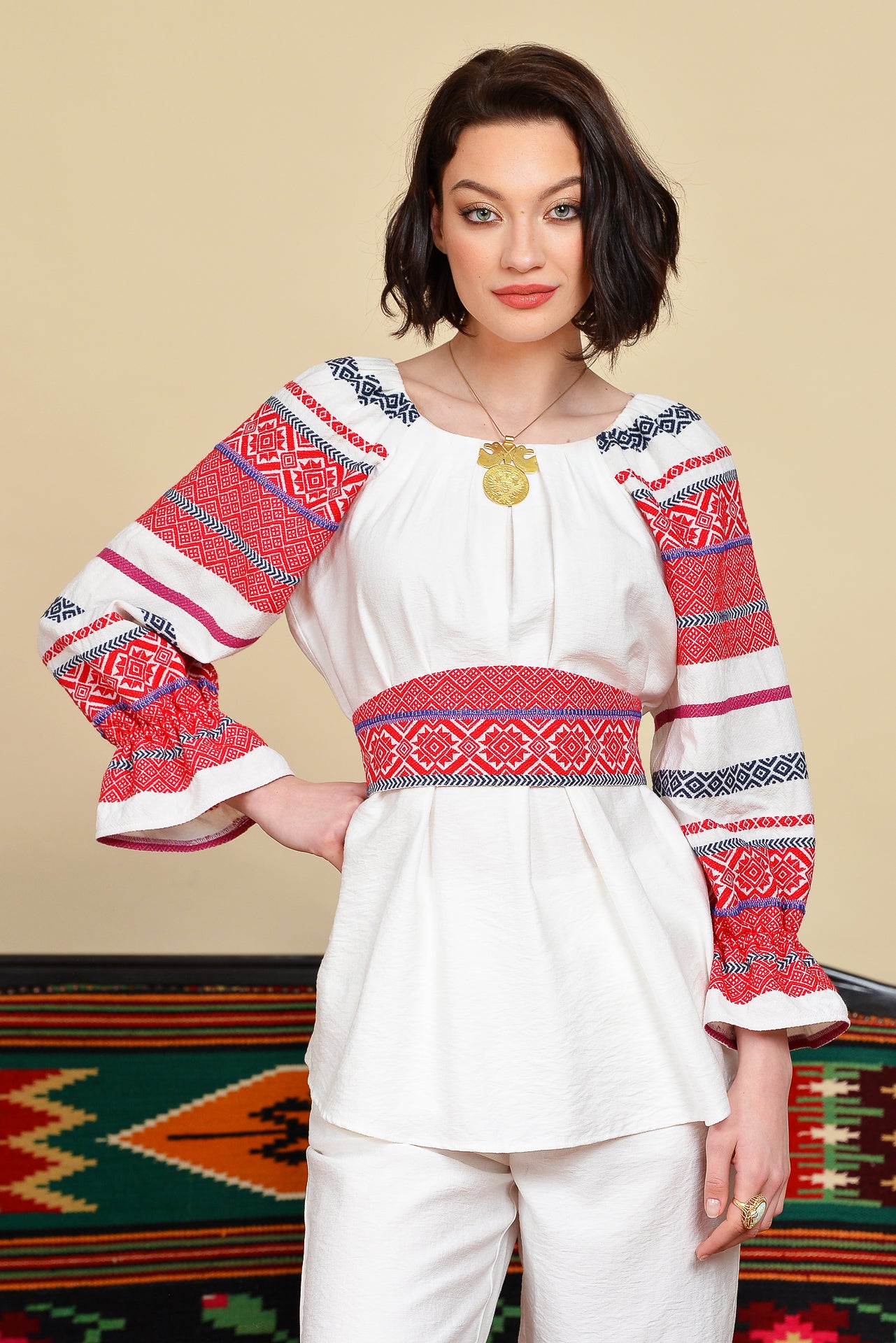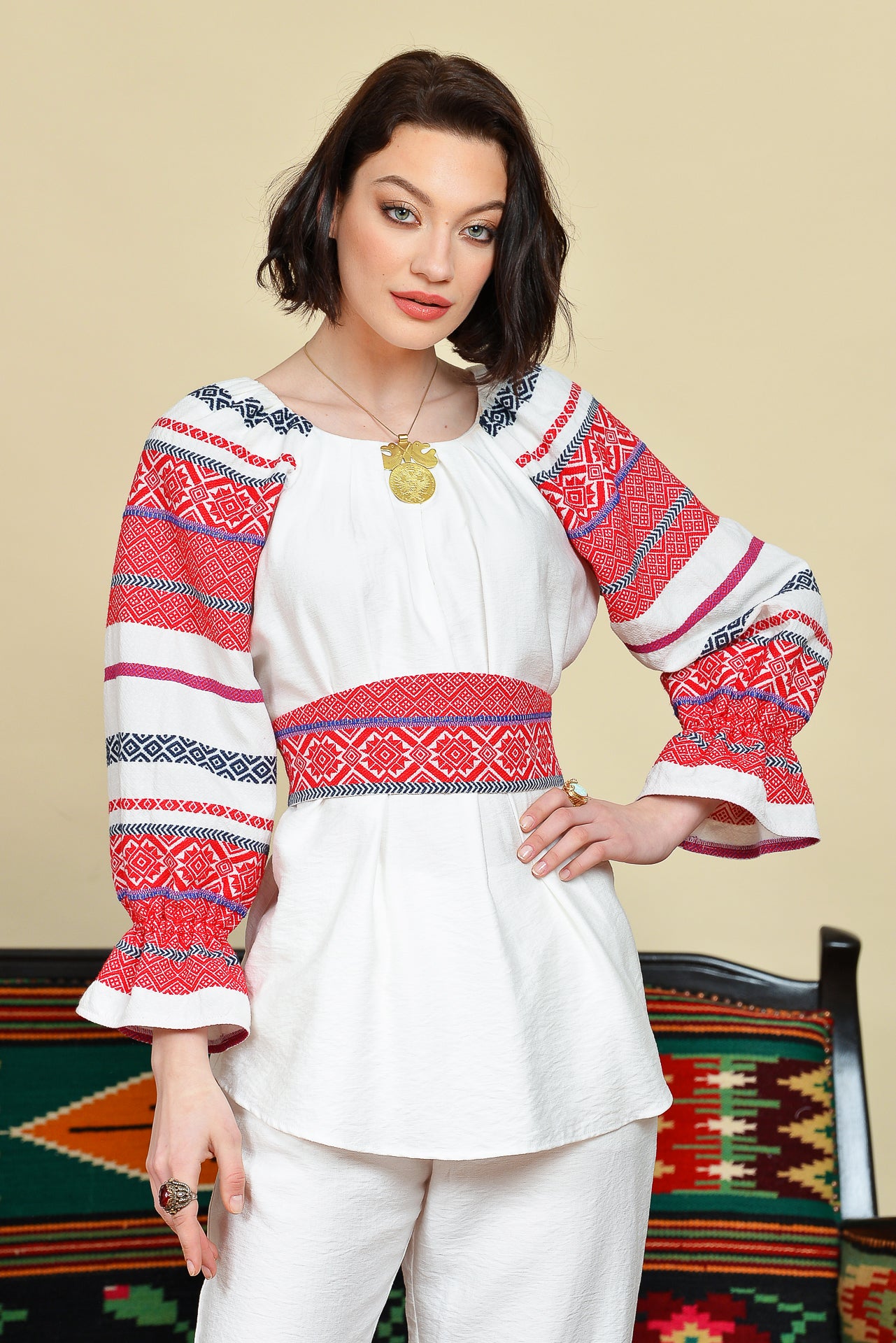 Ia stilizată Boierească este confecționată din viscoză cu in, ușor satinată și jacquard etnic,