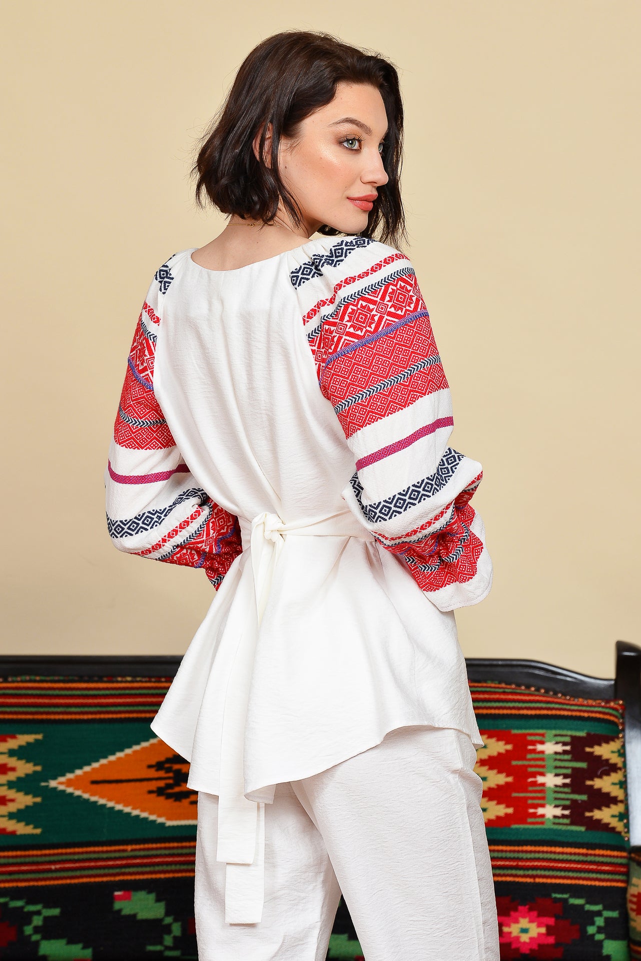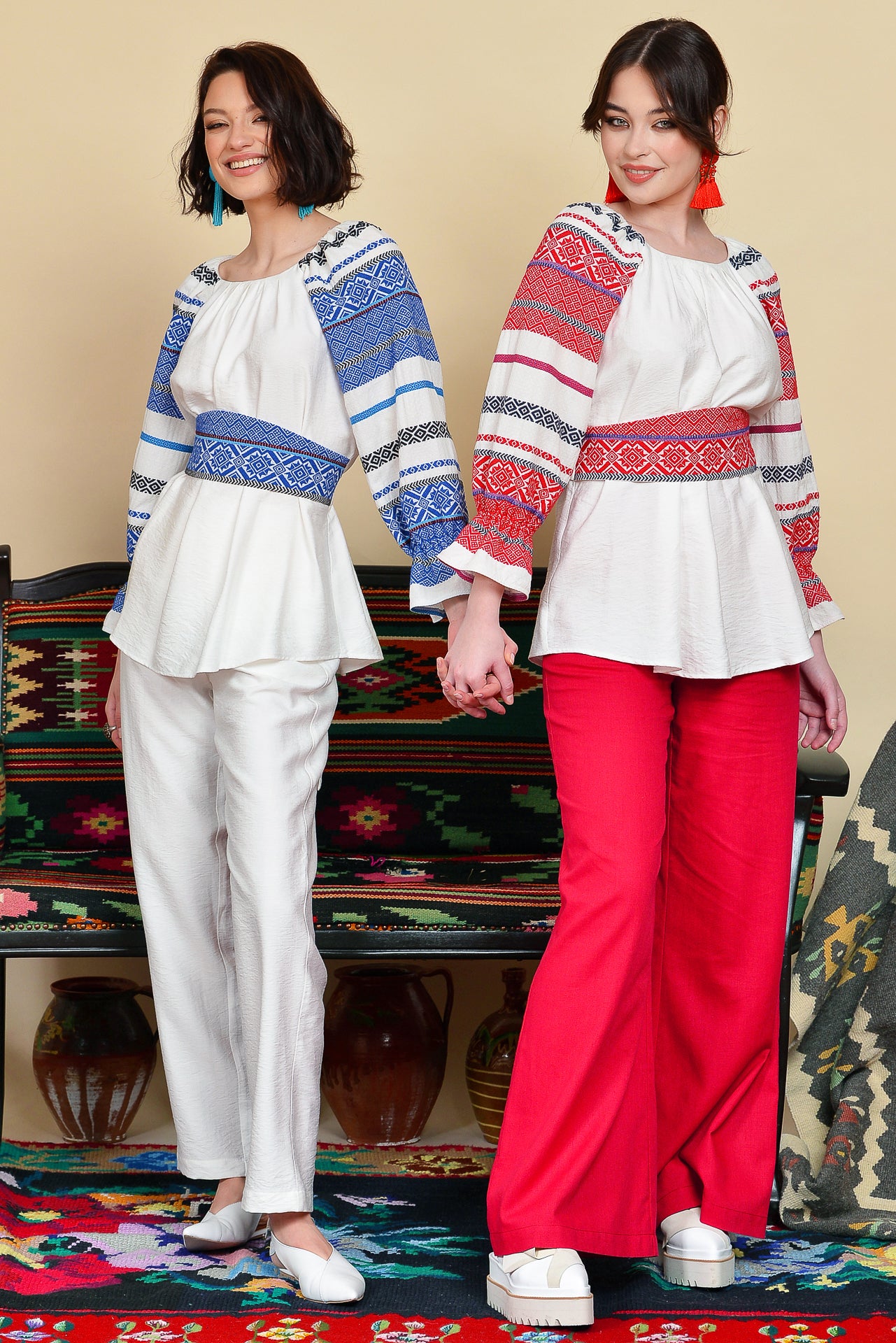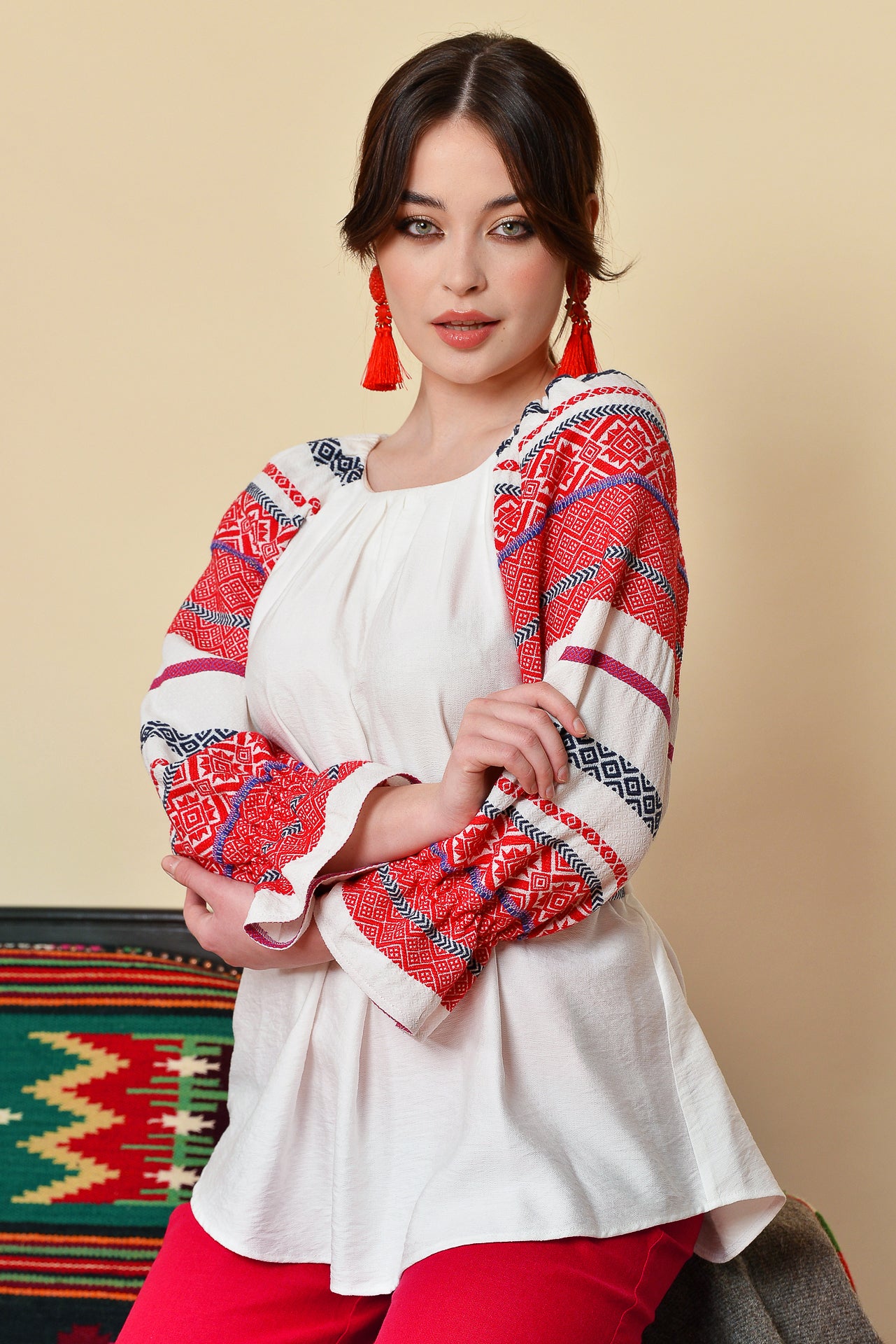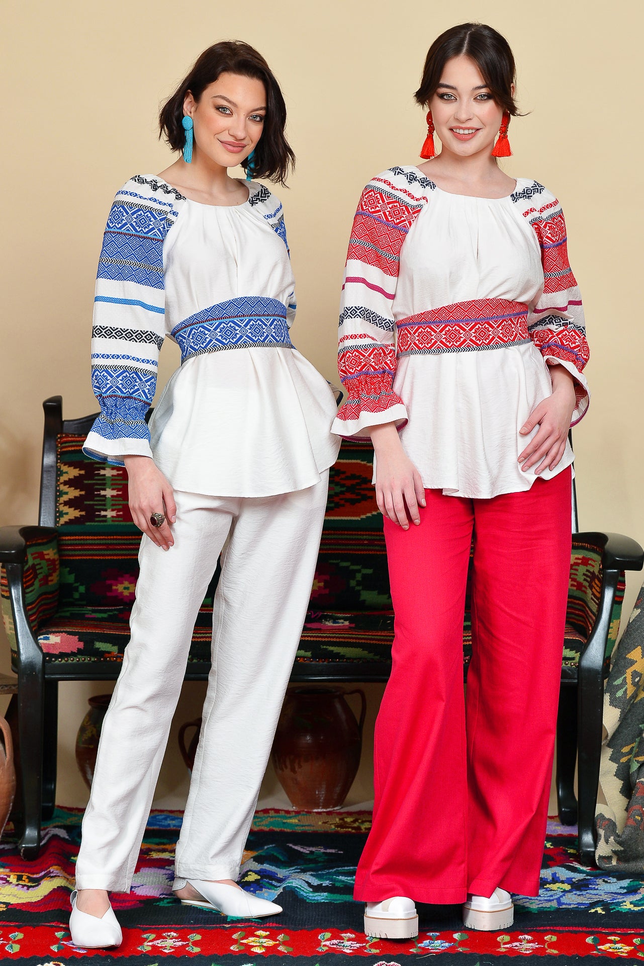 Ia stilizată Boierească este confecționată din viscoză cu in, ușor satinată și jacquard etnic,