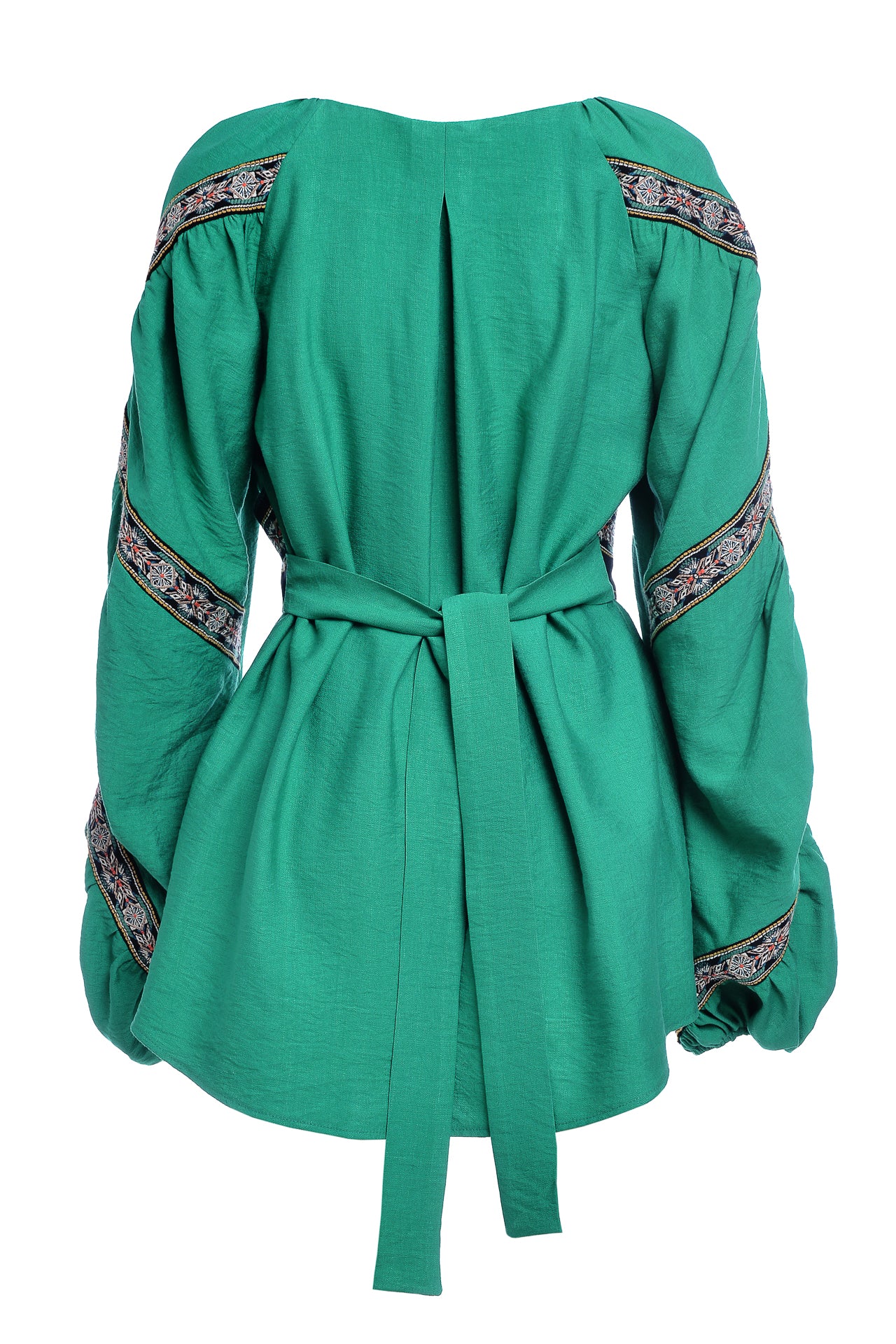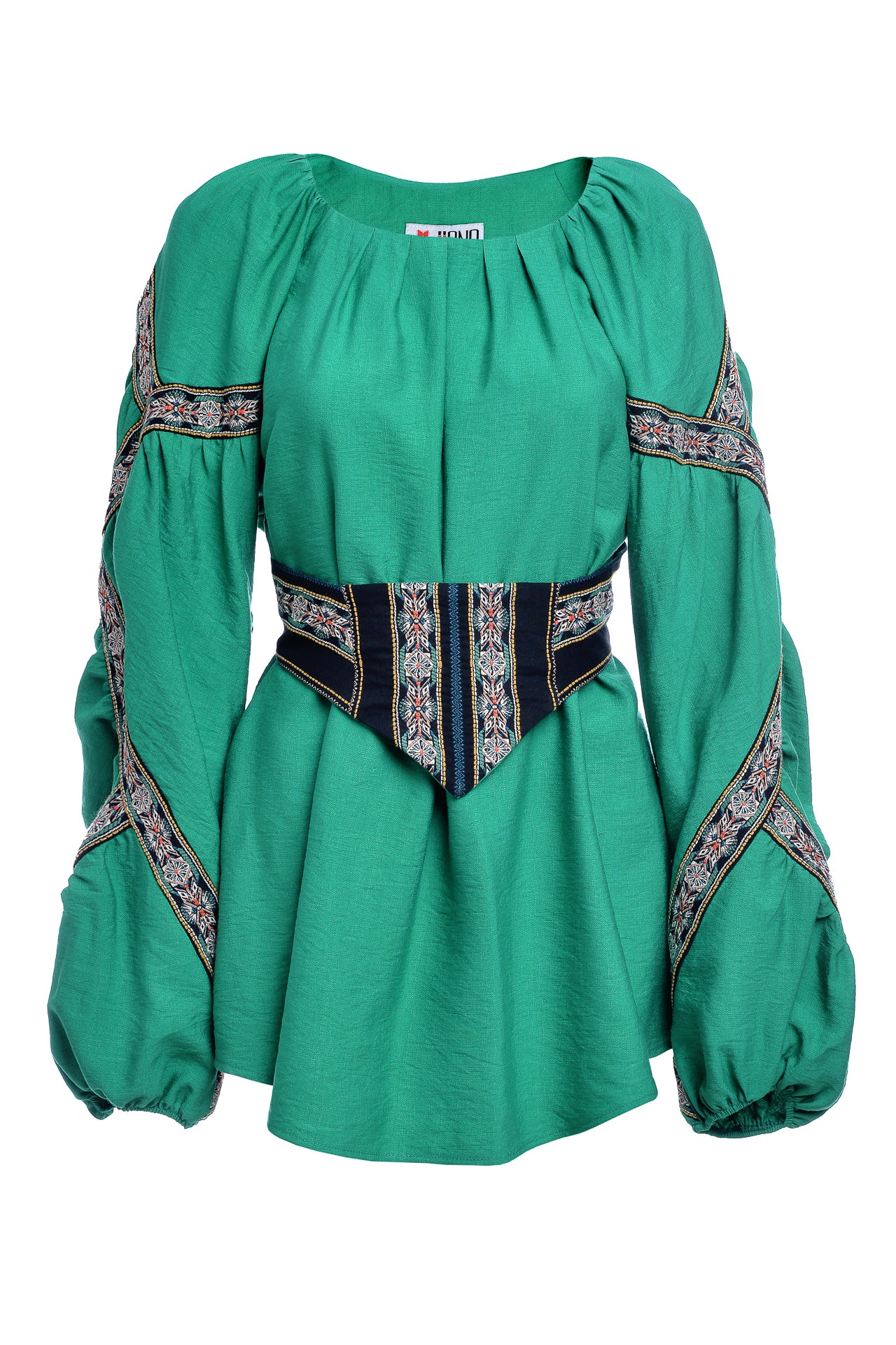 Ia are un croi feminin, cu detalii migăloase, iar talia este marcată de brâul din jacquard țesut.