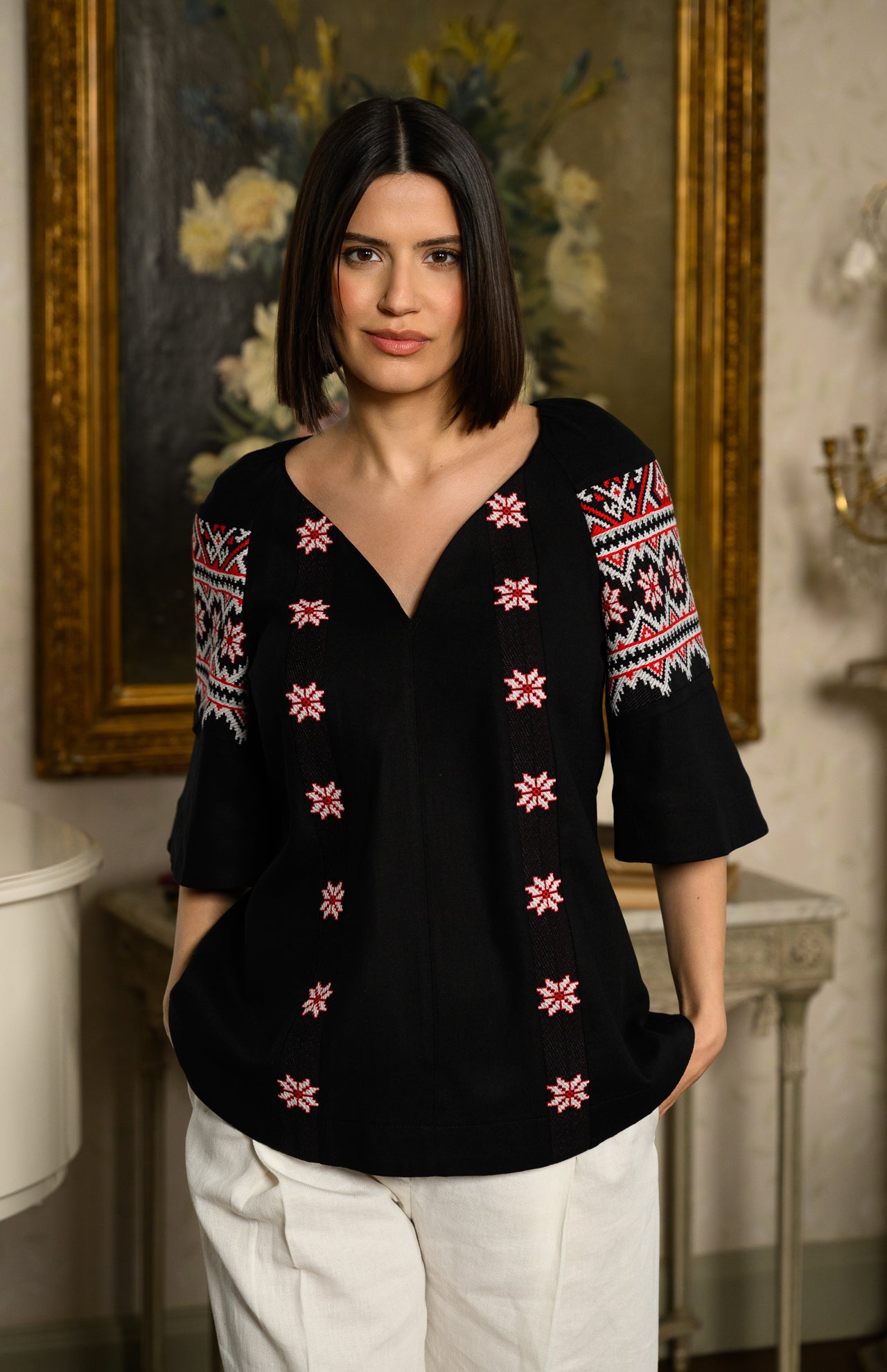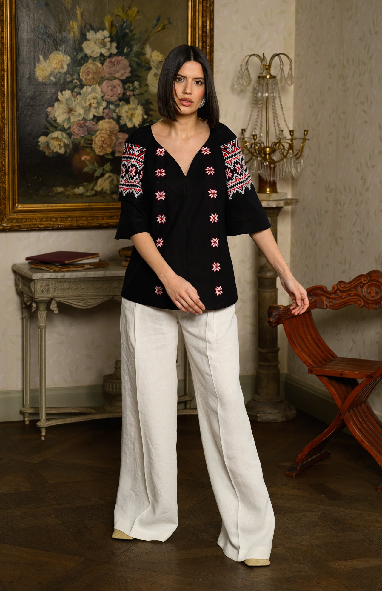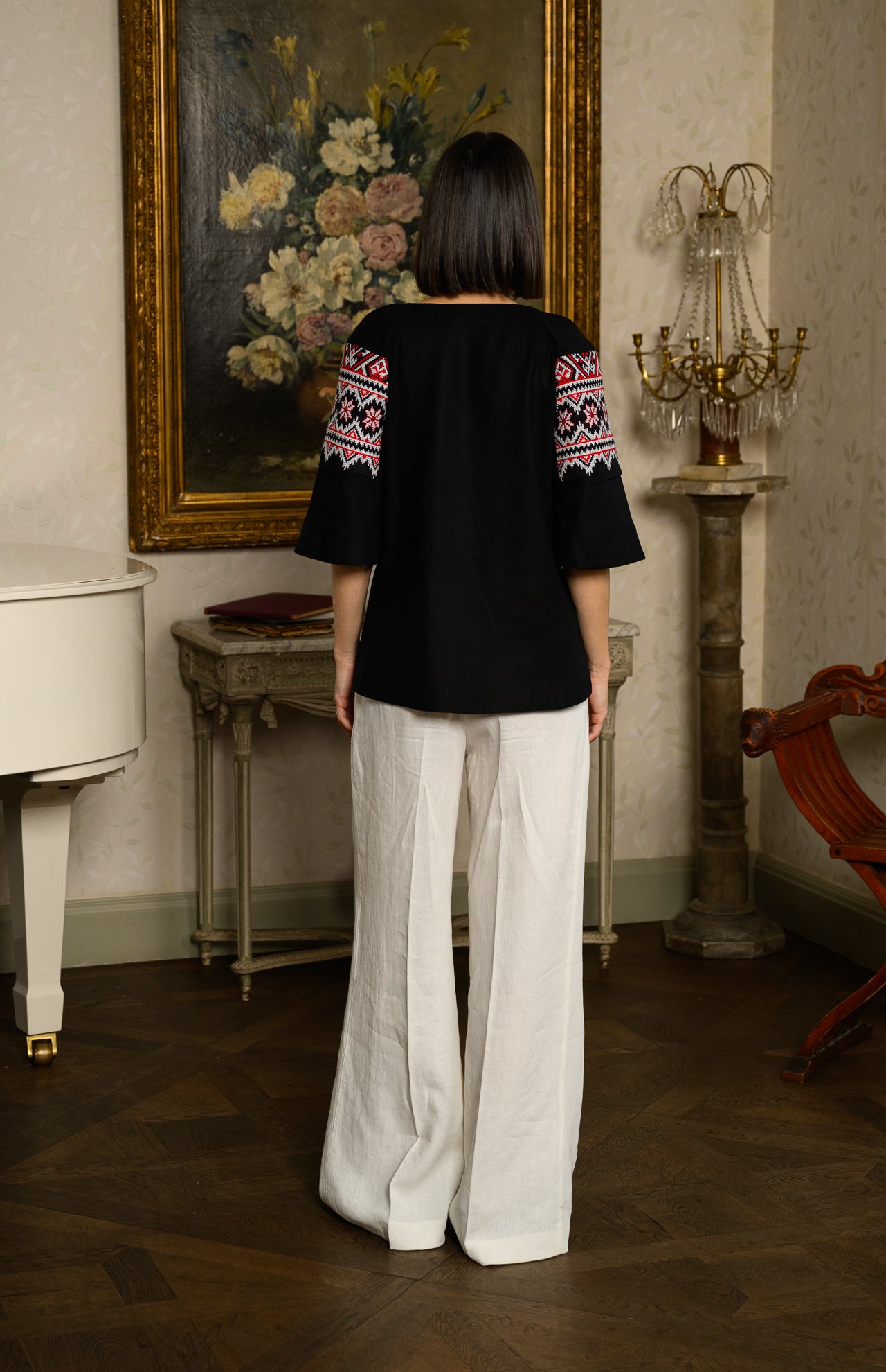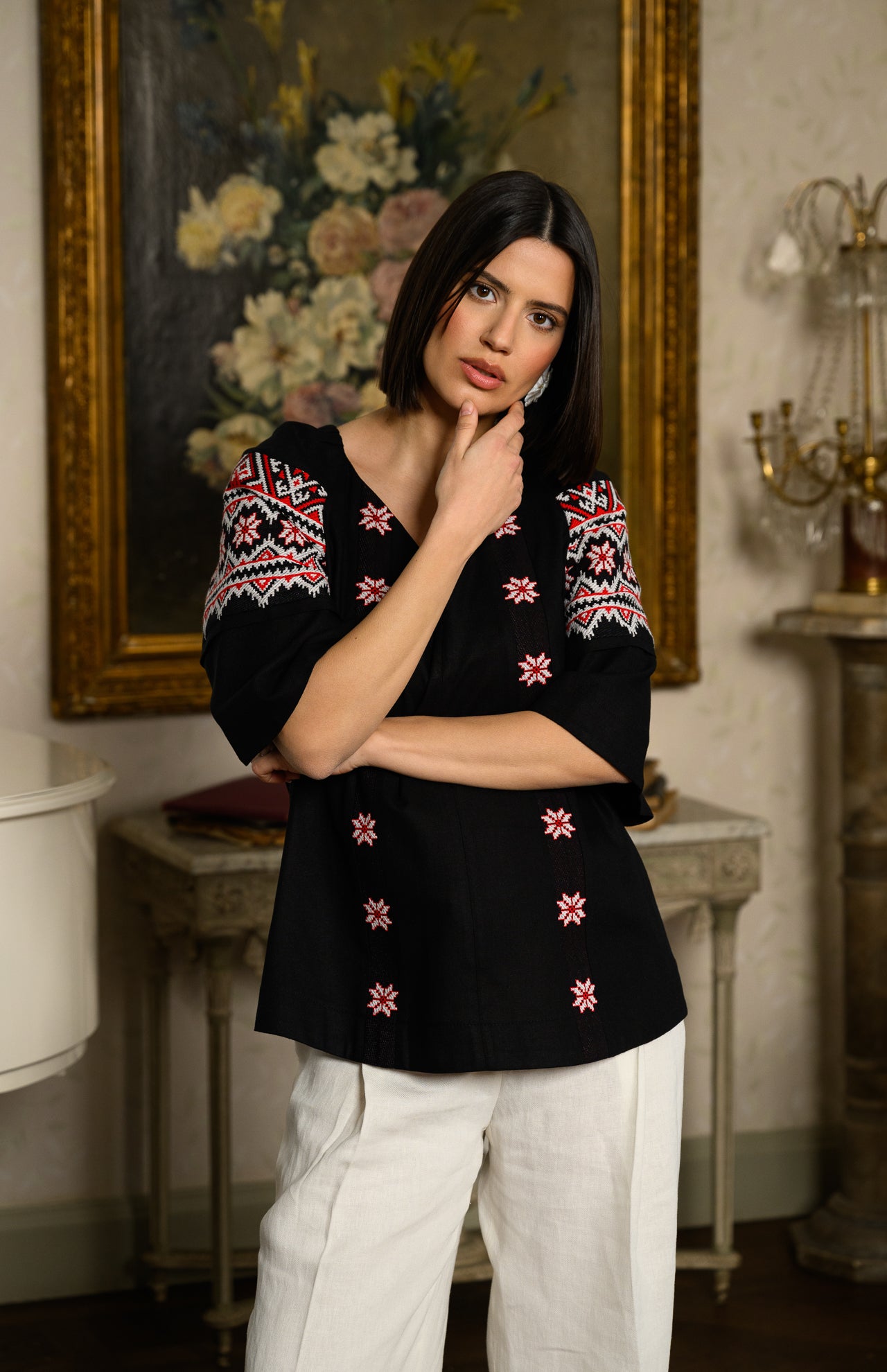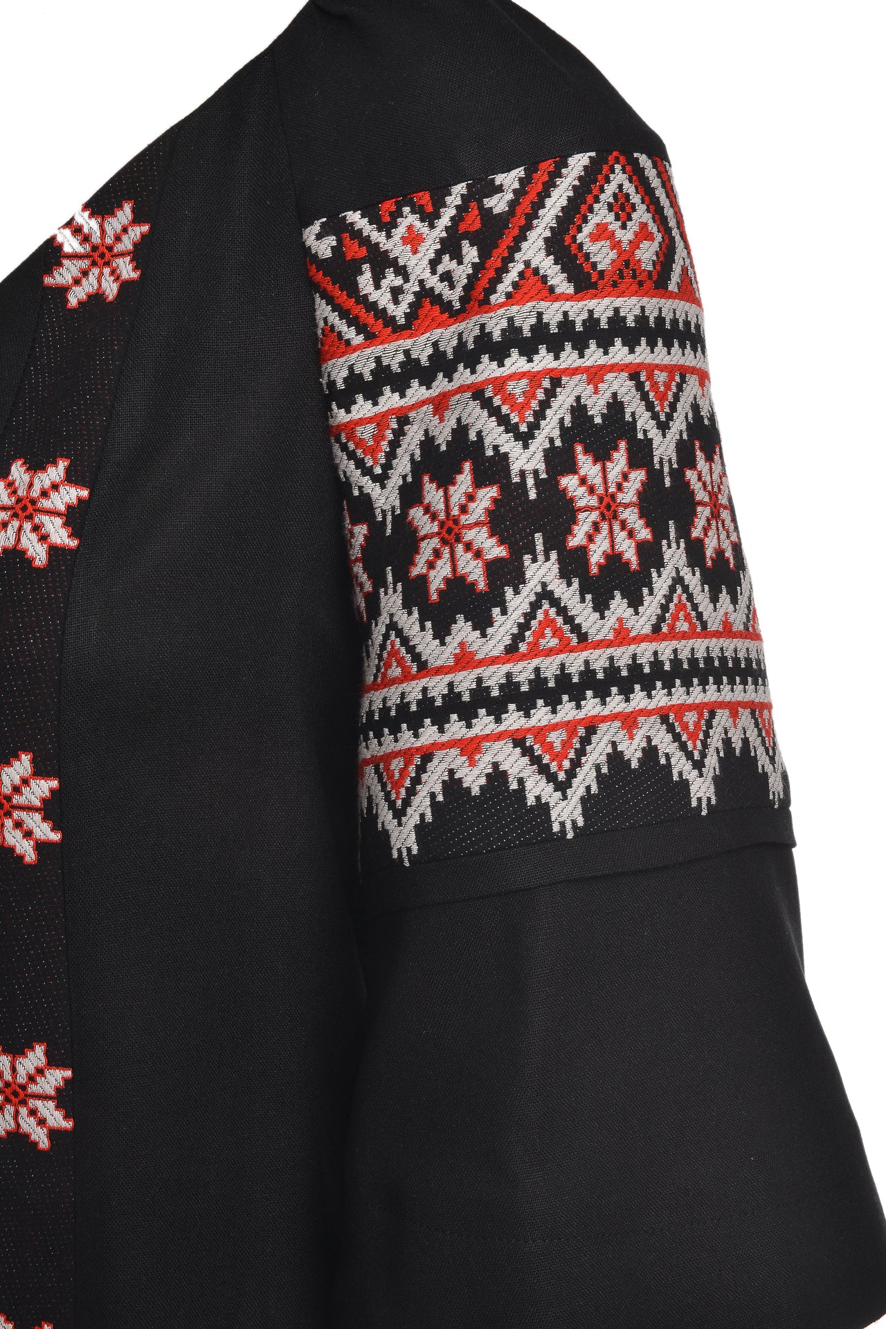 Ie neagră stilizată din in și jacquard etnic țesut Irina