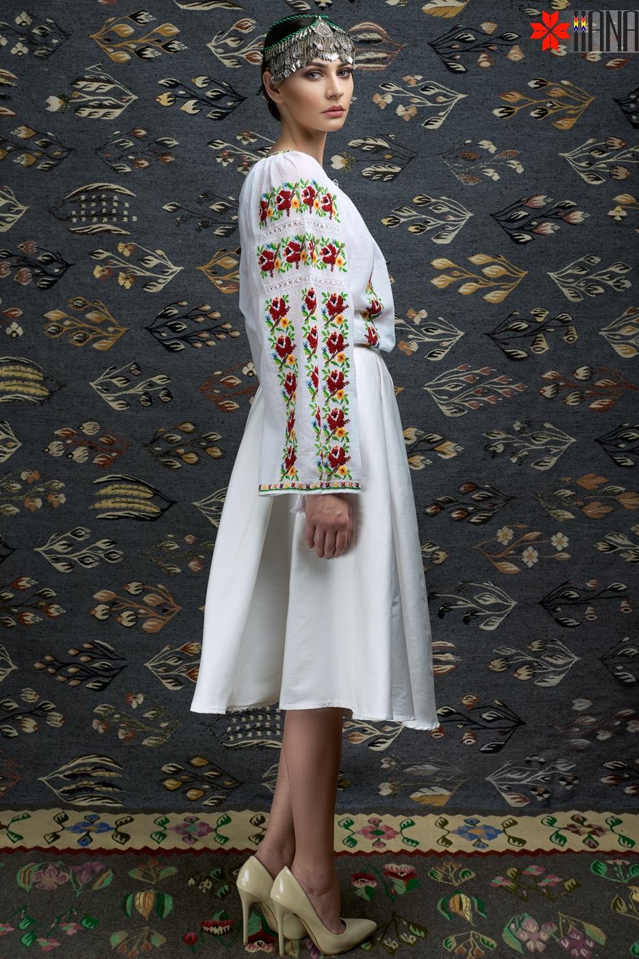 Ia Traditionala Romaneasca Maneca Lunga Motivul Inflorata este 100% din bumbac, de culoare albă. Cămașa femeiască este croită drept din patru foi de pânză, unite prin cusătură manuală în formă de cruce și încrețite la gât. Partea din față a cămășii este brodată manual prin repetarea acelorași elemente existente pe mâneci, iar cusătura manuală este realizată prin numărarea firelor țesăturii. Motivele broderiei sunt inspirate din natură, motive geometrice complexe și motive florale. Pe mâneci, motivele ornamentale ale râurilor concordă în stil cu ornamentația altiței. Deși ia are o croială dreaptă, prin plasarea elementelor decorative în câmpuri bine delimitate, acestea subliniază liniile corpului conferind cămășii femeiești un caracter sculptural. Prin croiala și prin broderia armonioasă, cămașa femeiască se impune ca o realizare eminentă a geniului creator popular din țara noastră.