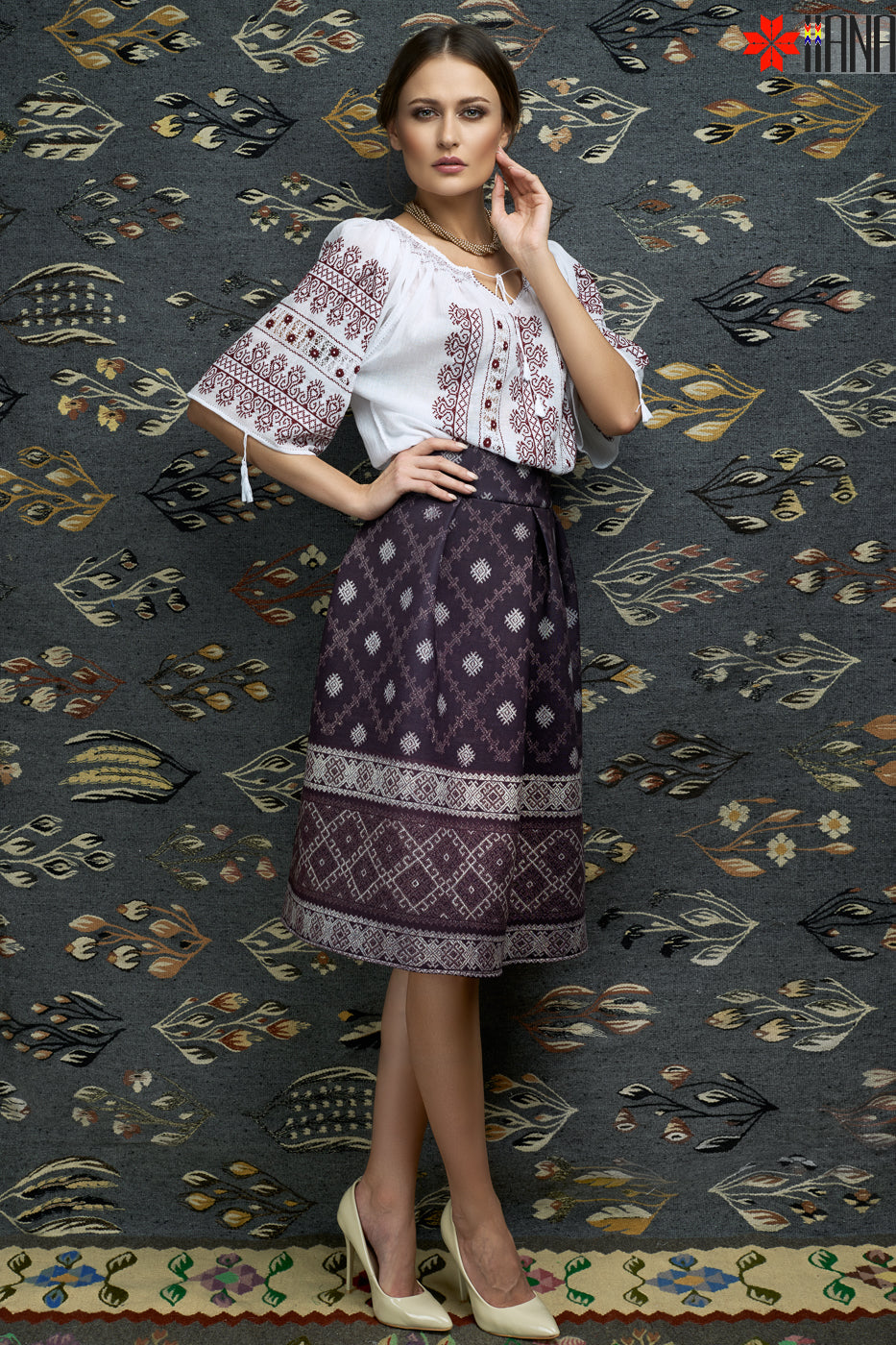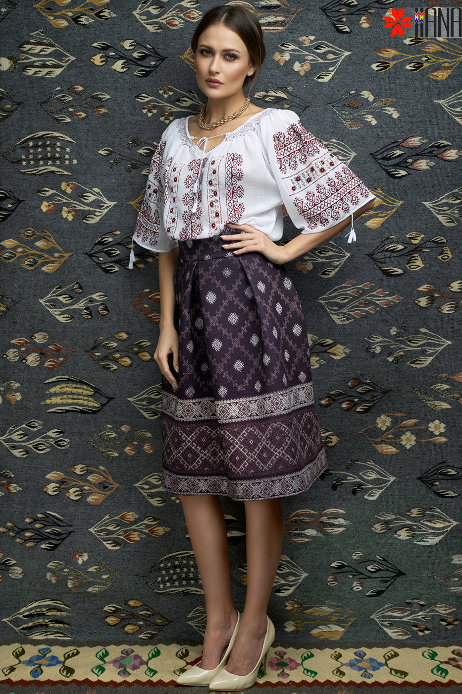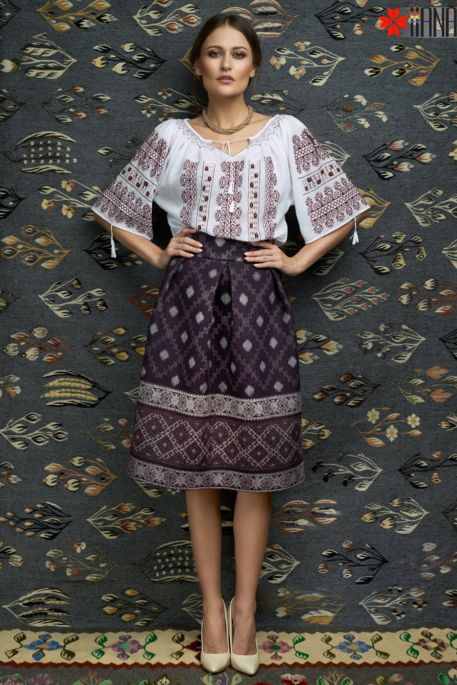 Ie traditionala romaneasca din panza topita 100% bumbac de culoare alba. Camasa femeiasca este croita drept din patru foi de panza, unite prin cusatura manuala in forma de cruce si incretite la gat. Partea din fata a camasii este brodata manual prin repetarea acelorasi elemente existente pe maneci, iar cusatura manuala este realizata prin numararea firelor tesaturii. Motivele broderiei sunt inspirate din natura, motive geometrice complex. Desi ia are o croiala dreapta, prin plasarea elementelor decorative in campuri bine delimitate, acestea subliniaza liniile corpului conferind camasii femeiesti un caracter sculptural. Prin croiala si prin broderia armonioasa camasa femeiasca , se impune ca o realizare eminenta a geniului creator popular din tara noastra.