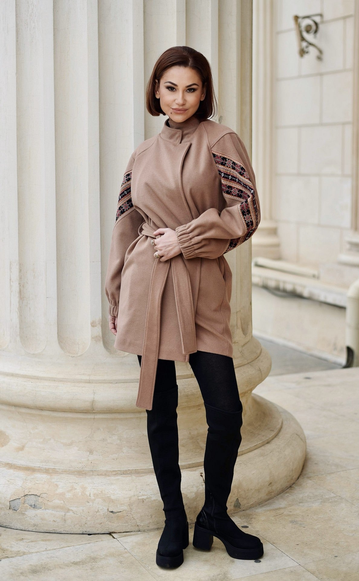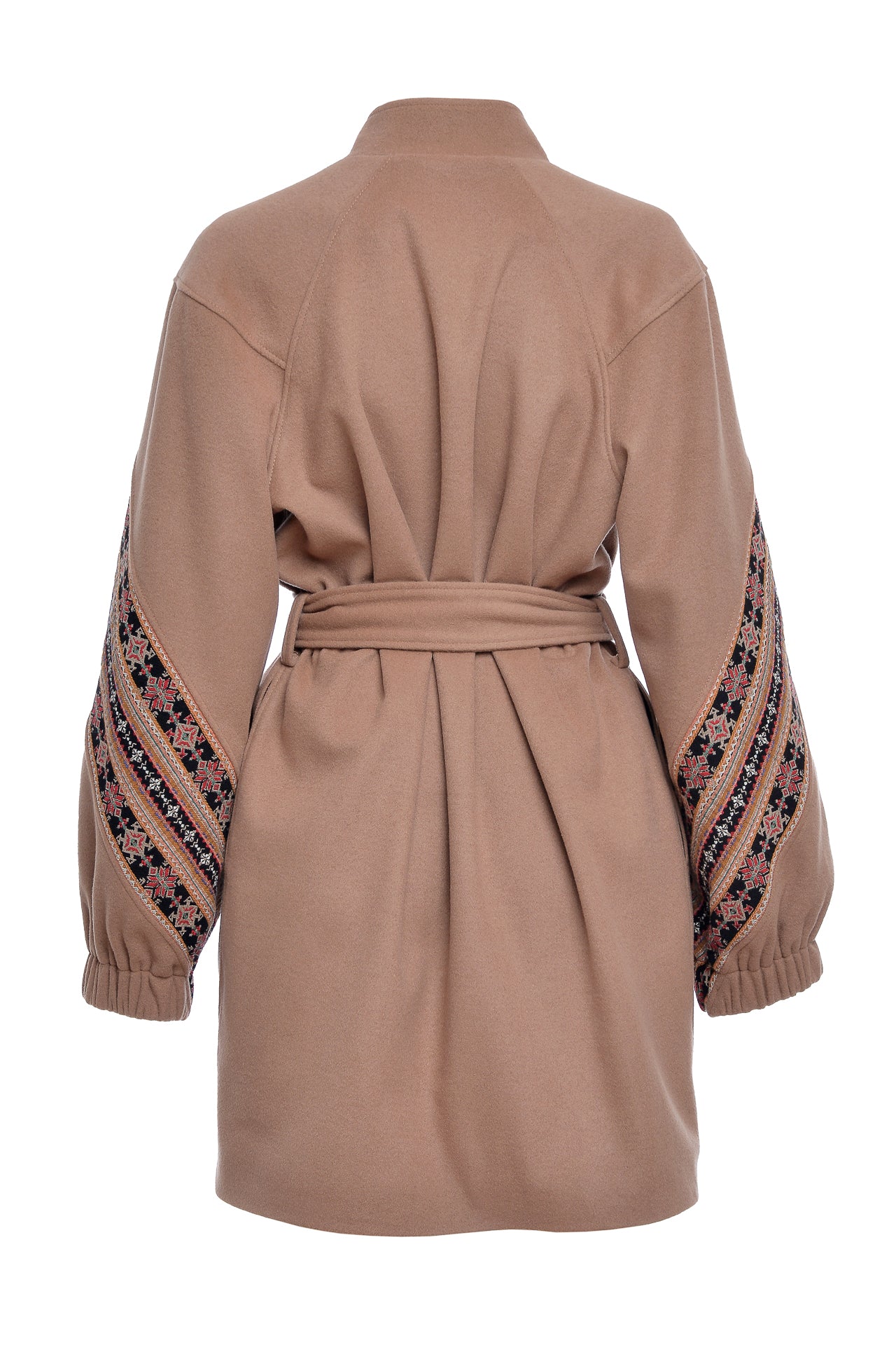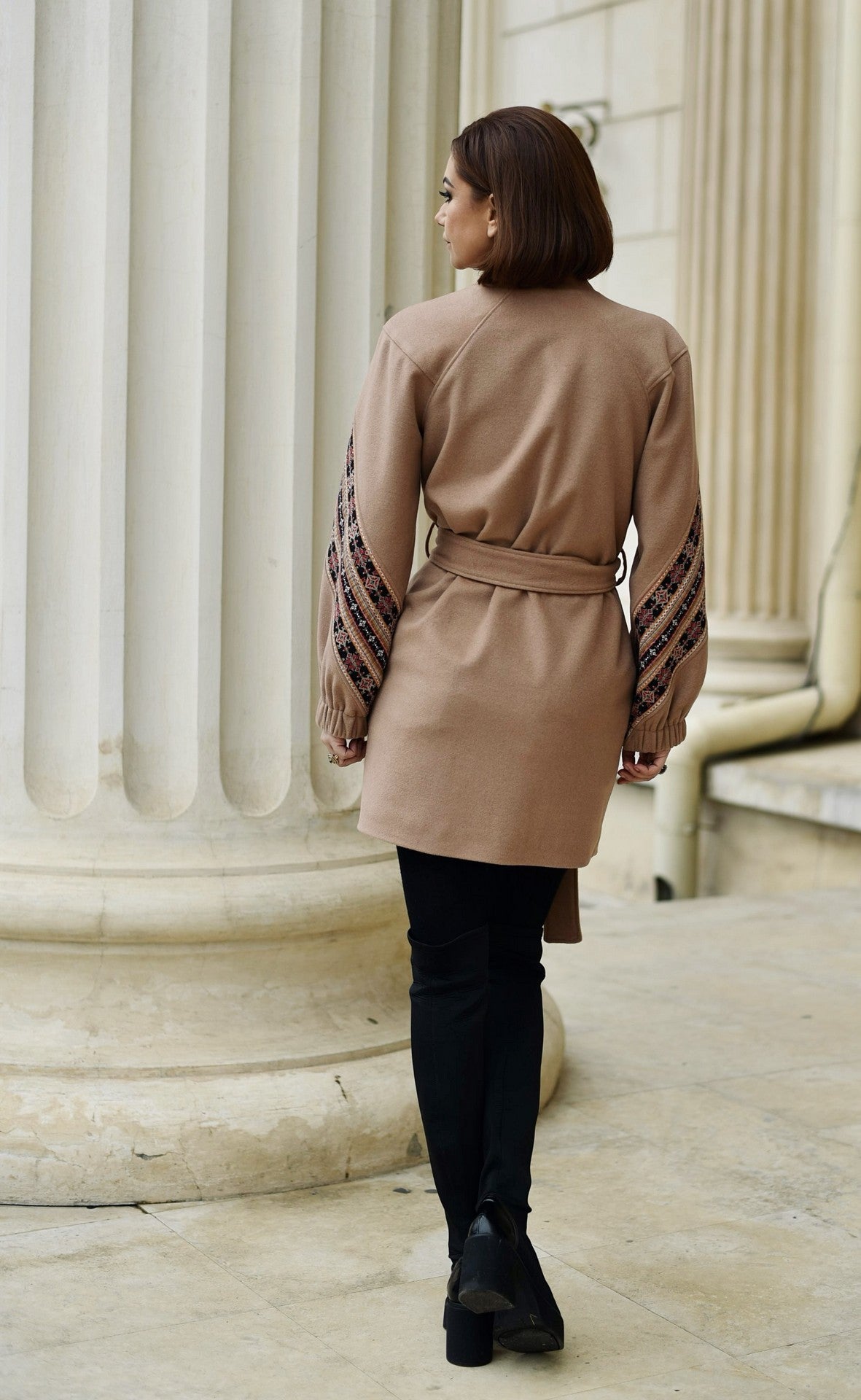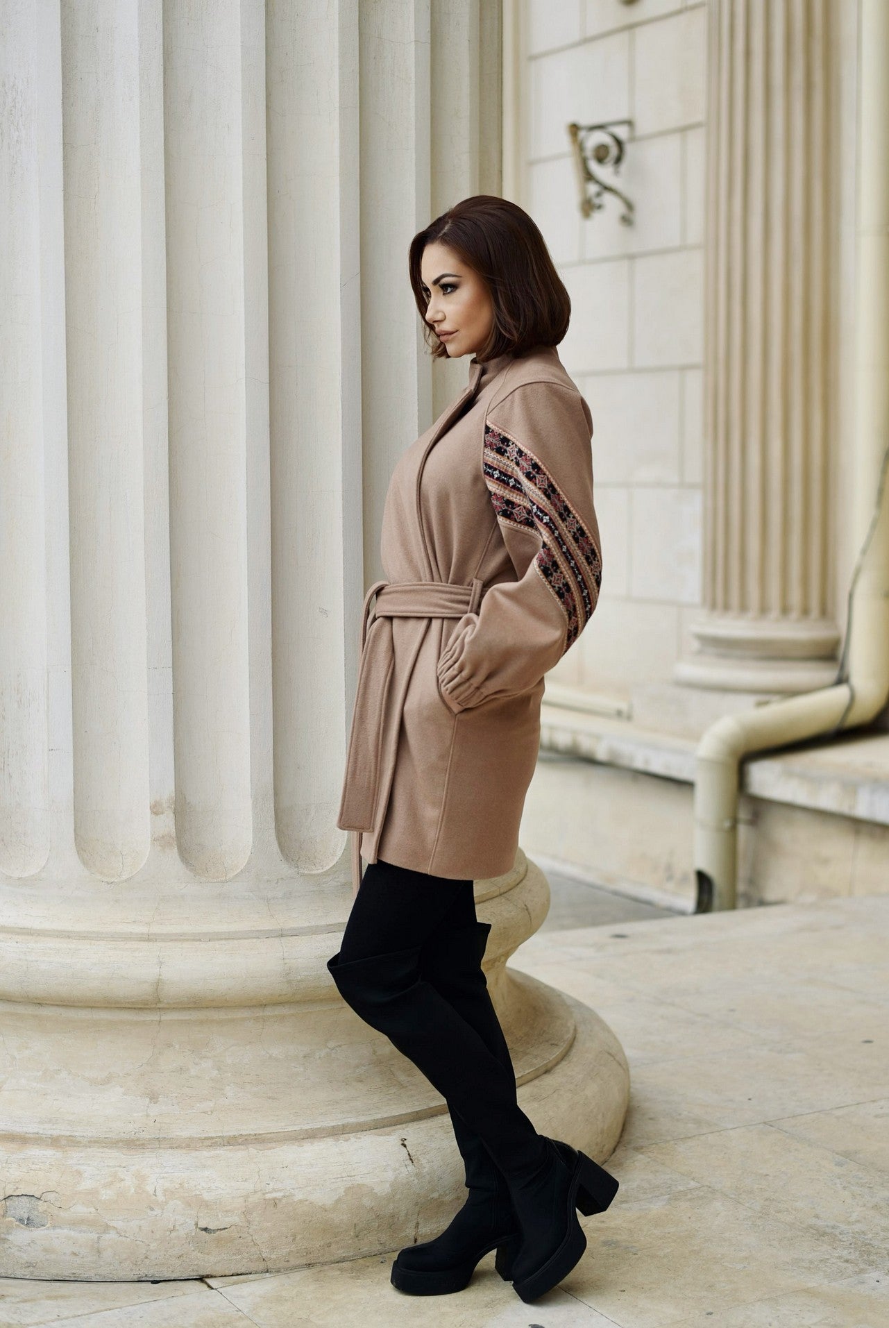 Jacheta Spirala Cu Broderie Florala din Stofa De Lana Si Casmir Bej