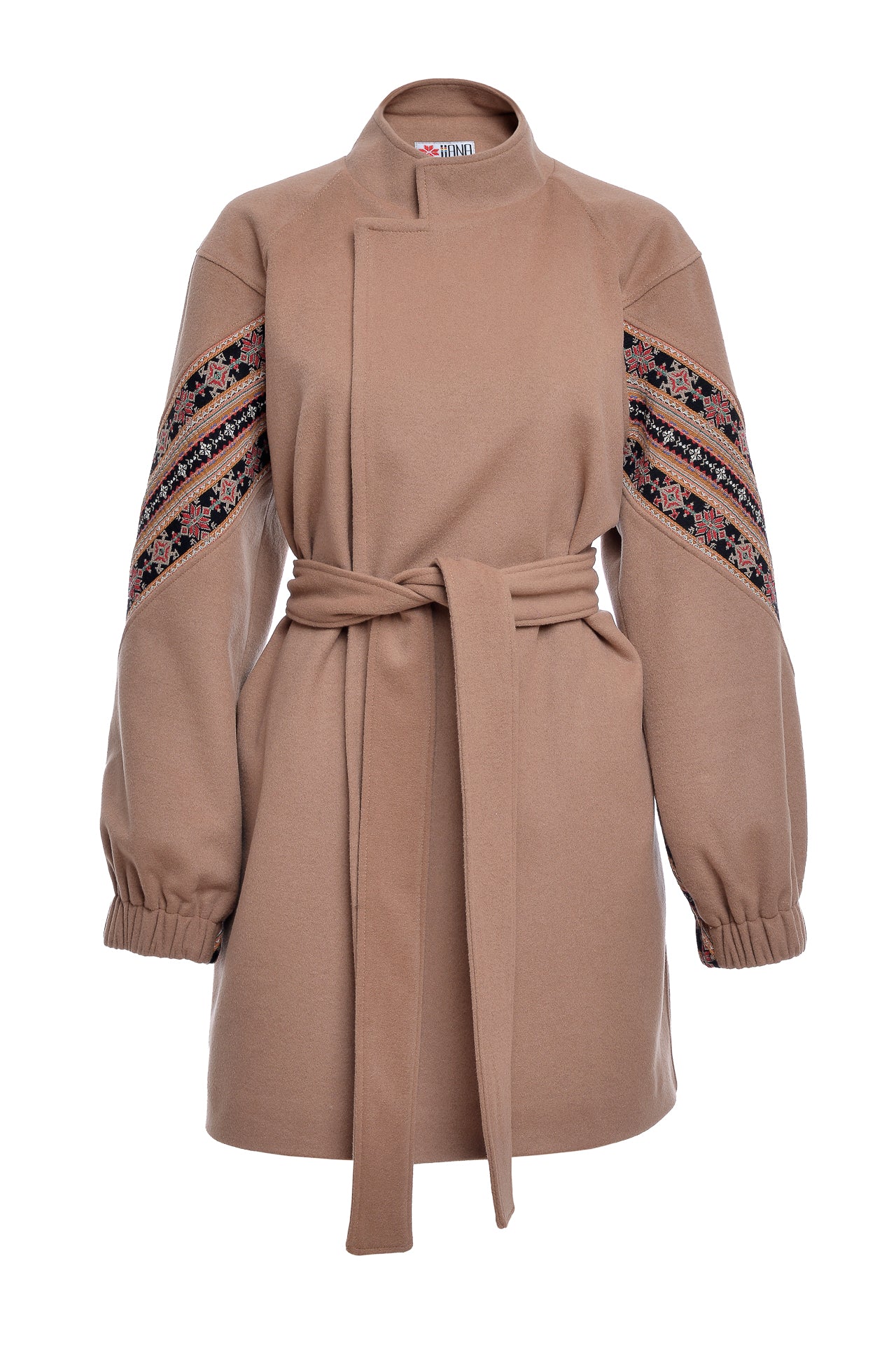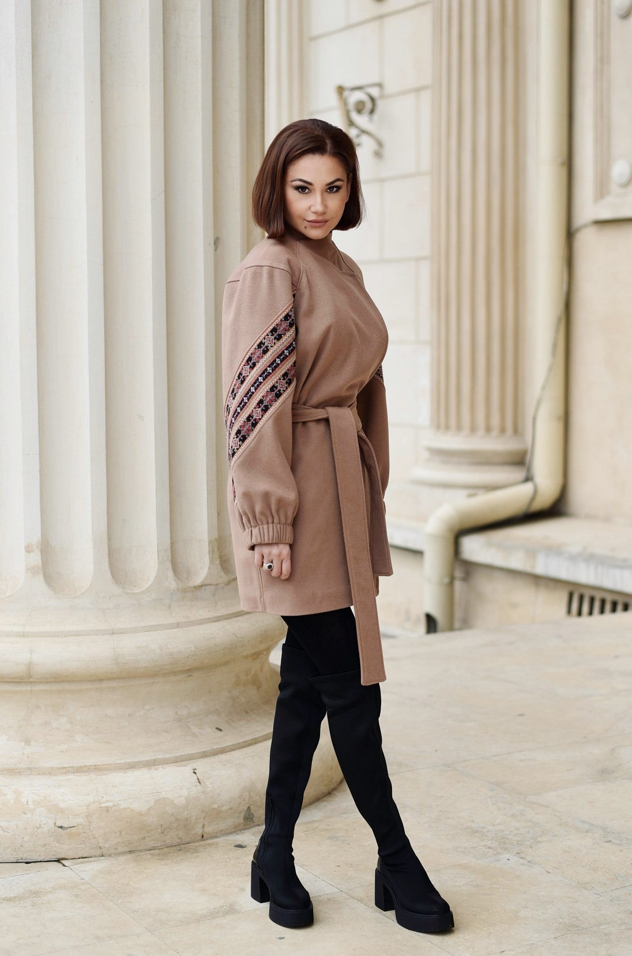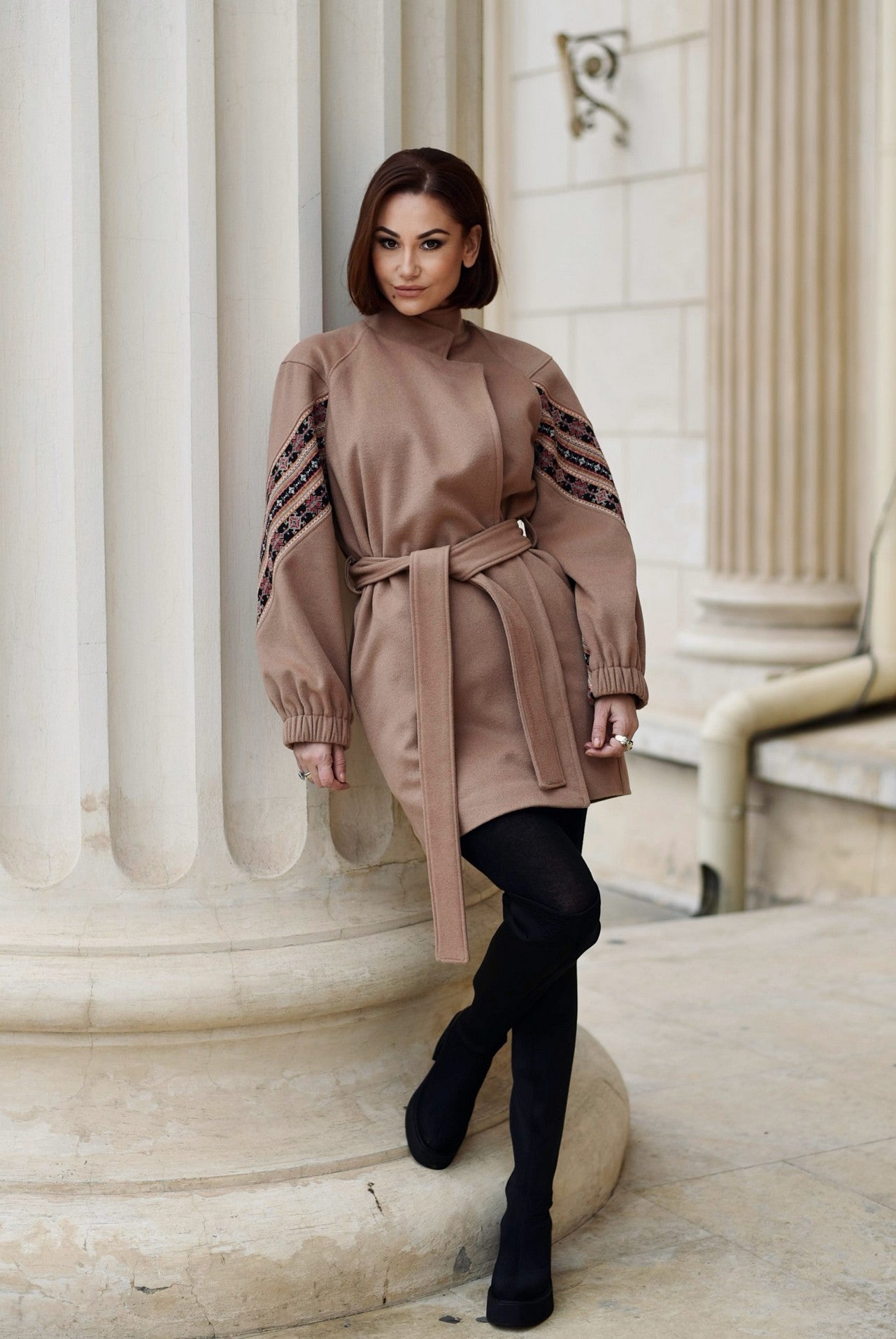 Jacheta Spirala Cu Broderie Florala din Stofa De Lana Si Casmir Bej