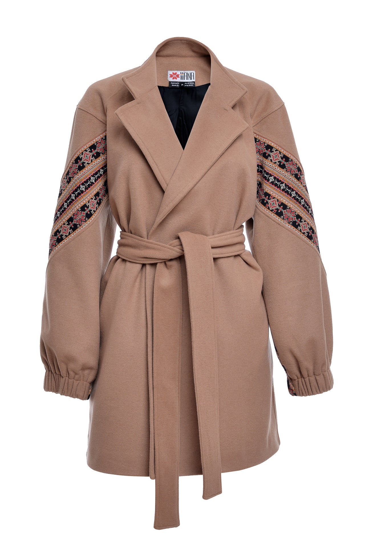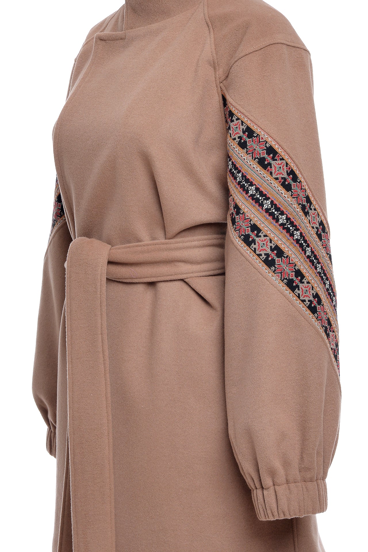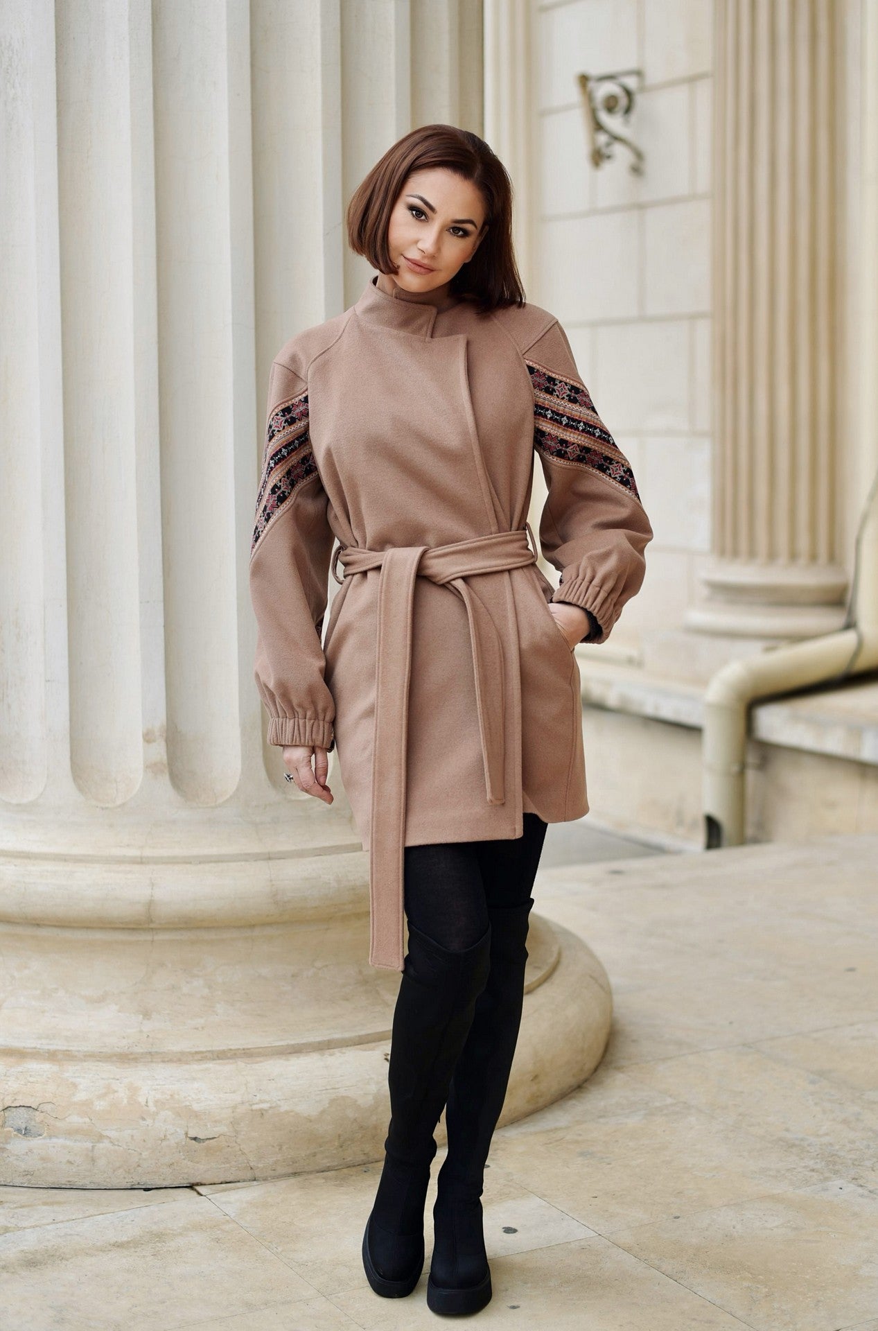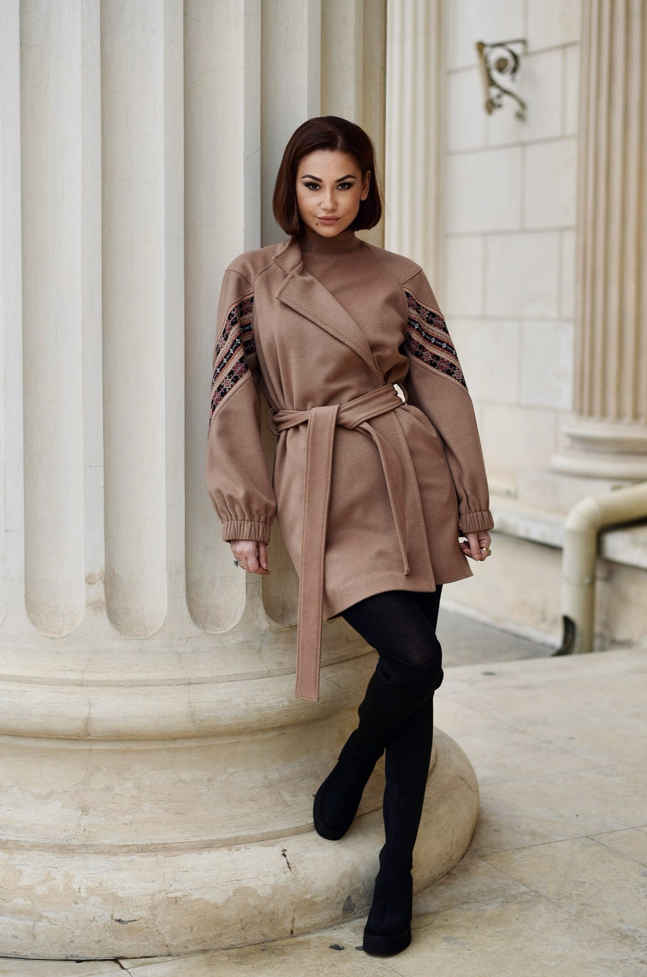 Jacheta Spirala Cu Broderie Florala din Stofa De Lana Si Casmir Bej