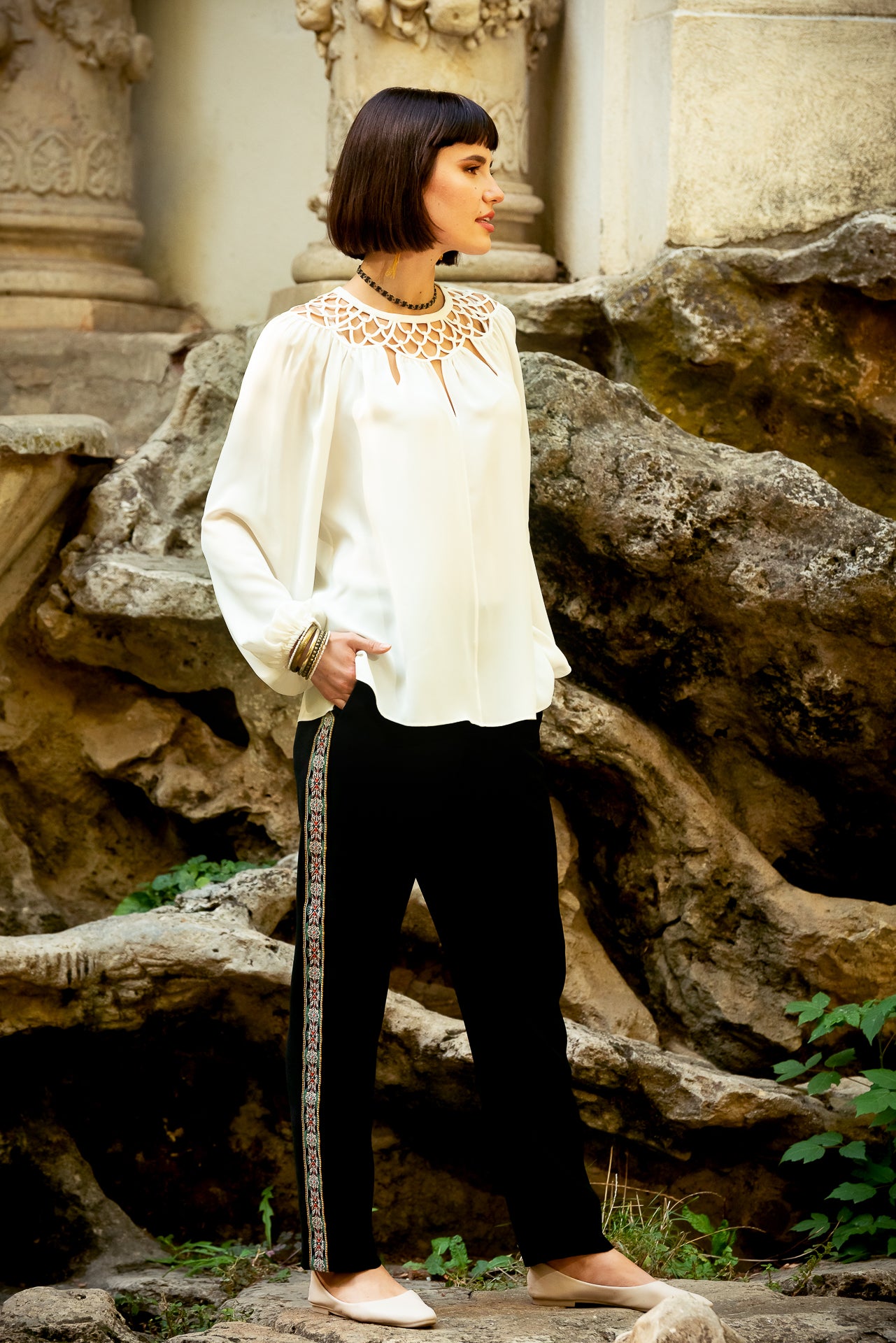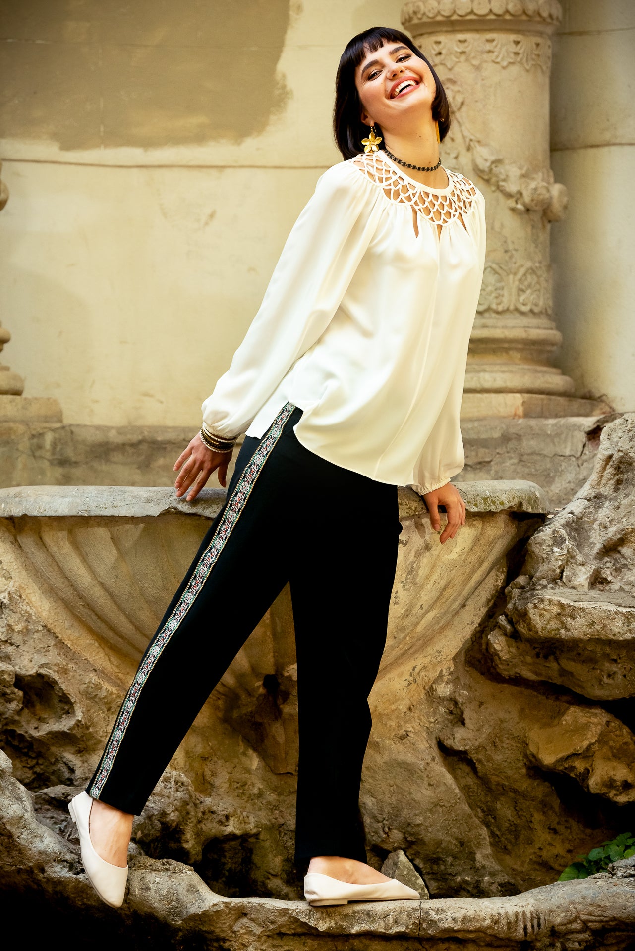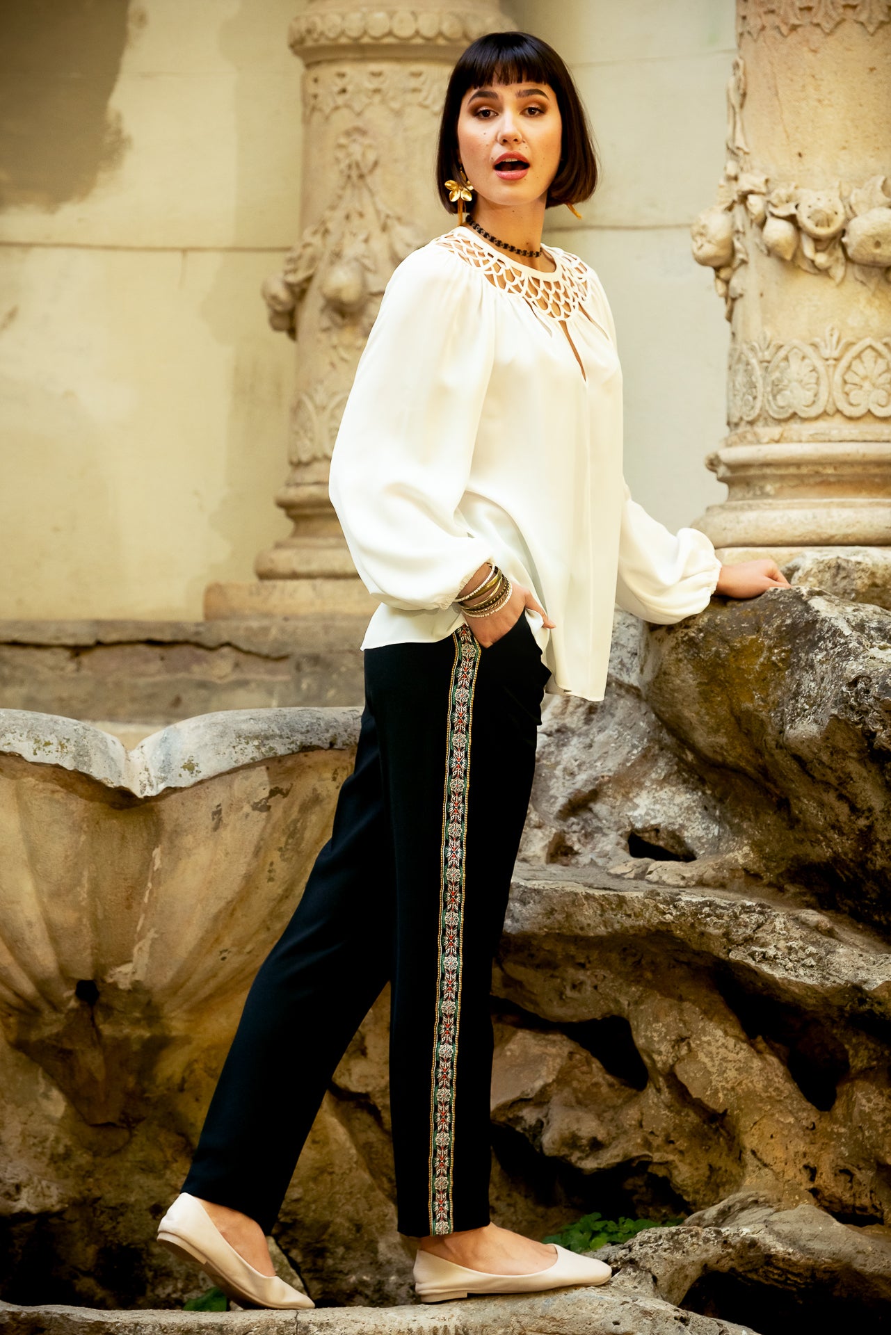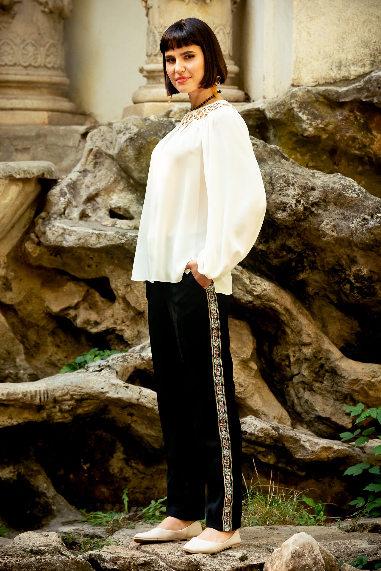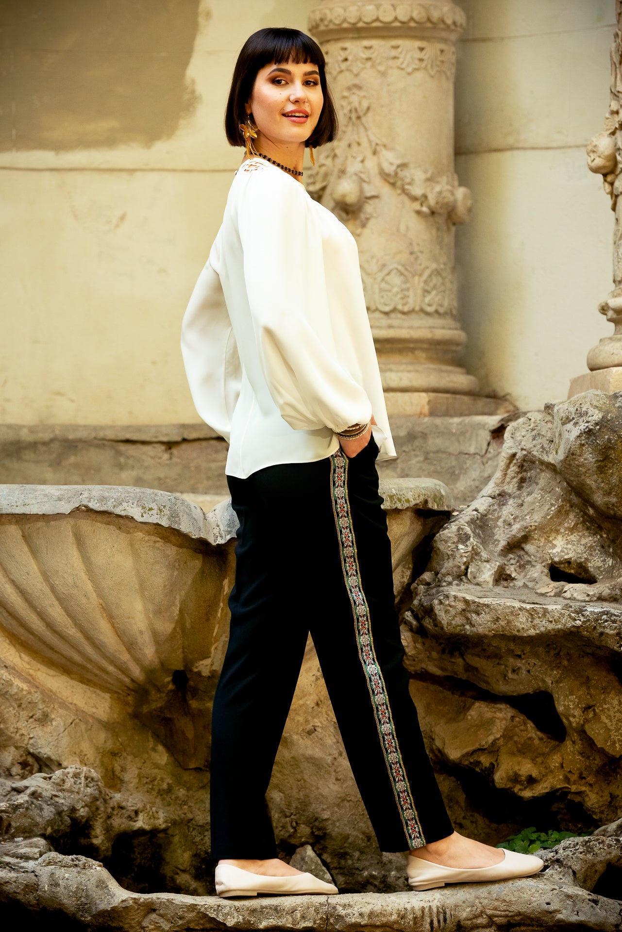 Pantalonii conici sau pană sunt confecționați din stofă neagră elasticăc și jacquard etnic floral.