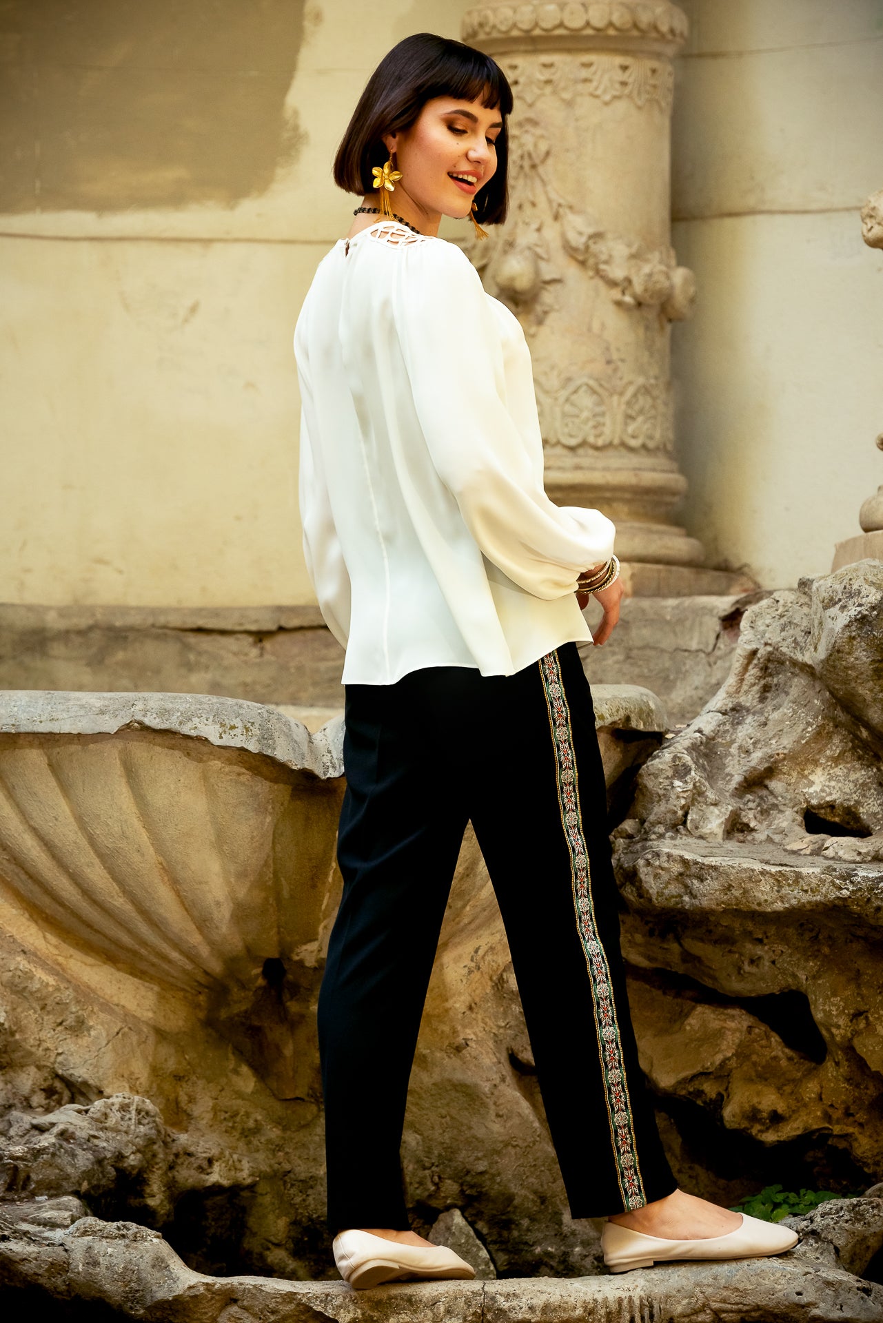 Pantaloni Conici din Stofa Neagra cu Banda Laterala din Jacquard Floral