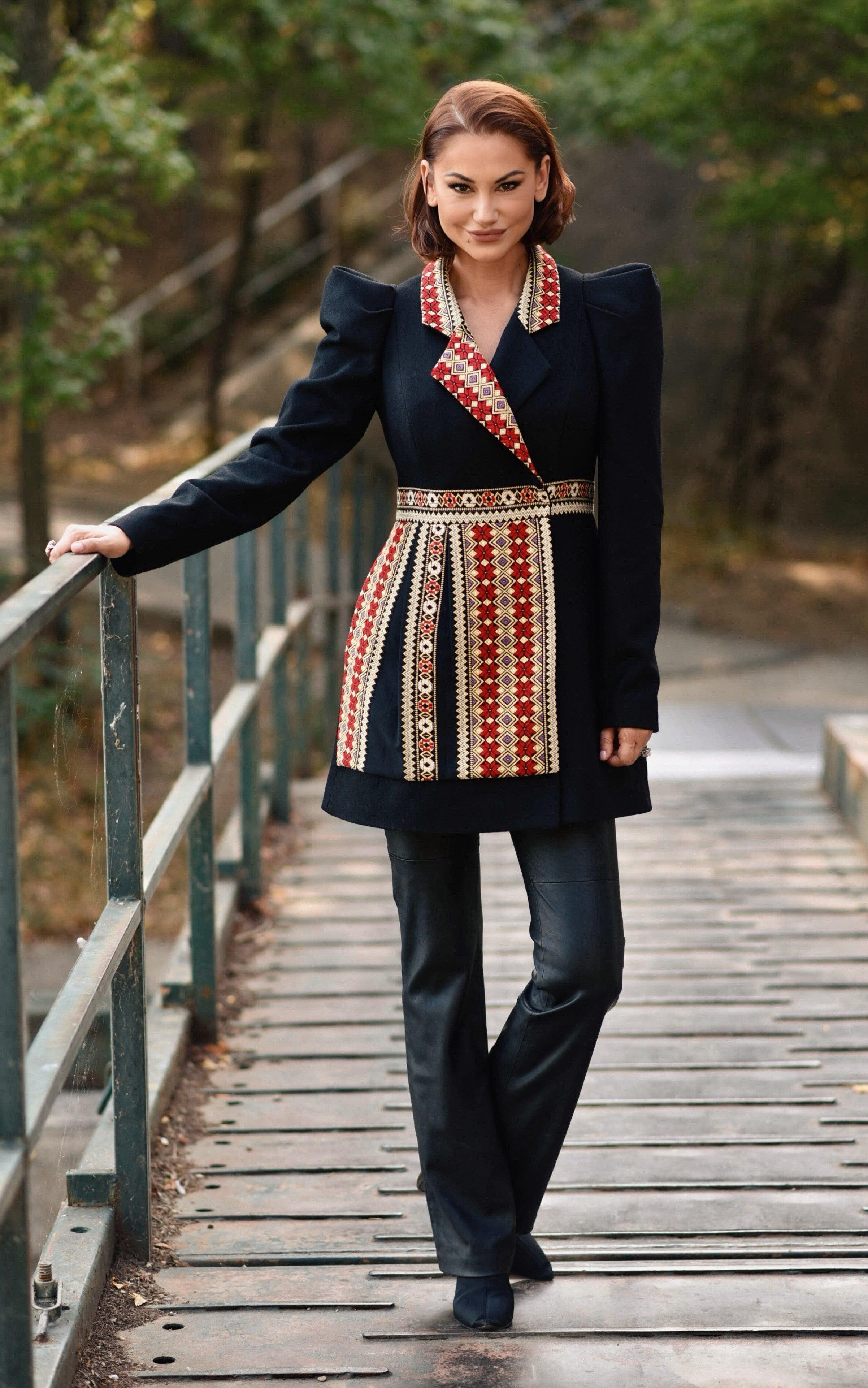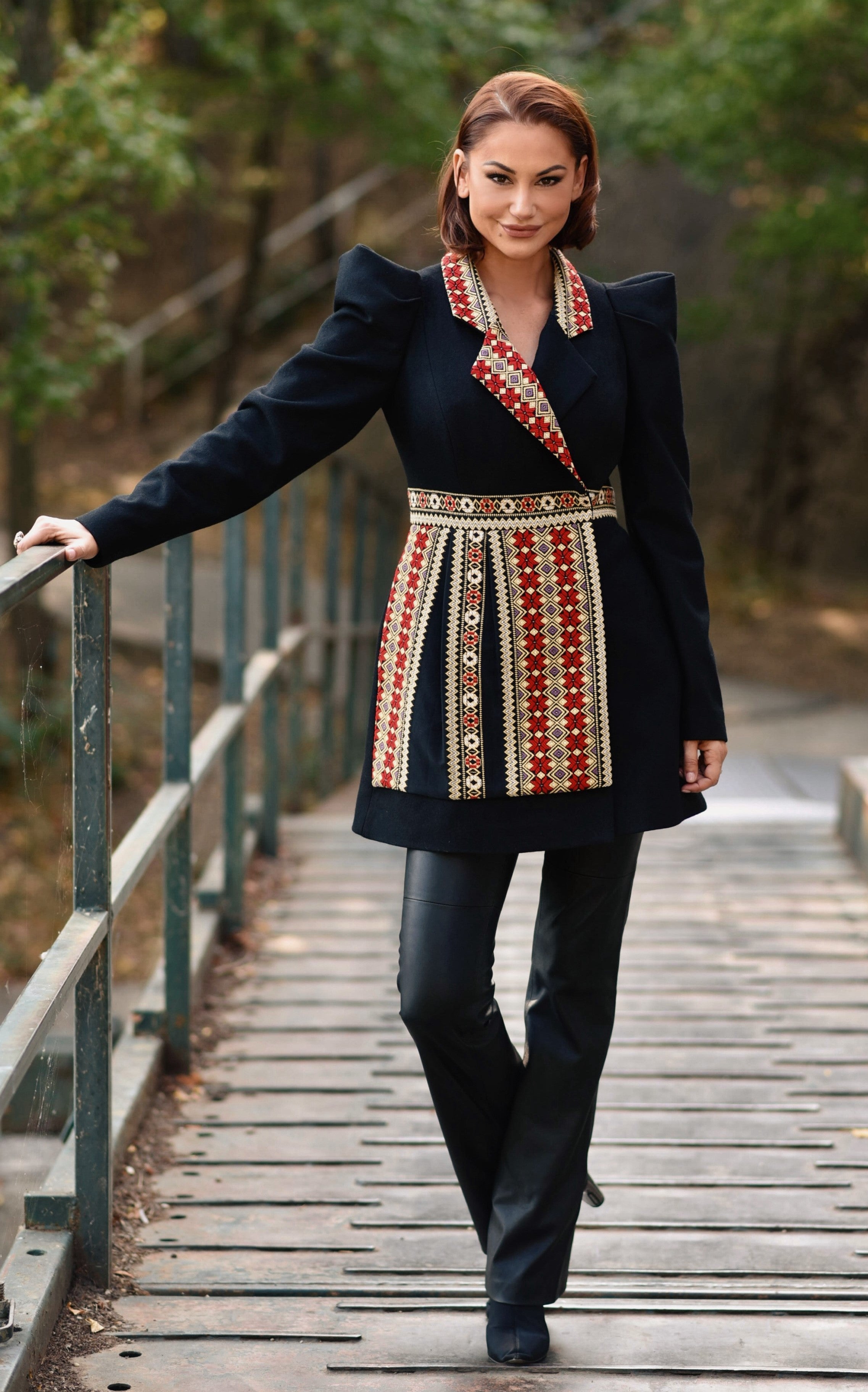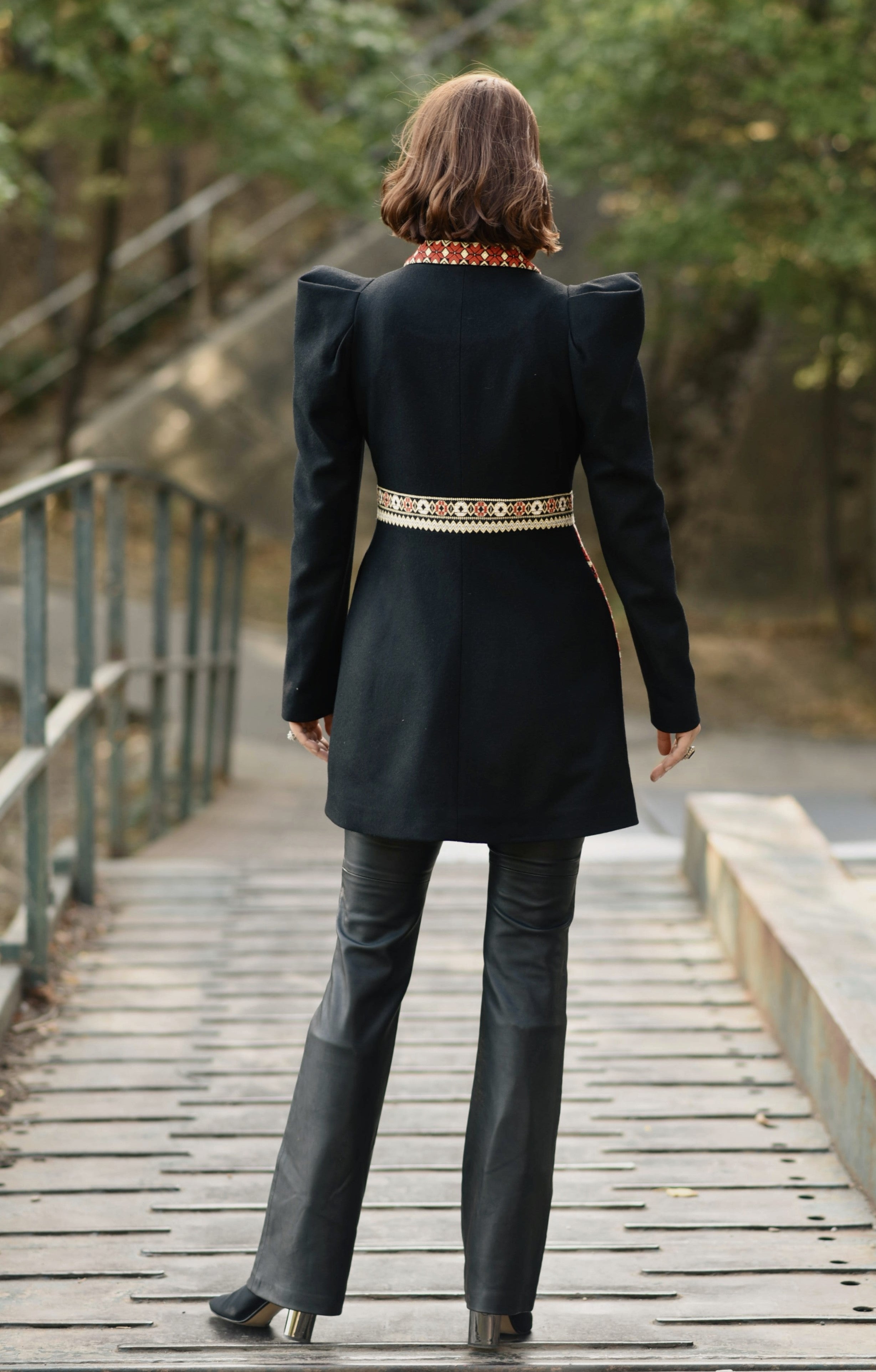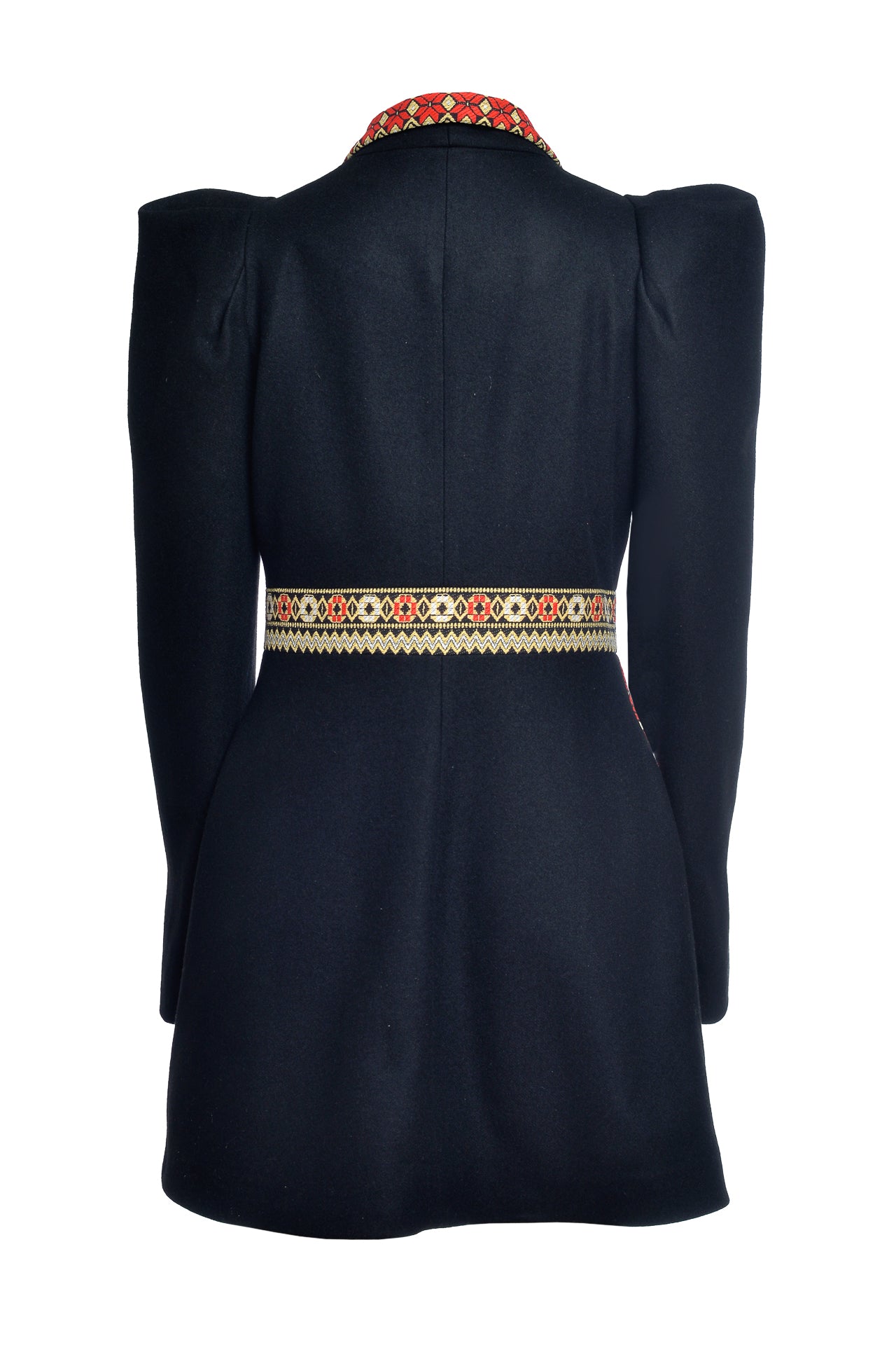 Pardesiul cu fotă este confecționat din stofa subțire din lână cu cașmir și jacquard etnic țesut cu motive tradiționale.