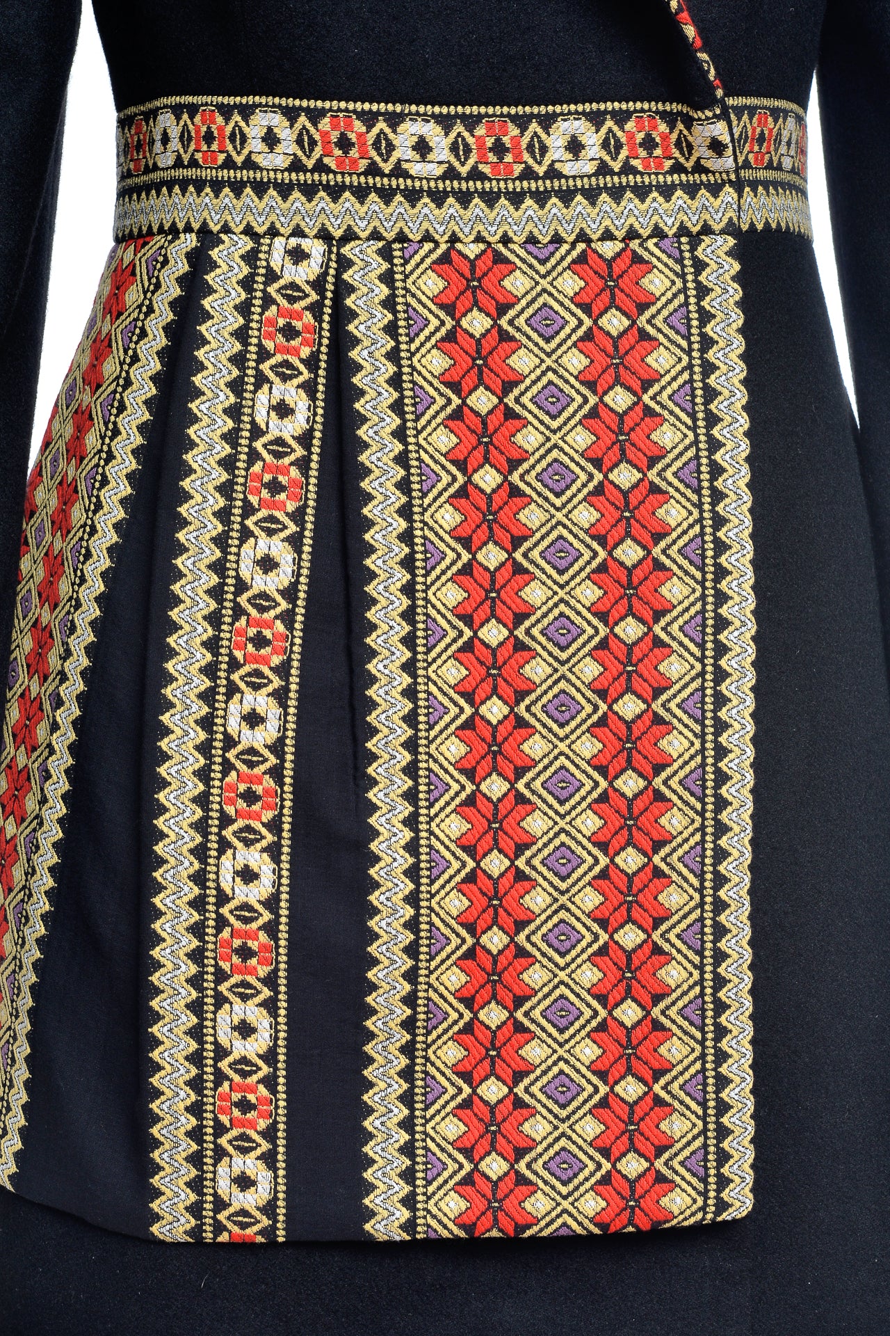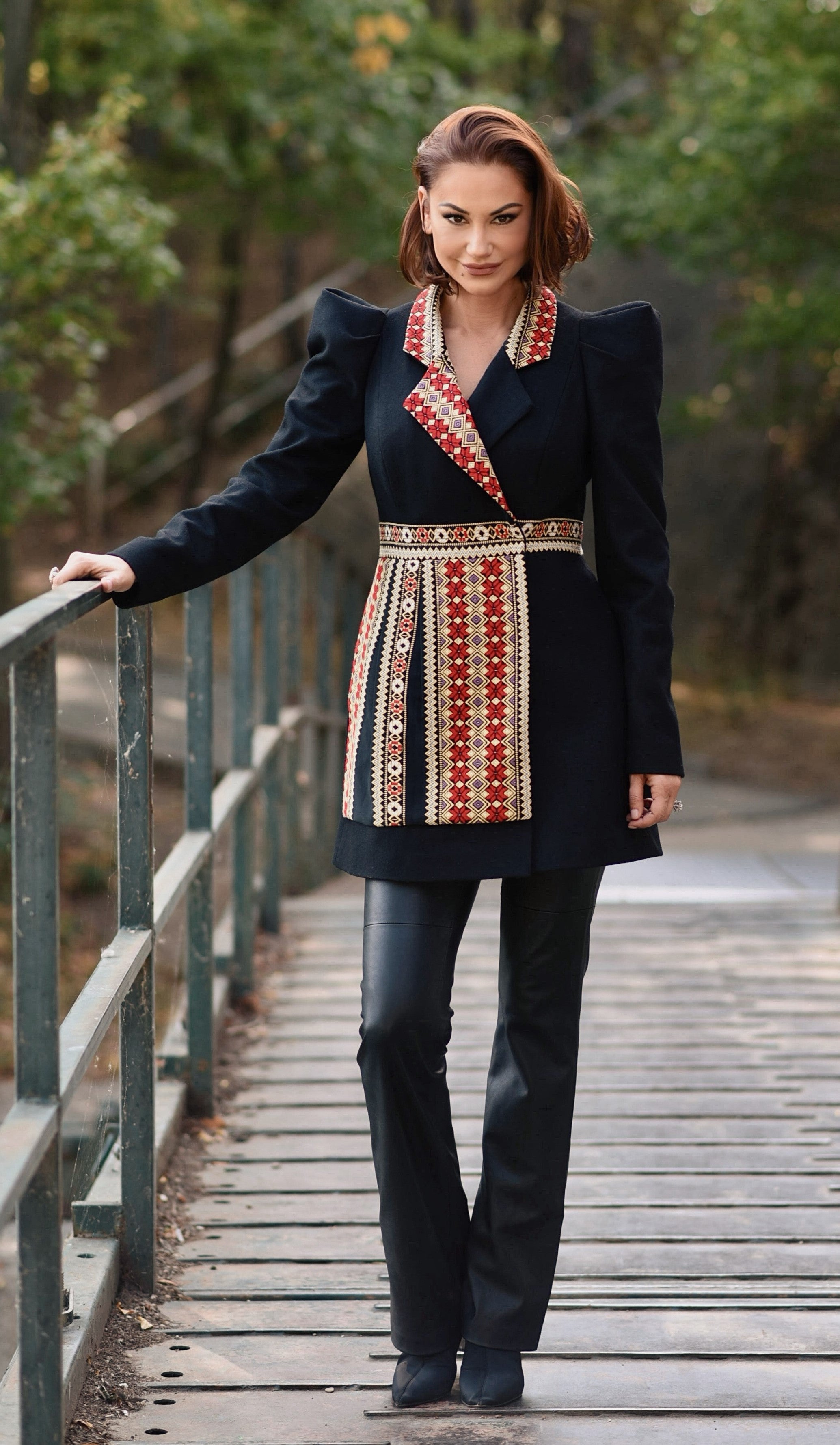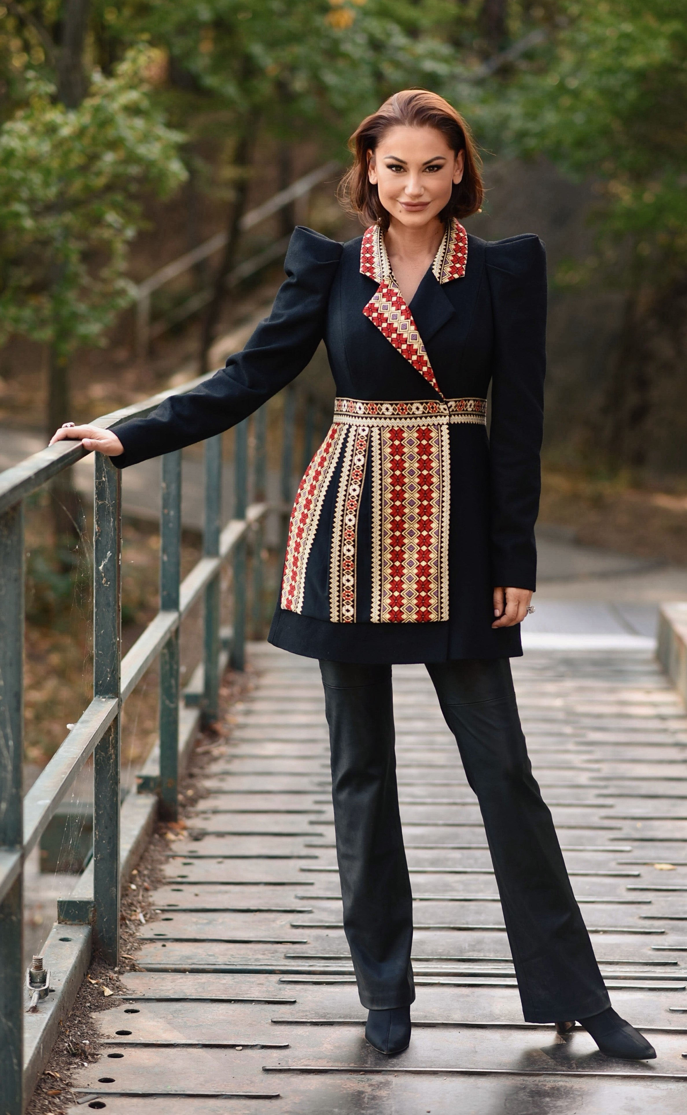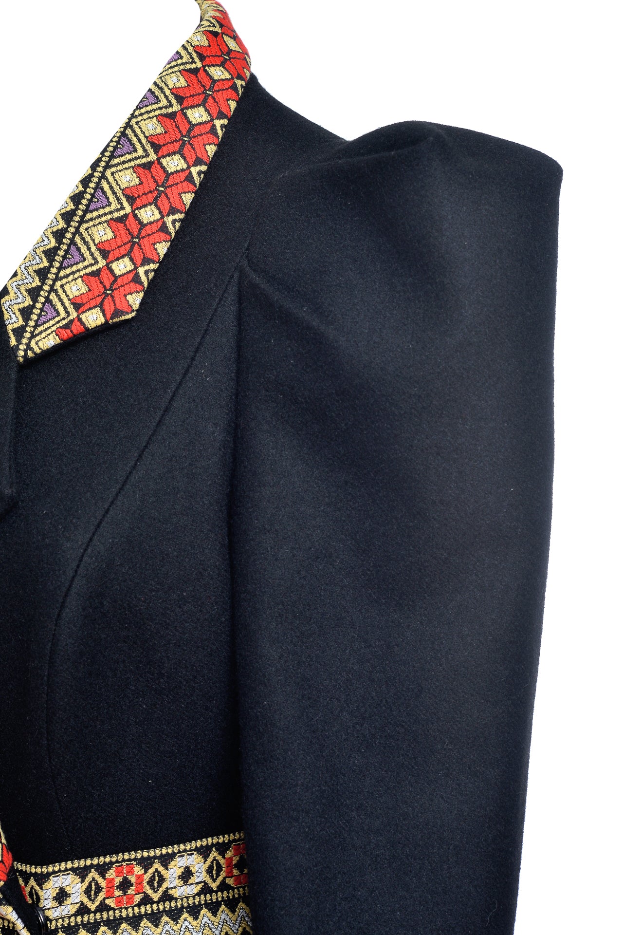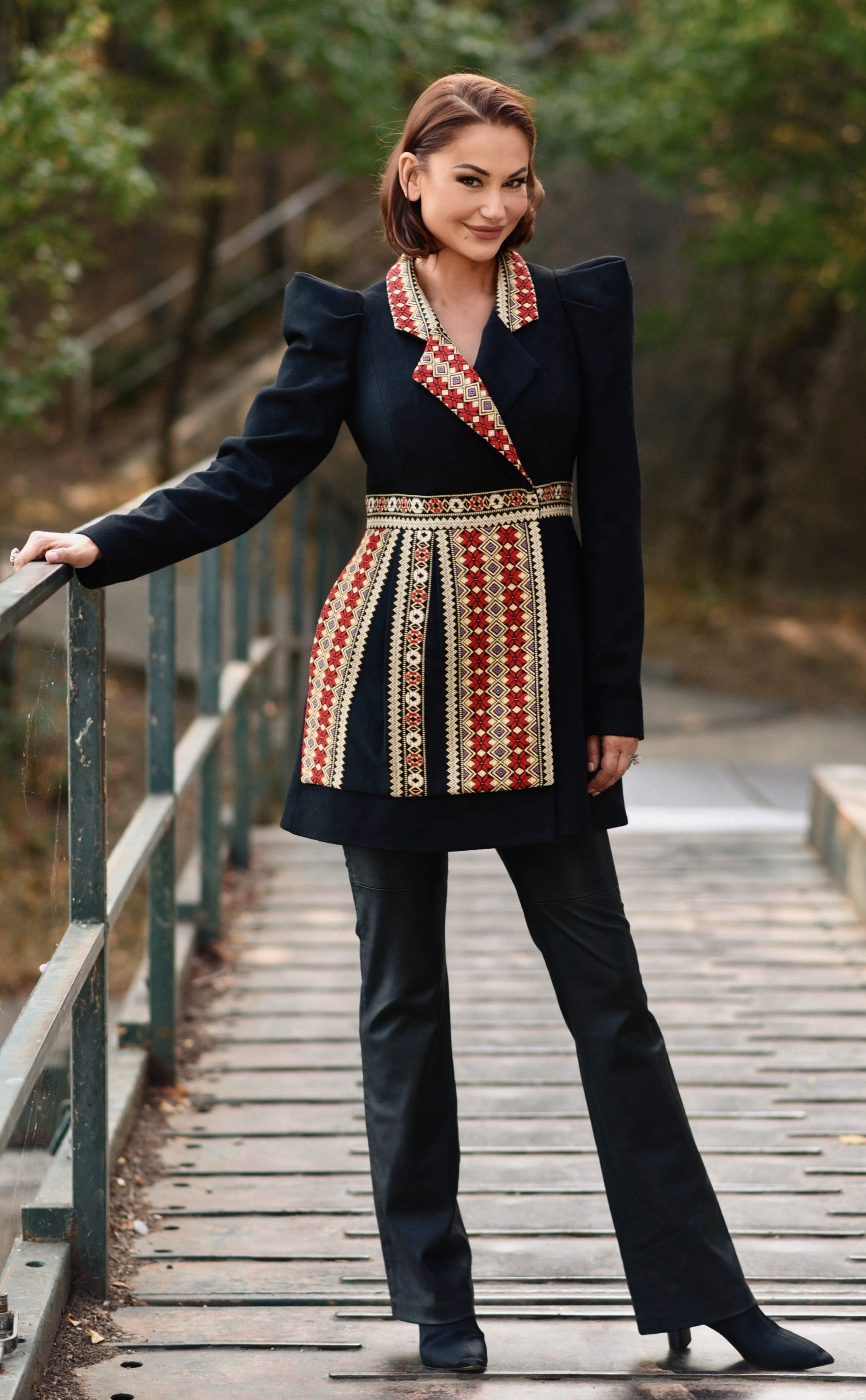 Pardesiul cu fotă este confecționat din stofa subțire din lână cu cașmir și jacquard etnic țesut cu motive tradiționale.