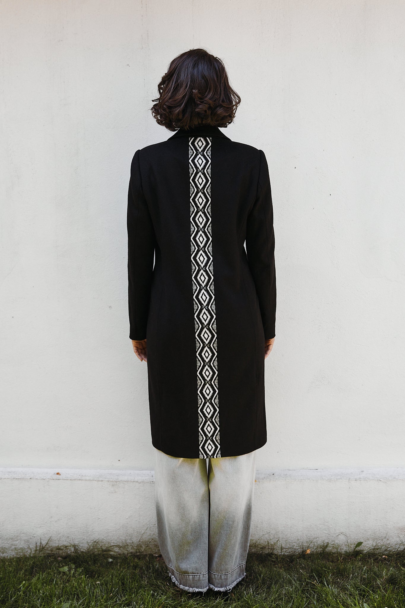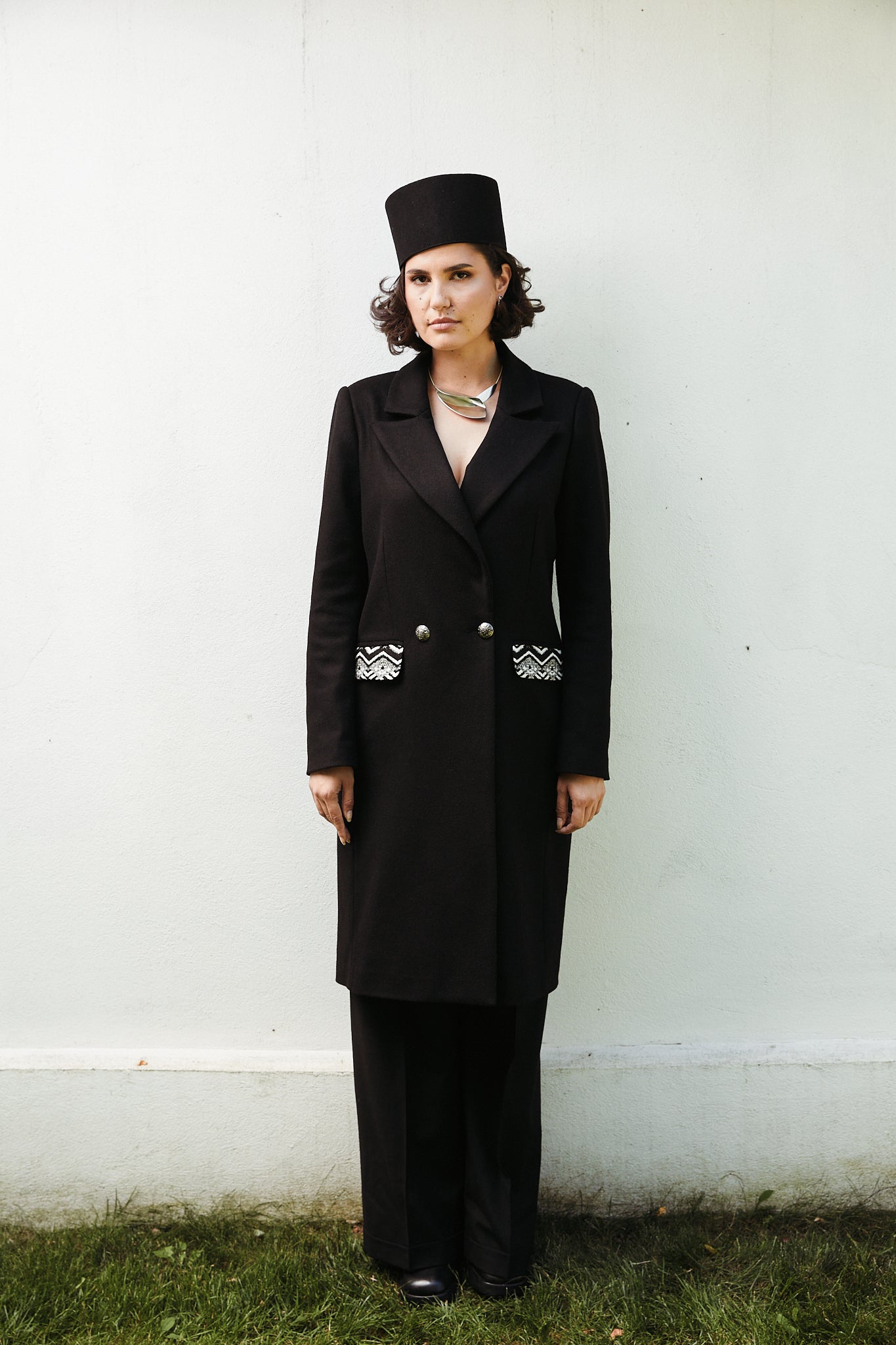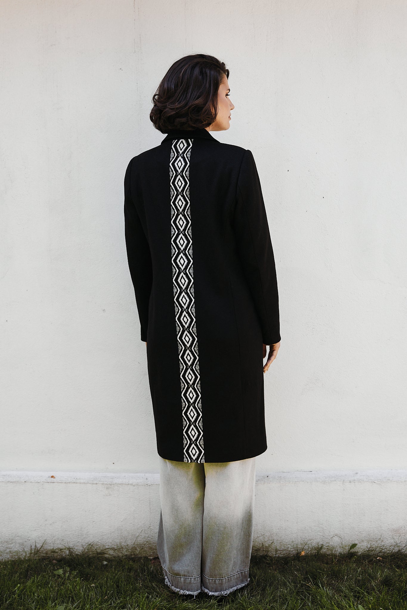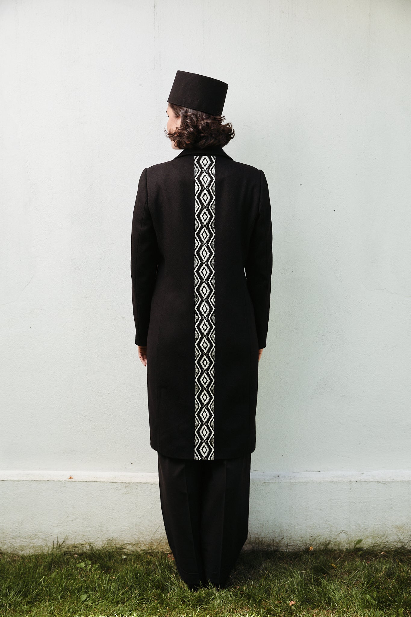 Pardesiul este înnobilat subtil cu jacquard etnic țesut cu motivul Coloana Infinitului.