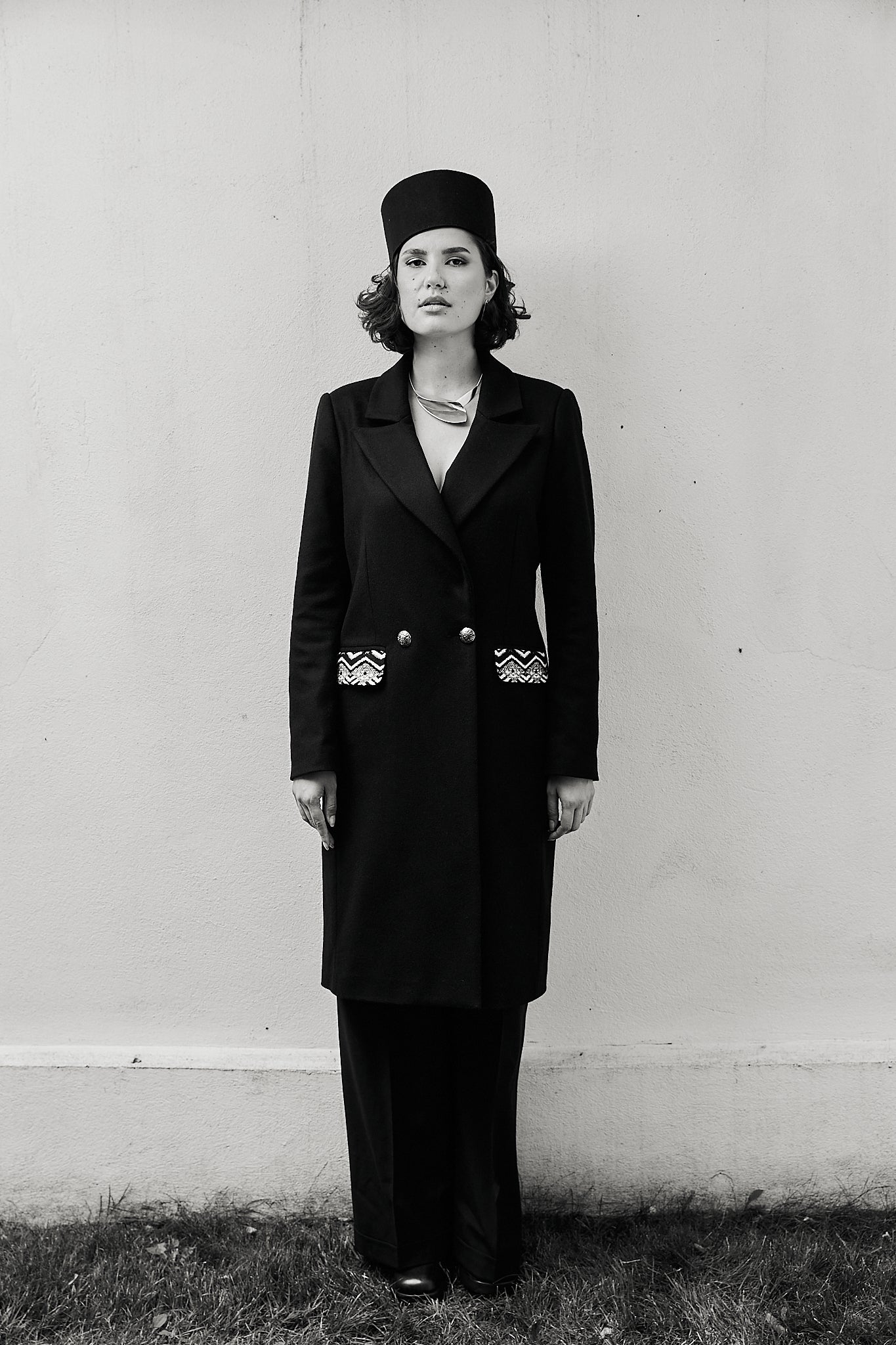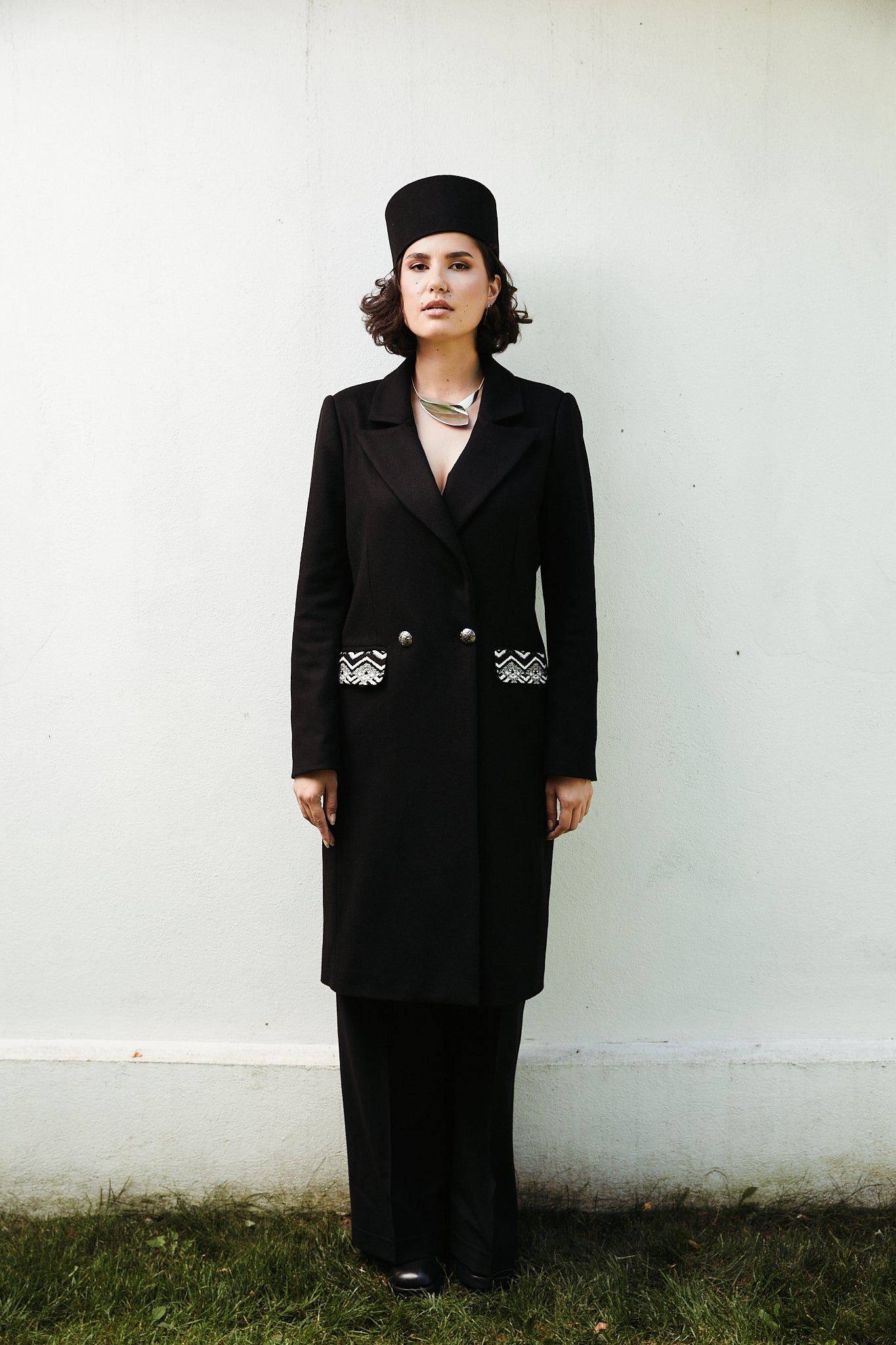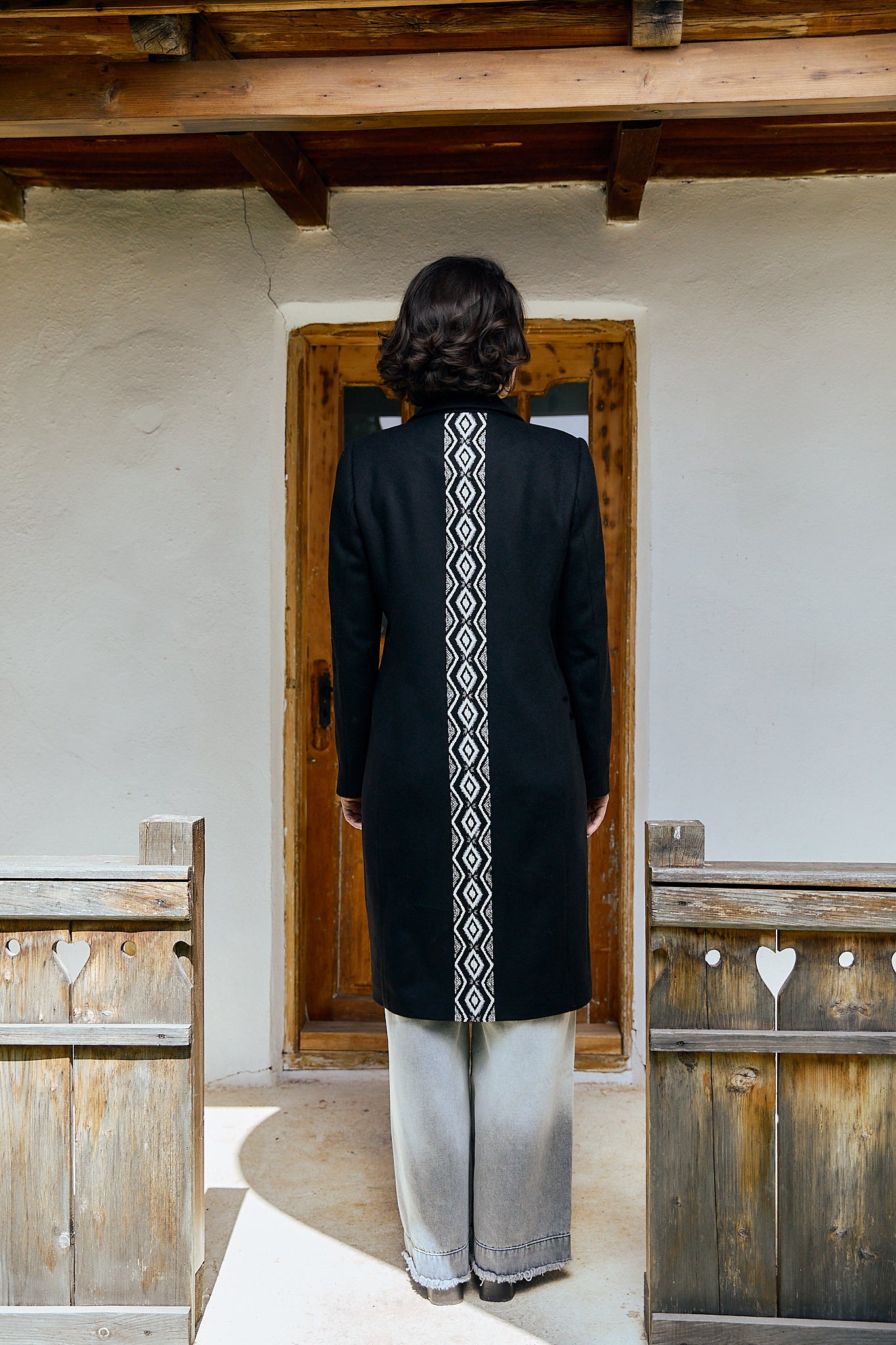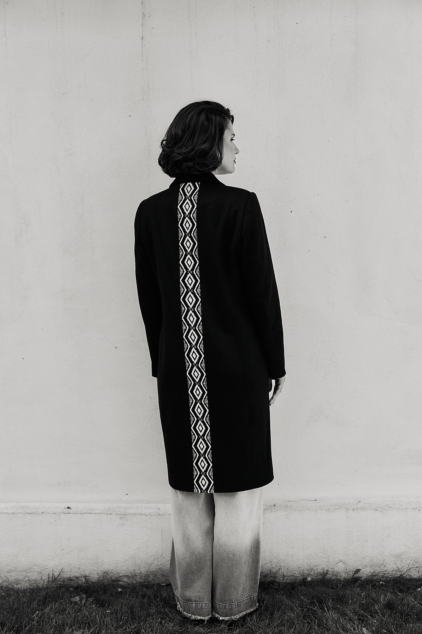 Pardesiul este înnobilat subtil cu jacquard etnic țesut cu motivul Coloana Infinitului.