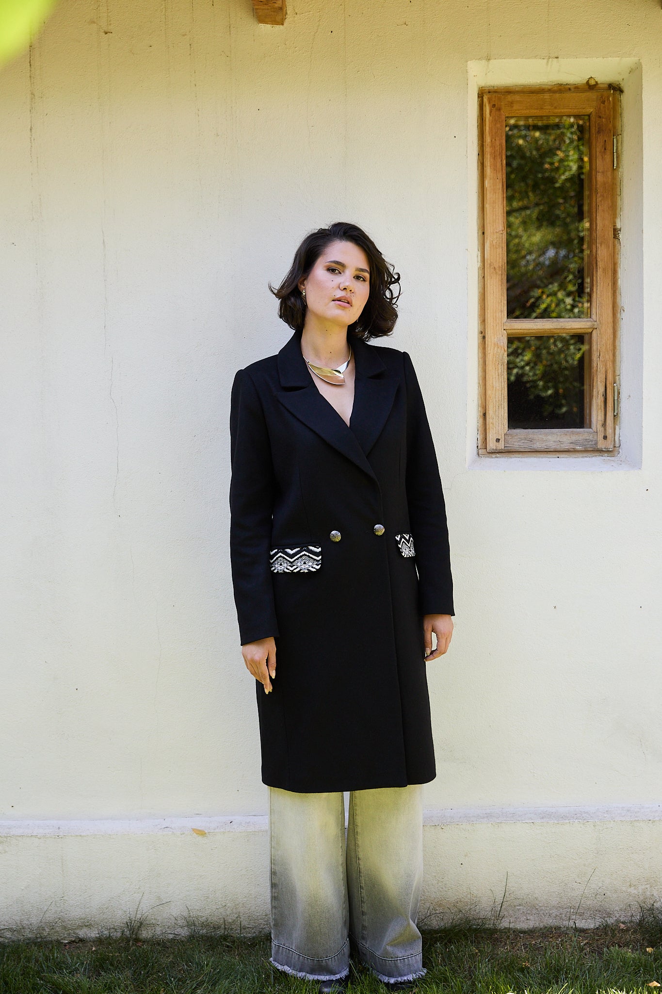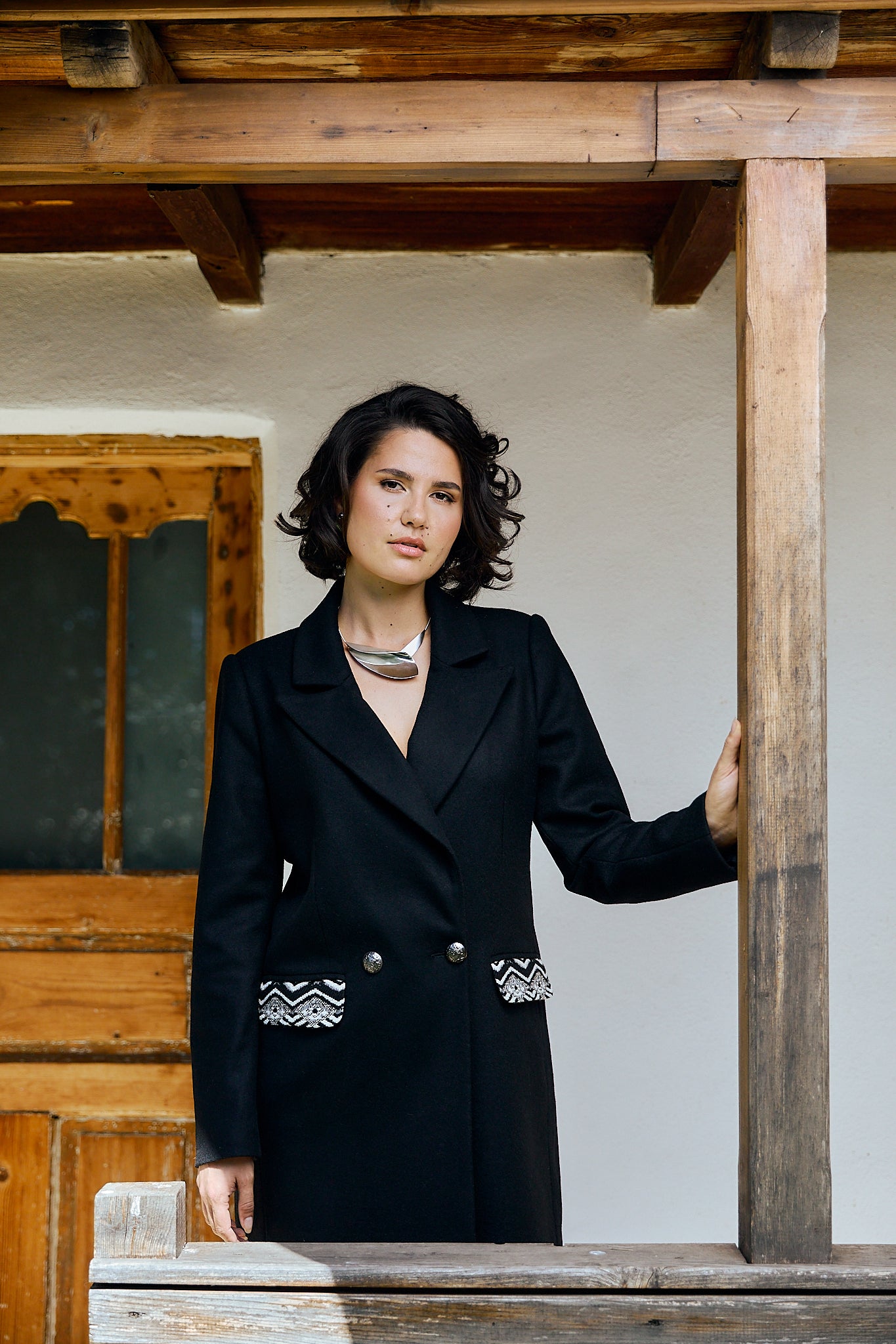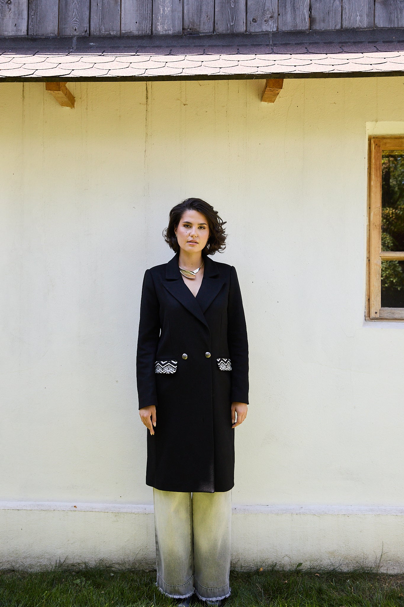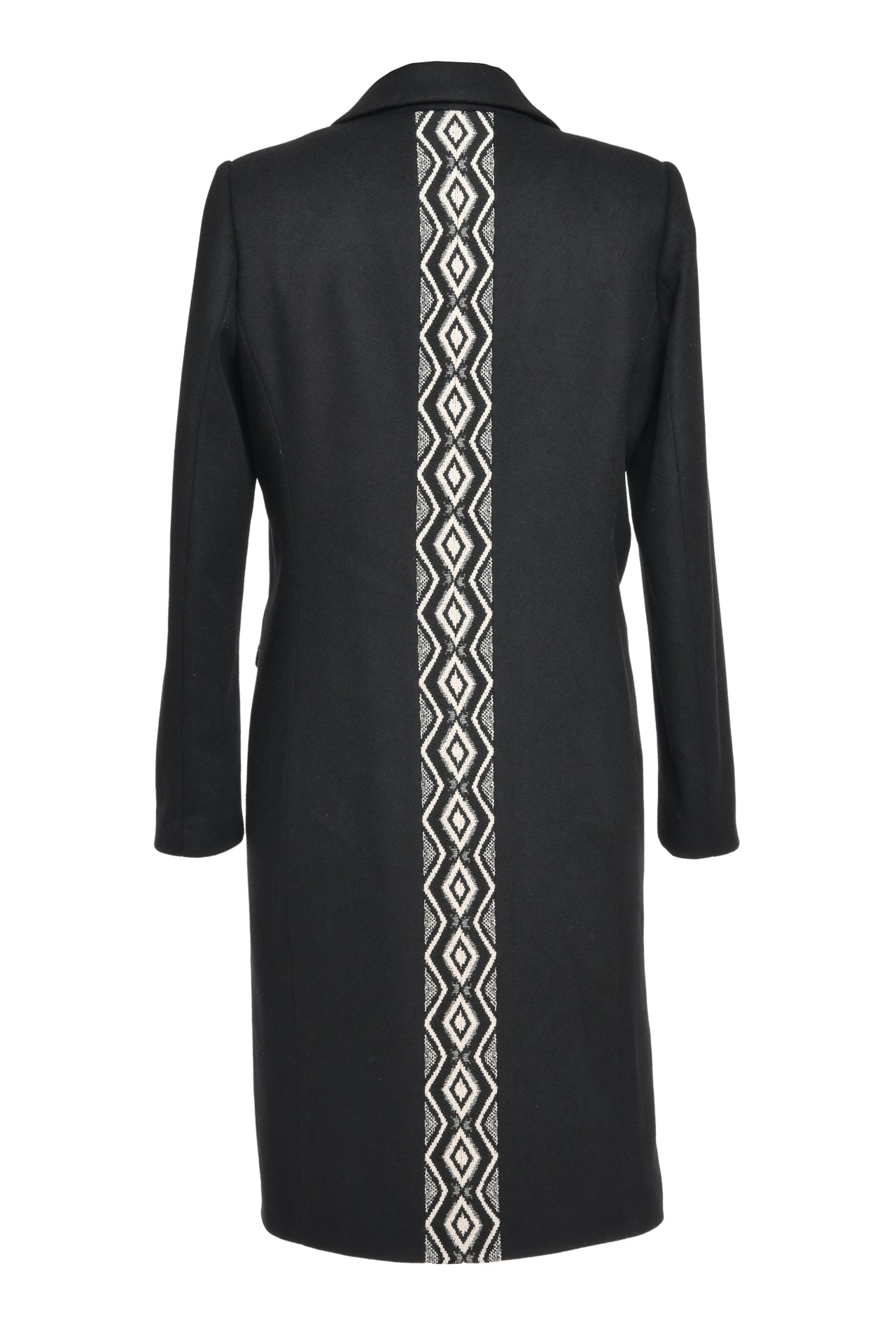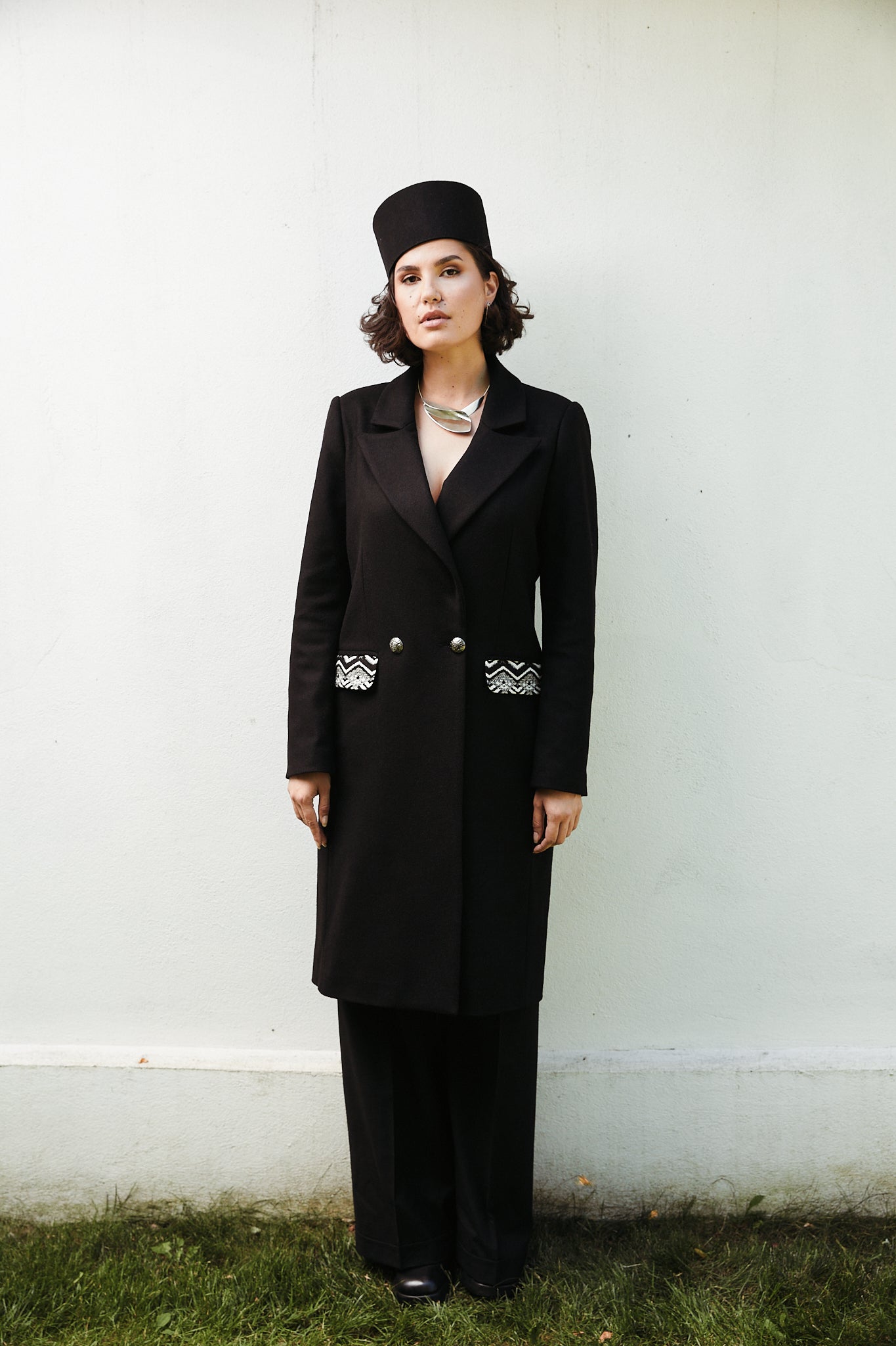 Pardesiul este înnobilat subtil cu jacquard etnic țesut cu motivul Coloana Infinitului.