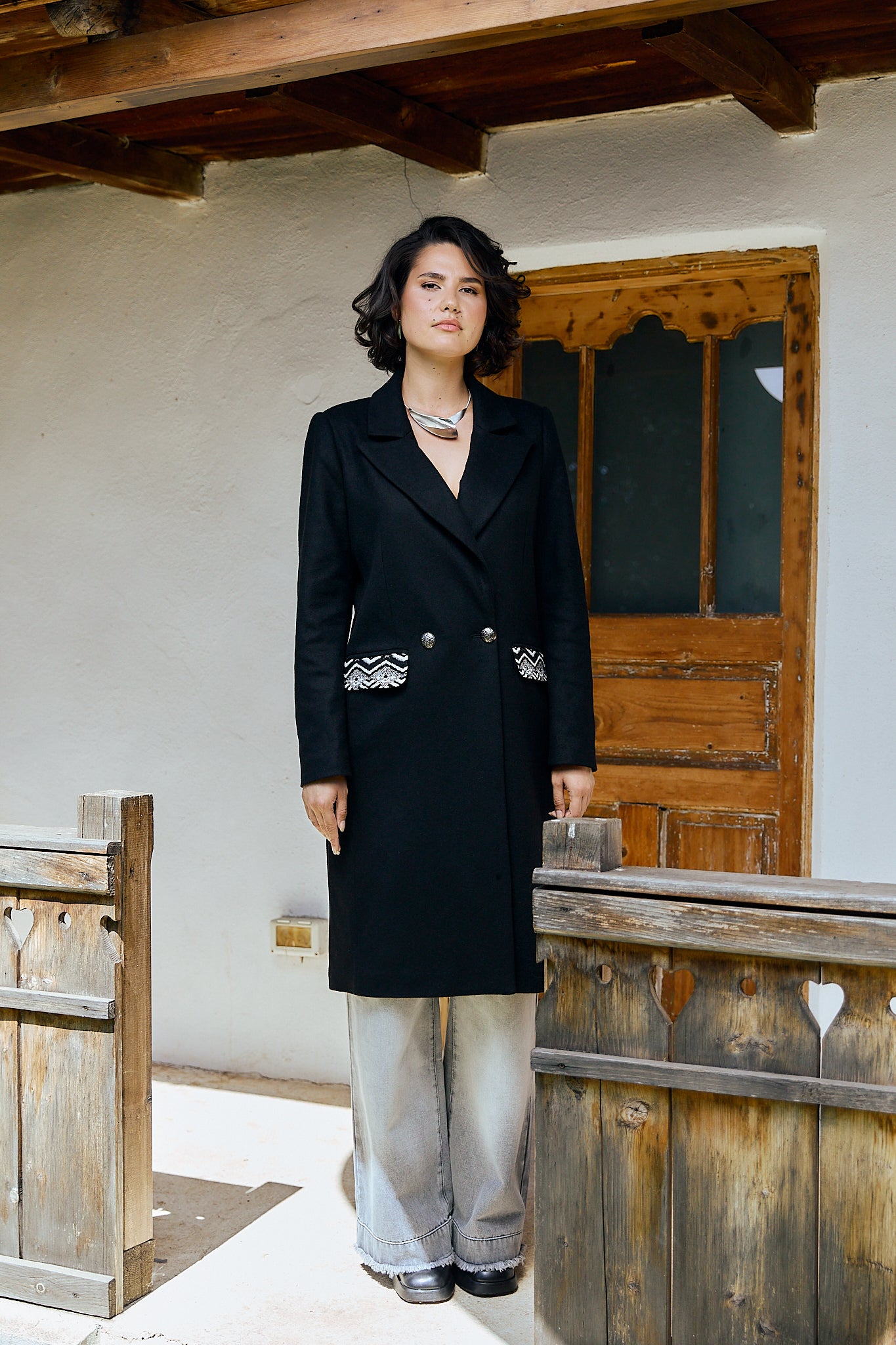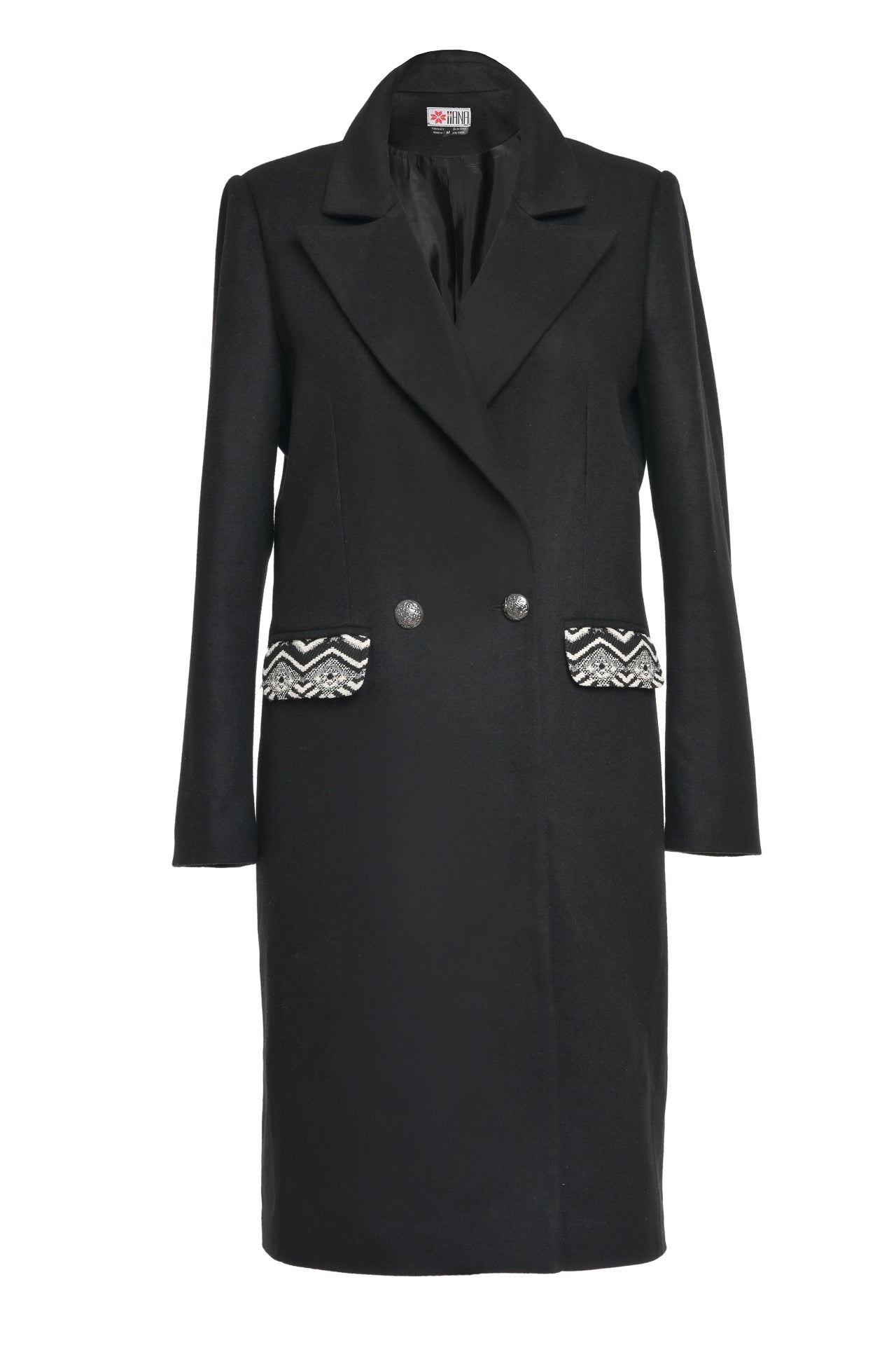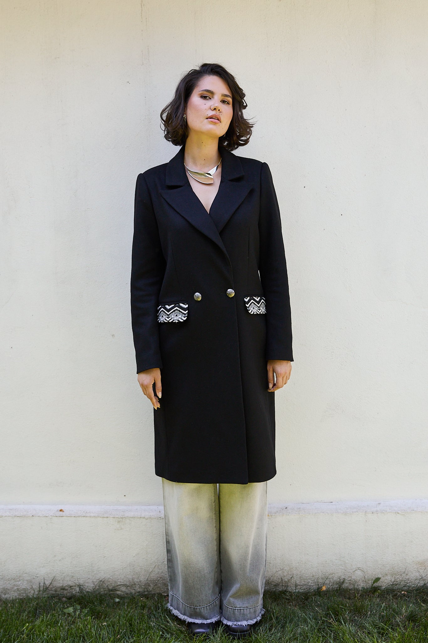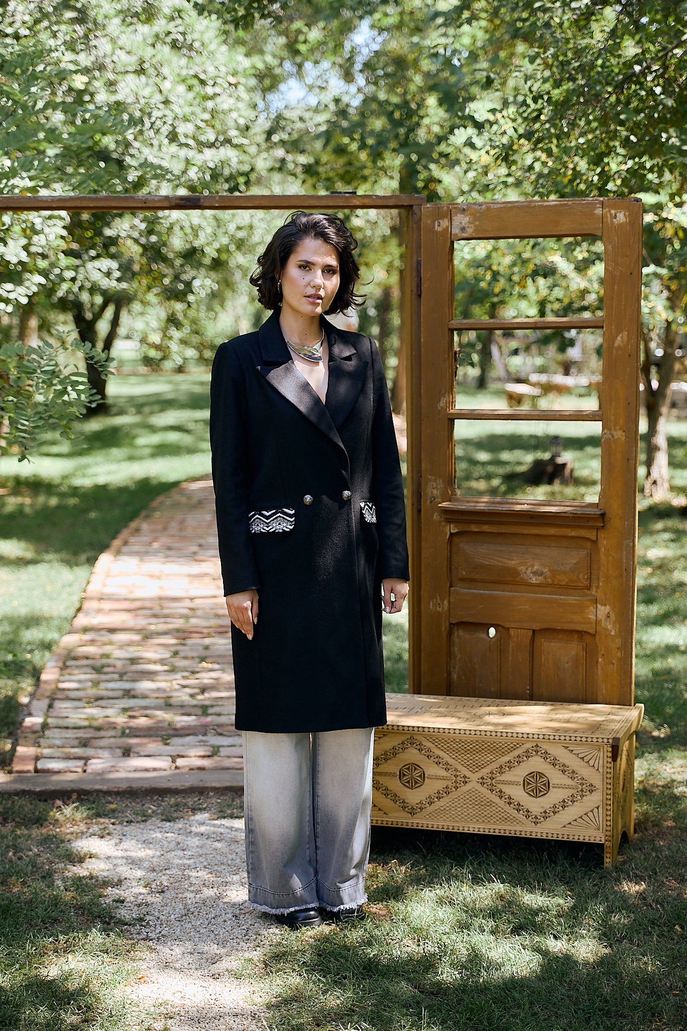 Pardesiul este înnobilat subtil cu jacquard etnic țesut cu motivul Coloana Infinitului.