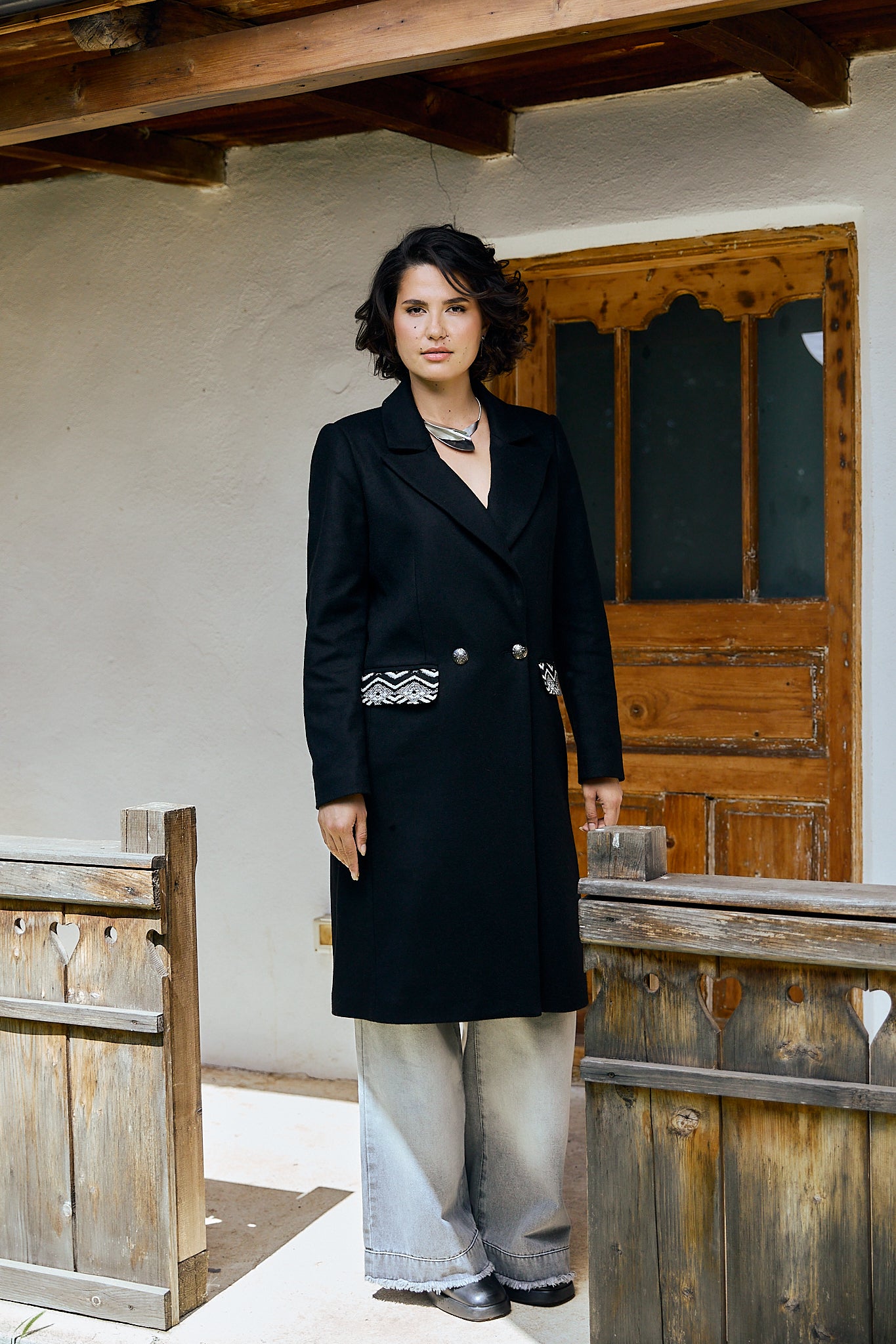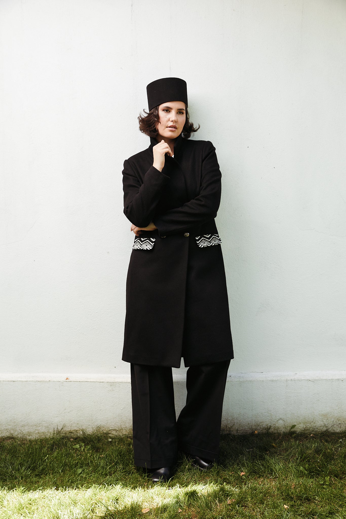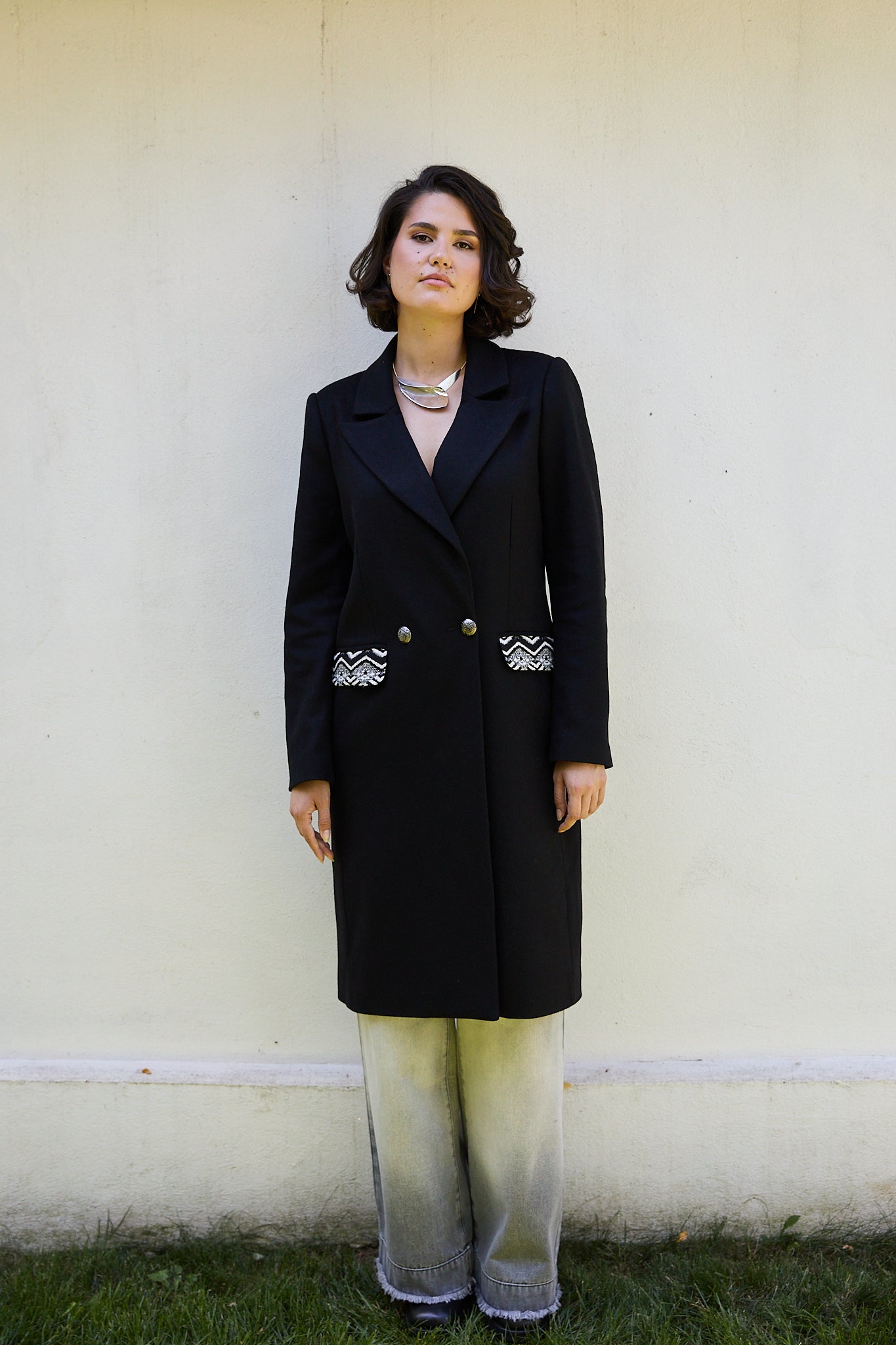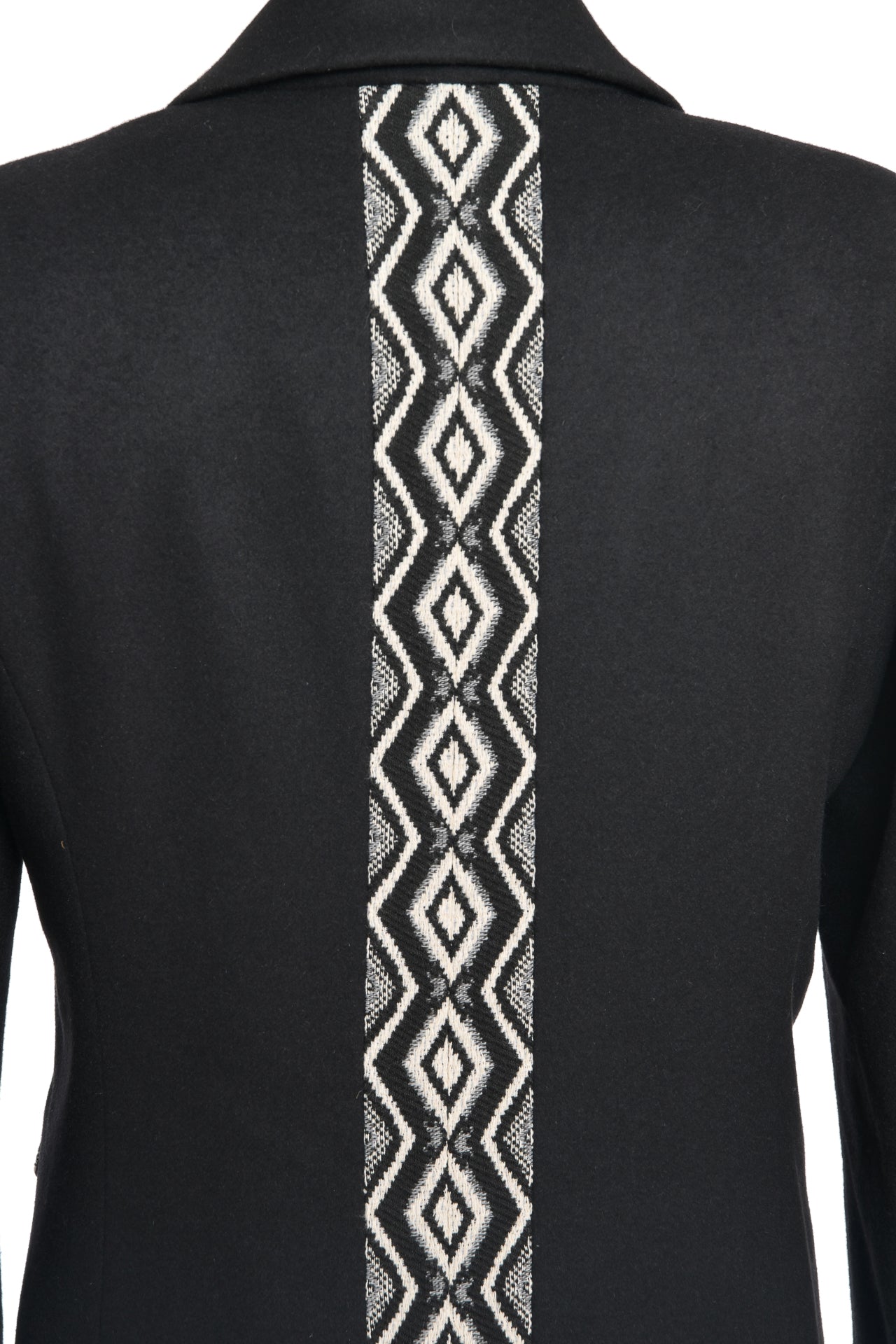 Pardesiul este înnobilat subtil cu jacquard etnic țesut cu motivul Coloana Infinitului.