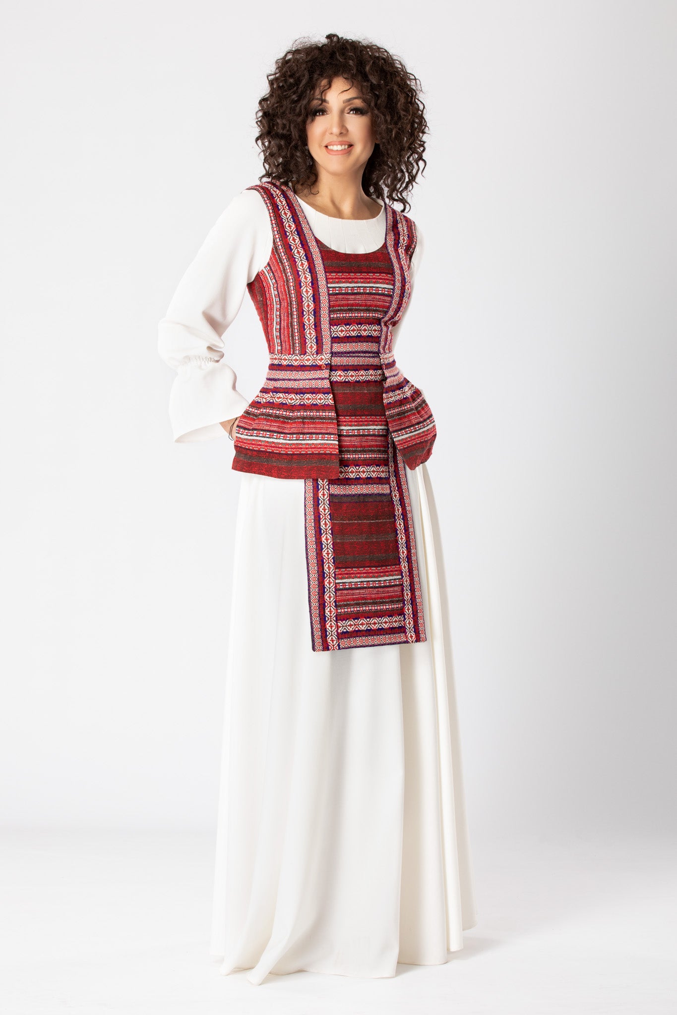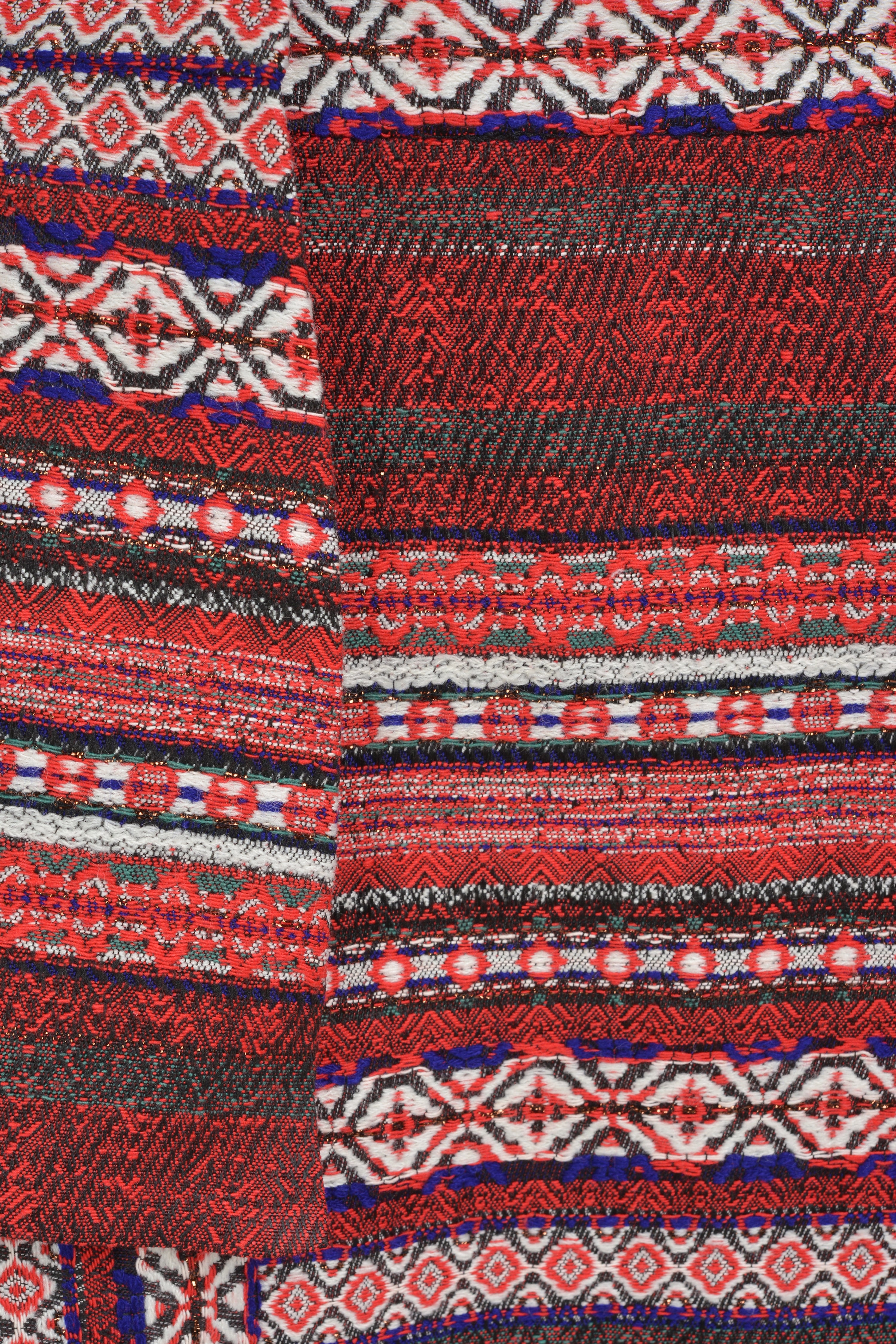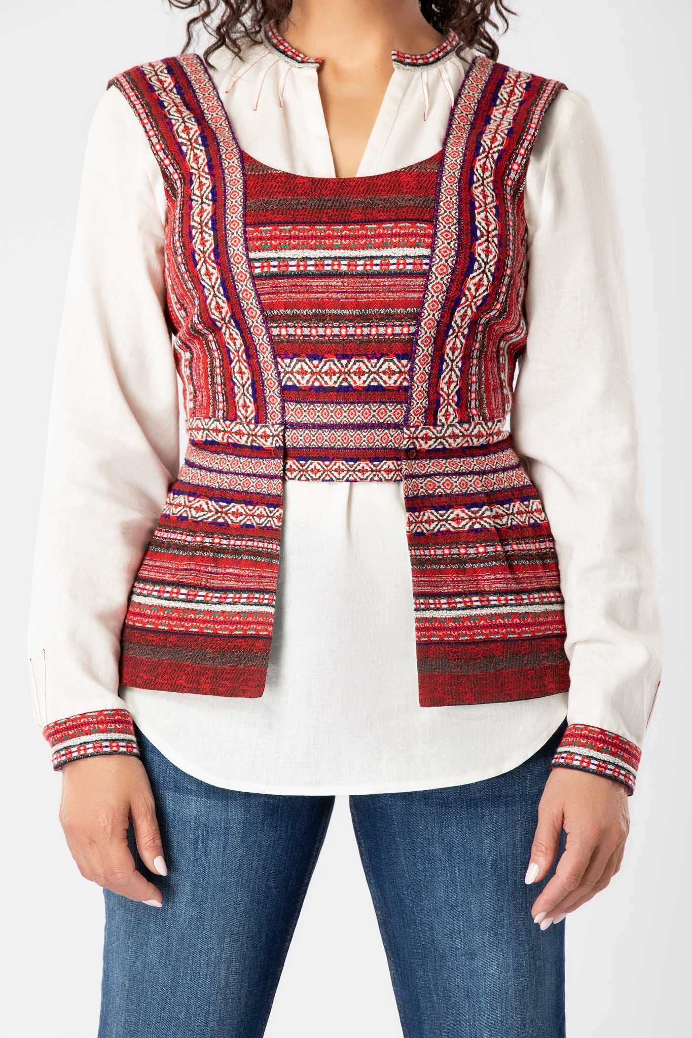 din jacquard etnic, țesut cu motive florale și geometrice. Sunt căptușite, pieptarul este croit din zece piese atent îmbinate