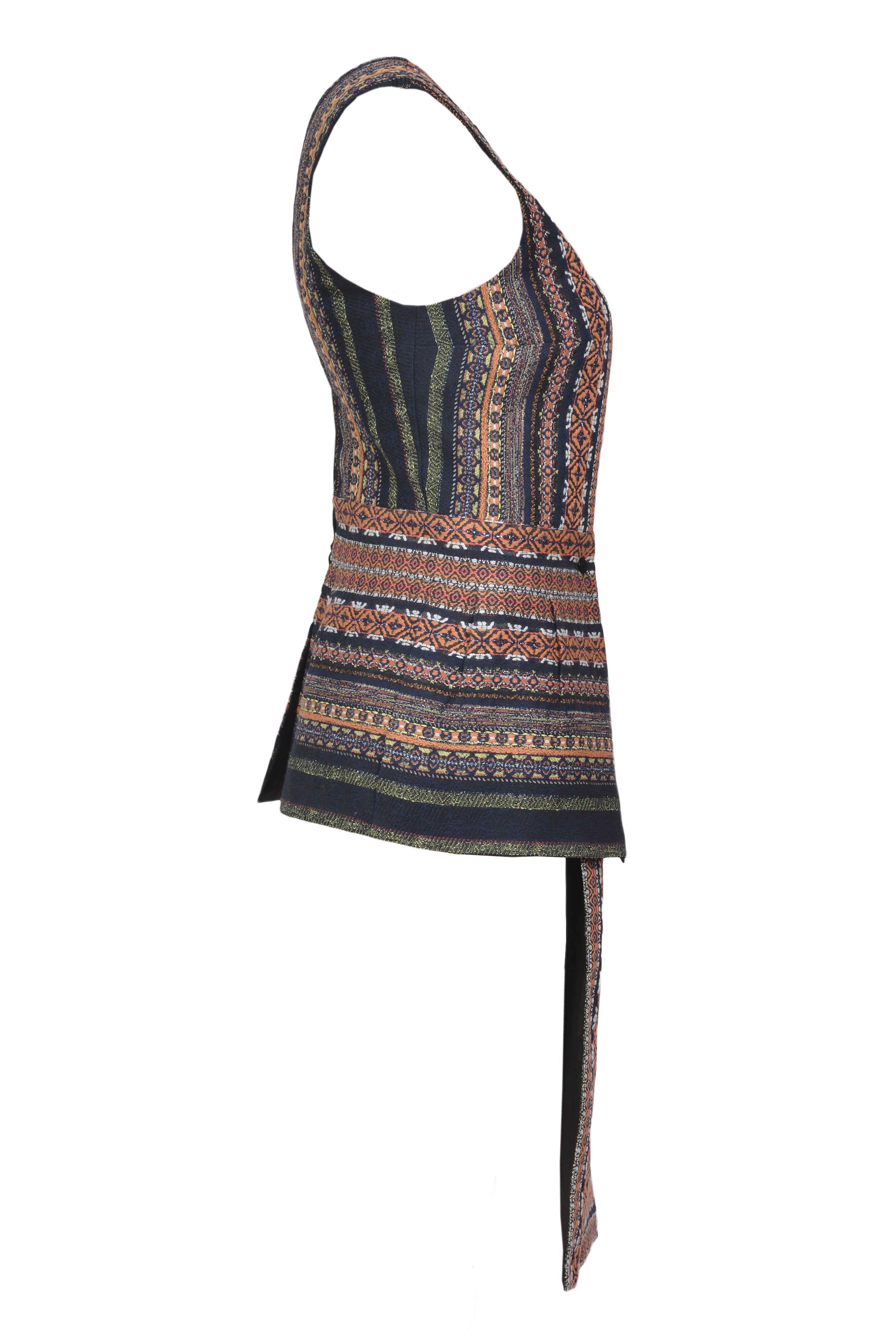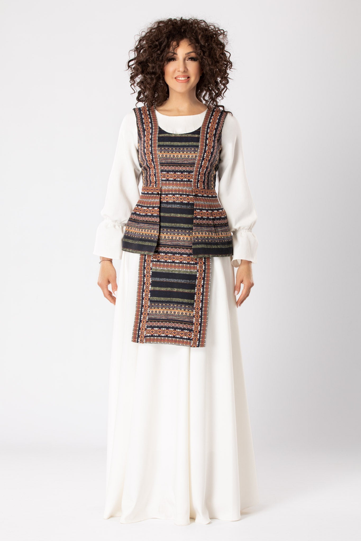 din jacquard etnic, țesut cu motive florale și geometrice. Sunt căptușite, pieptarul este croit din zece piese atent îmbinate