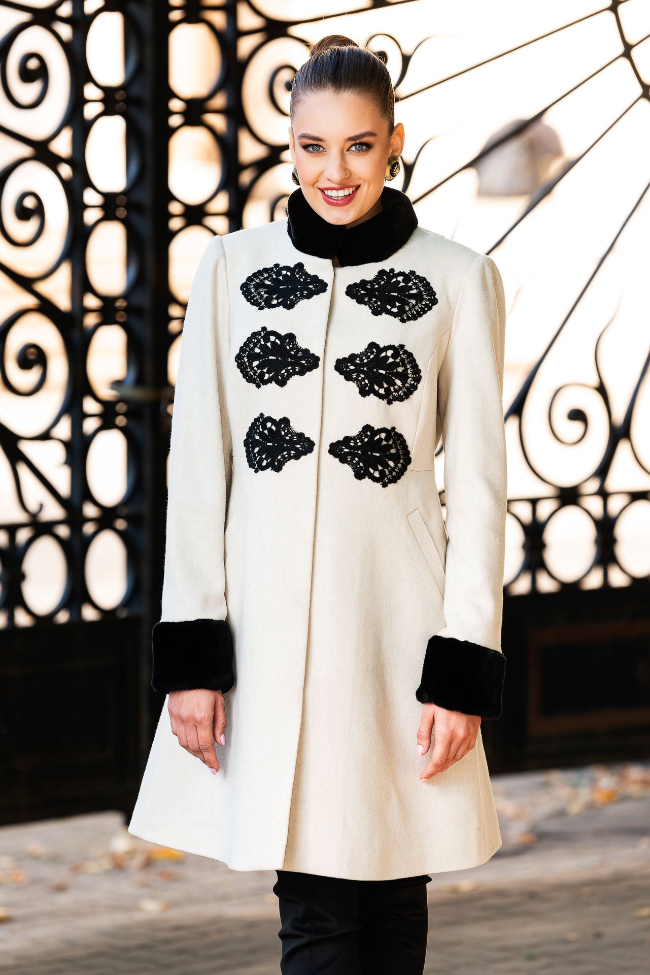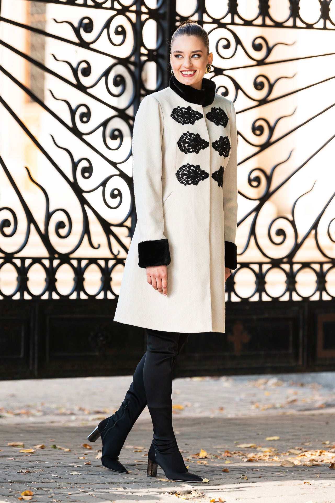 Redingota Crem cu Găitane are o croială clasică, ușor