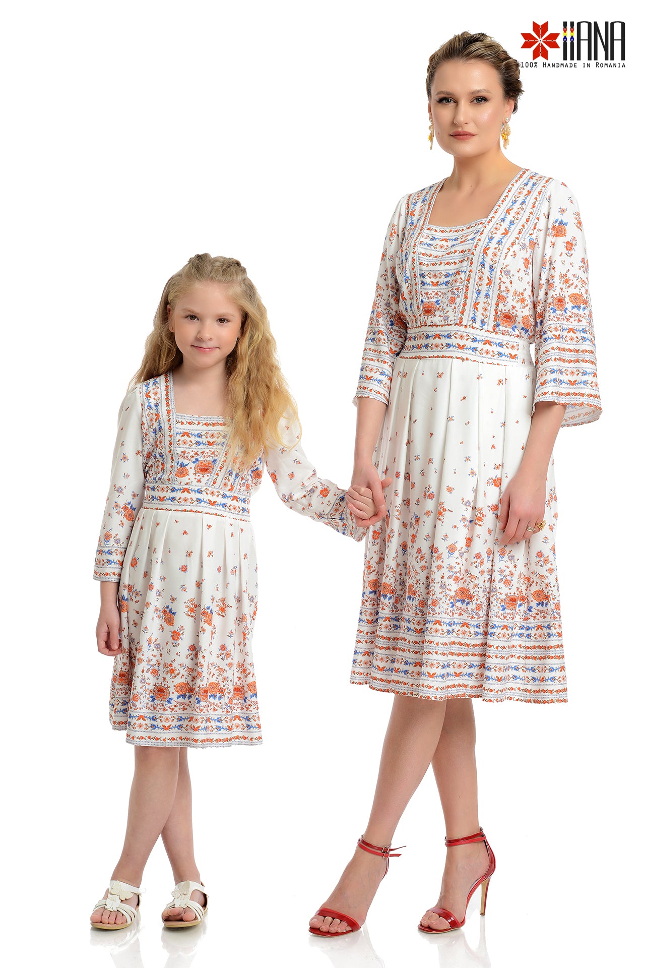 Rochița Fete Albă Zora cu motive populare florare este o piesă modernă, comodă și veselă.