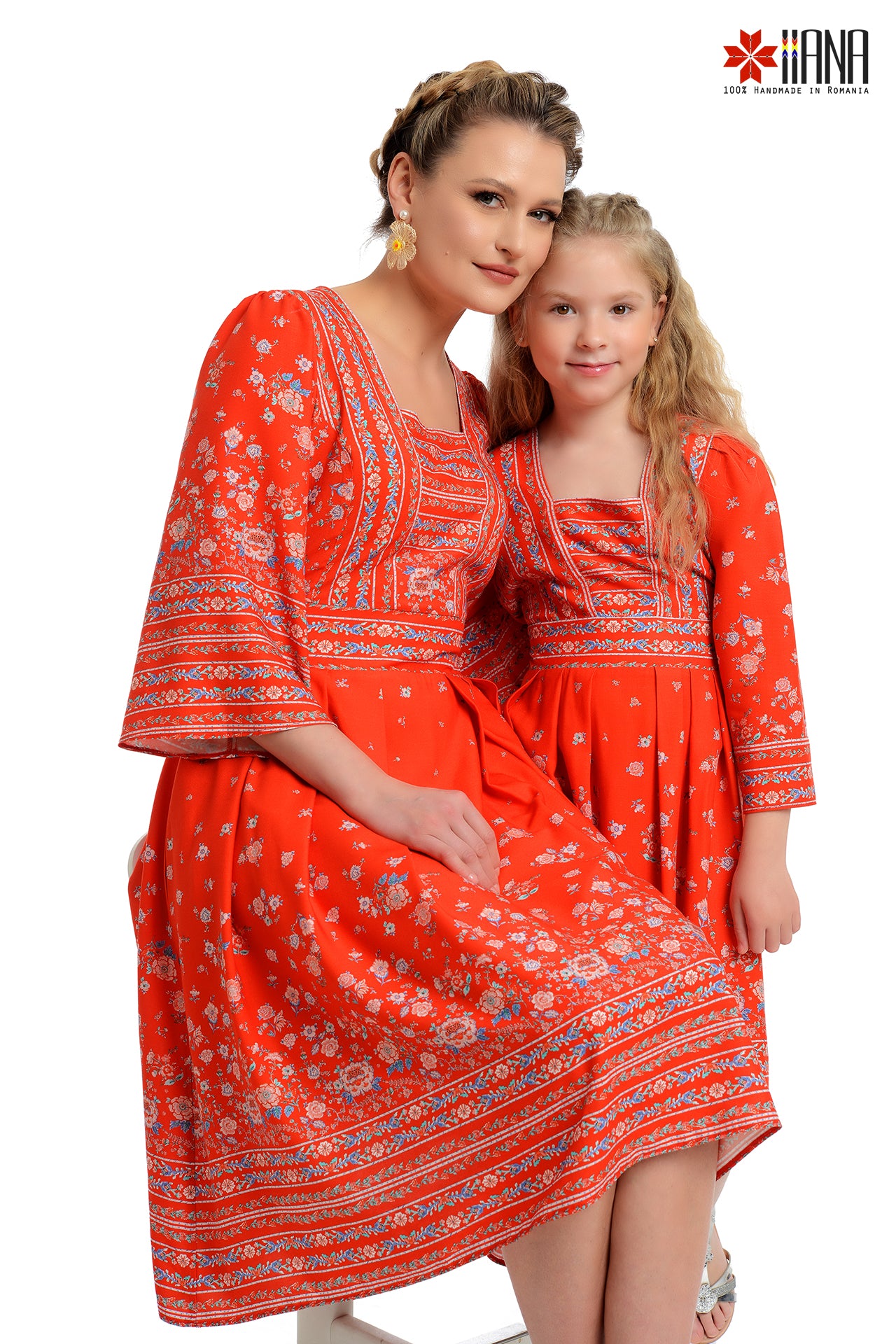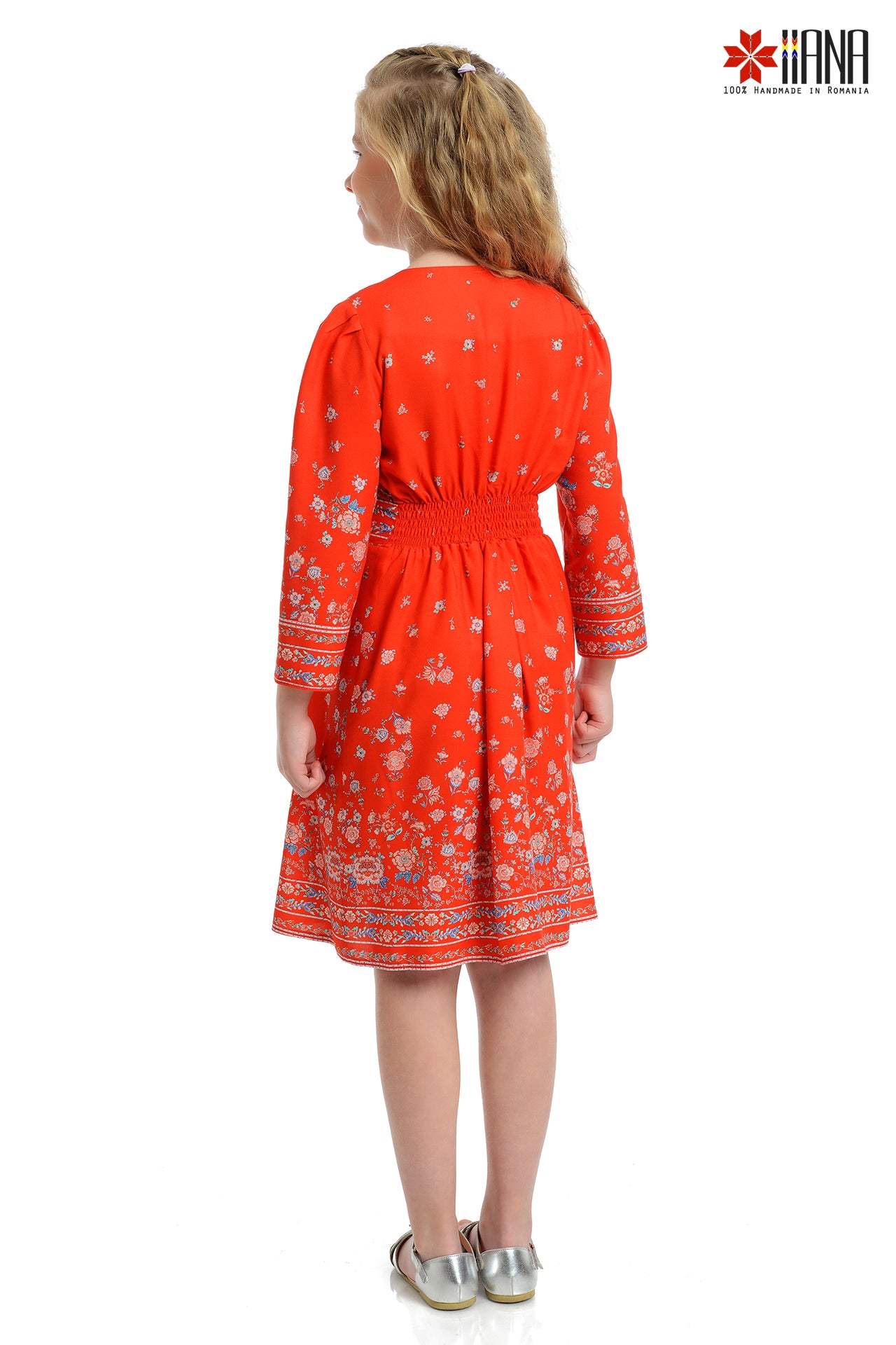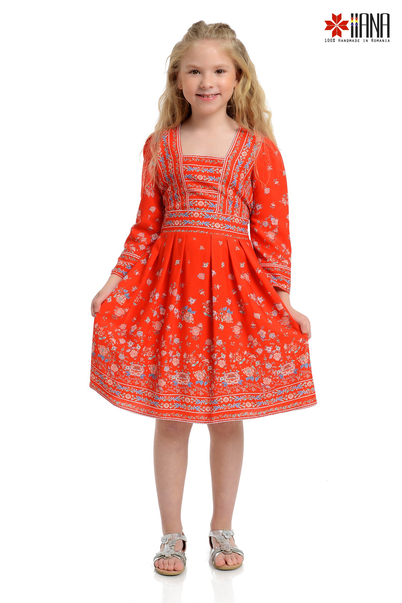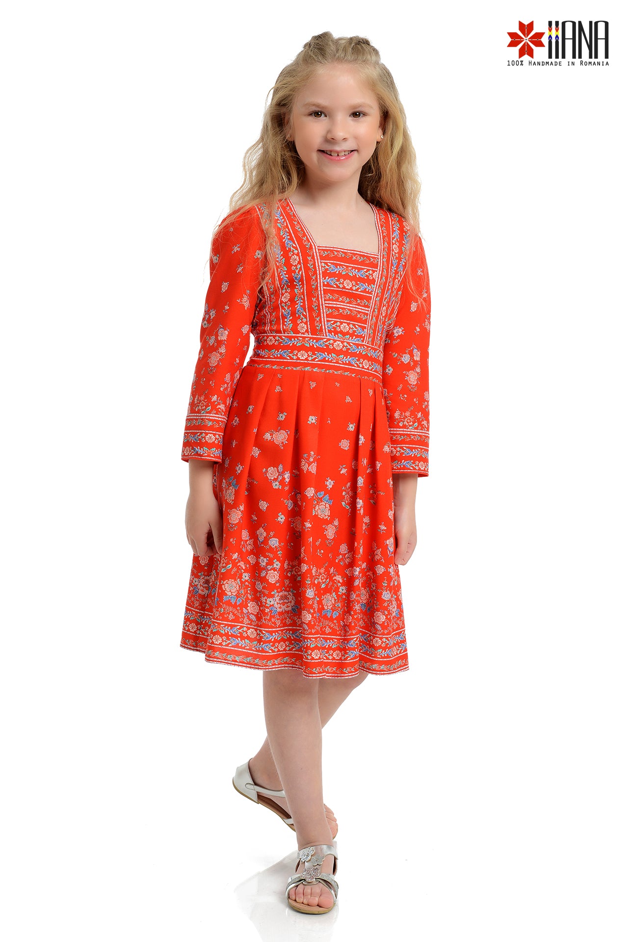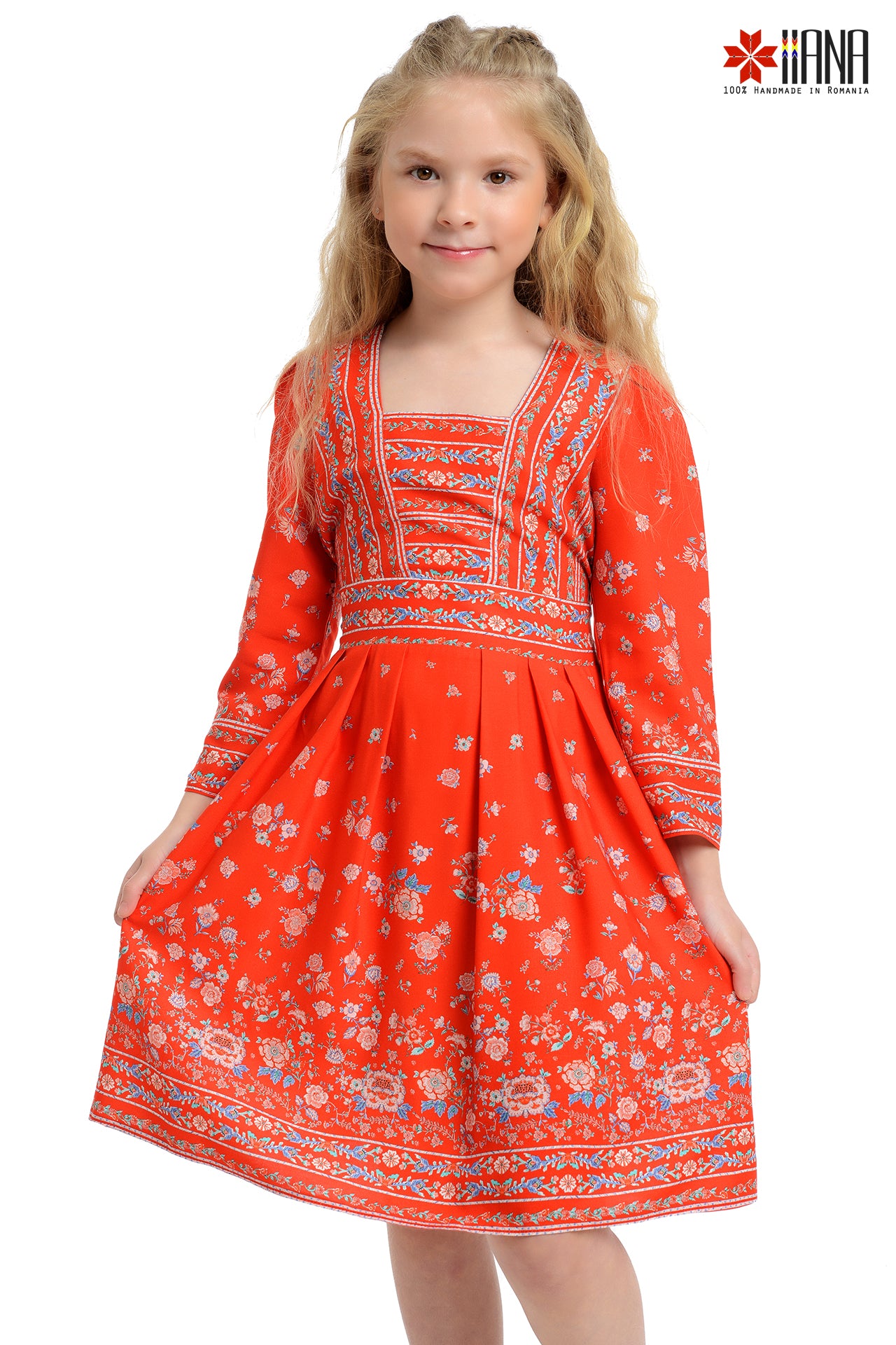 Rochita traditionala fetite Roșie Zora cu motive populare florare 8-15 ani este confecționtă din vâscoză premium, imprimată cu motive florale și geometrice.