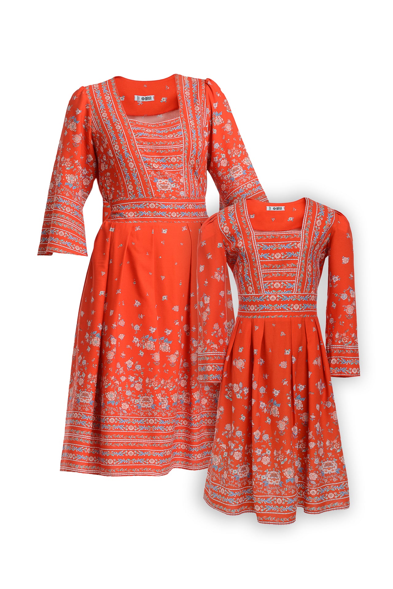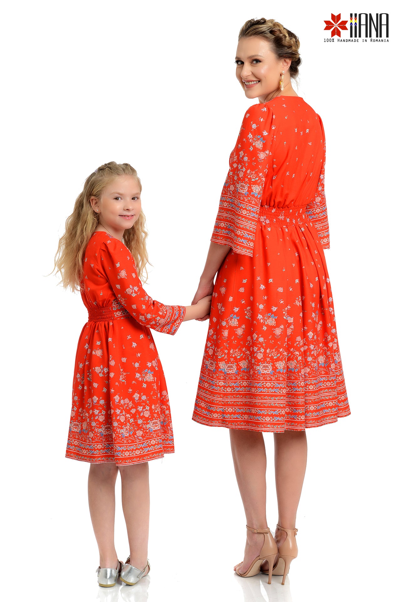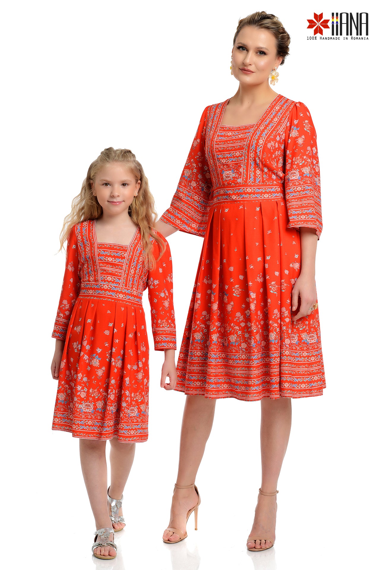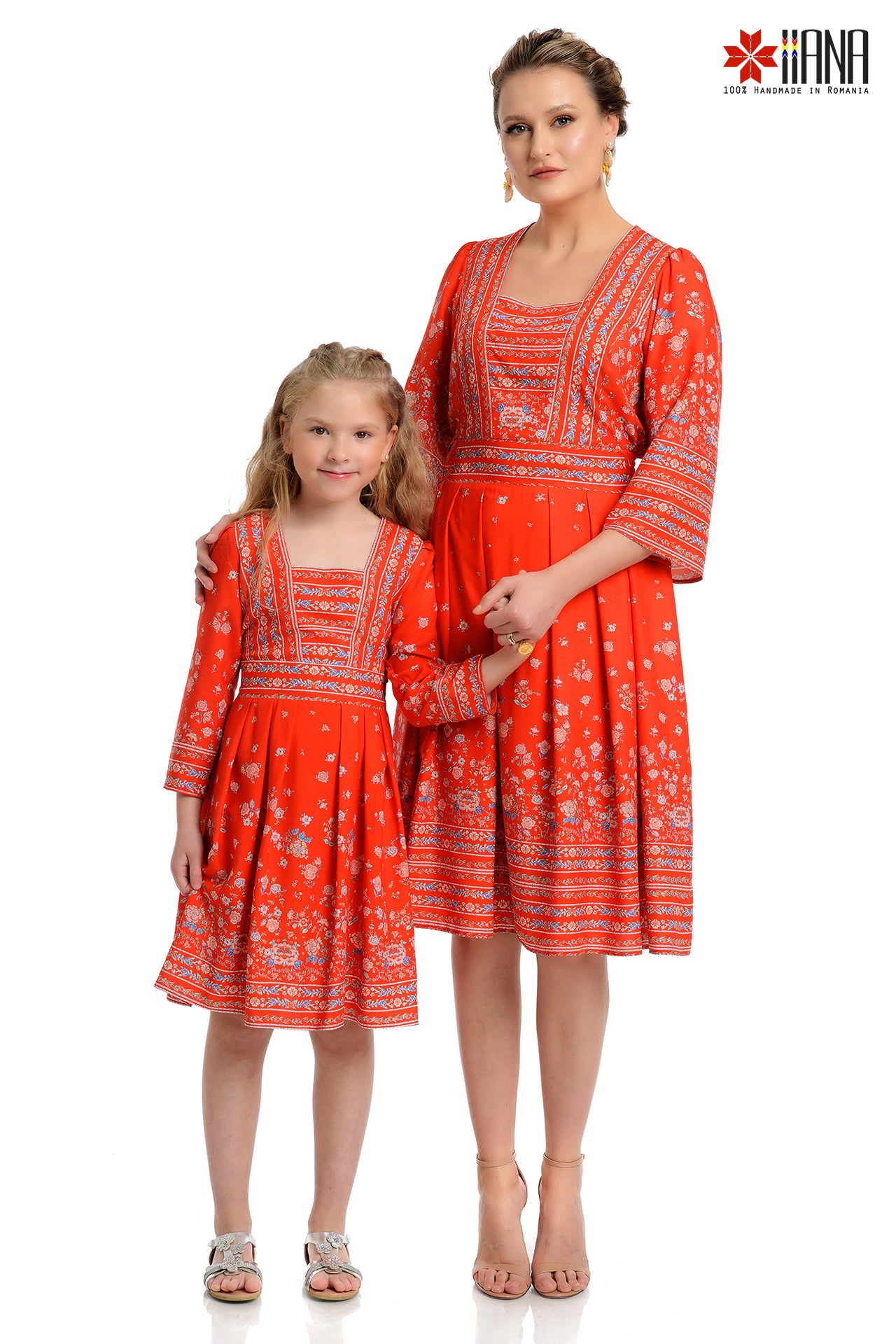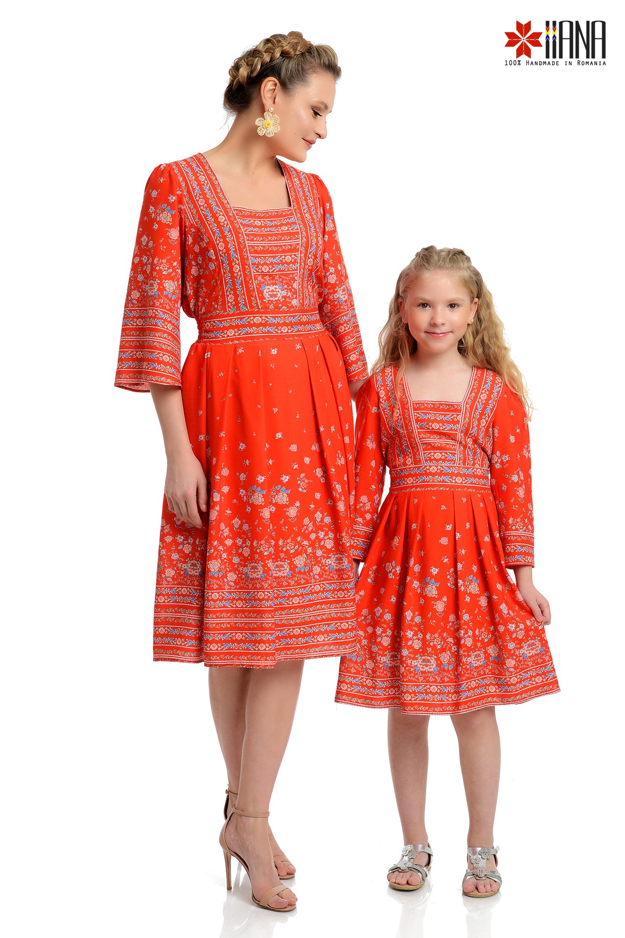 Rochita traditionala fetite Roșie Zora cu motive populare florare 8-15 ani este confecționtă din vâscoză premium, imprimată cu motive florale și geometrice.