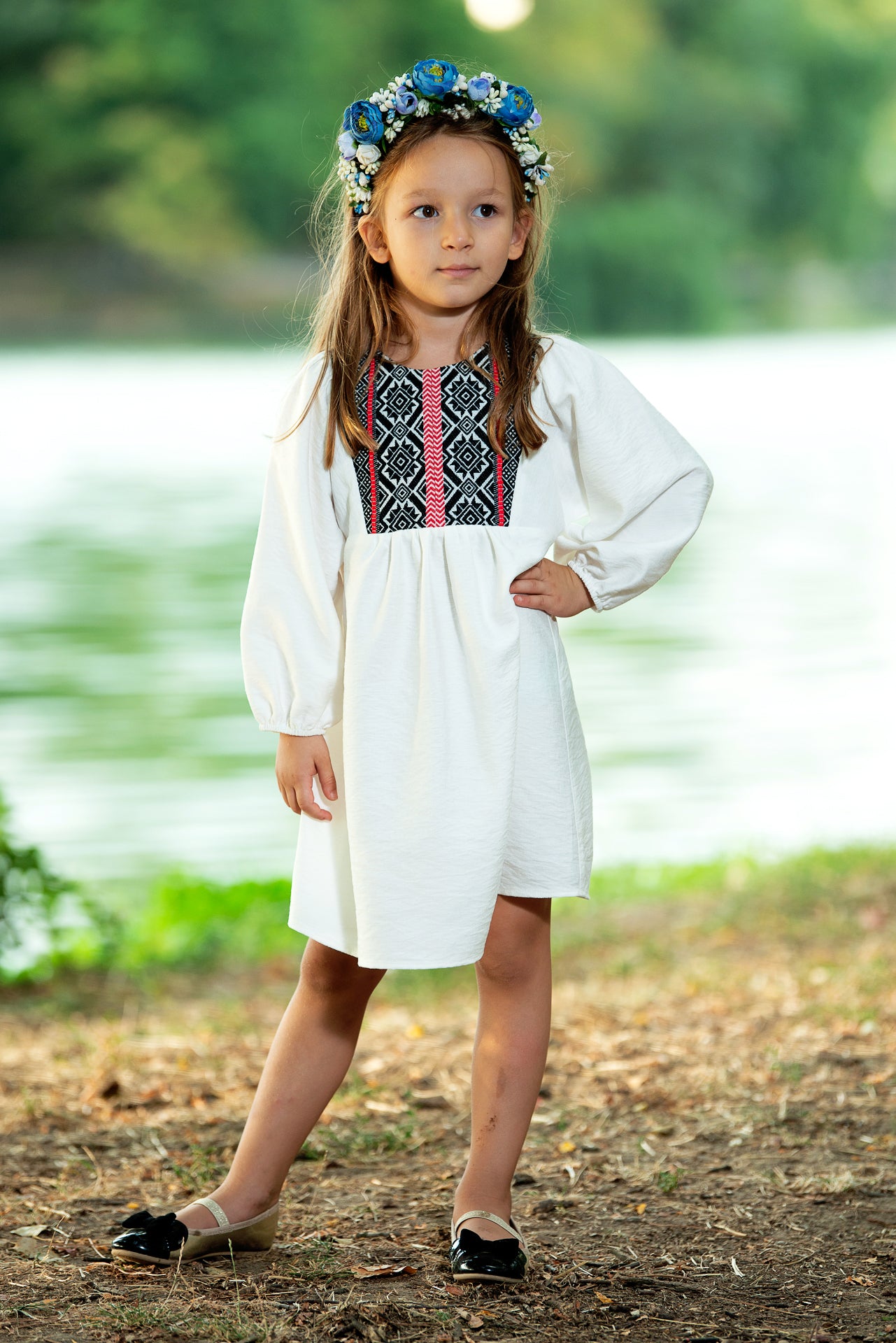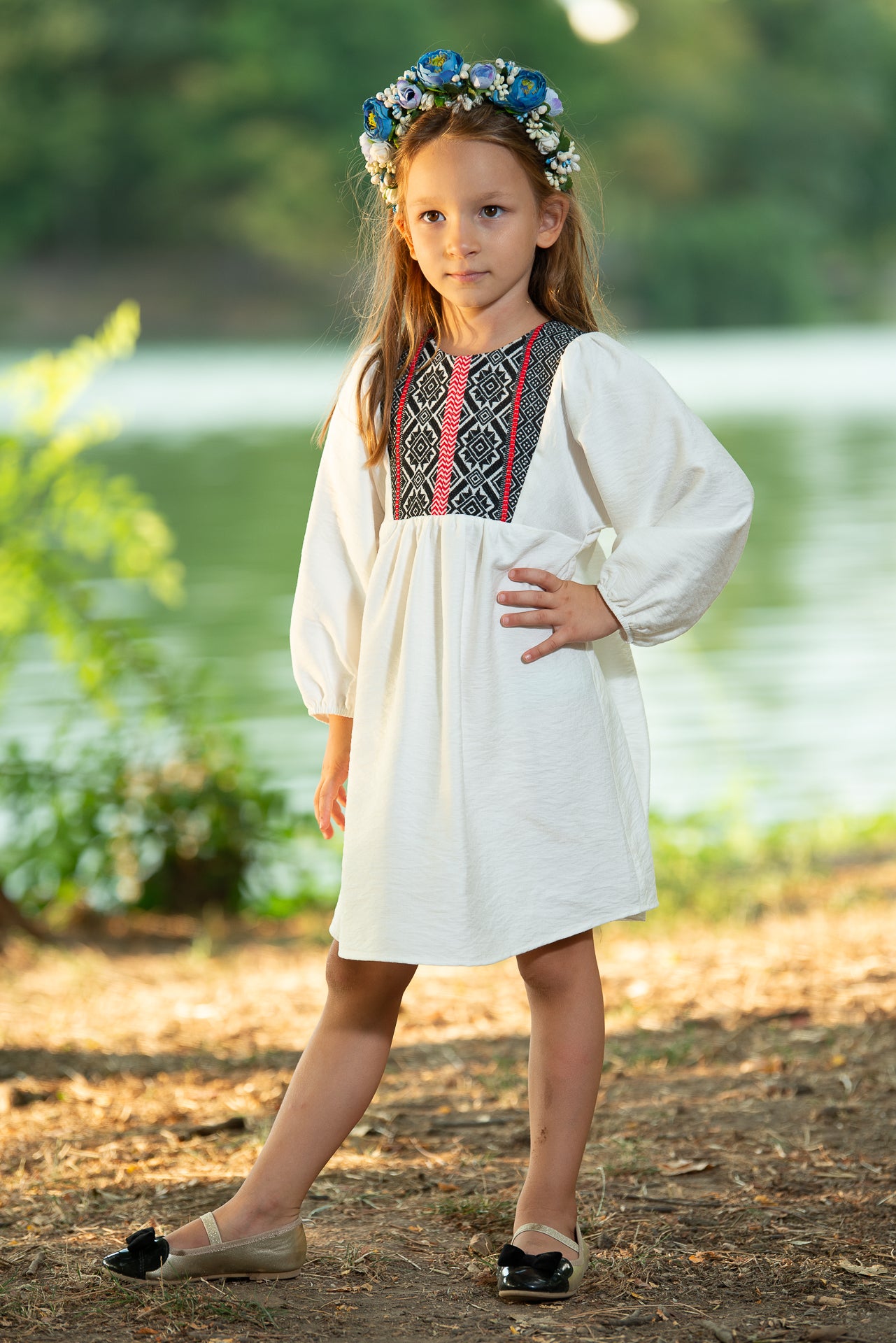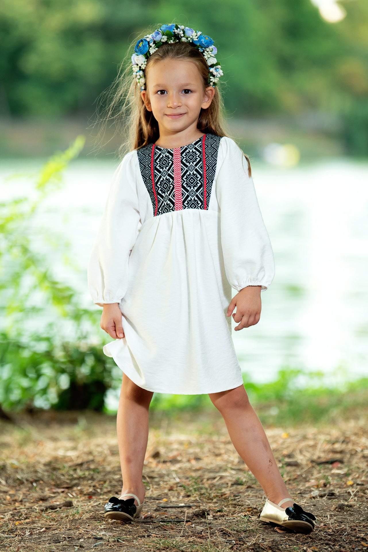 Rochița tradițională Ofelia de fetițe are o croiala midi,
