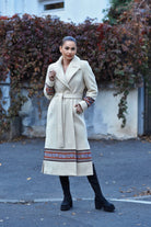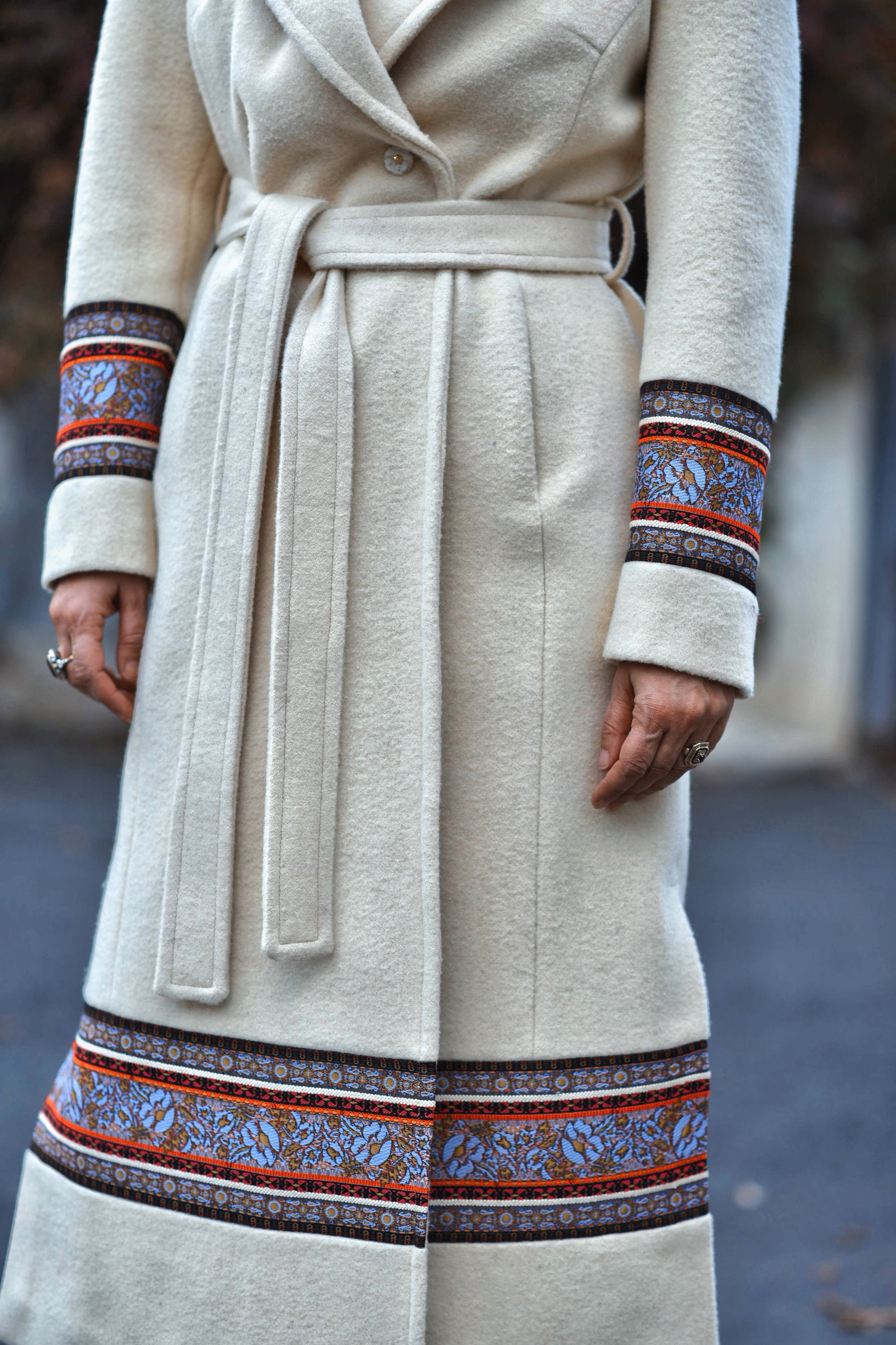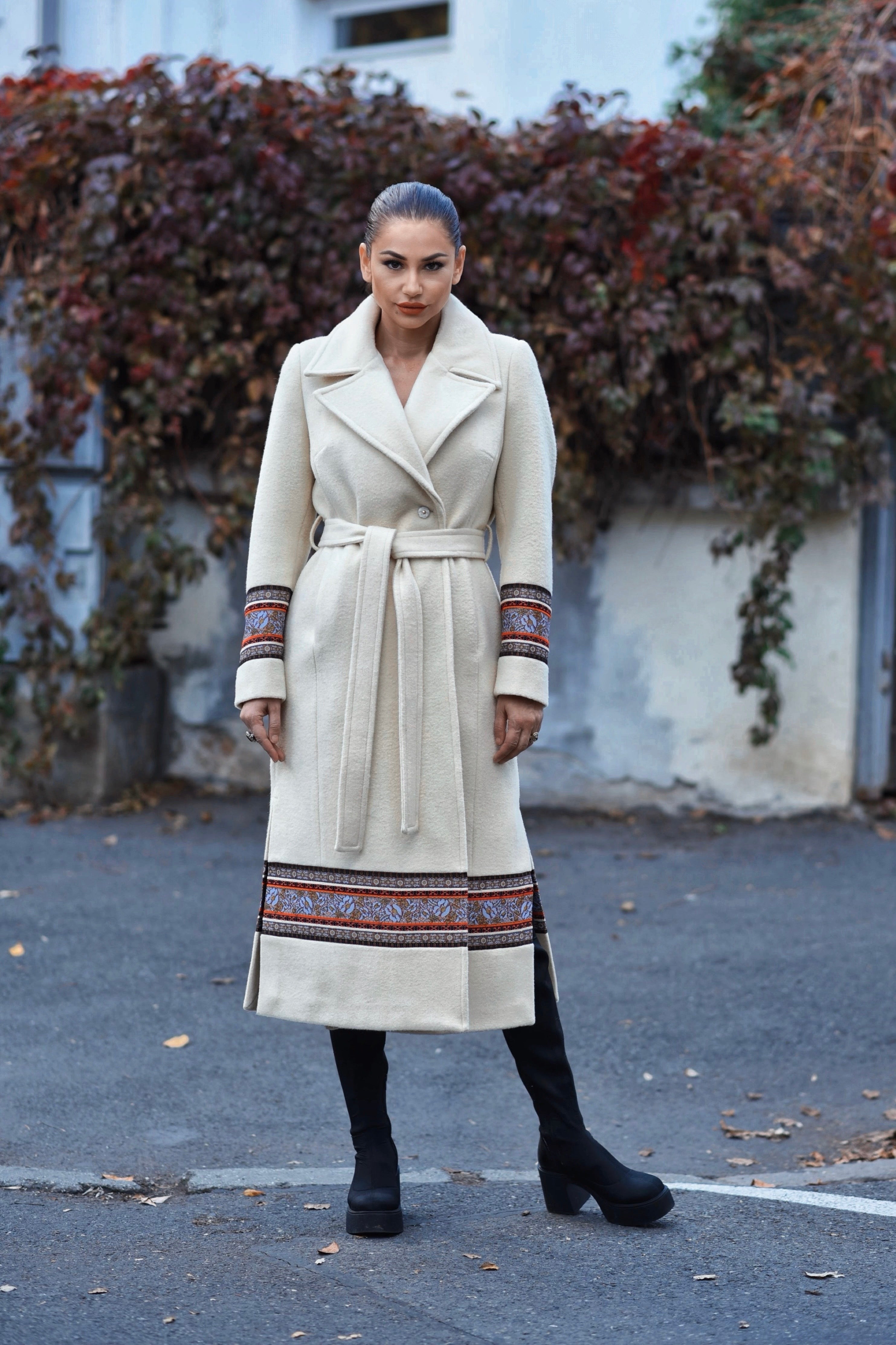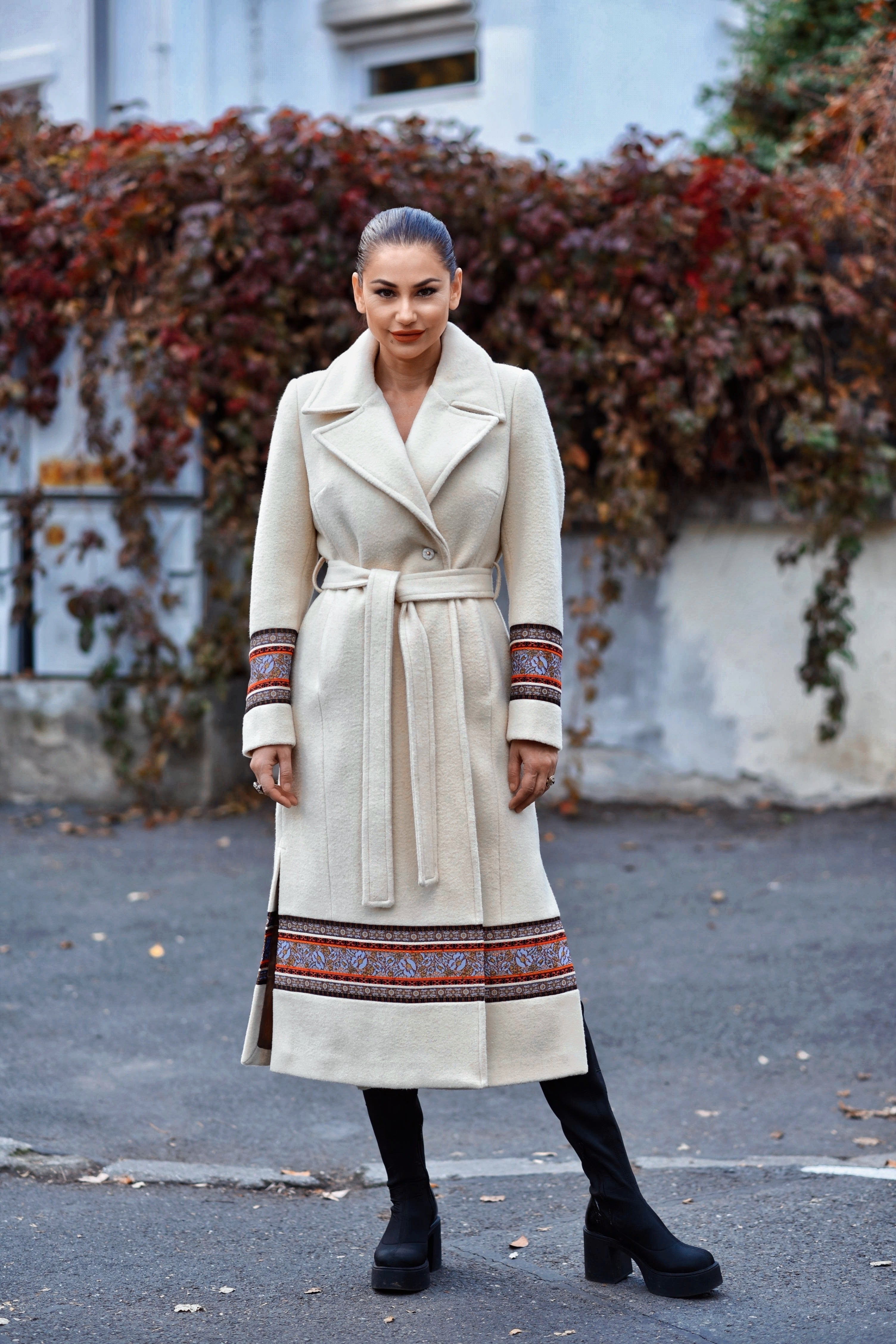 Paltonul crem cu broderie florală IIANA este o piesă elegantă, atemporală, care avantajază toate tipurile de siluete.