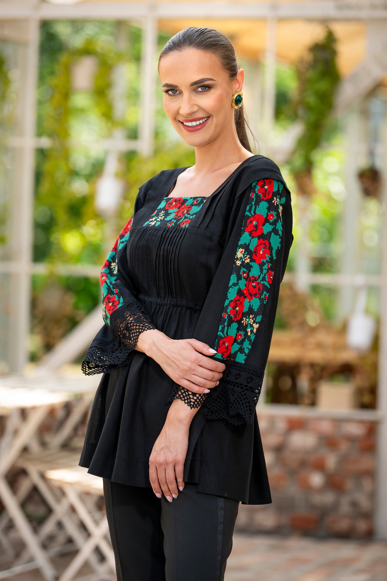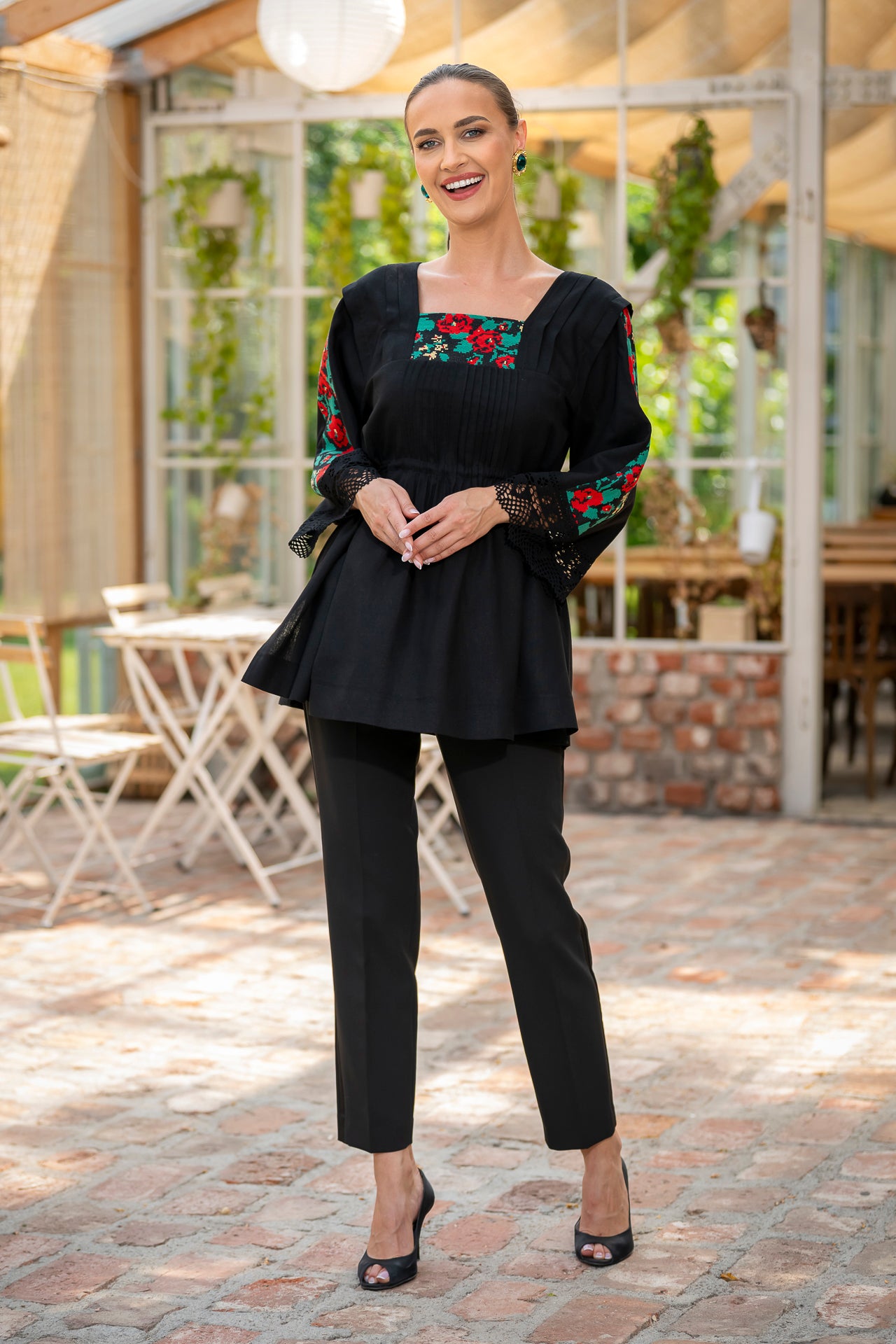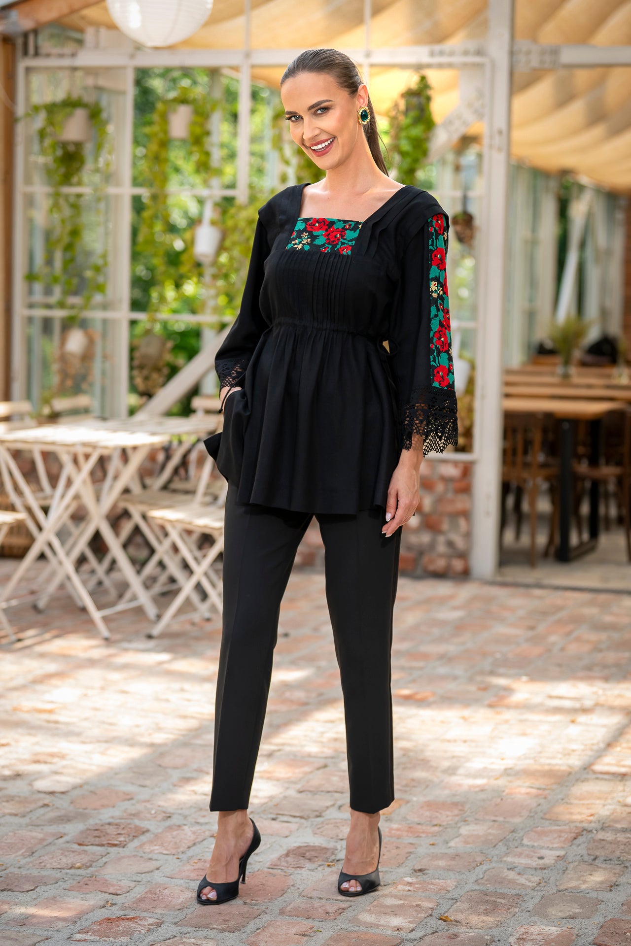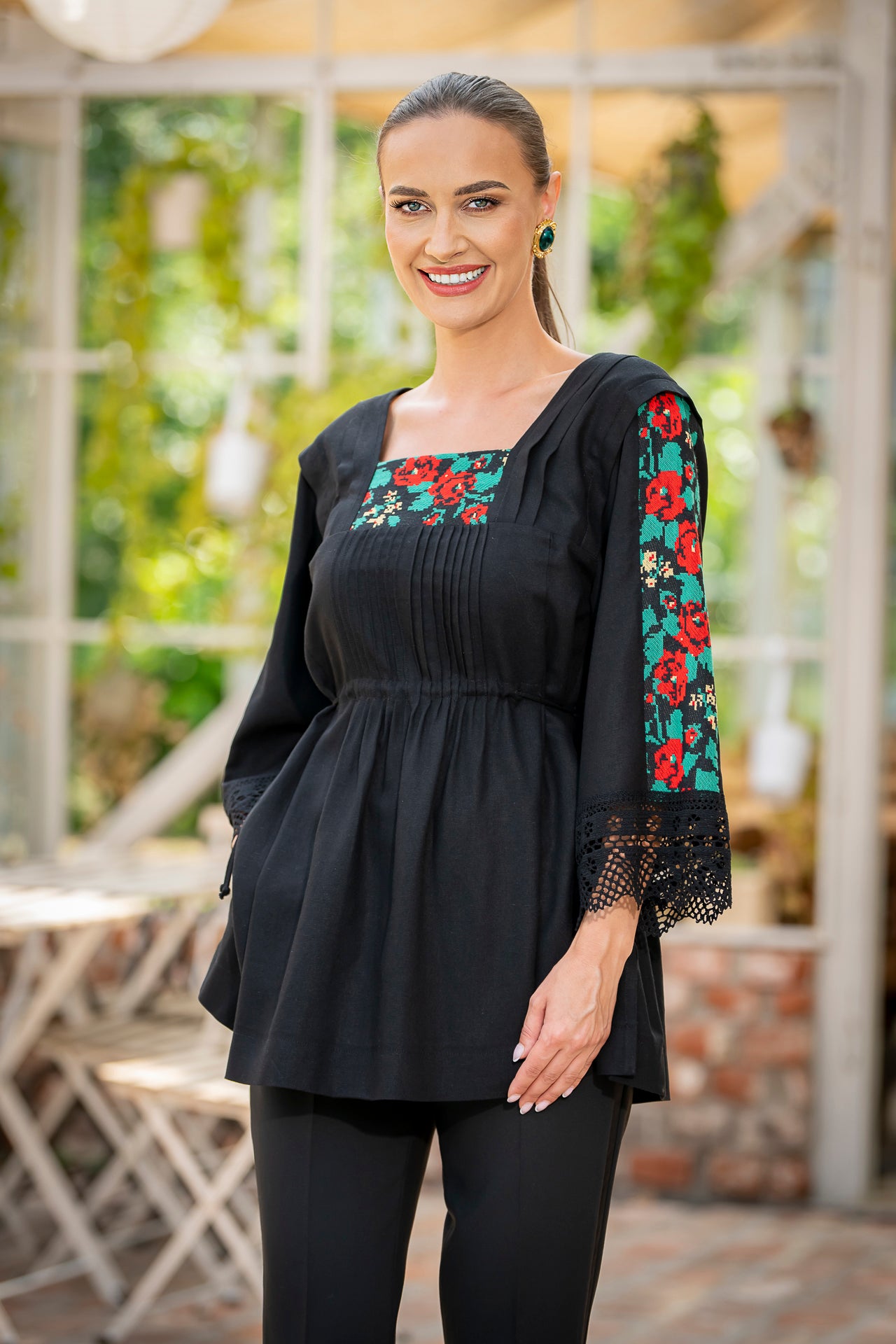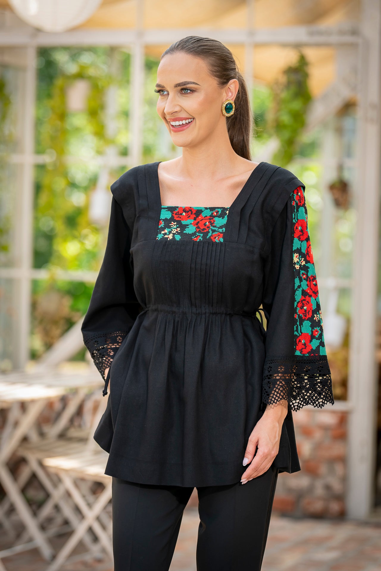 Bluza este confecționată din in negru și înnobilata cu dantelă tradițională și jacquard țesut.