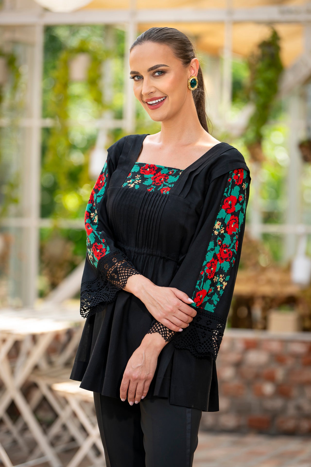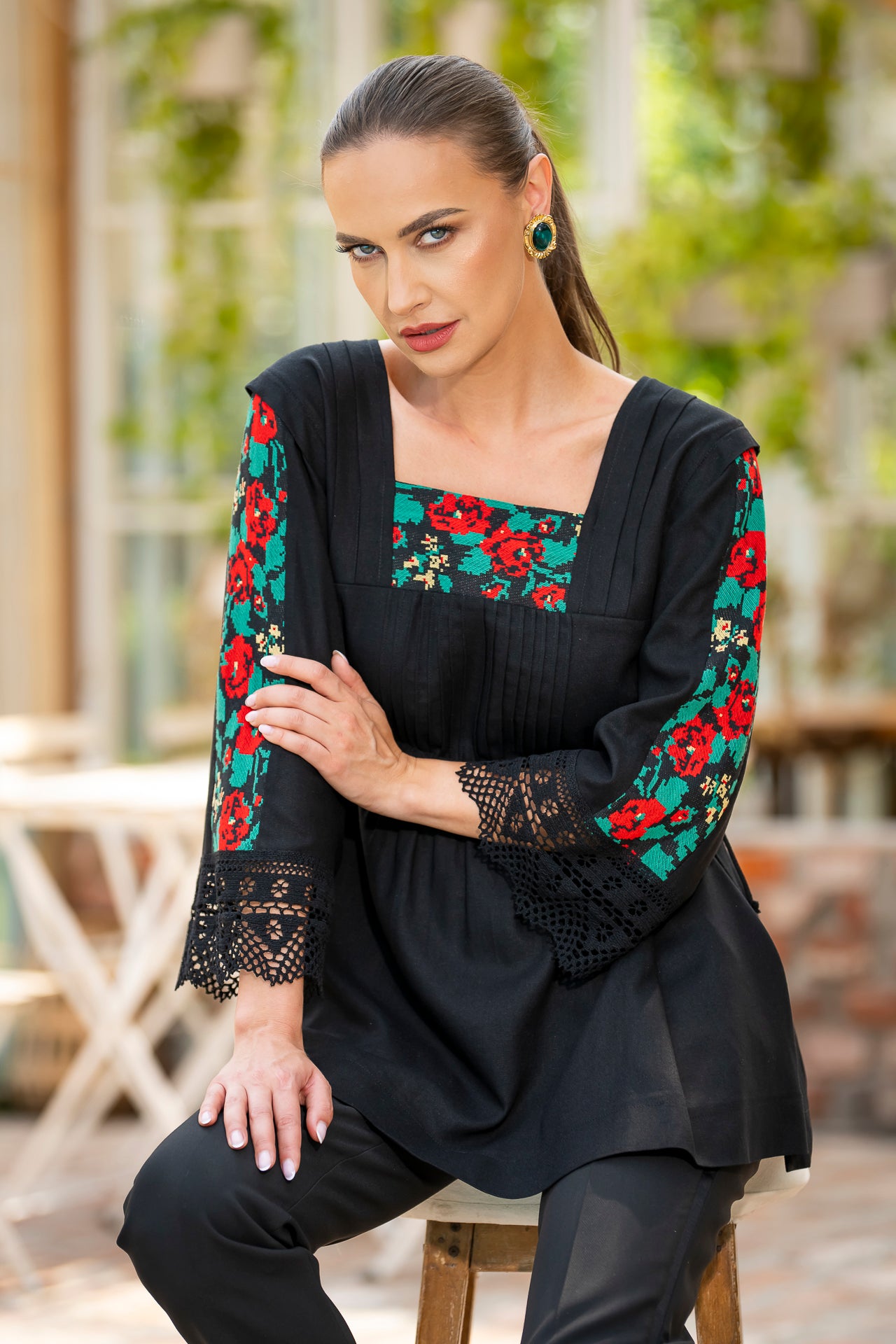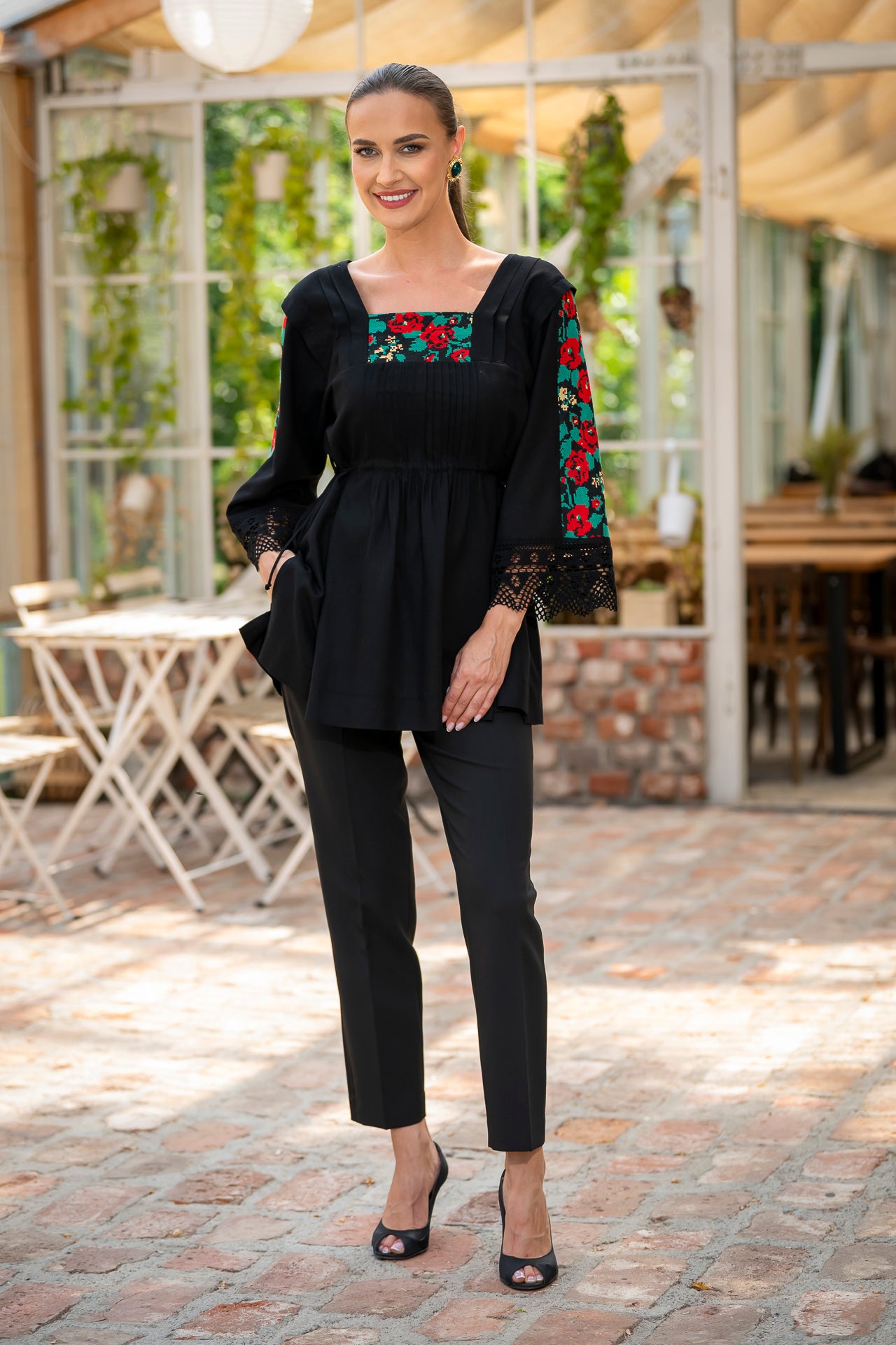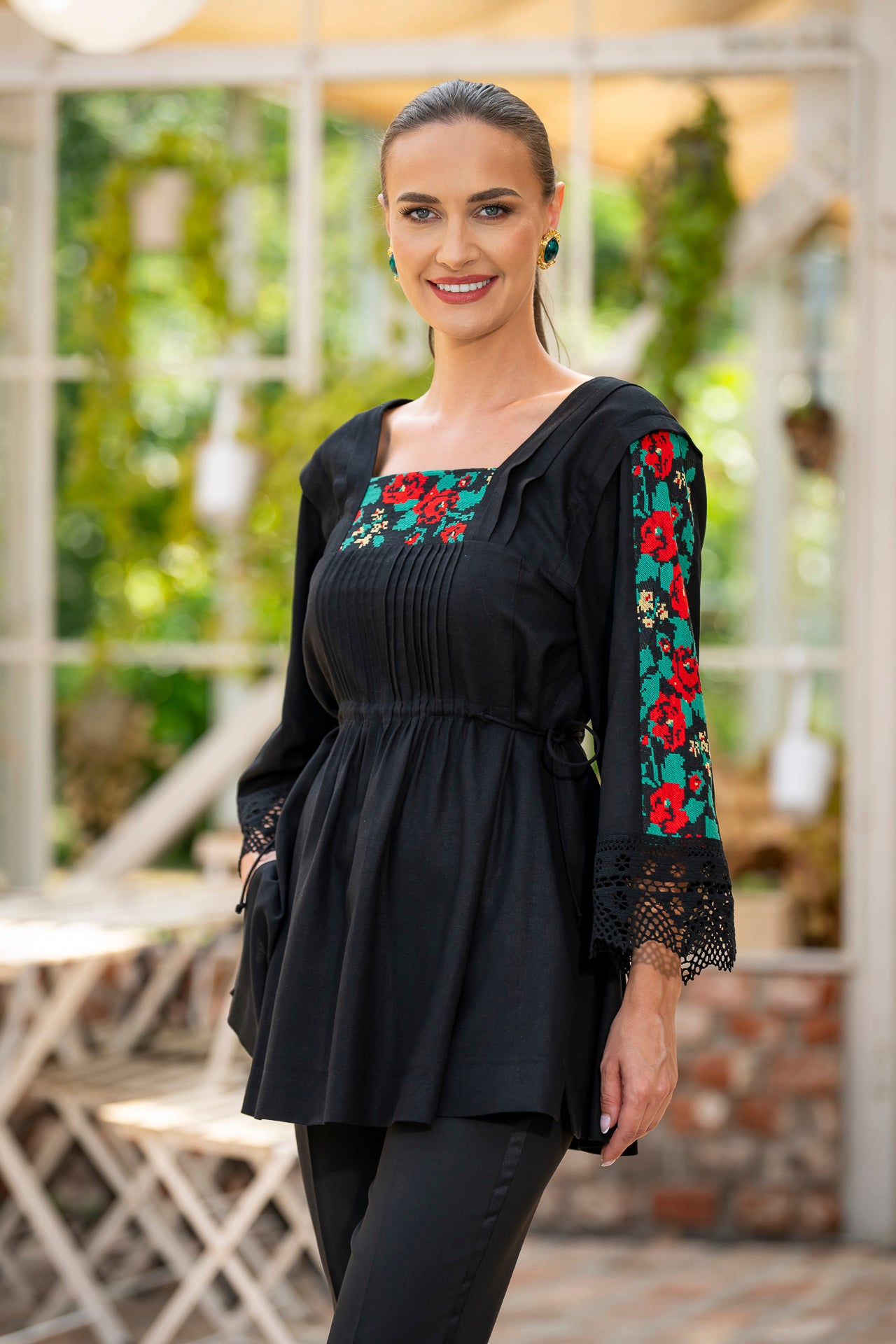 Bluza este confecționată din in negru și înnobilata cu dantelă tradițională și jacquard țesut.